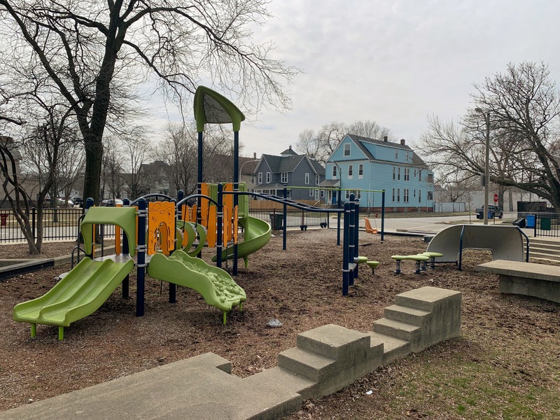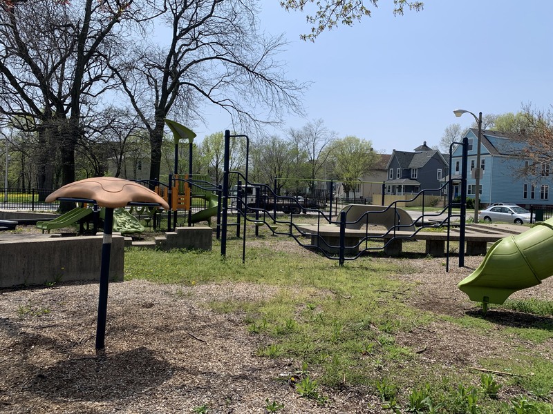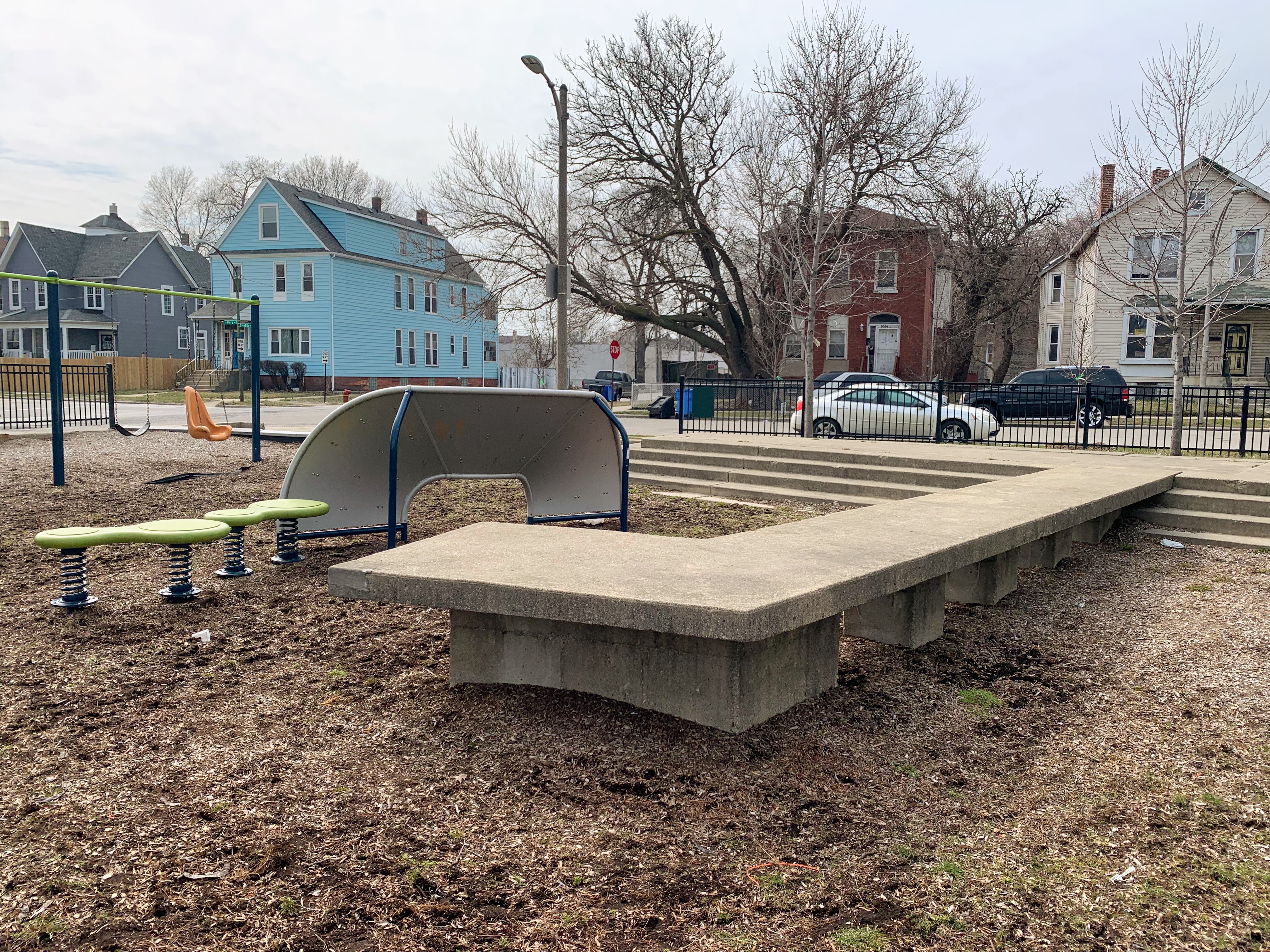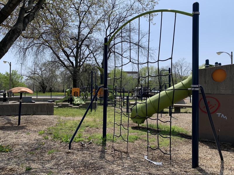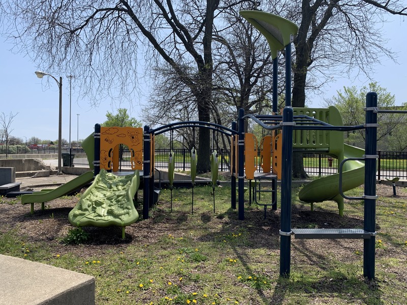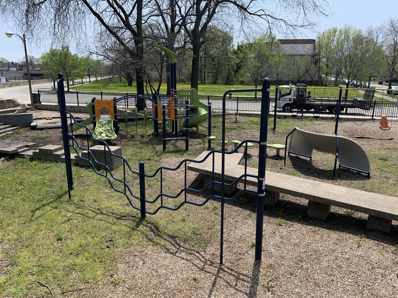 Periwinkle Park is located near the junction of the Chicago Skyway and I-94; this fact of location is relevant to the playground at this site because 1) the road noise is quite loud in the playground and 2) it may explain the concrete aesthetic for this playground. Though wood chips are the primary play surface, there is a striking amount of concrete in this park including benches, stairs, and a raised platform. One slide is somewhat integrated into the concrete and the rest of the structures seems like modern structures set between the concrete elements. So the overall aesthetic is somewhat bizarre but not terrible.