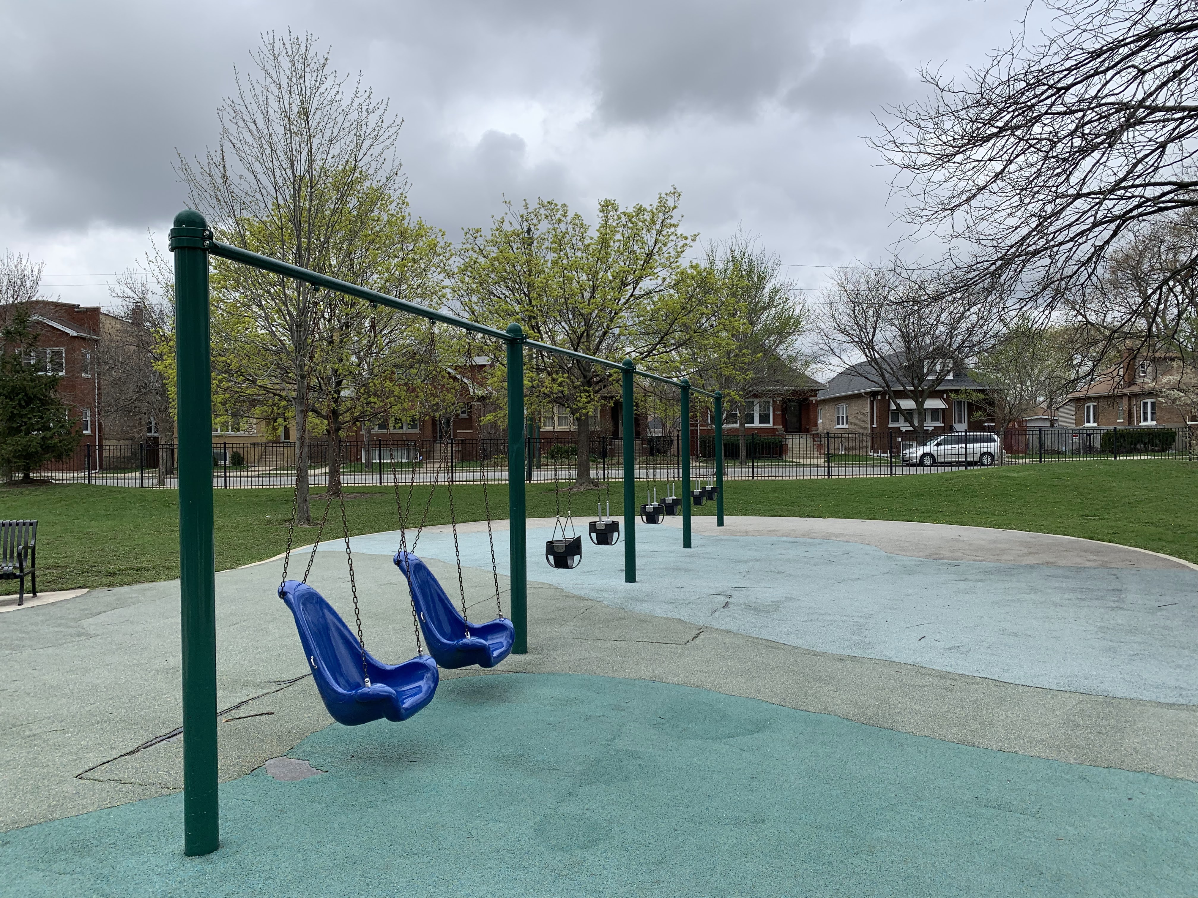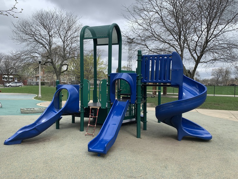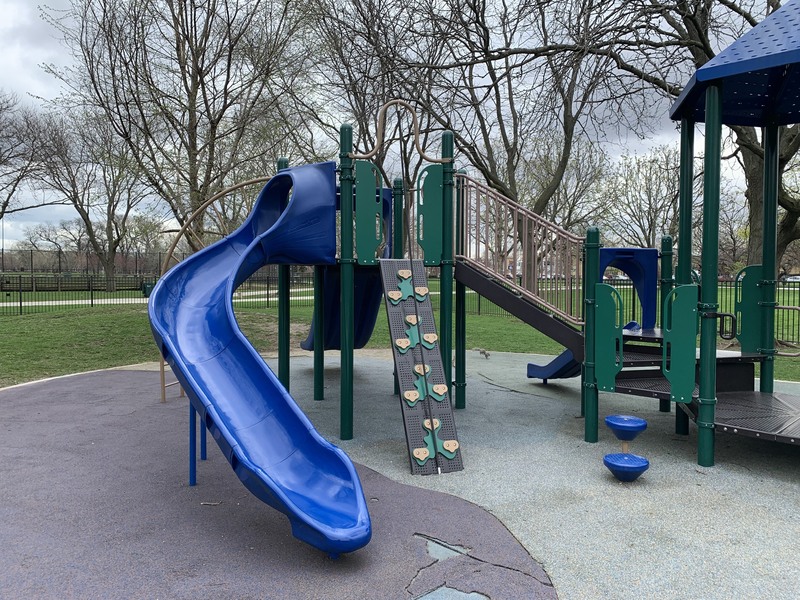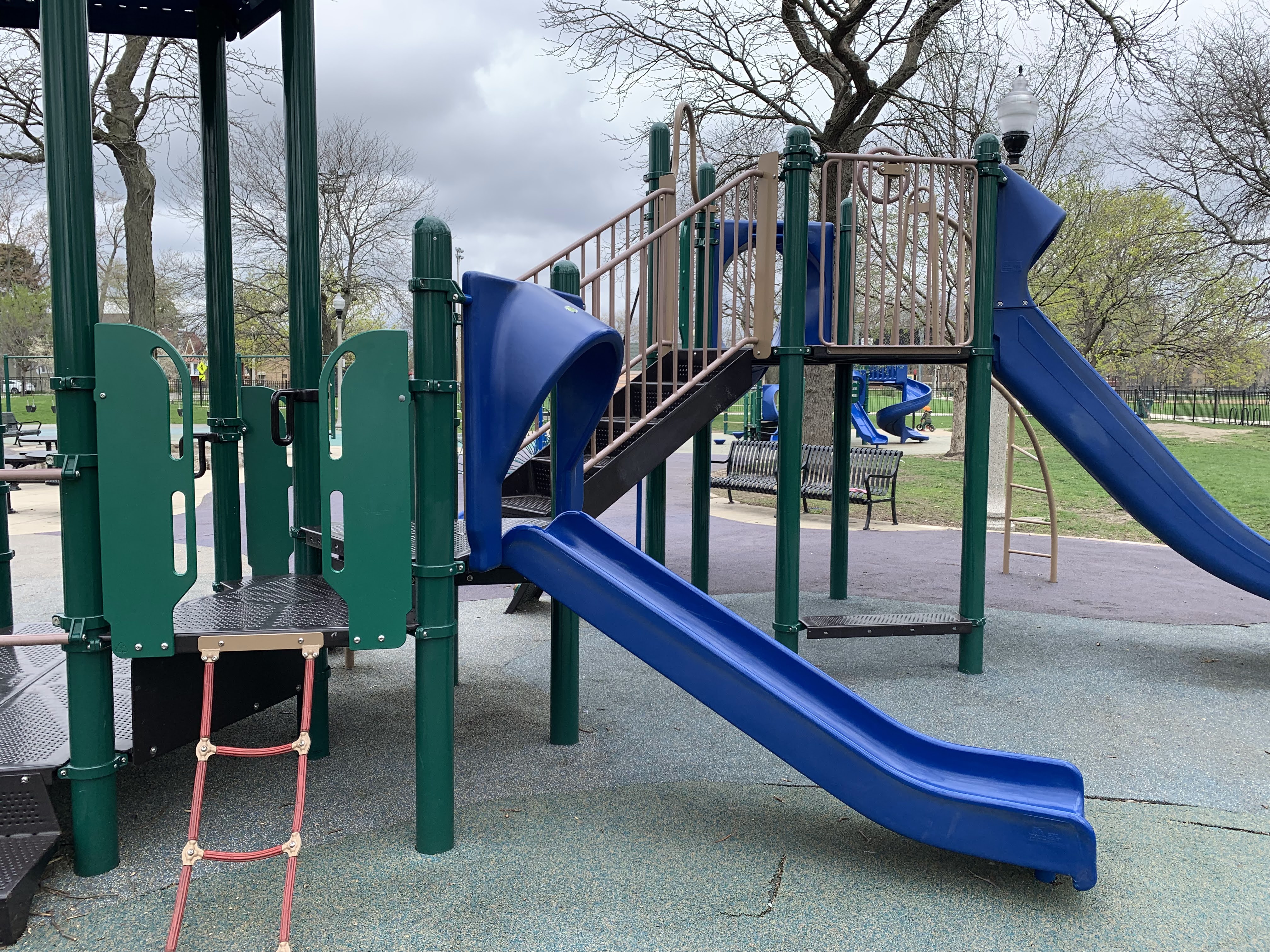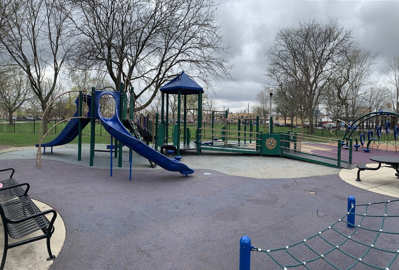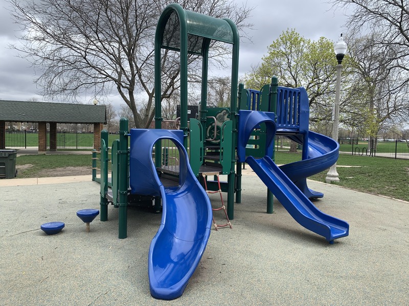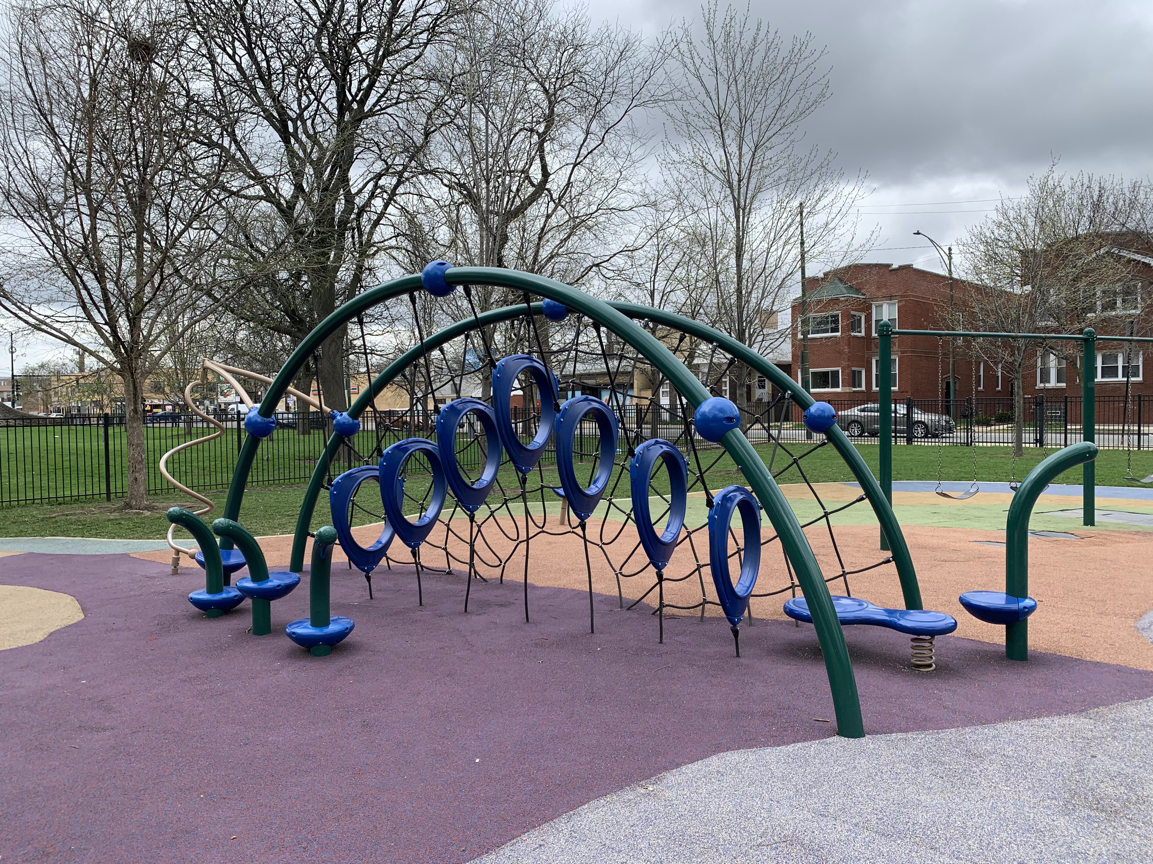 The playground at Portage Park has the play structures and amenities to make it a true destination. The fully enclosed area on the west side of Portage Park features two large play structures. One structure is designed for smaller children and features several slides, climbing features, and interactive panels. The other structure is even larger and is designed for older children by showcasing more challenging climbing features and larger slides. There are also several other standalone features including a semi-circular climbing net with suspended rings and a very large twisted net for climbing. There are also two large swing sets offering the standard park variety.