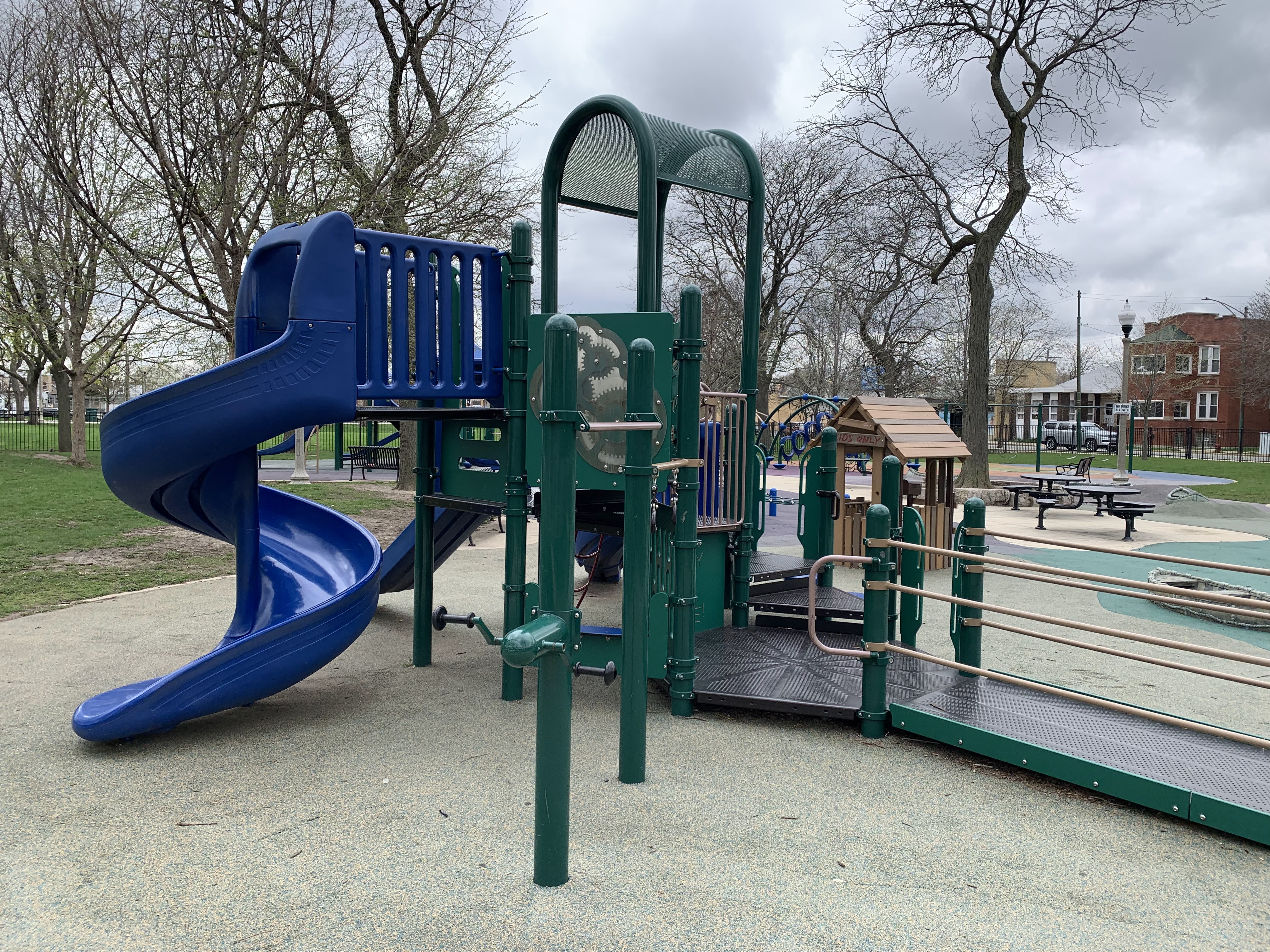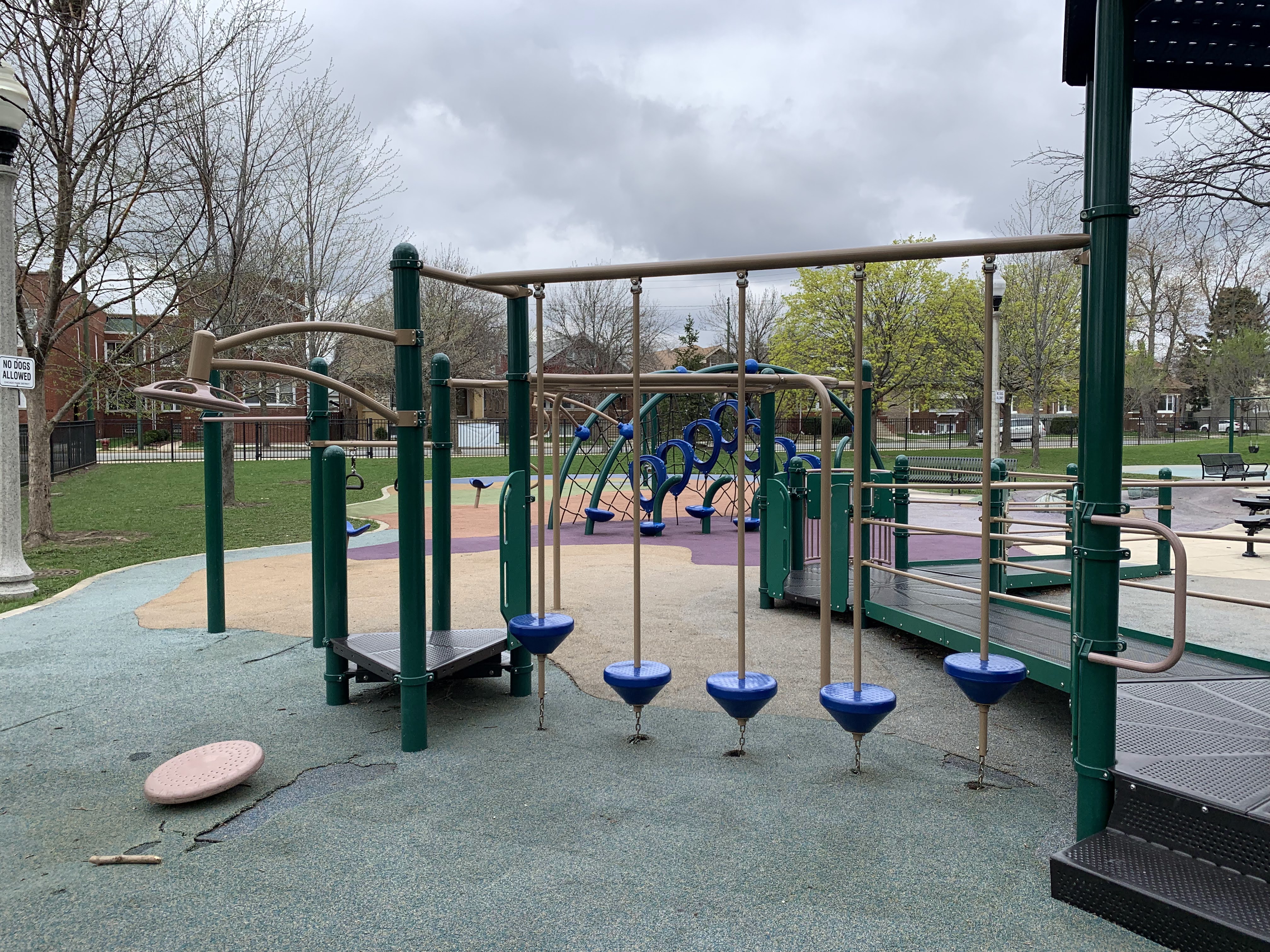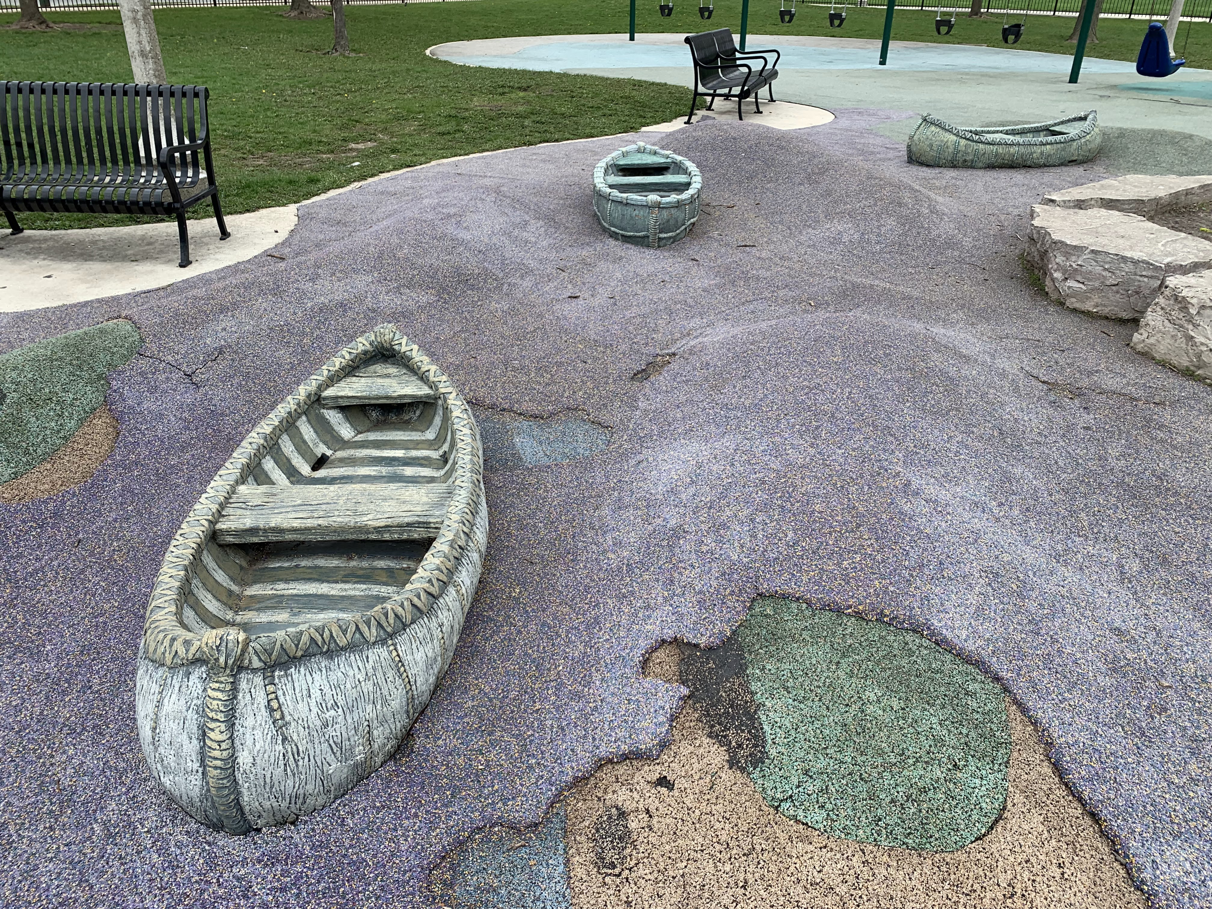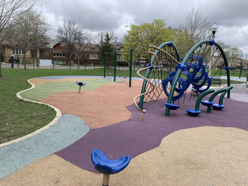 The play surface is soft rubber. In one area the surface itself has been molded and large sculptural canoes are set in the surface in what is perhaps a nod to the name 'portage park' and the routes that Native Americans used in the area prior to white settlement. The playground is well shaded by many mature trees and a simple pavilion on the northside of the playground. There are also plenty of benches and picnic tables for seating. All in all, this is a great playground and a worthy destination. - Playground Features