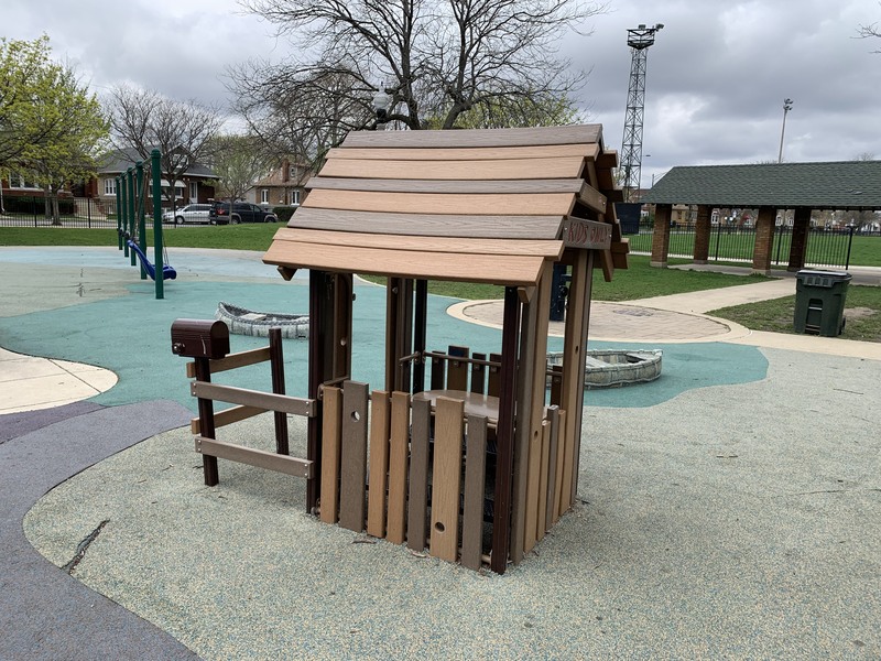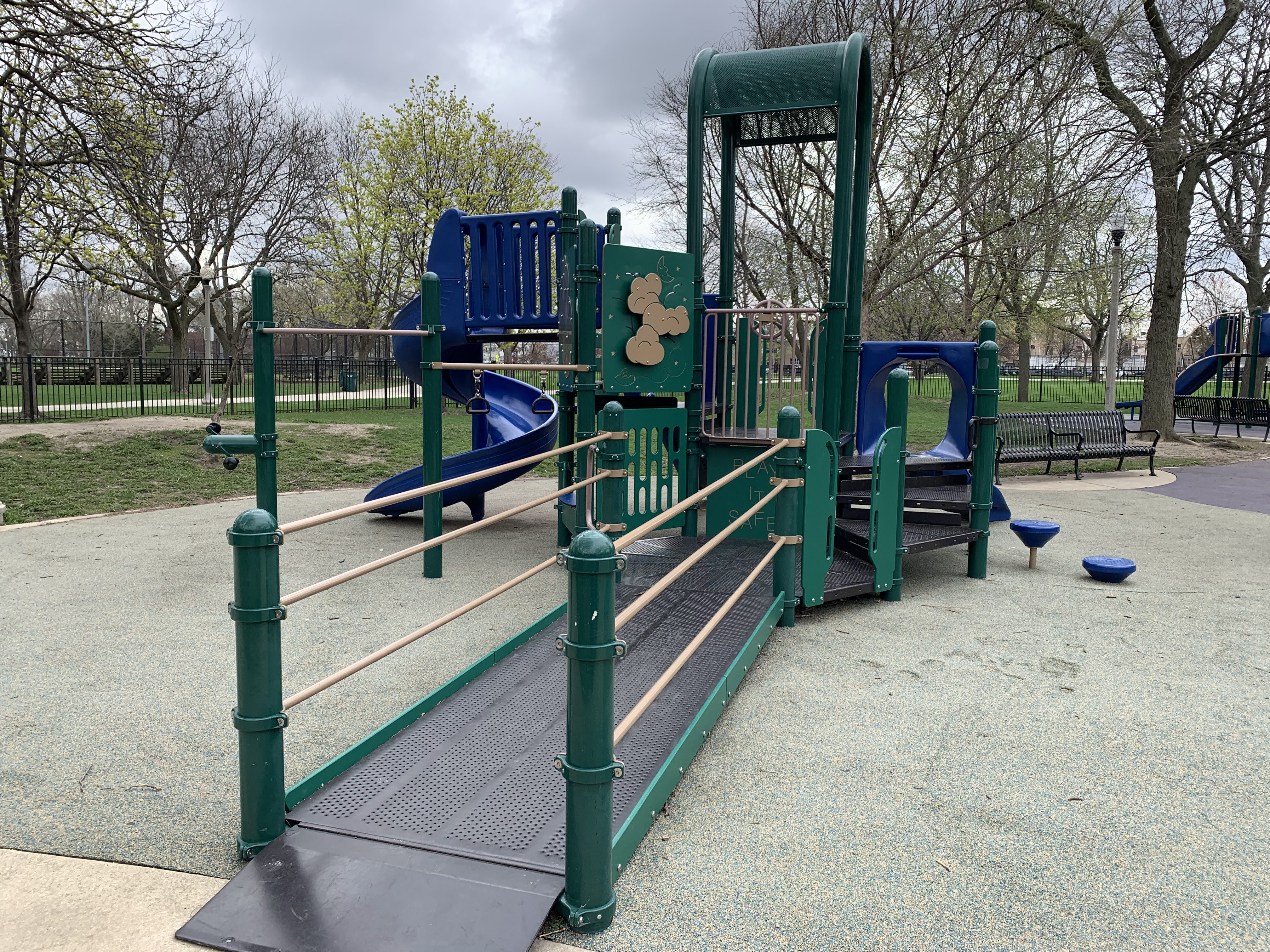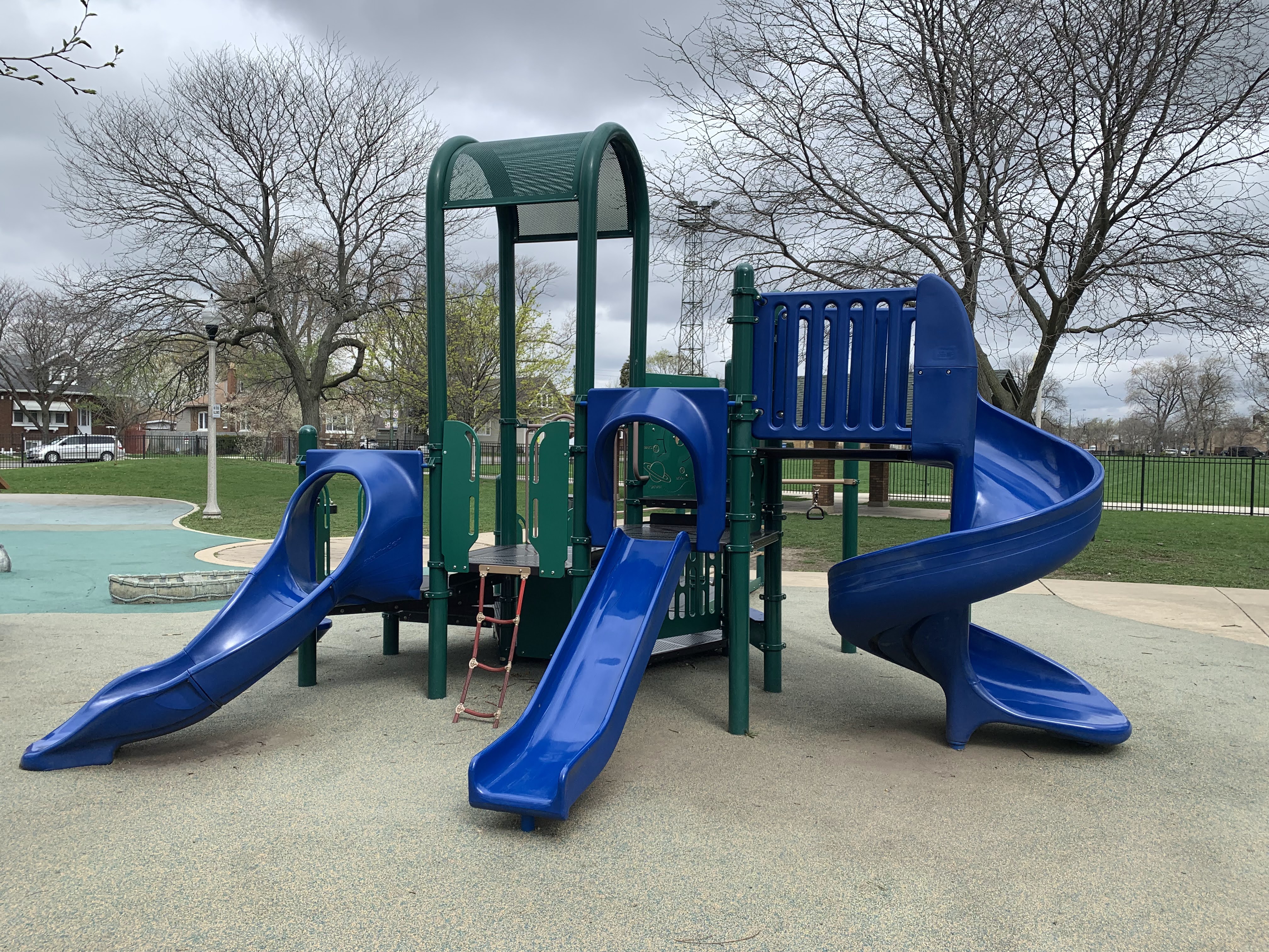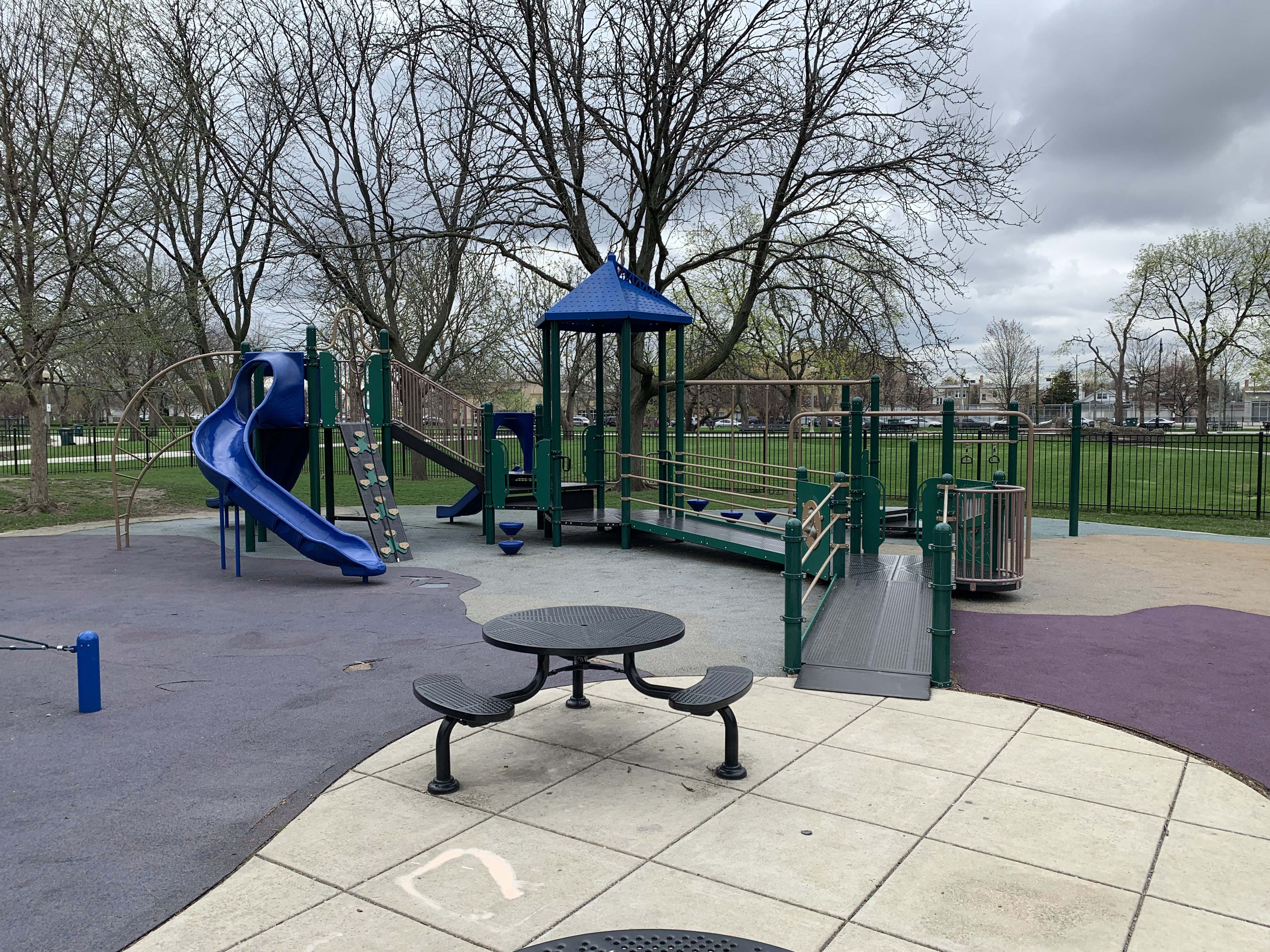 The play surface is soft rubber. In one area the surface itself has been molded and large sculptural canoes are set in the surface in what is perhaps a nod to the name 'portage park' and the routes that Native Americans used in the area prior to white settlement. The playground is well shaded by many mature trees and a simple pavilion on the northside of the playground. There are also plenty of benches and picnic tables for seating. All in all, this is a great playground and a worthy destination. - Playground Features