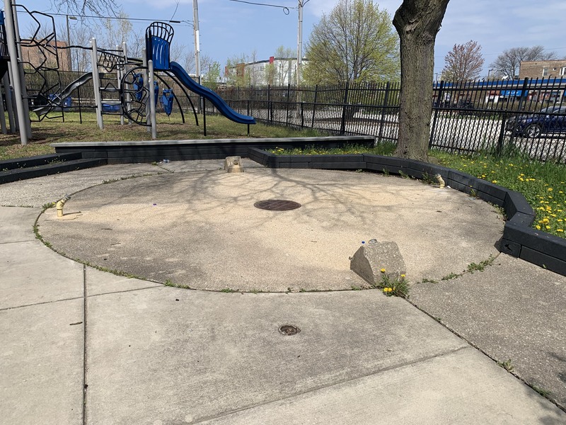 - Prairie Wolf Park is a nice neighborhood pocket park with a playground and water feature. The playground is somewhat non-traditional; the structure consists of a few slides connected by climbing and traversing elements and not bridges or platforms like other sites. The water feature is a small 'four sprayer' with jets from the ground. The surface is wood chips and playground gets some shade from the large trees on the site. The play area is fenced from the street but not fully enclosed There is a shade structure and drinking fountain near the entrance.