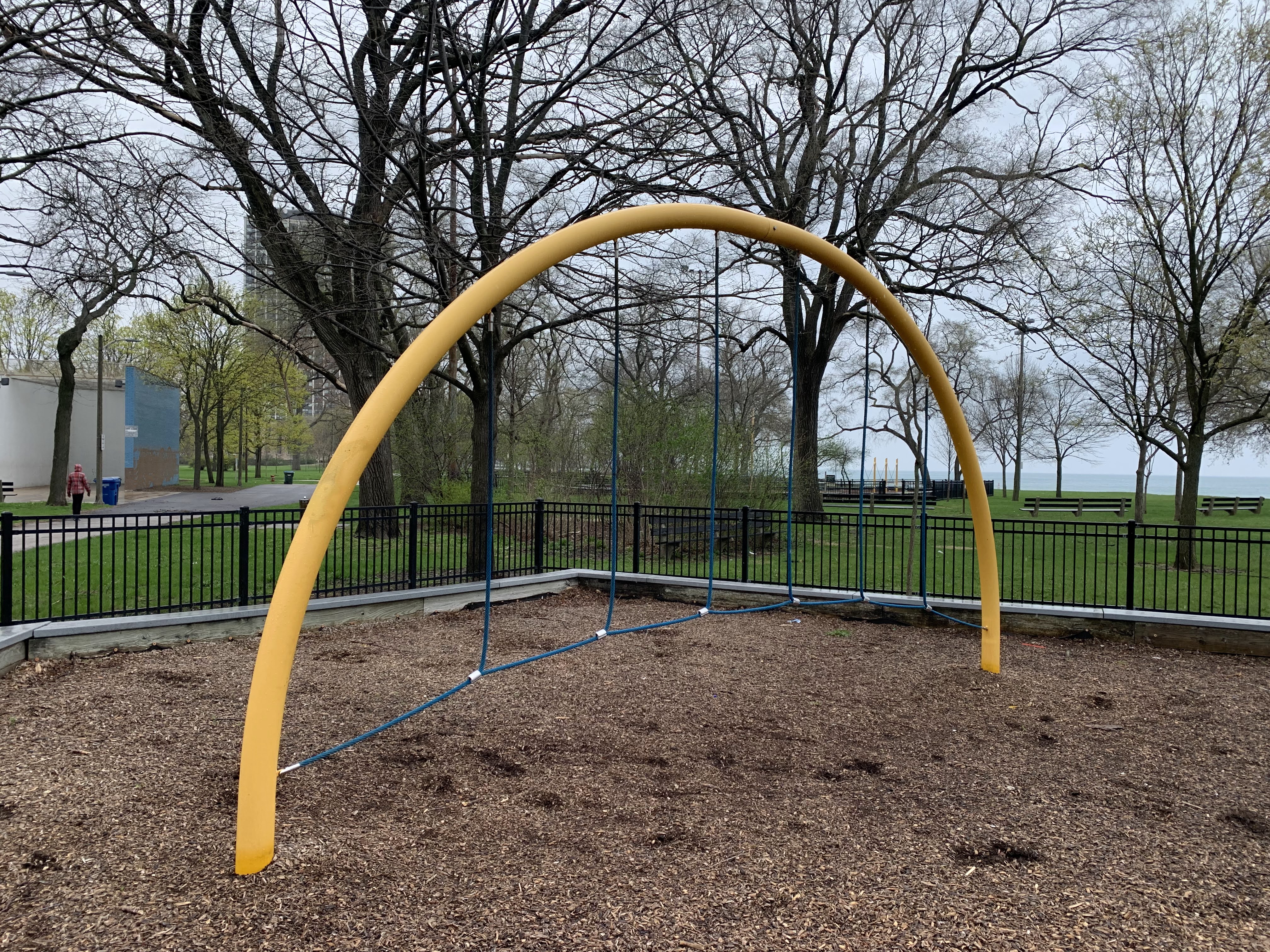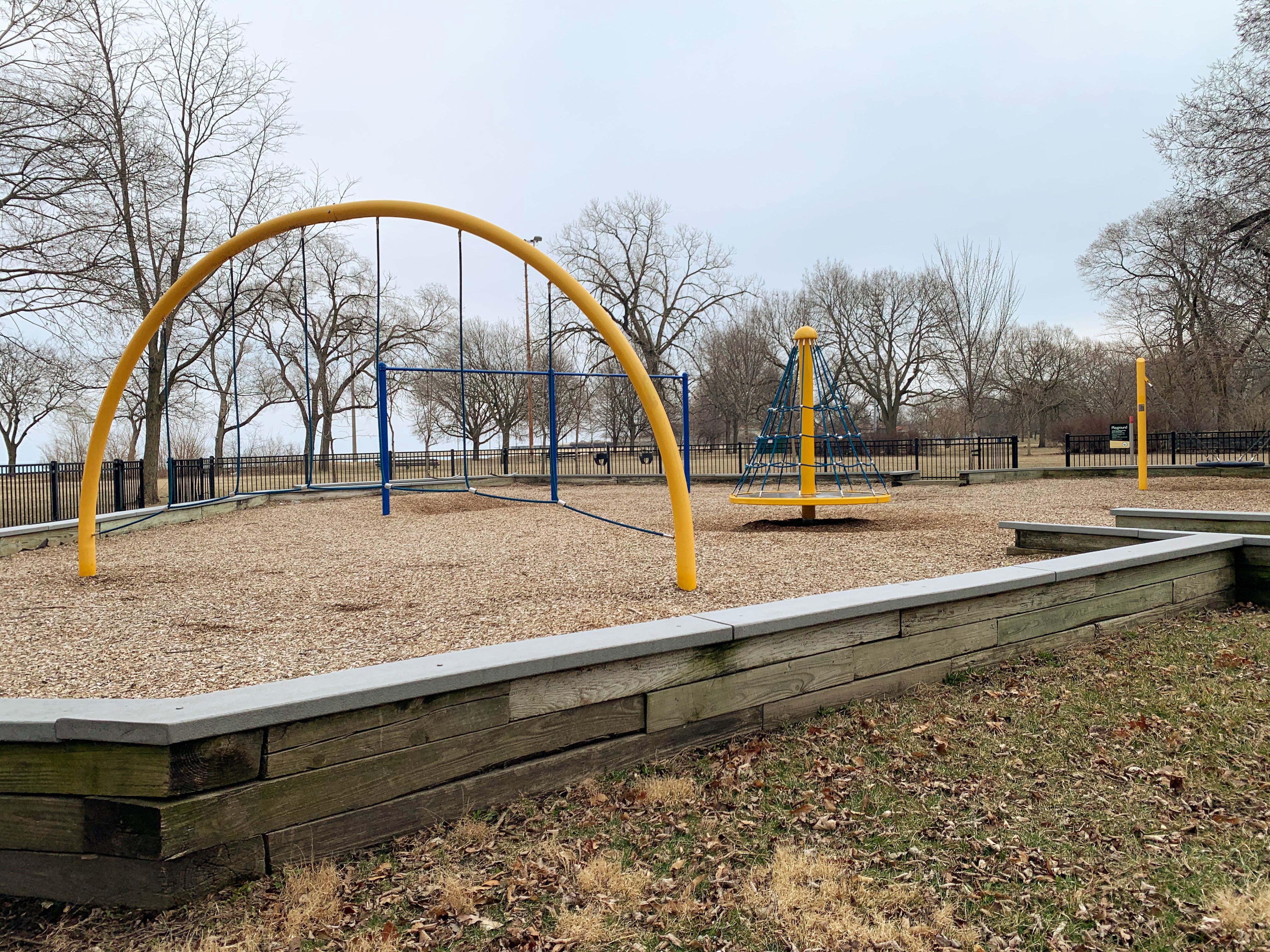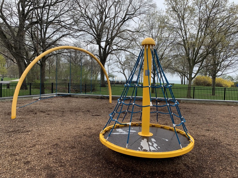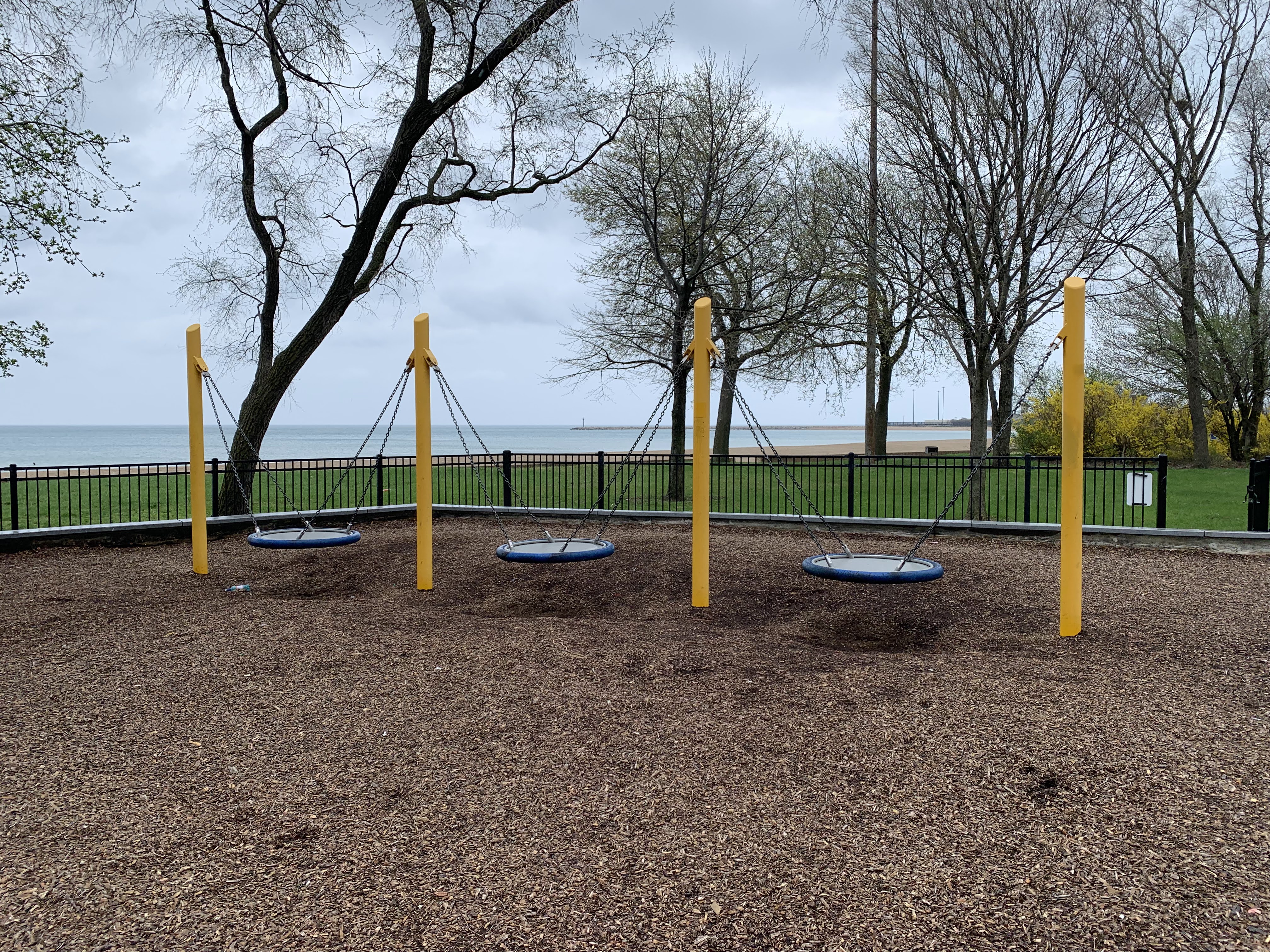 - The playgrounds at Rainbow Beach are located toward the northwest corner of the park and are two fully enclosed play area next to each other. They both feature unique net/rope climbing structures and a variety of swings: toddler, belt seat, and hammock saucer swings. The play surface of both is wood chips and though there aren't benches in the immediate area the low perimeter walls offer some informal seating. Situated away from traffic and with great views of Lake Michigan, these somewhat small playgrounds are gems and are worth the trip.