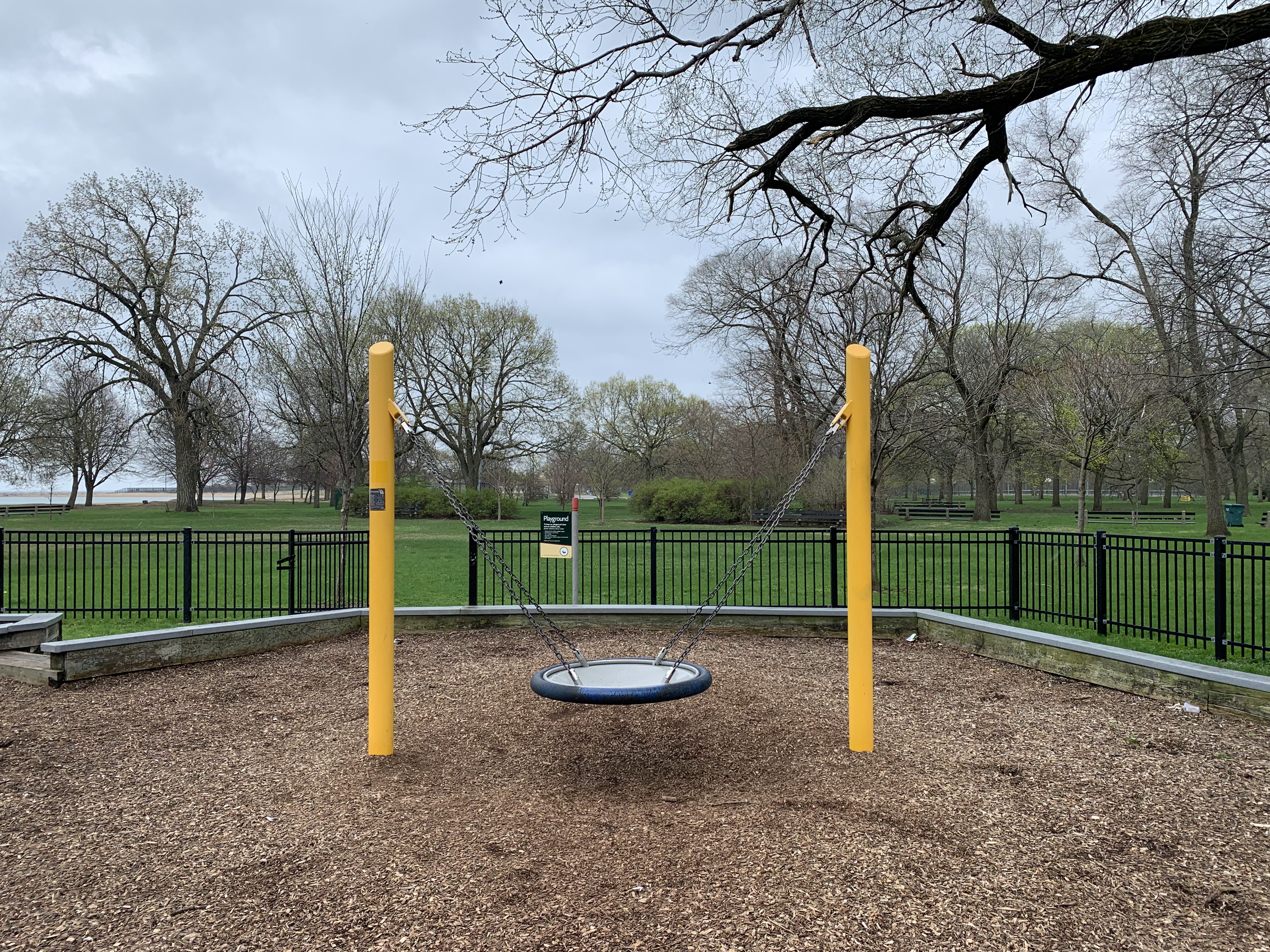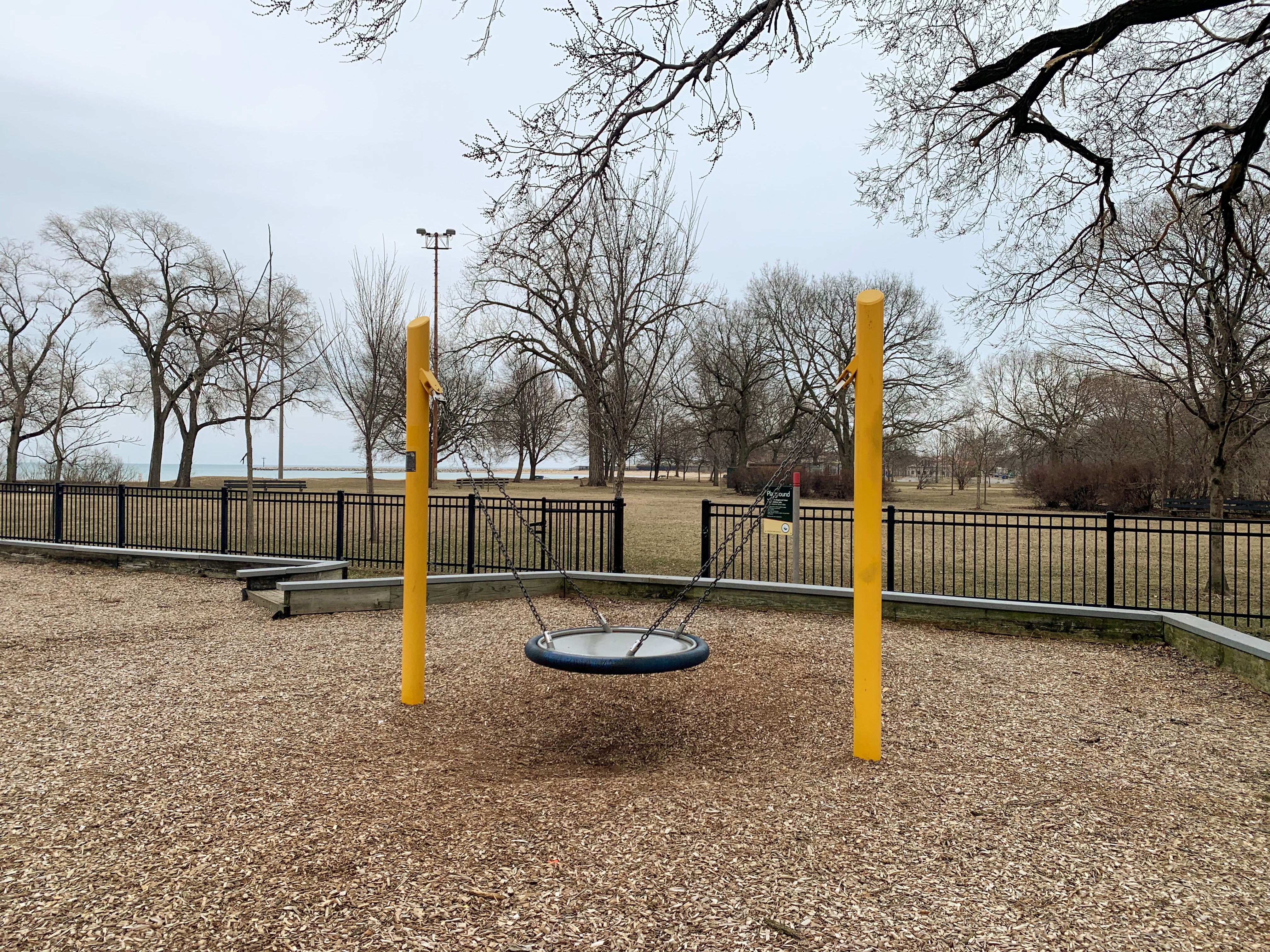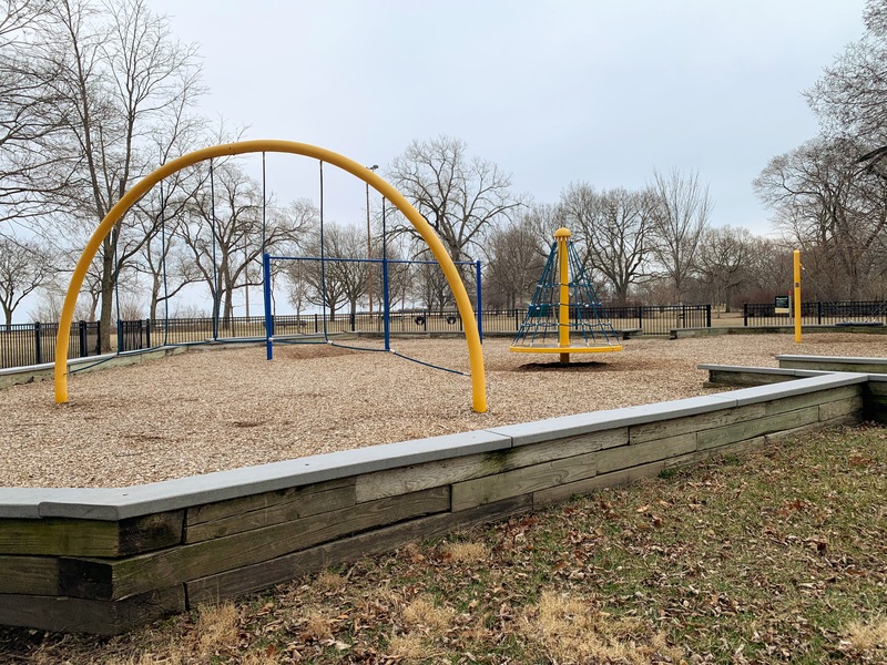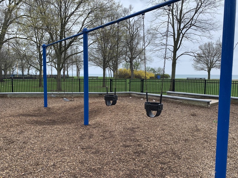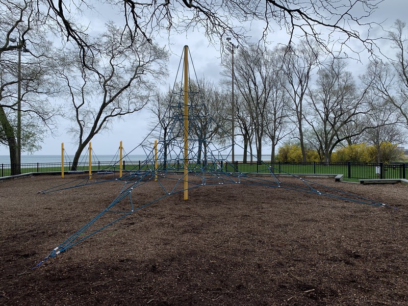 - The playgrounds at Rainbow Beach are located toward the northwest corner of the park and are two fully enclosed play area next to each other. They both feature unique net/rope climbing structures and a variety of swings: toddler, belt seat, and hammock saucer swings. The play surface of both is wood chips and though there aren't benches in the immediate area the low perimeter walls offer some informal seating. Situated away from traffic and with great views of Lake Michigan, these somewhat small playgrounds are gems and are worth the trip.