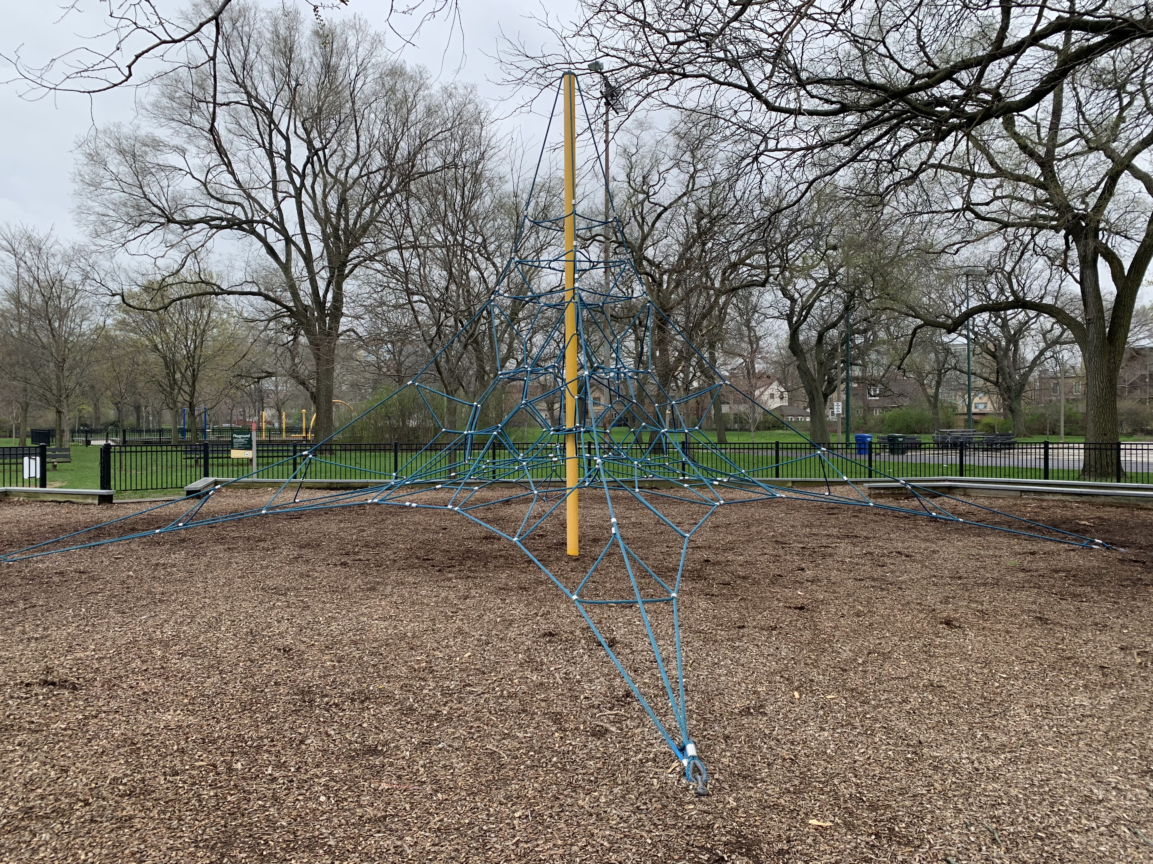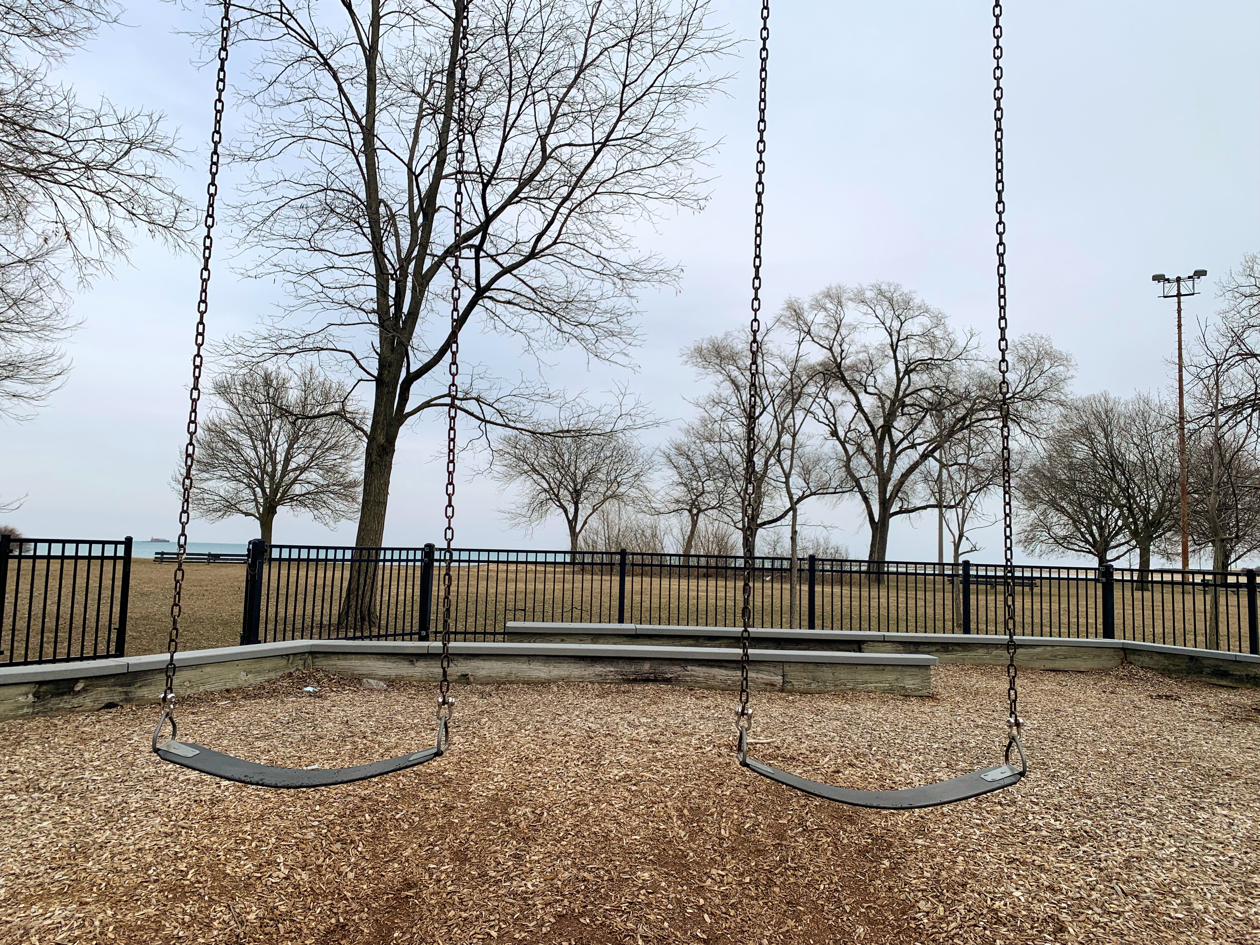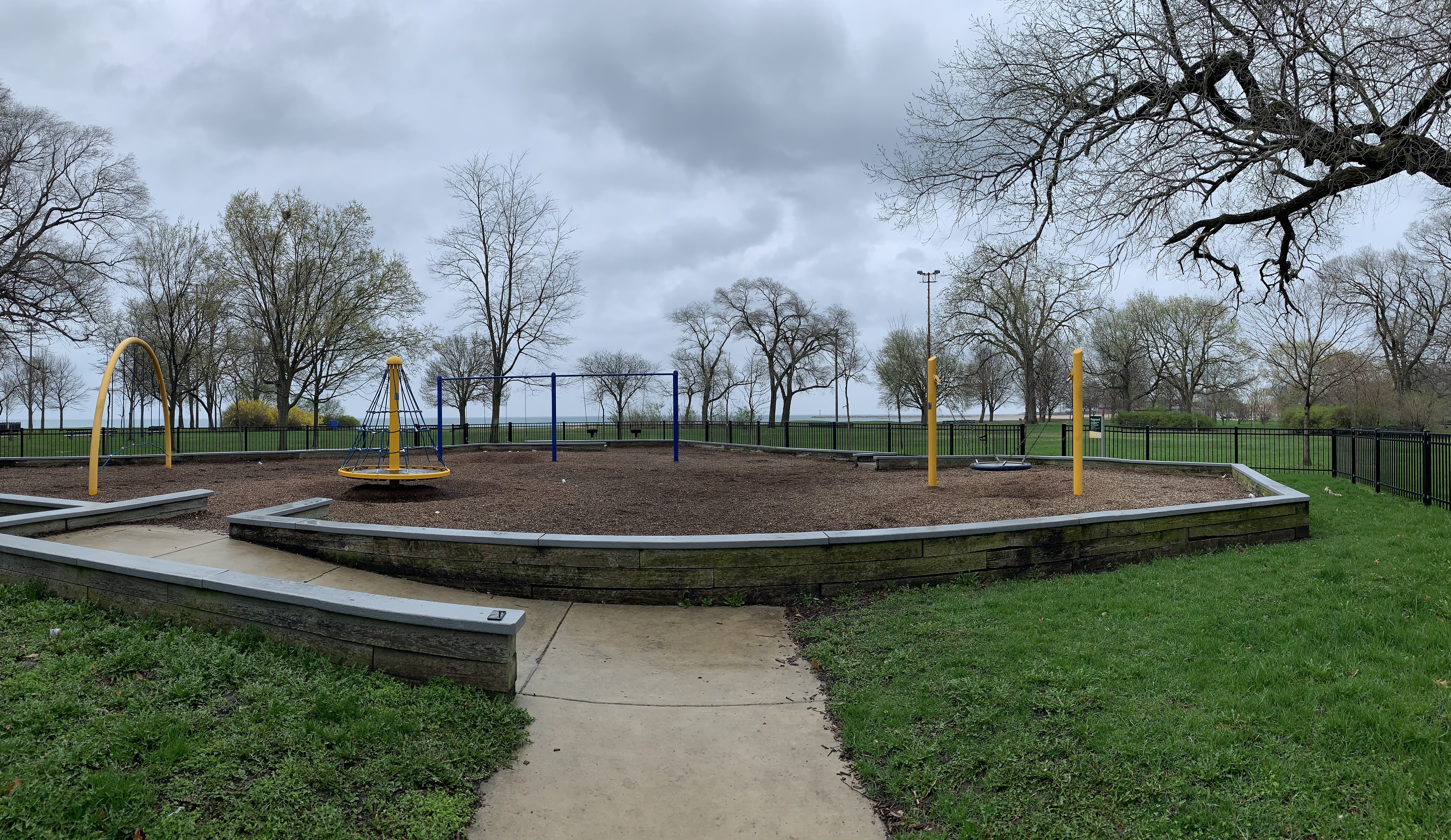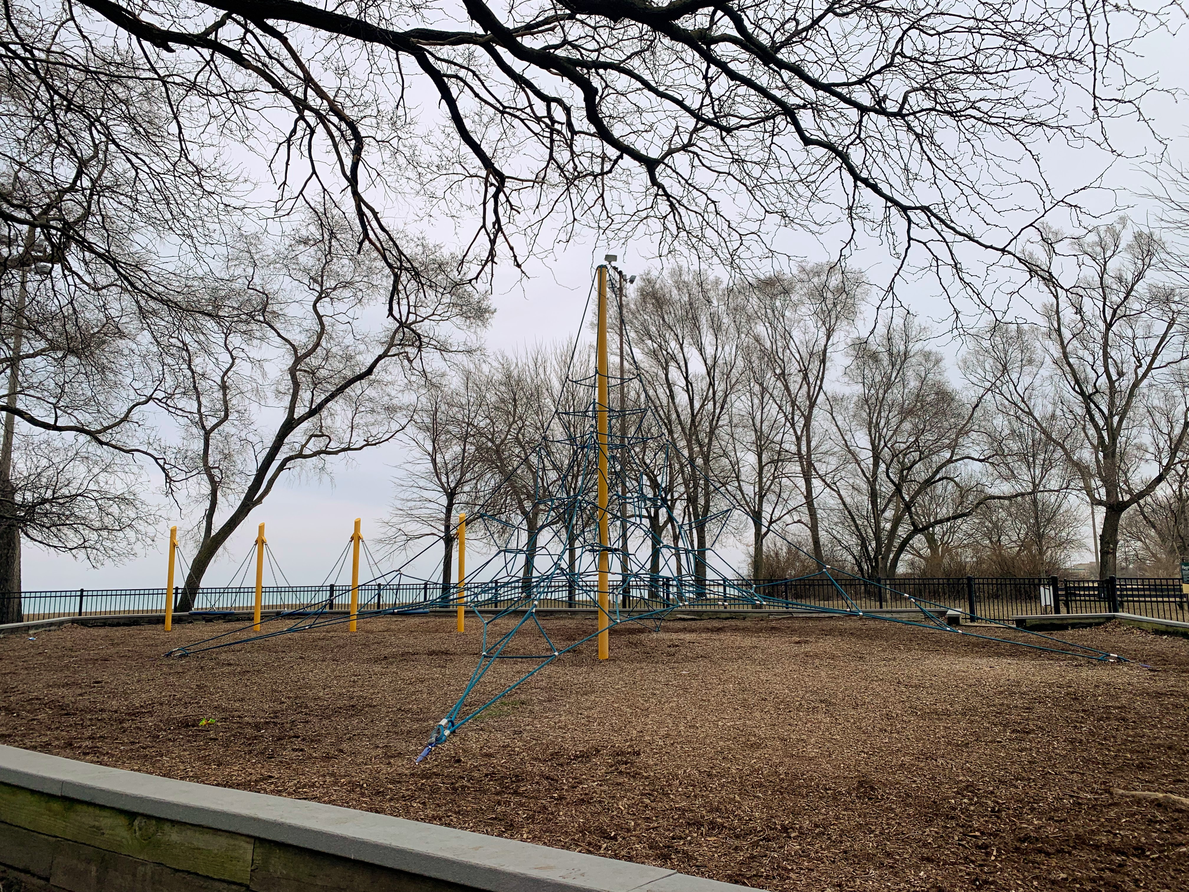 - The playgrounds at Rainbow Beach are located toward the northwest corner of the park and are two fully enclosed play area next to each other. They both feature unique net/rope climbing structures and a variety of swings: toddler, belt seat, and hammock saucer swings. The play surface of both is wood chips and though there aren't benches in the immediate area the low perimeter walls offer some informal seating. Situated away from traffic and with great views of Lake Michigan, these somewhat small playgrounds are gems and are worth the trip.