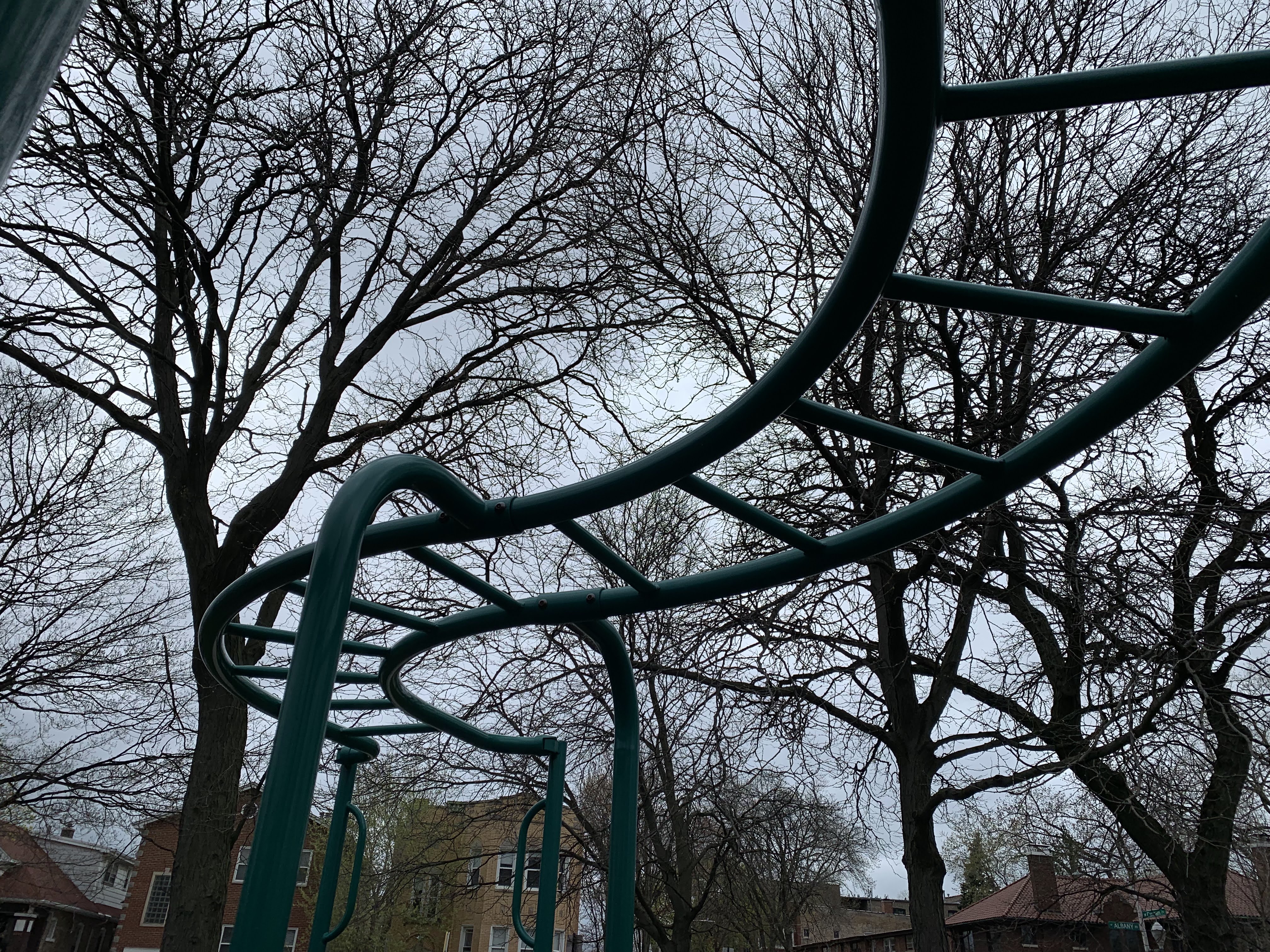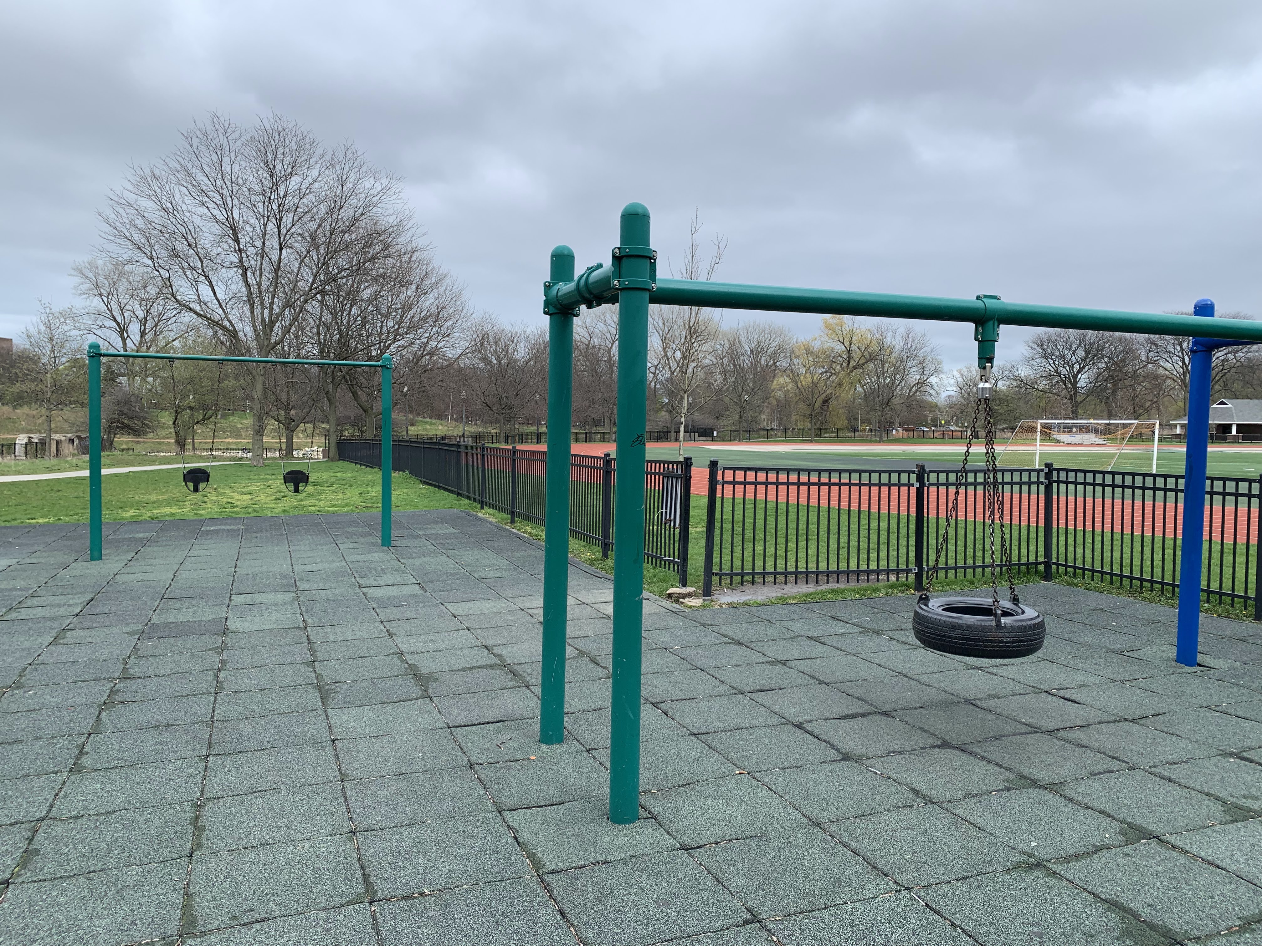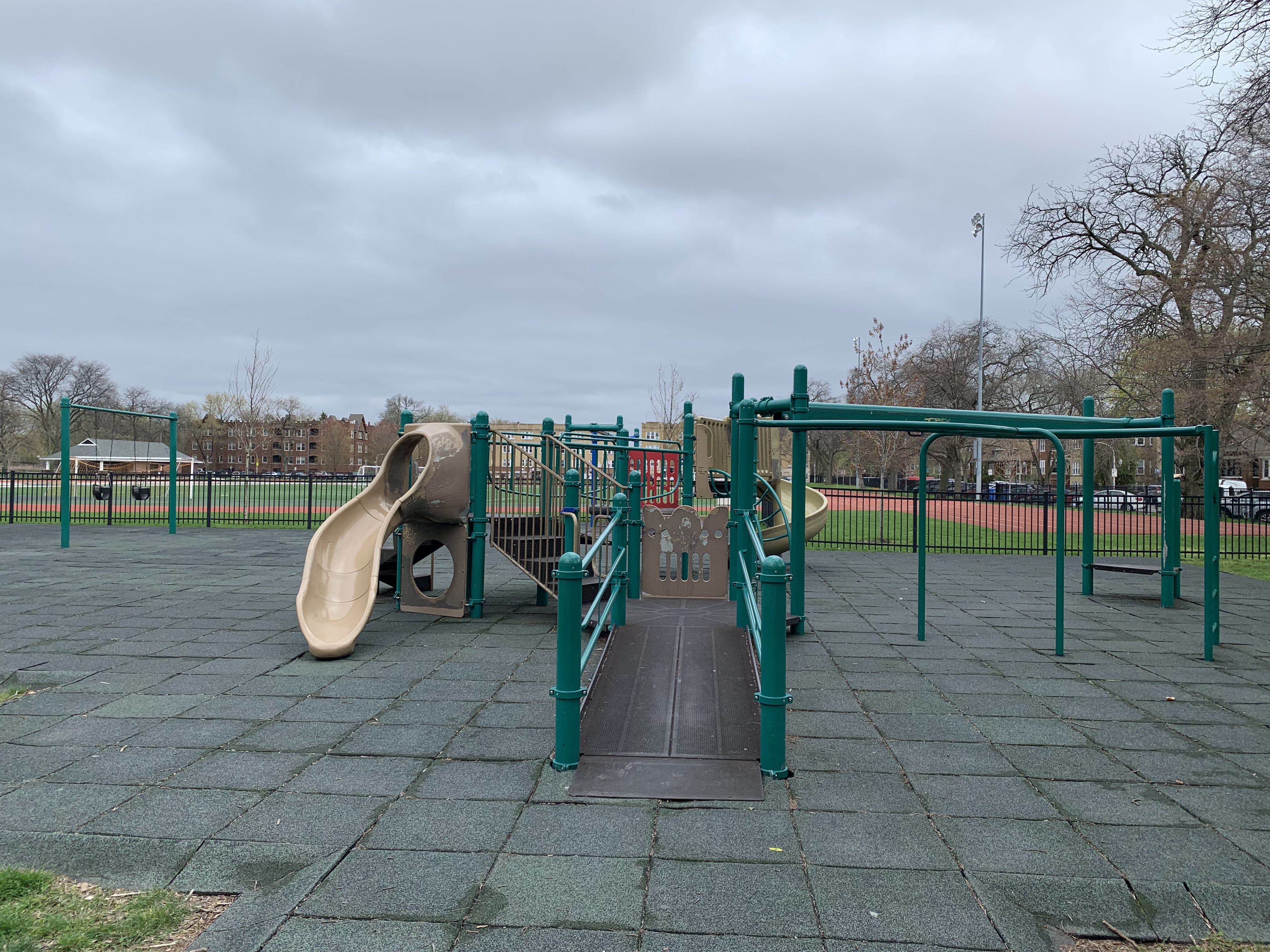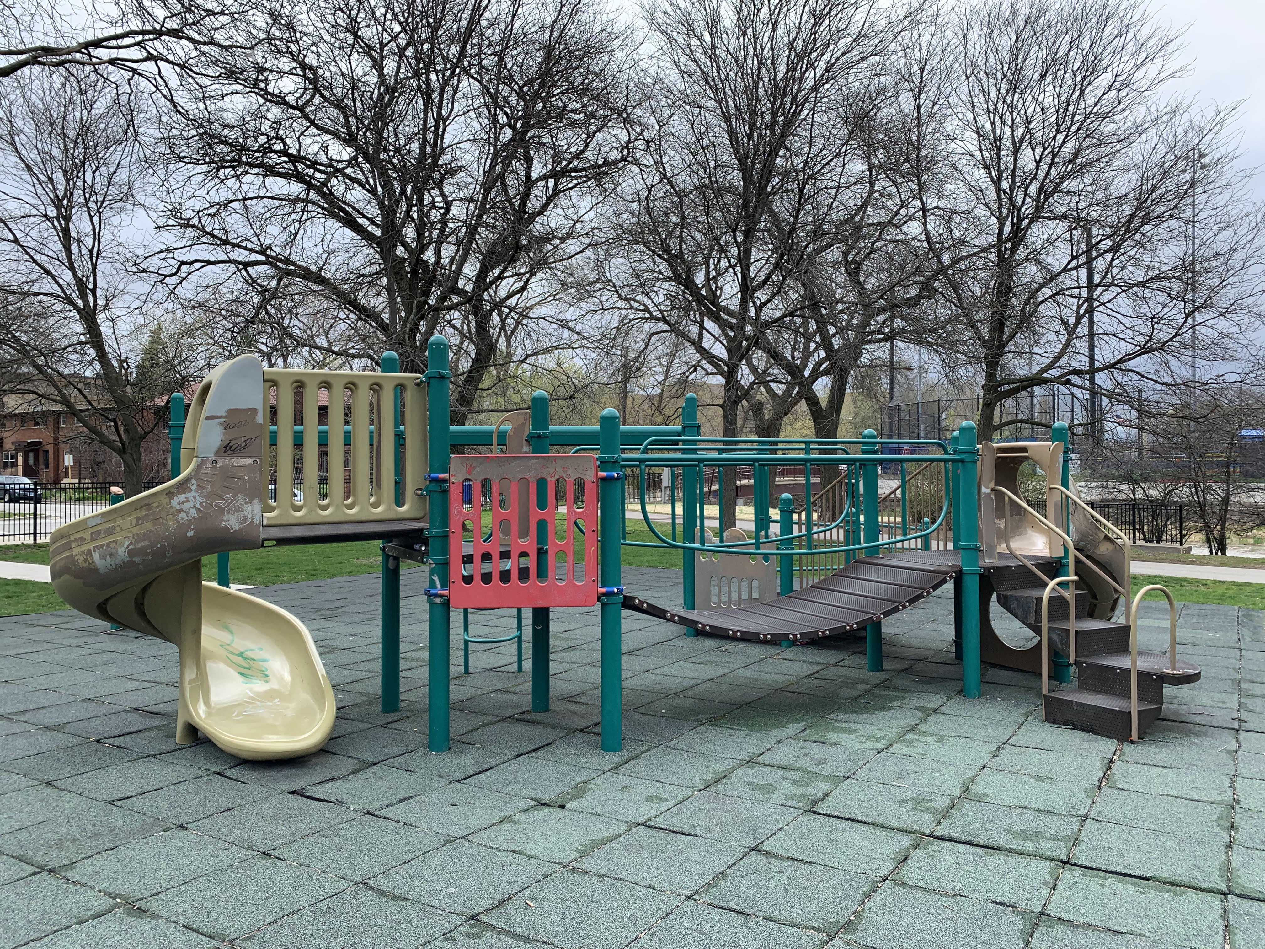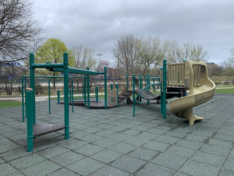 - This small playground - one of two in River Park - sits on the west side of the park near the corner of Carmen and Albany and the confluence of the North Branch of the Chicago River and the North Shore Channel. This playground is quite small and features toddler swings and a tire swing, an overhead slider and S-shaped monkey bars, and a small play structure. The surface is rubberized and gets some afternoon shade from nearby trees.