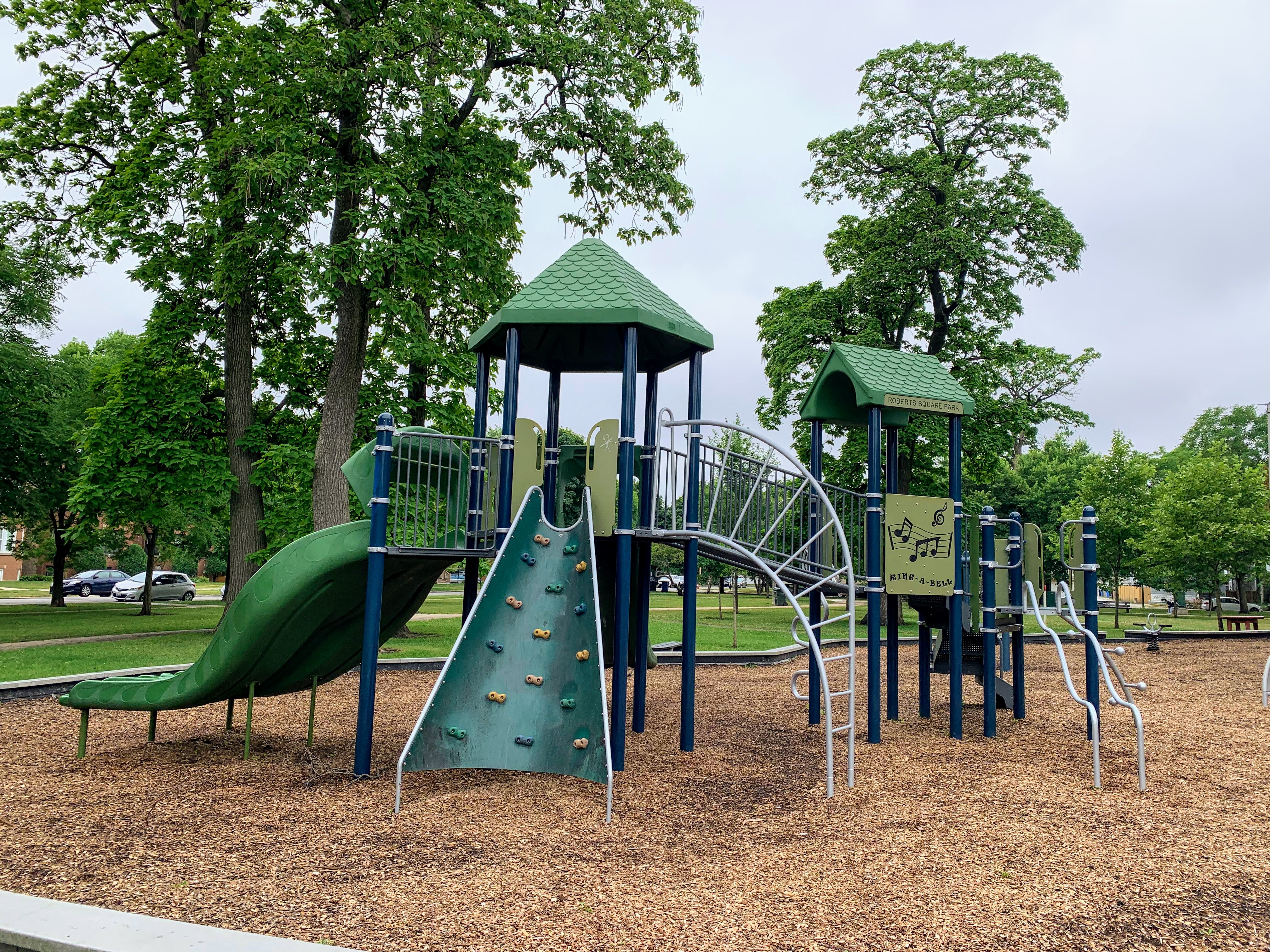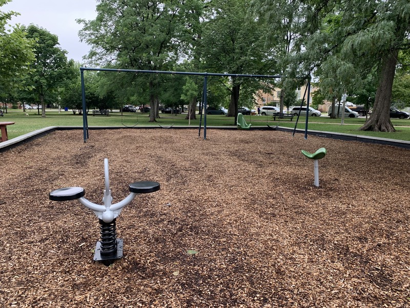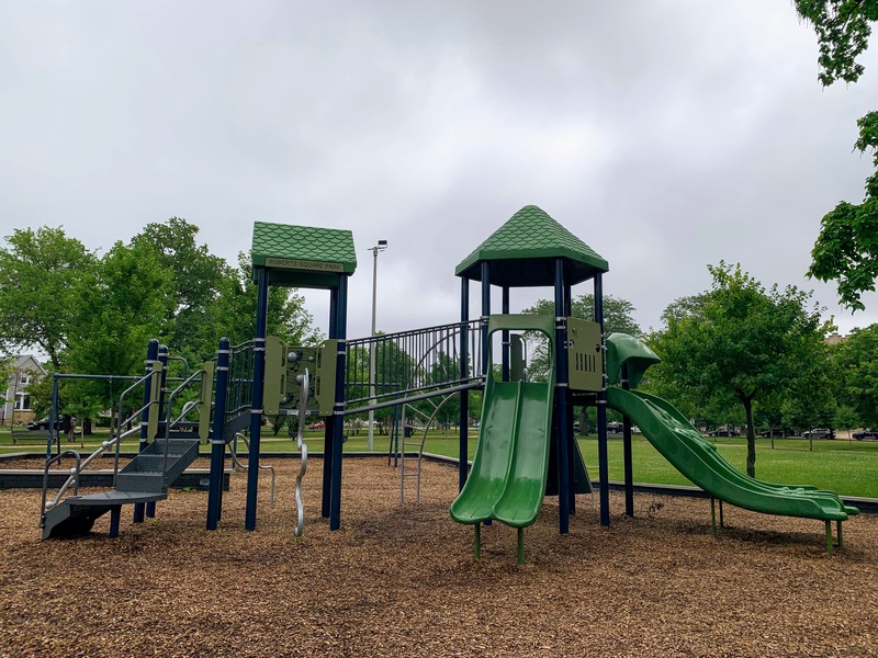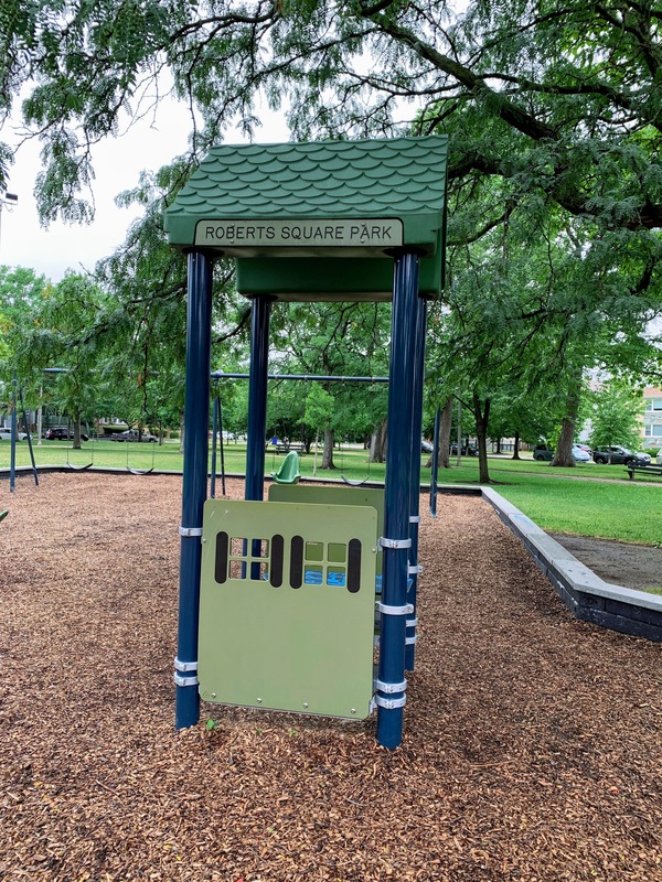 - The playground at Roberts Square Park is right in the middle of the park and features a large play structure, a variety of swings, and a sandbox. The play structure features a few slides and a variety of climbing elements (though no monkey bars) and there is a small, twisting metal structure with climbing wall holds. There are the standard Chicago Park swings (toddler, adaptive, and belt seat) as well as a tire swing. There are also a few standalone elements and a playhouse as well as a sand play area. Neither the playground nor the park are fenced from the street though the playground has short walls that provide some informal seating and a sense of boundaries. The main play surface is wood chips and large mature trees provide some shade in this otherwise bright and sunny park.
