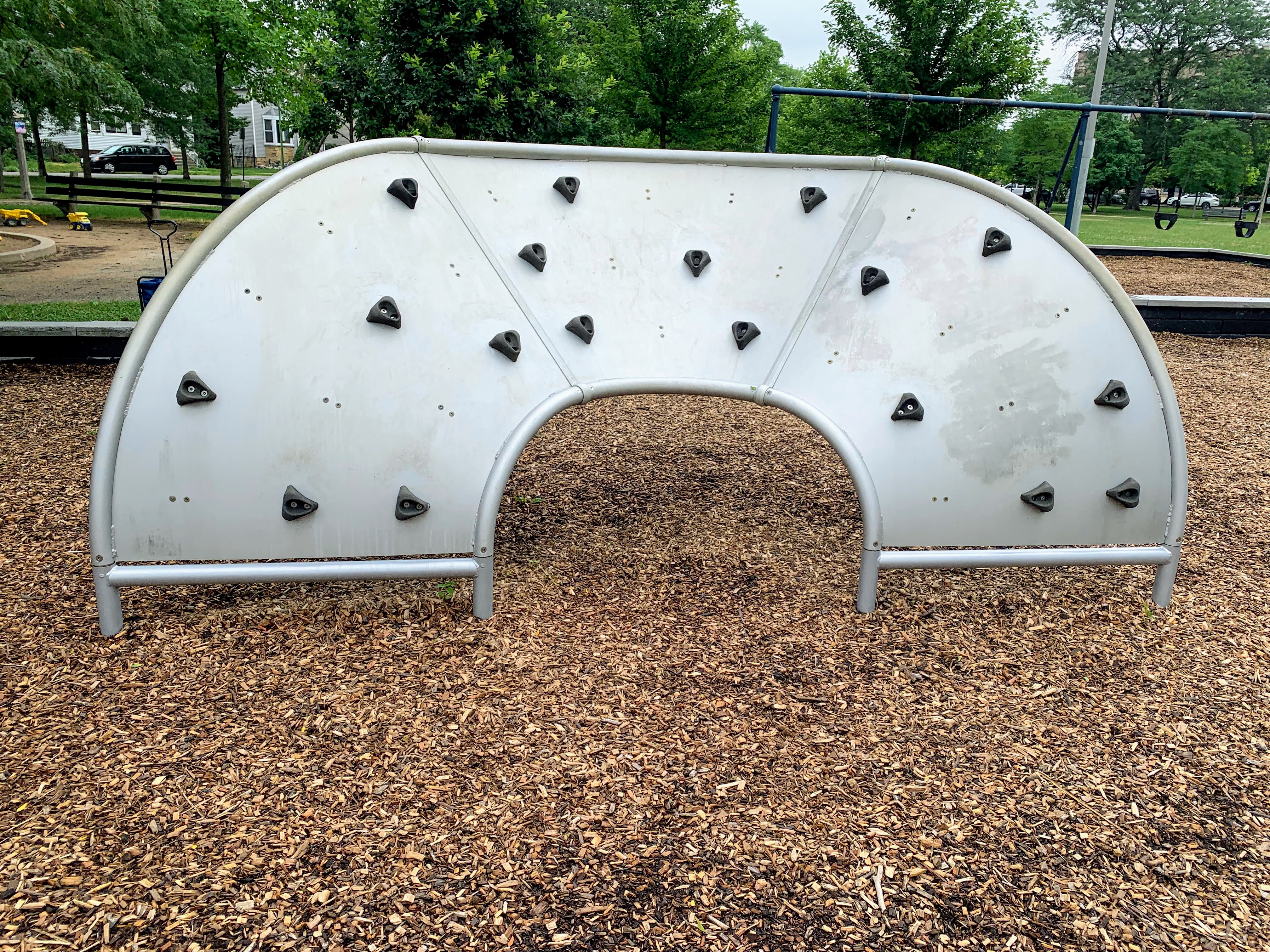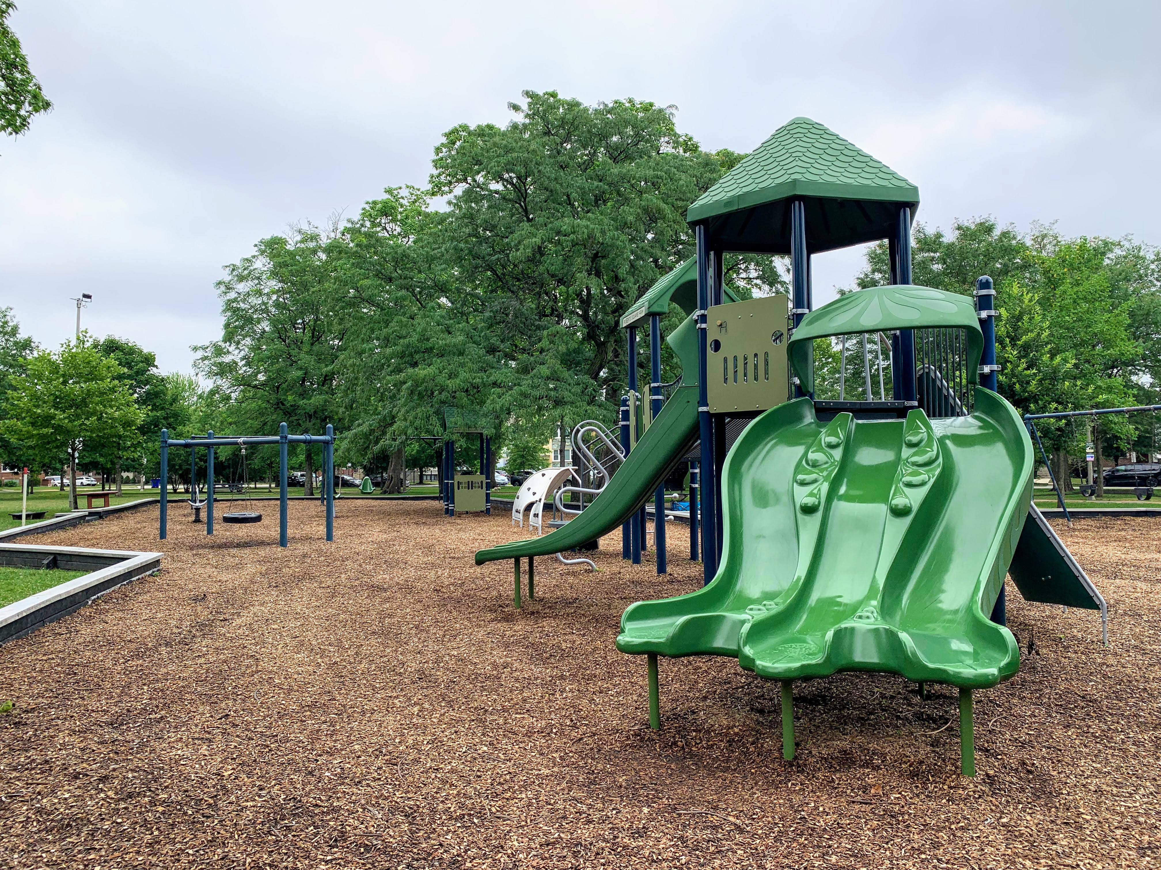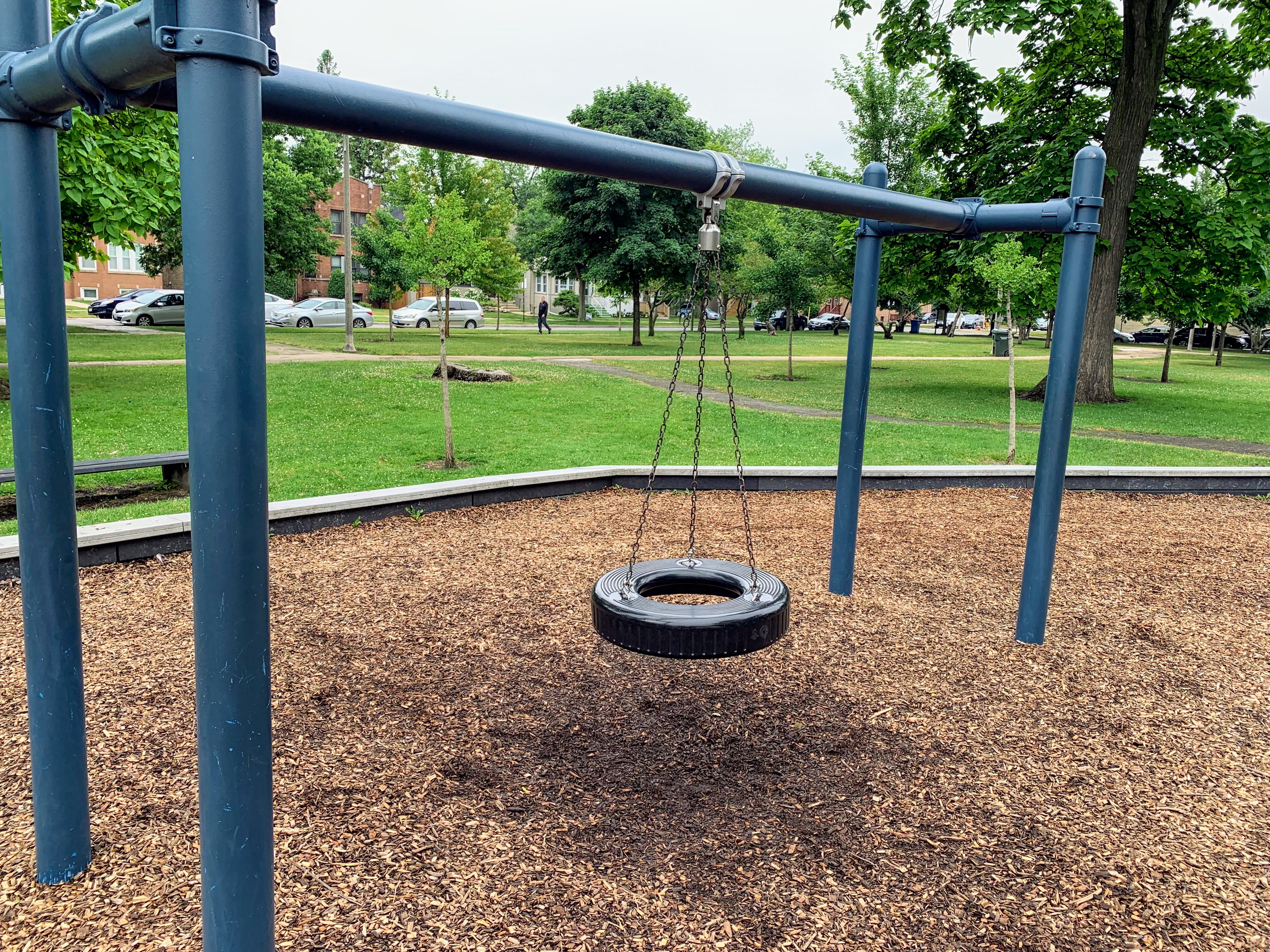 - The playground at Roberts Square Park is right in the middle of the park and features a large play structure, a variety of swings, and a sandbox. The play structure features a few slides and a variety of climbing elements (though no monkey bars) and there is a small, twisting metal structure with climbing wall holds. There are the standard Chicago Park swings (toddler, adaptive, and belt seat) as well as a tire swing. There are also a few standalone elements and a playhouse as well as a sand play area. Neither the playground nor the park are fenced from the street though the playground has short walls that provide some informal seating and a sense of boundaries. The main play surface is wood chips and large mature trees provide some shade in this otherwise bright and sunny park.