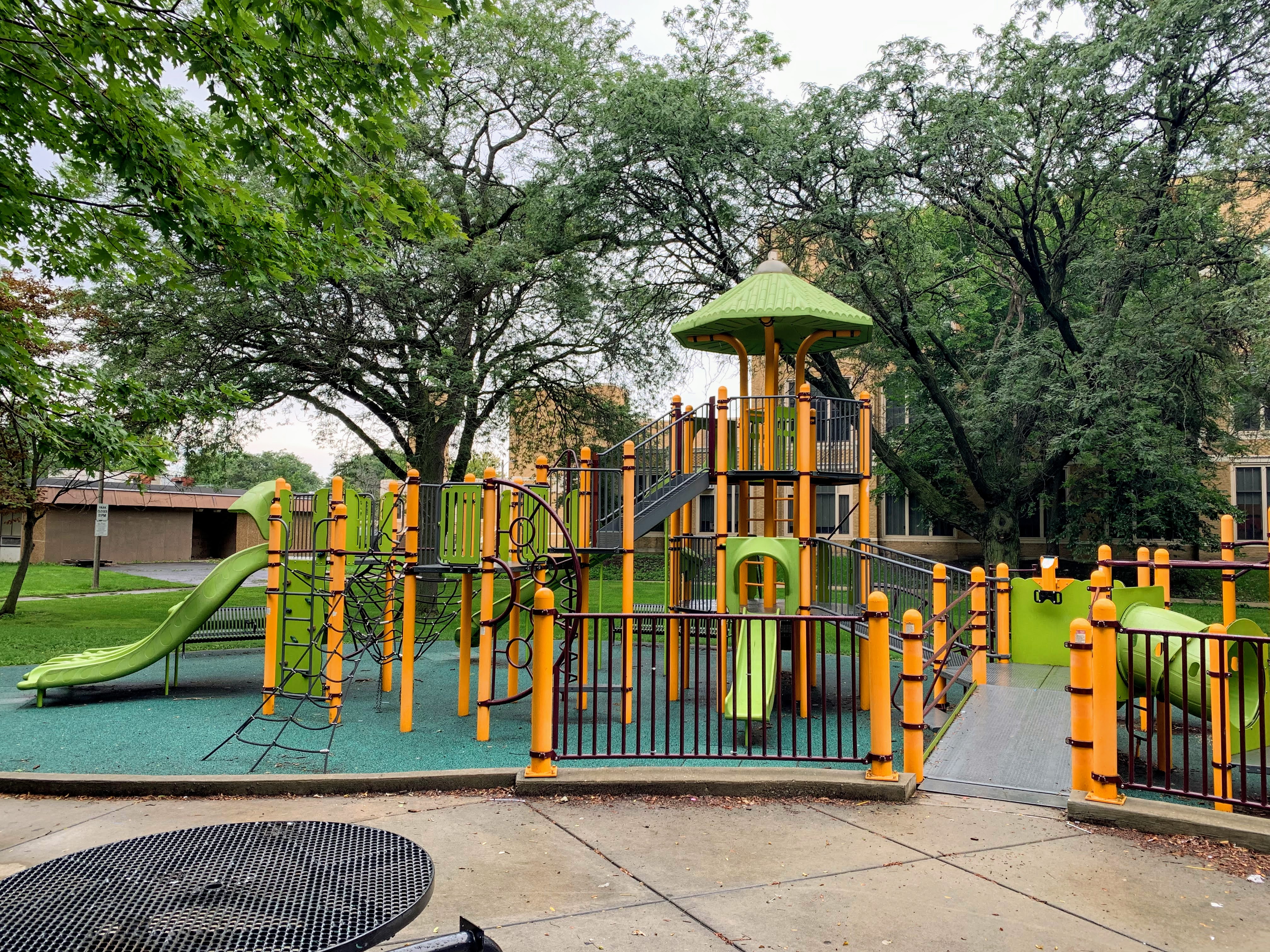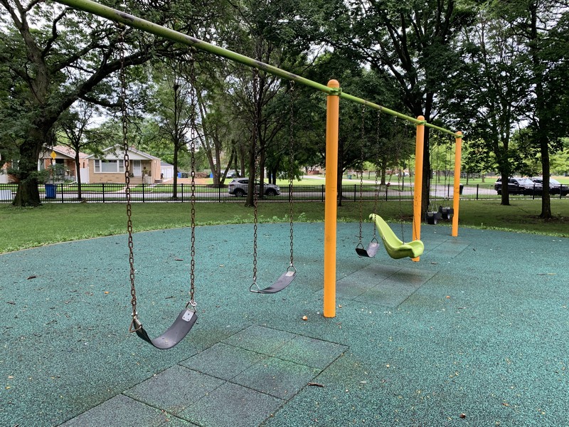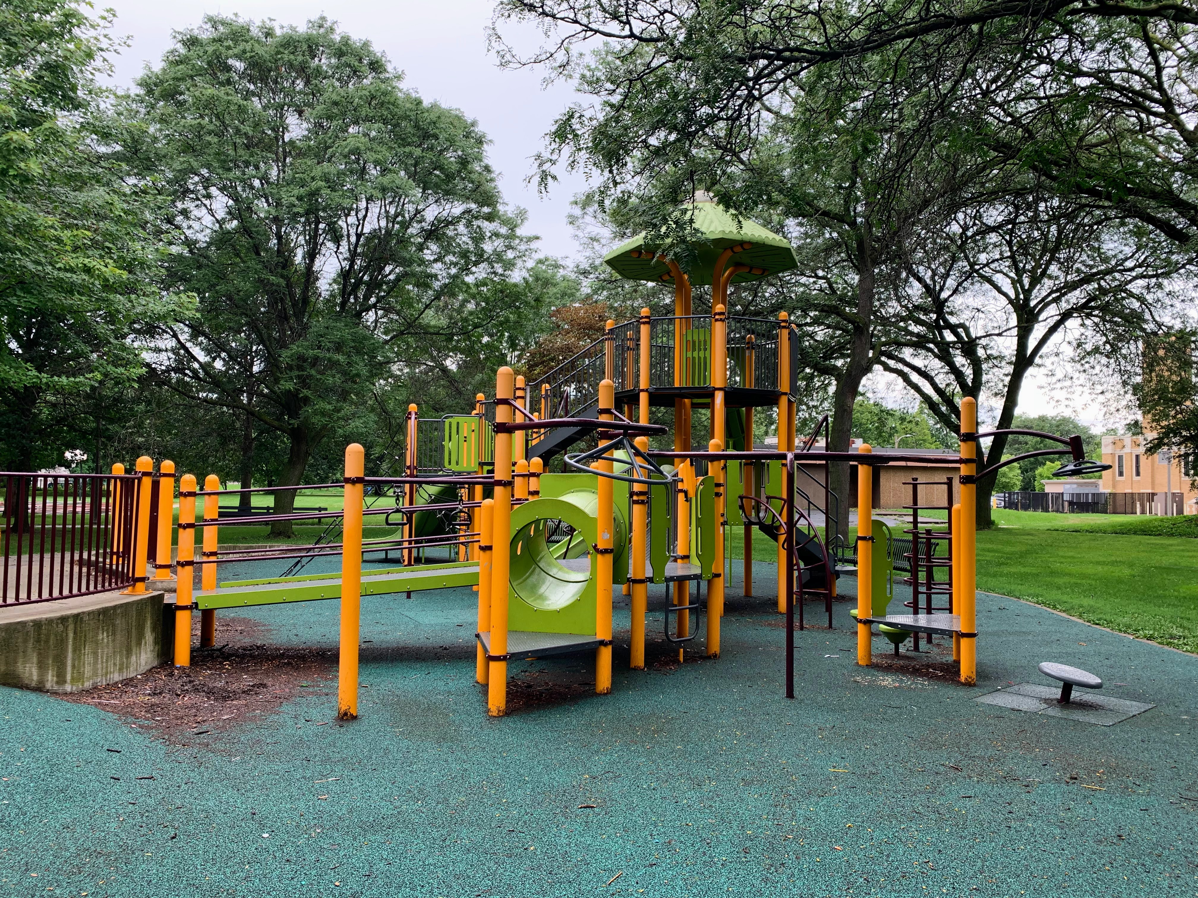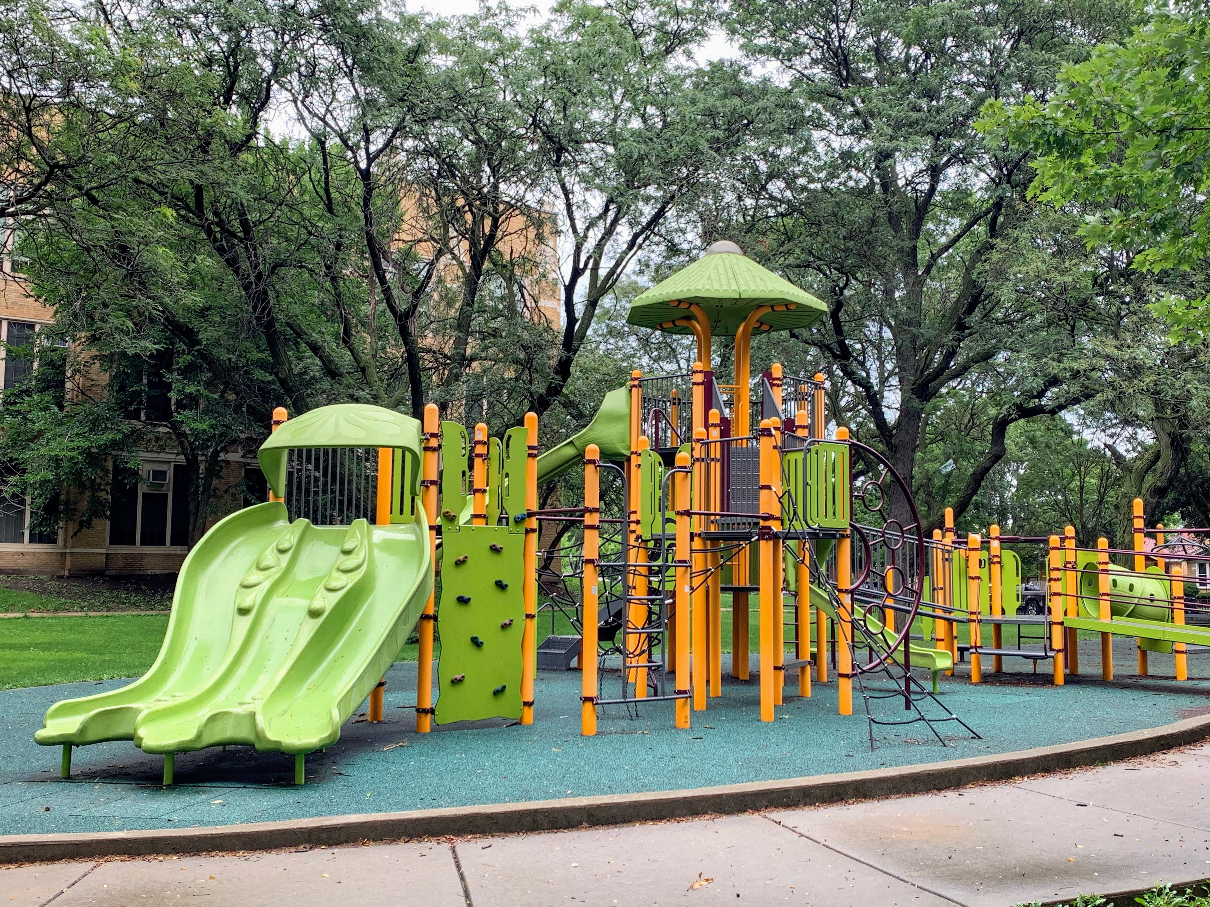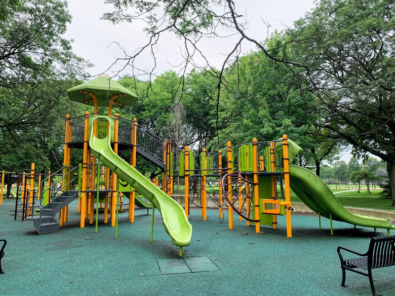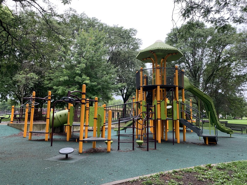 On the northside of Jackie Robinson Park and shaded by large trees, there is a huge and wonderful playground. It is a single large structure that sprawls and soars; it sprawls to include a variety of ramps and climbing elements and soars to great heights with a three story central core. There are a few standalone elements and the standard set of Chicago Park swings but the huge structure is the main attraction.