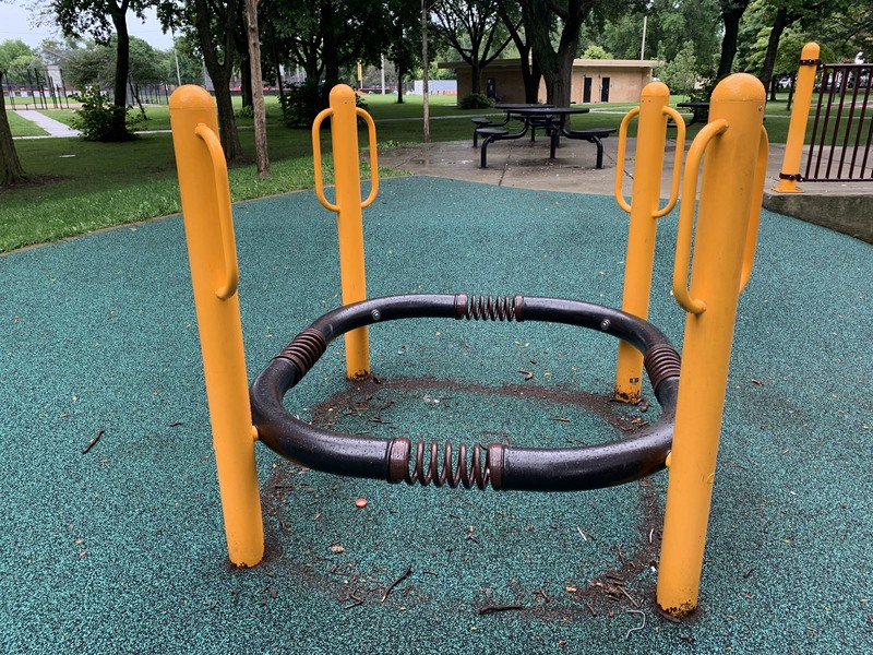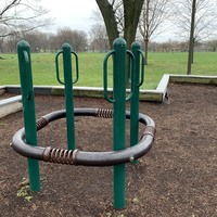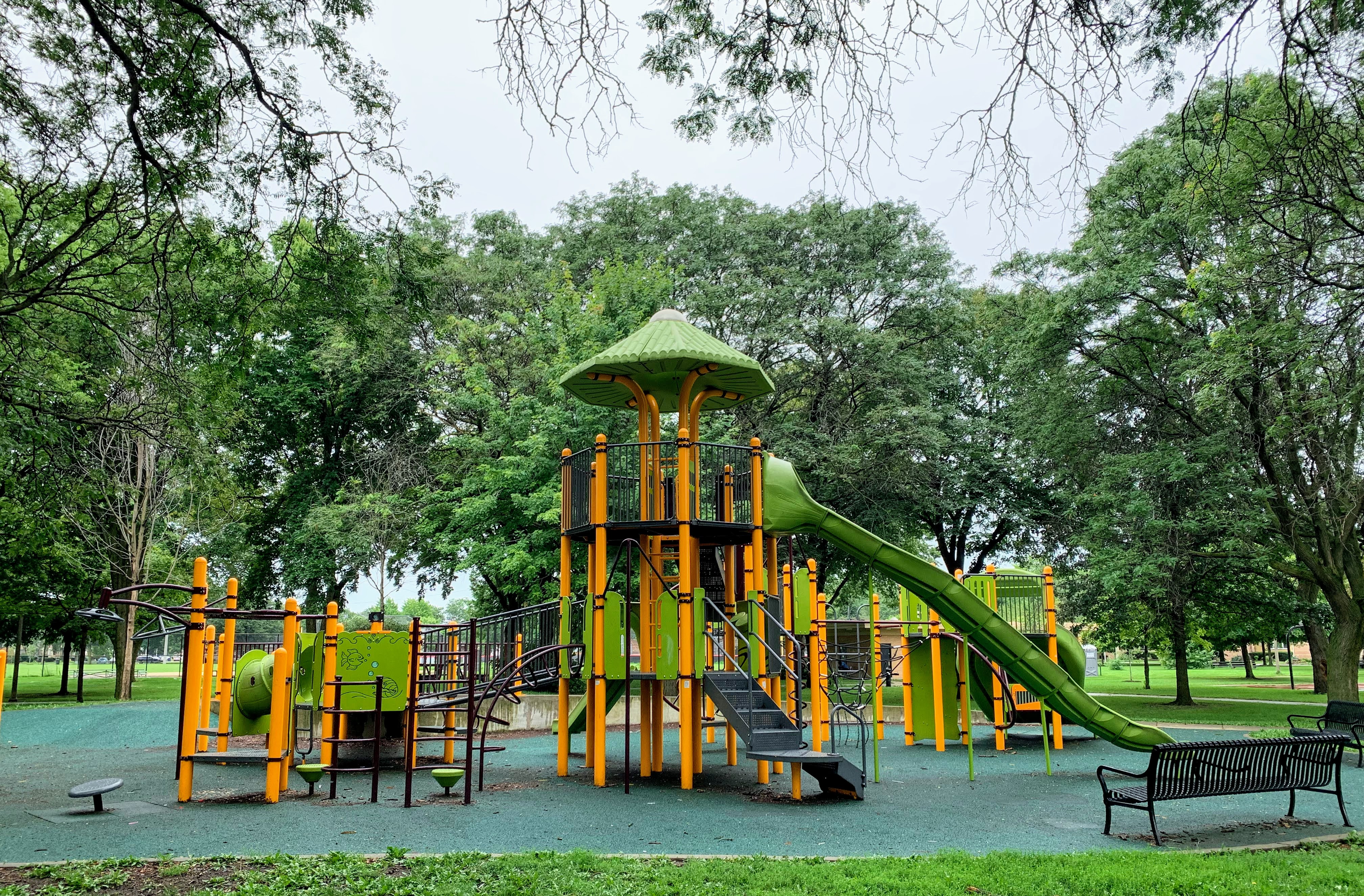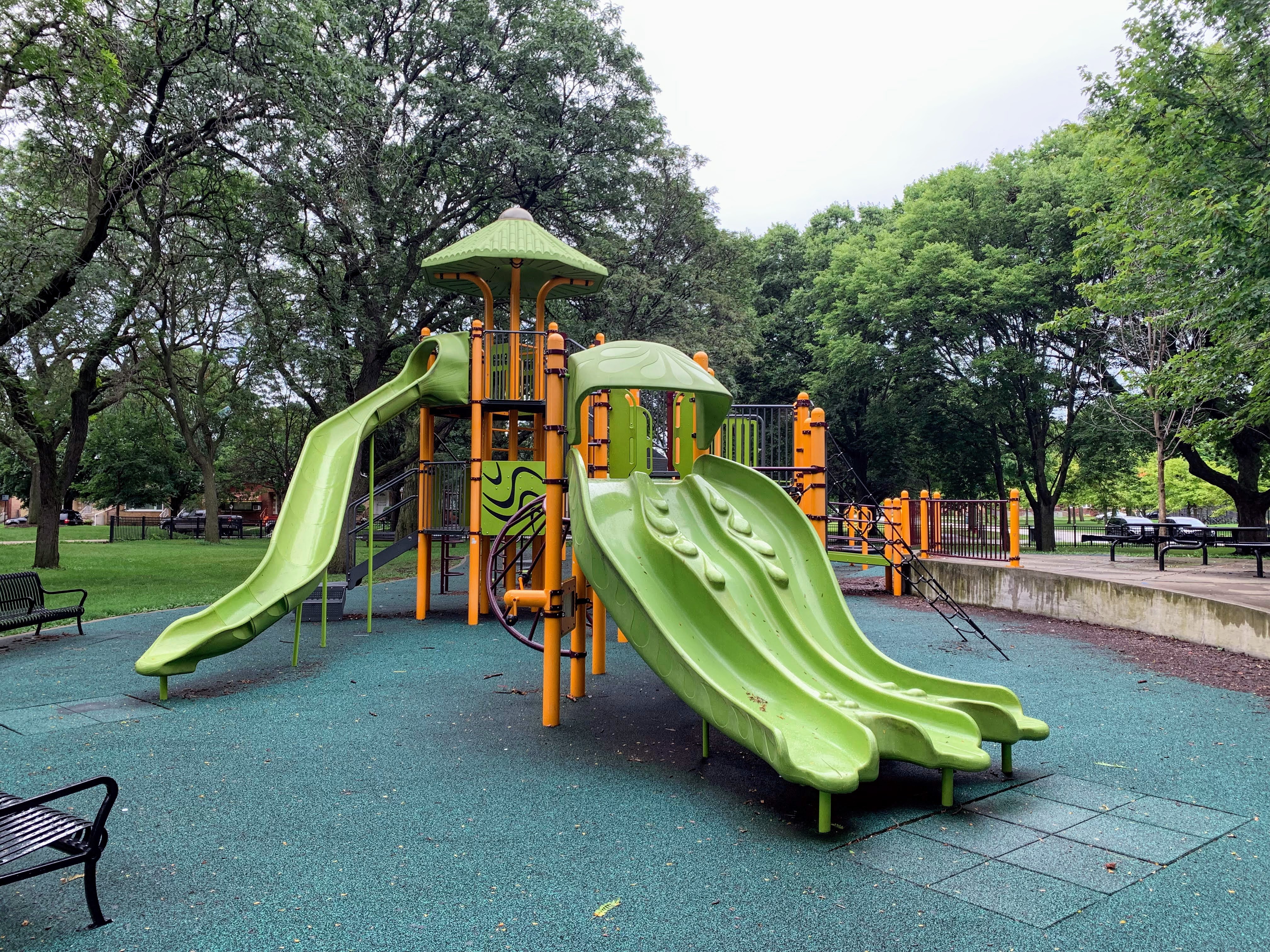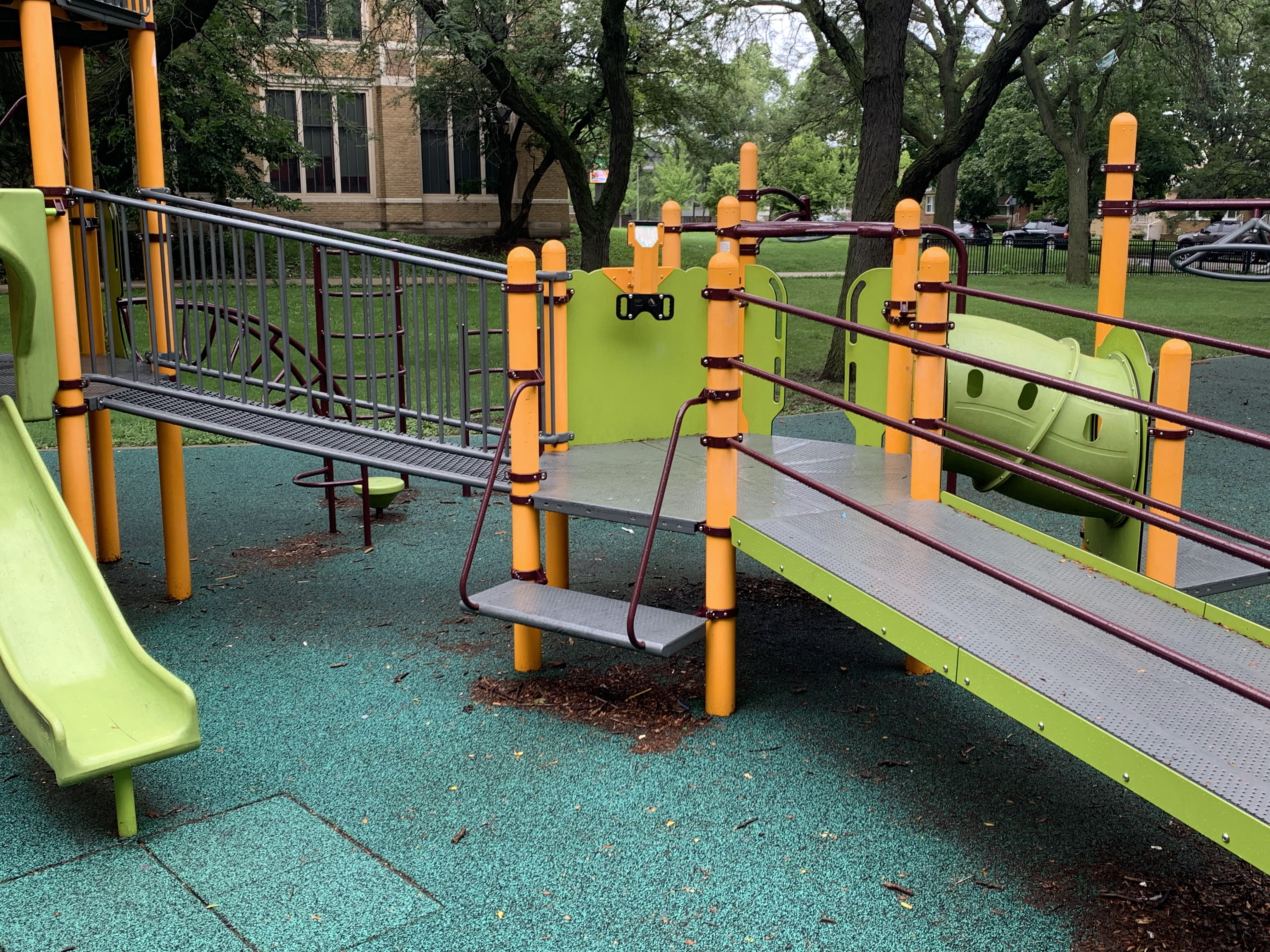 On the northside of Jackie Robinson Park and shaded by large trees, there is a huge and wonderful playground. It is a single large structure that sprawls and soars; it sprawls to include a variety of ramps and climbing elements and soars to great heights with a three story central core. There are a few standalone elements and the standard set of Chicago Park swings but the huge structure is the main attraction.