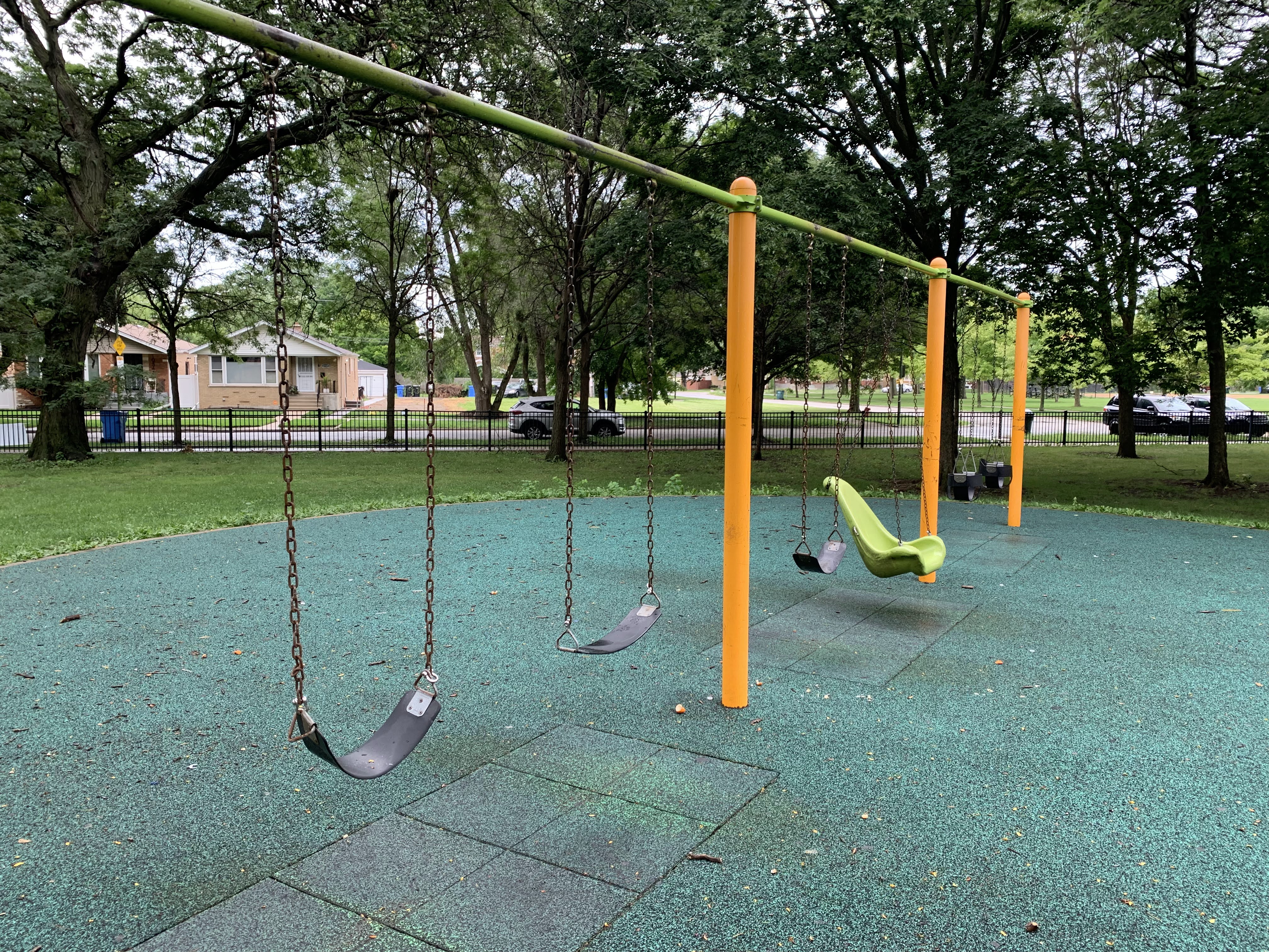 The amenities are solid too. Both benches and picnic tables offer ample seating. The play surface is soft rubber and the play area is shaded by large, mature trees that opens directly to the rest of the park. A small comfort station nearby provides access to bathrooms (when open).