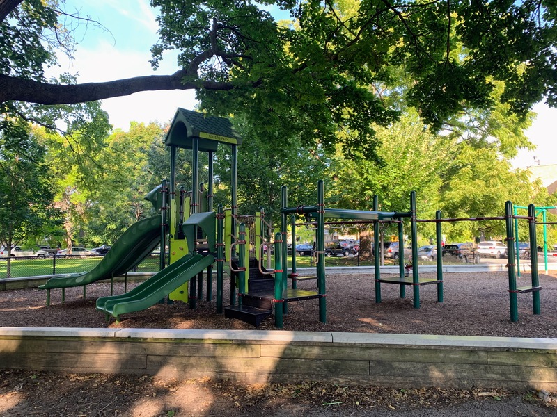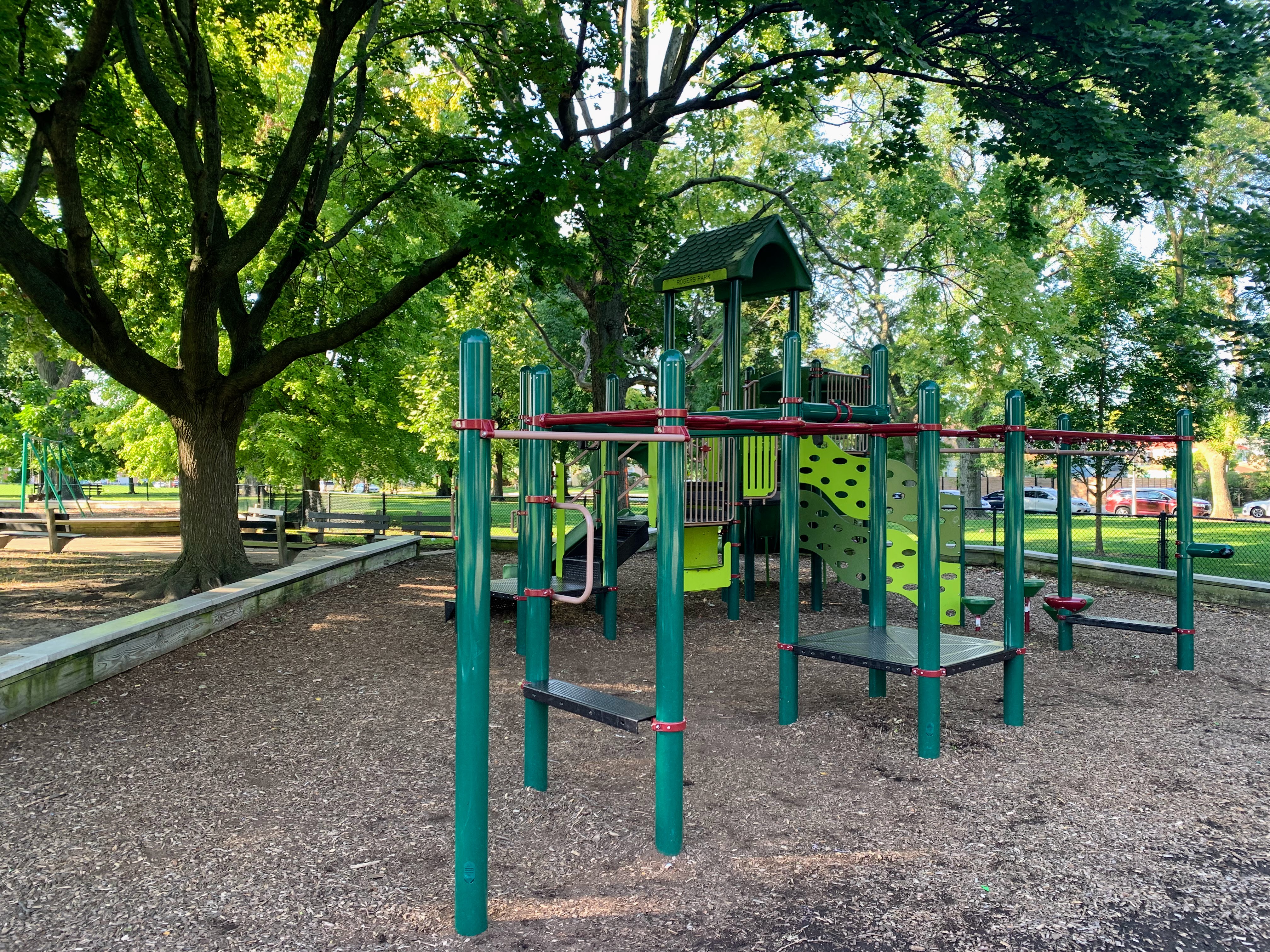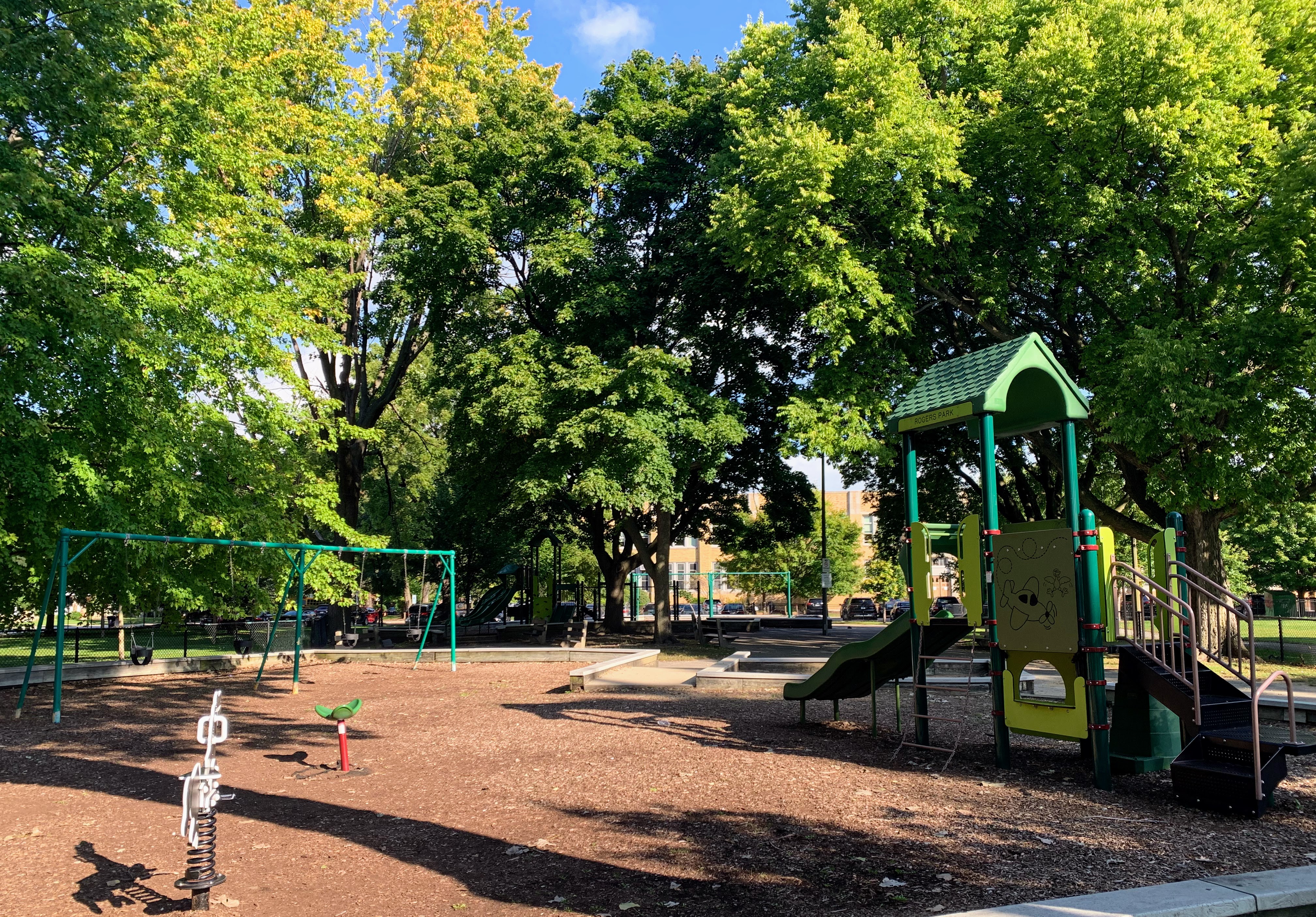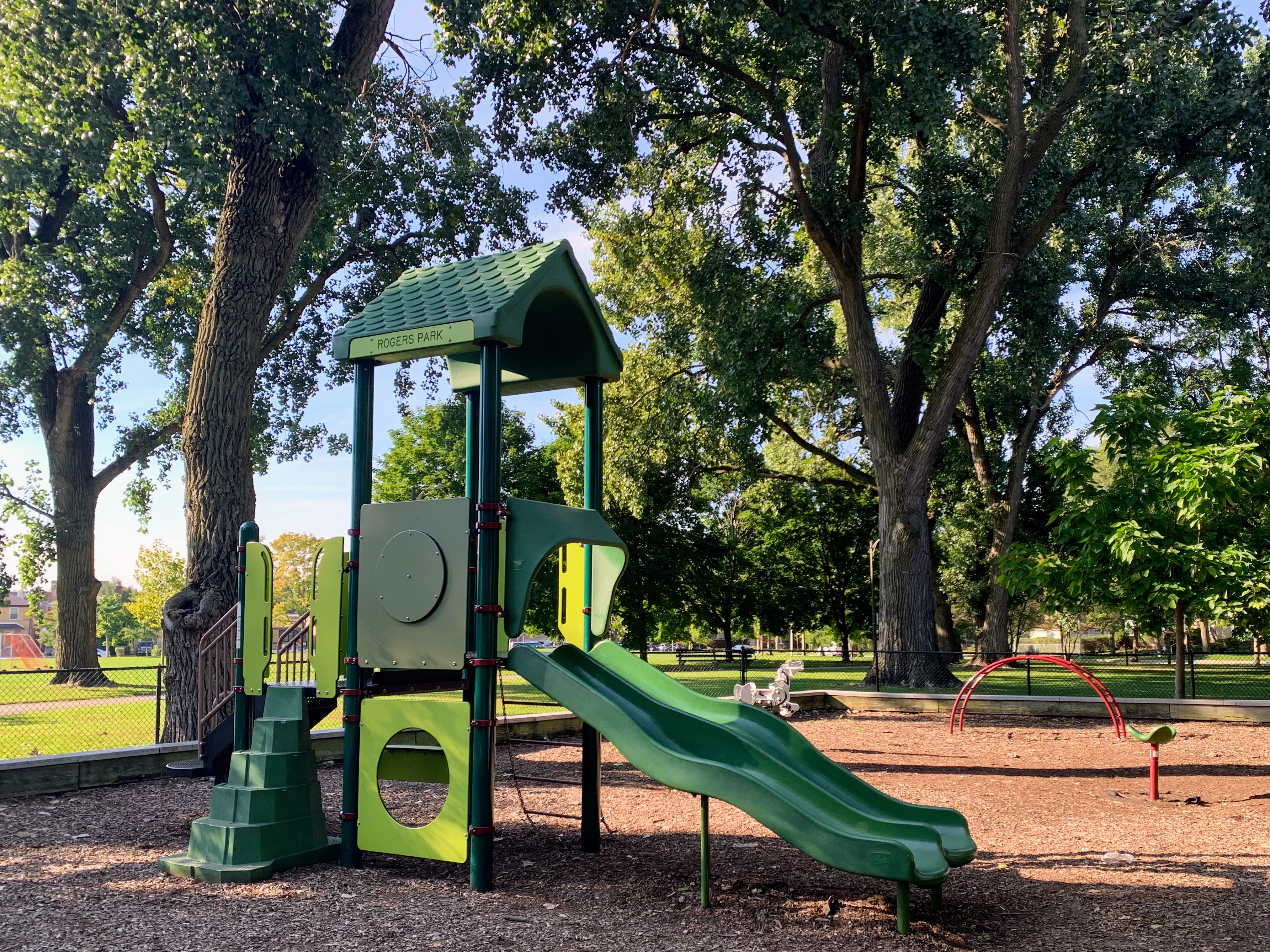 - This playground - located on the west side of Rogers Park - is a great playground shaded by large trees. There are two areas; one is for younger children and the other is for older children. The larger structure features a number of interesting and unique overhead elements as well as a few slides and climbing elements. This site also has a few standalone elements and the Chicago Park standard swings: toddler, adaptive, and belt seat. In my opinion, the best non-playable amenities are shade and benches and this playground has both. The site is fully enclosed and the play surface is wood chips. All in all, it is a great neighborhood playground; highly recommend.