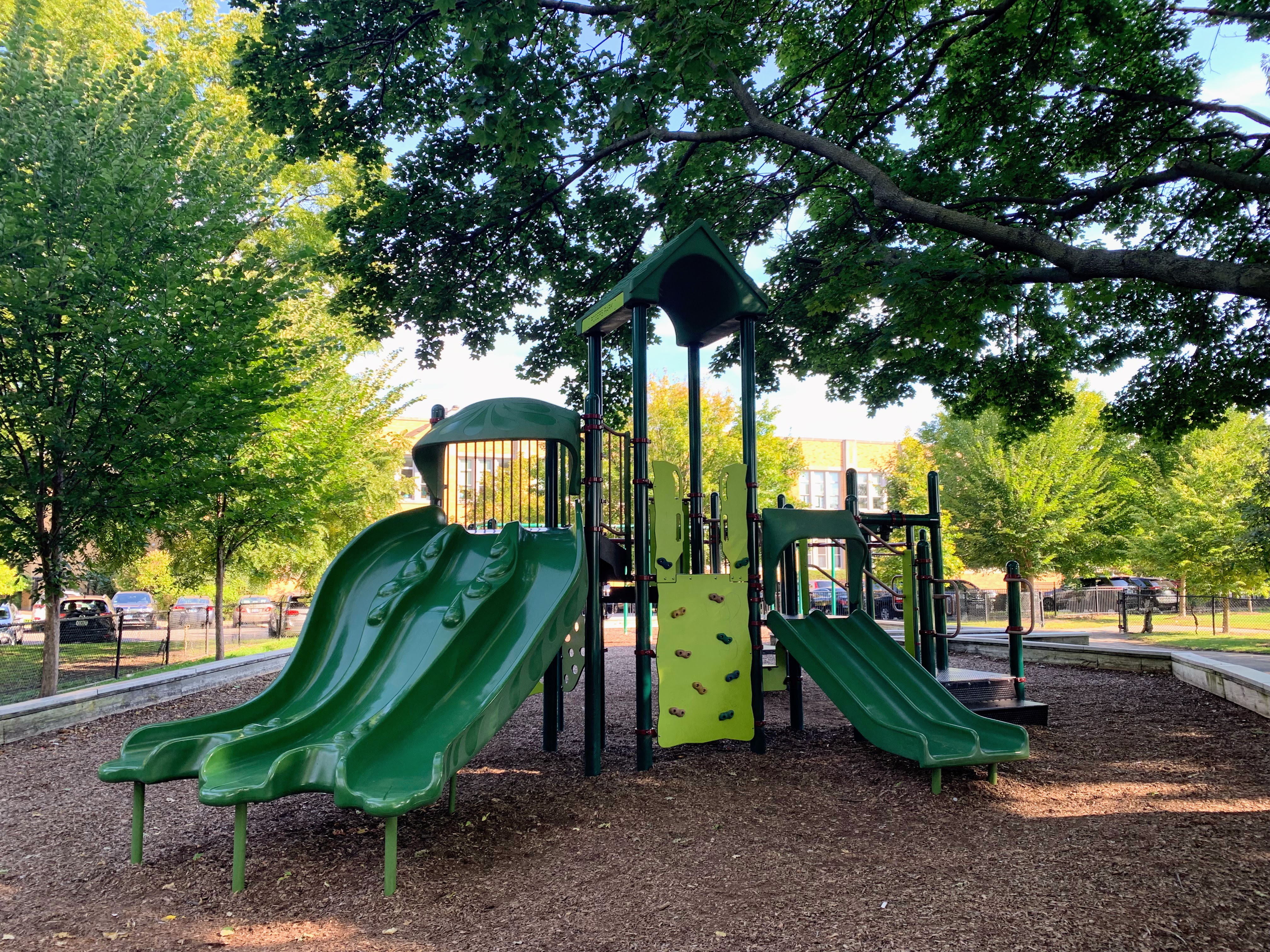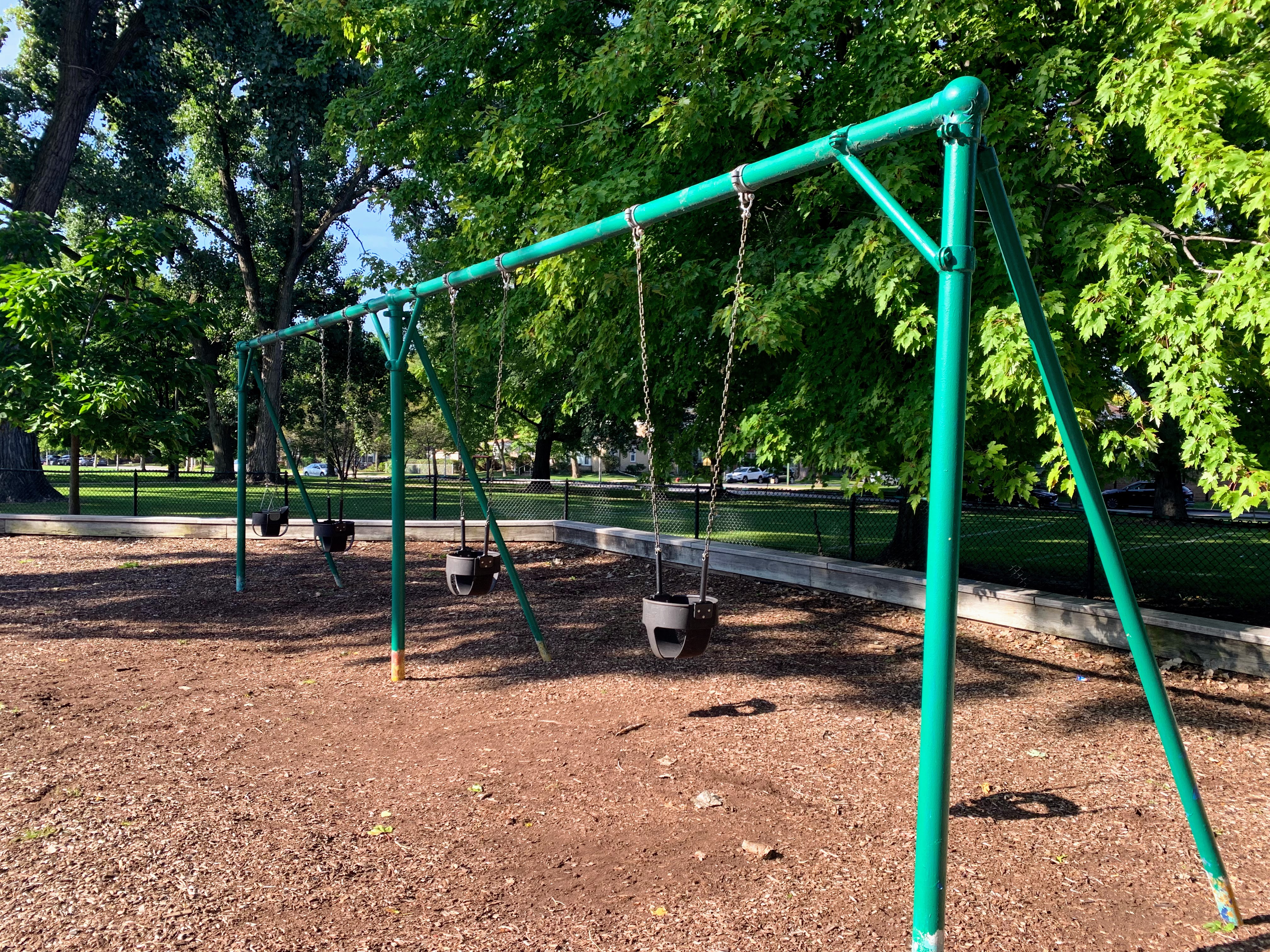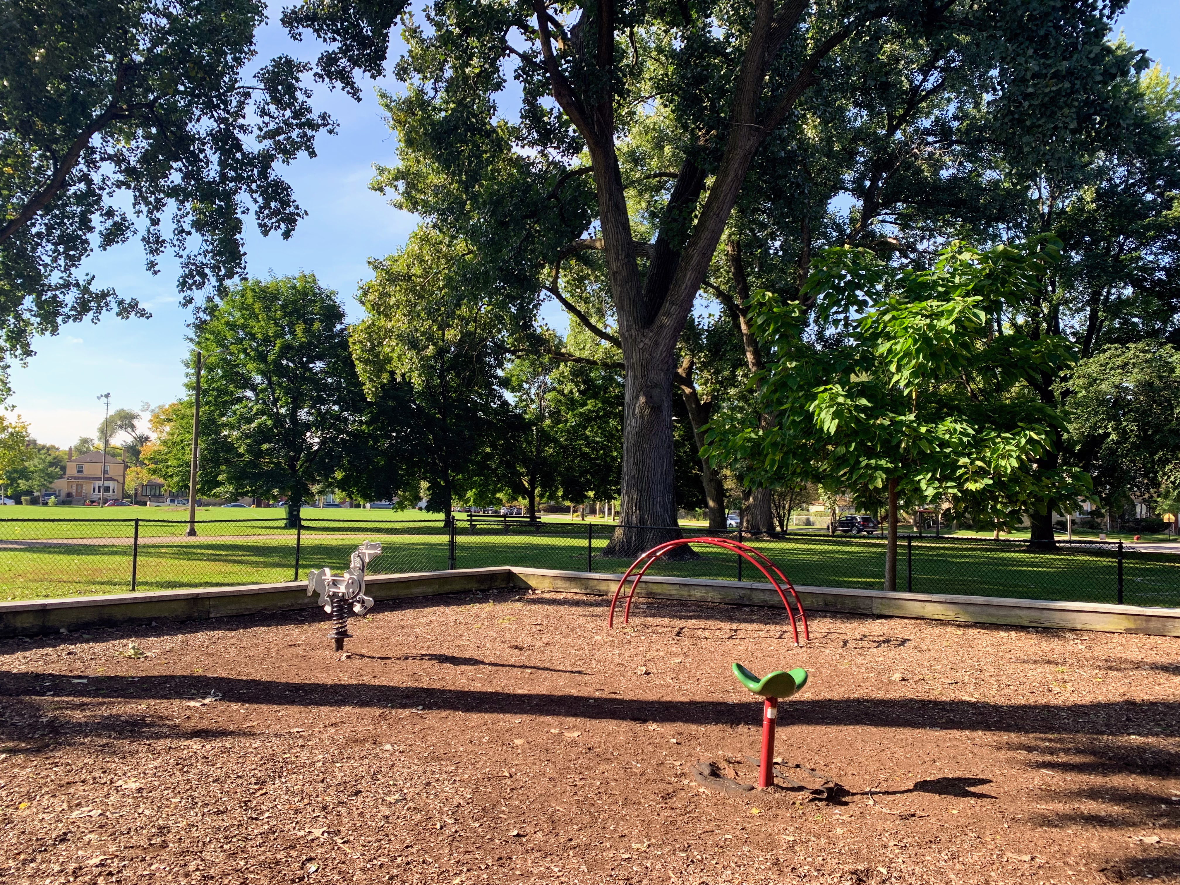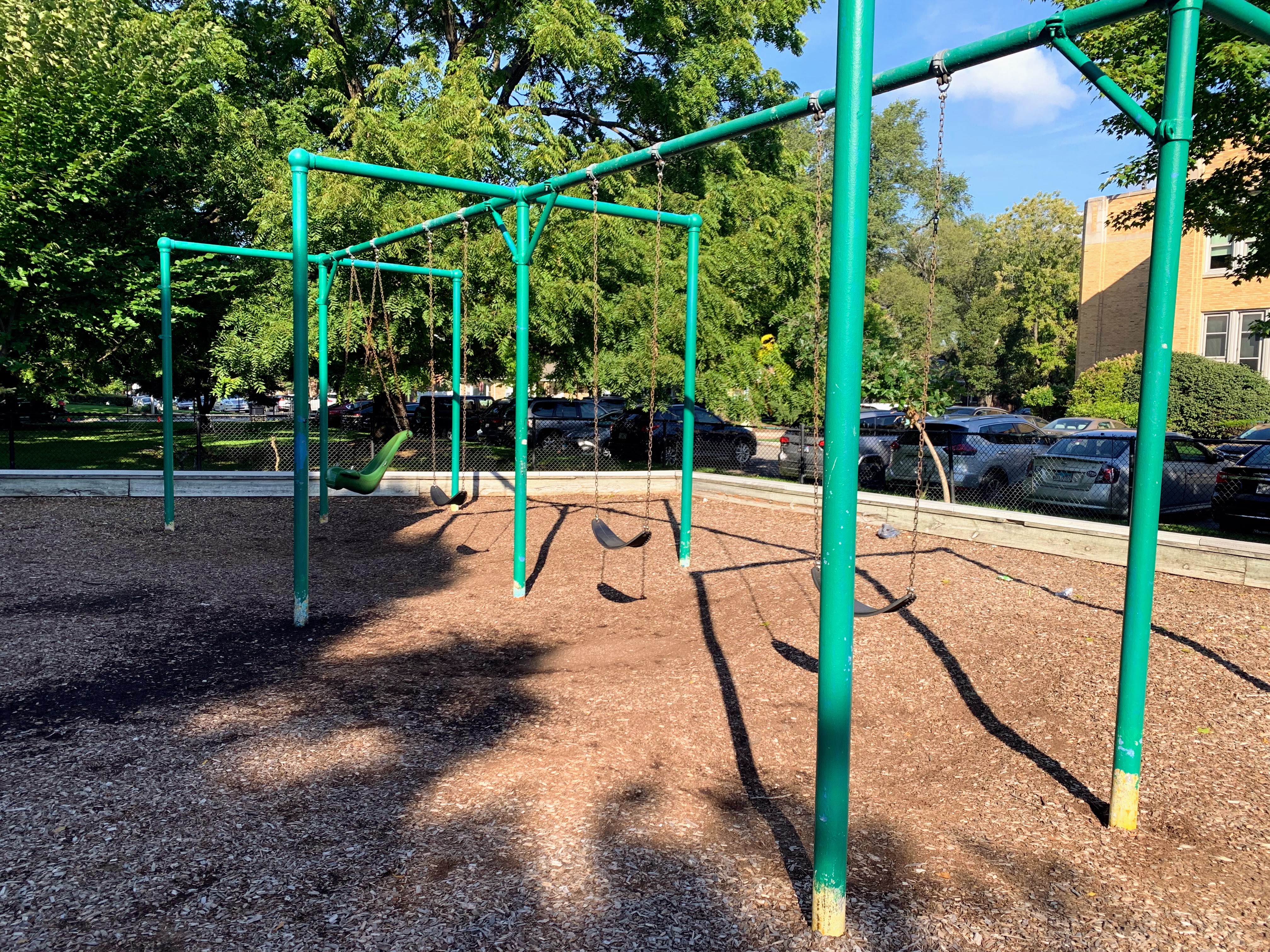 - This playground - located on the west side of Rogers Park - is a great playground shaded by large trees. There are two areas; one is for younger children and the other is for older children. The larger structure features a number of interesting and unique overhead elements as well as a few slides and climbing elements. This site also has a few standalone elements and the Chicago Park standard swings: toddler, adaptive, and belt seat. In my opinion, the best non-playable amenities are shade and benches and this playground has both. The site is fully enclosed and the play surface is wood chips. All in all, it is a great neighborhood playground; highly recommend.