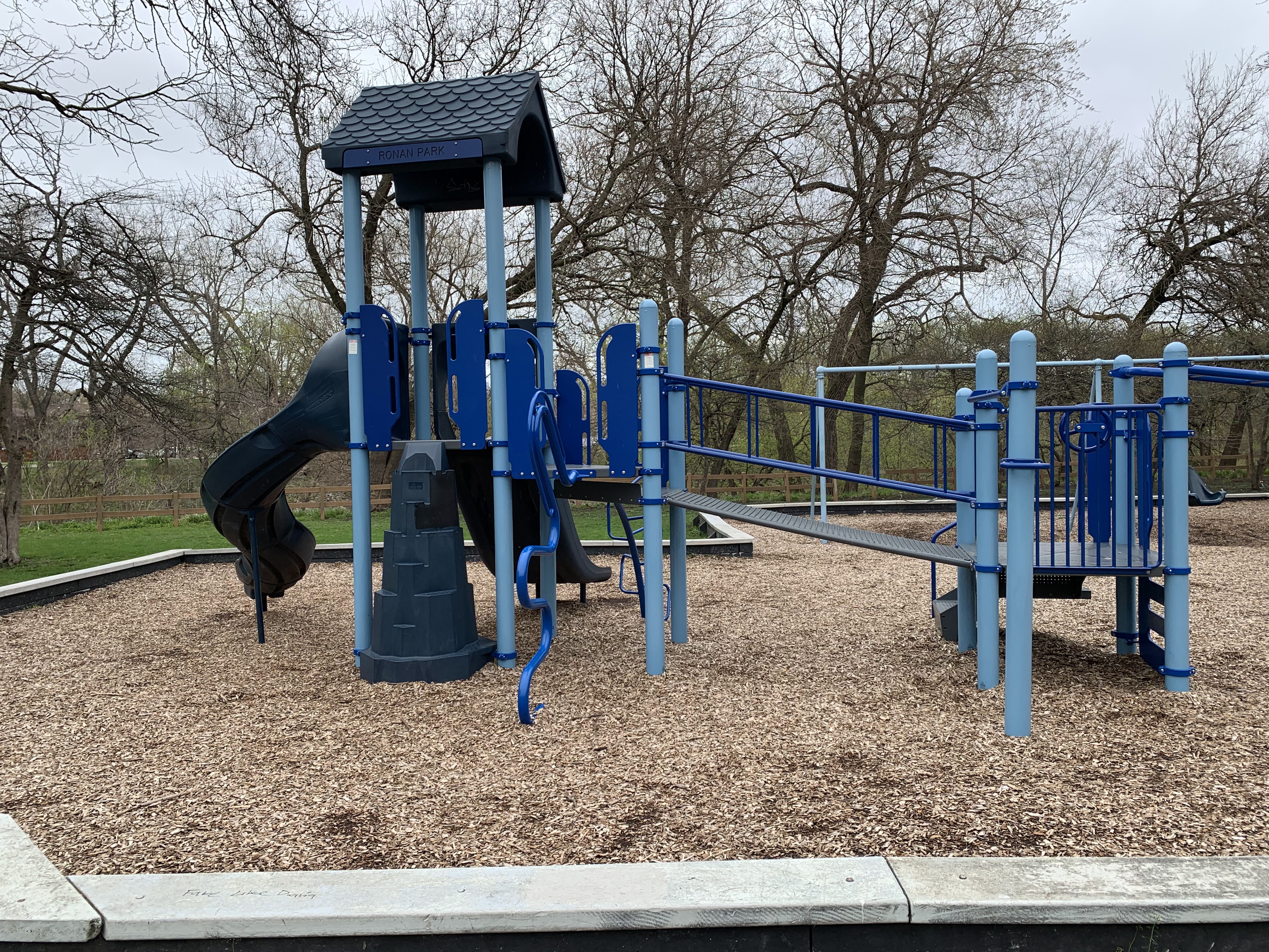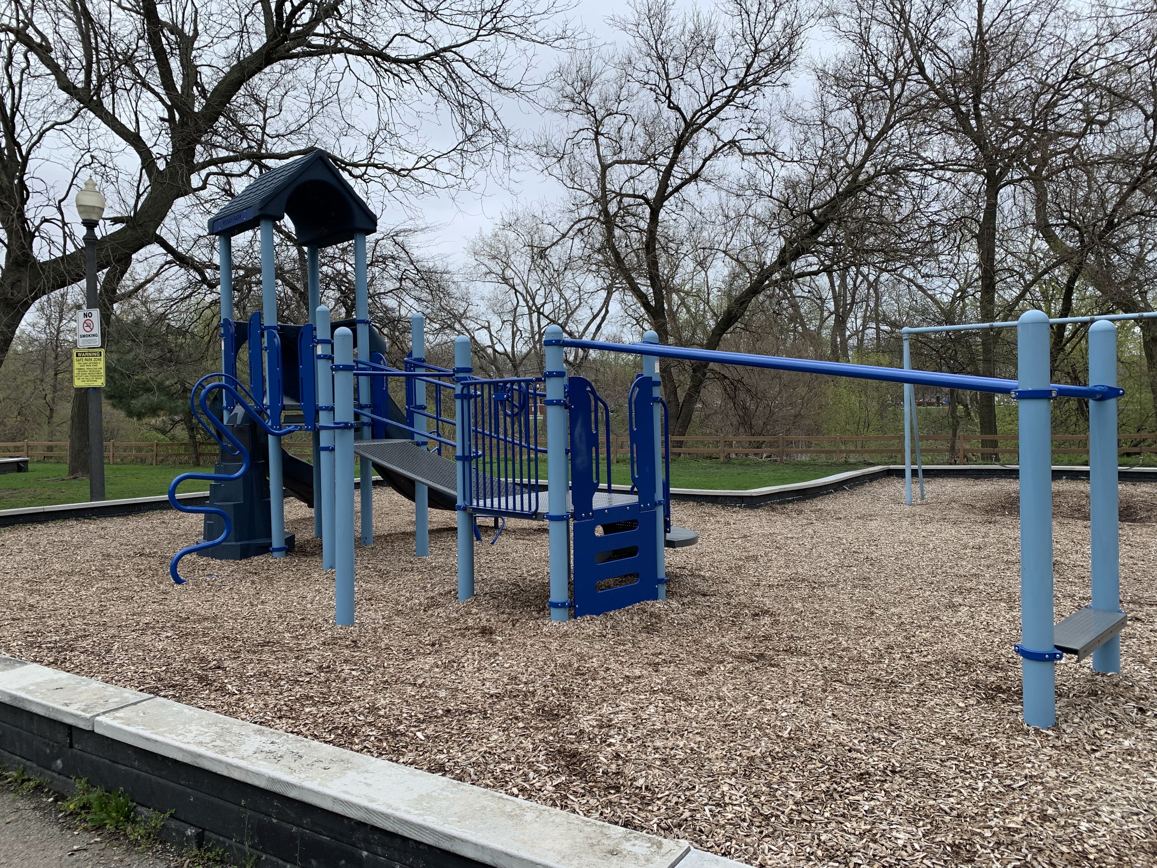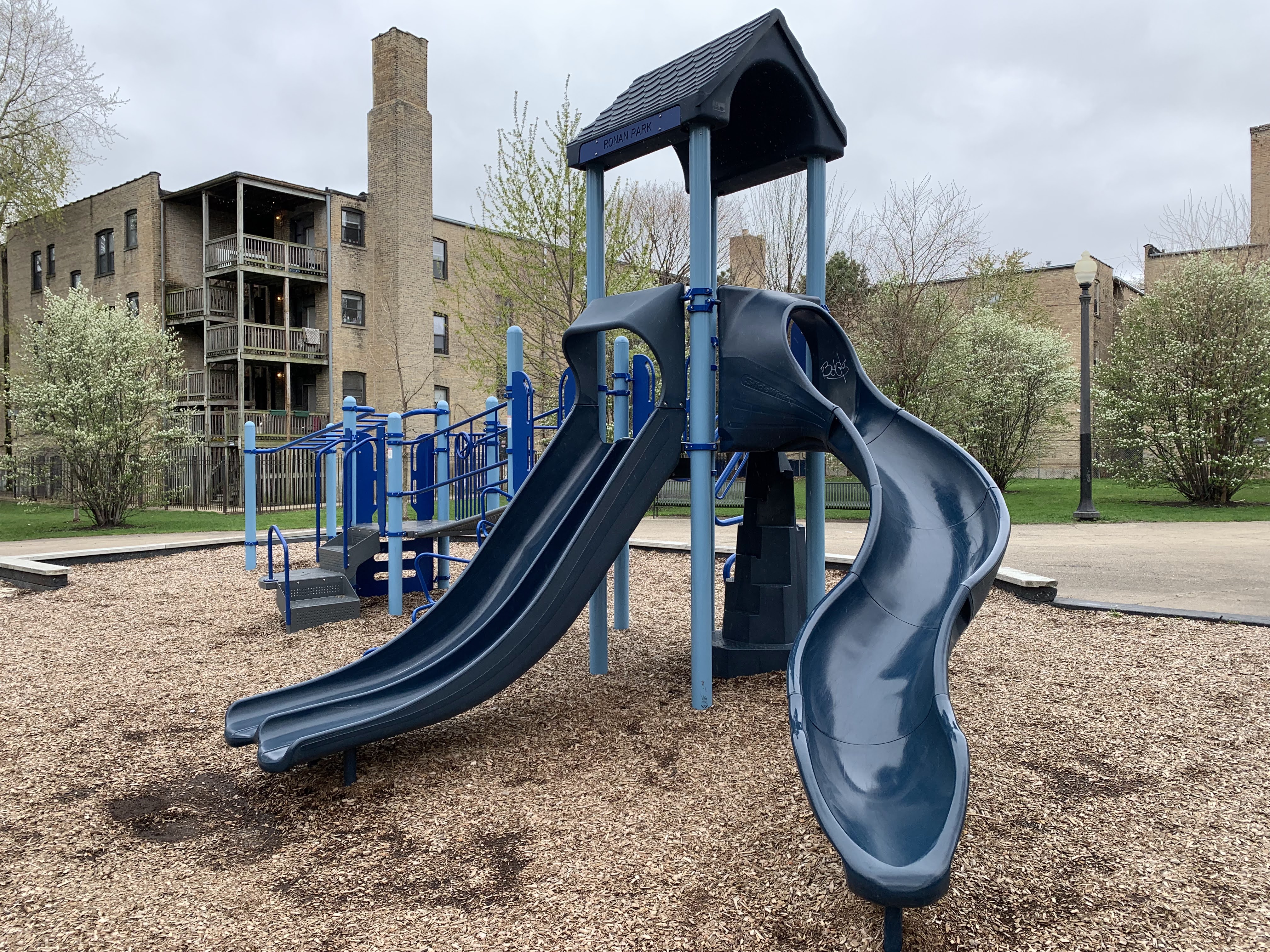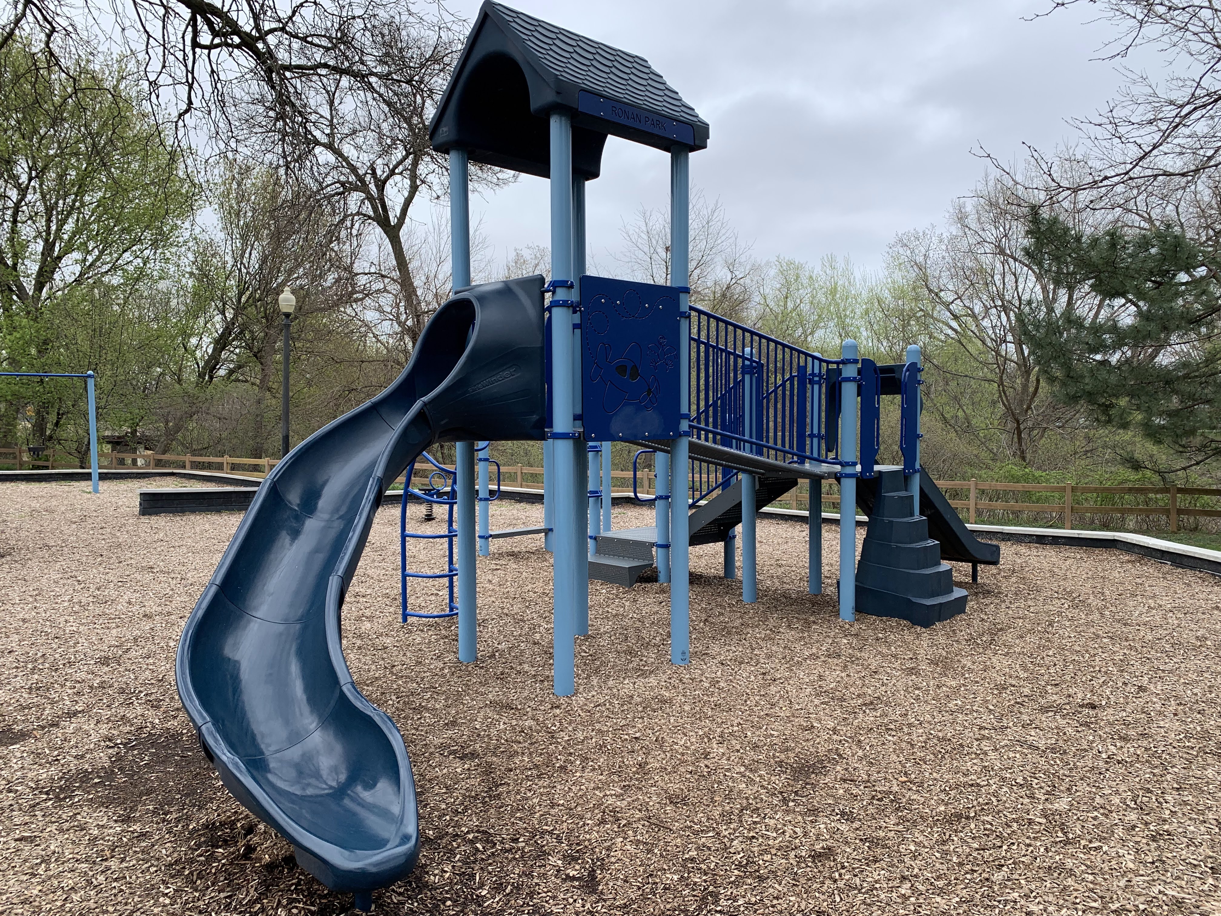 - The playground at Ronan Park is located just south of Argyle St. on the west bank of the North Branch of the Chicago River and features dedicated areas for younger and older children. The area for younger children features toddler swings, a small play structure, and a teeter-tooter and 'seat on a spring.' The area for older children features belt seat and molded plastic seat swings as well as a larger structure with angled monkey bars and steeper slides. Neither play area is enclosed at all but both are set away from nearby streets. Both are also covered in wood chips and there are benches nearby both areas. The nearby park also offers a nature trail near the river and picnic tables and sculptures further south toward Lawrence.