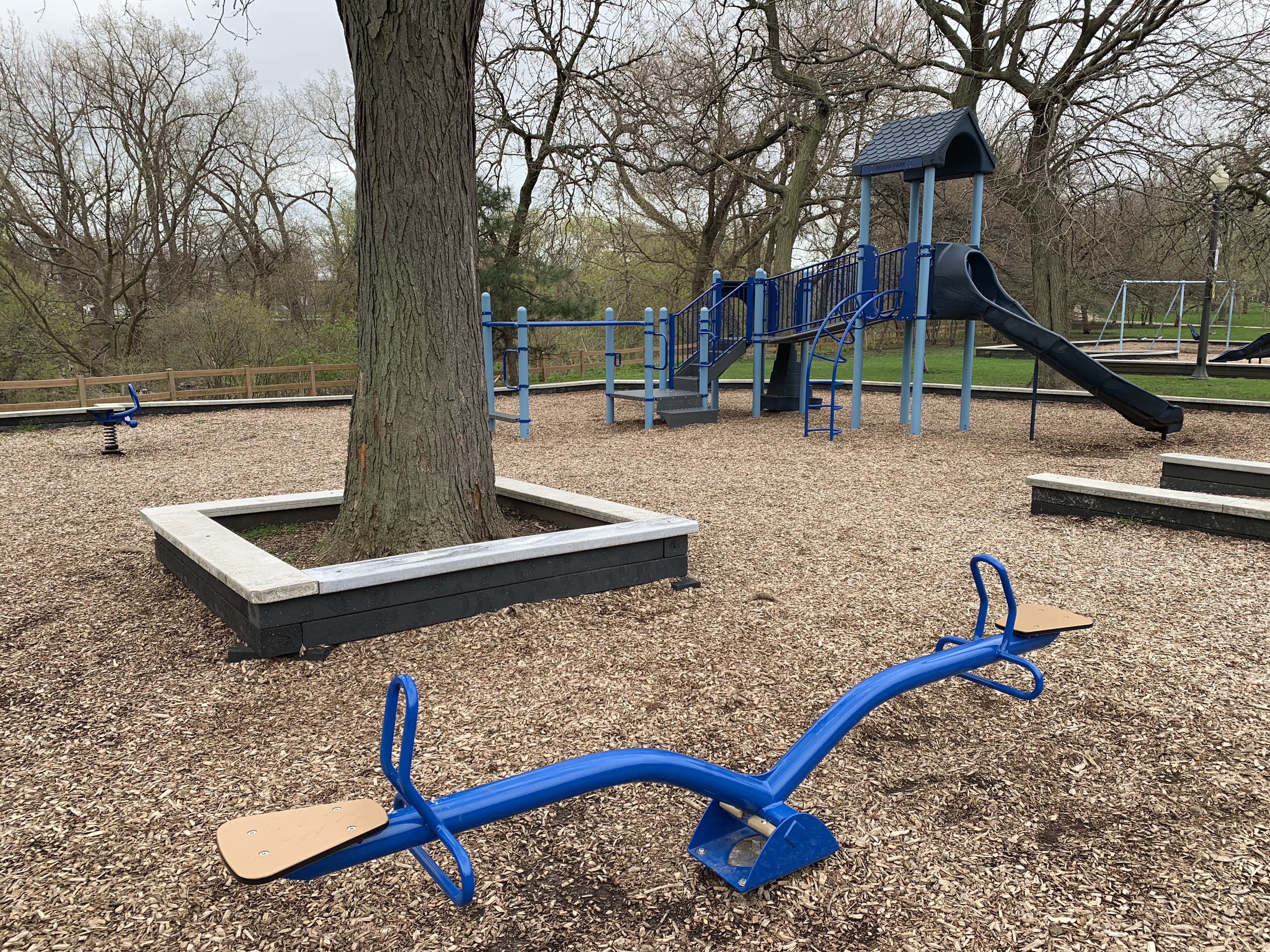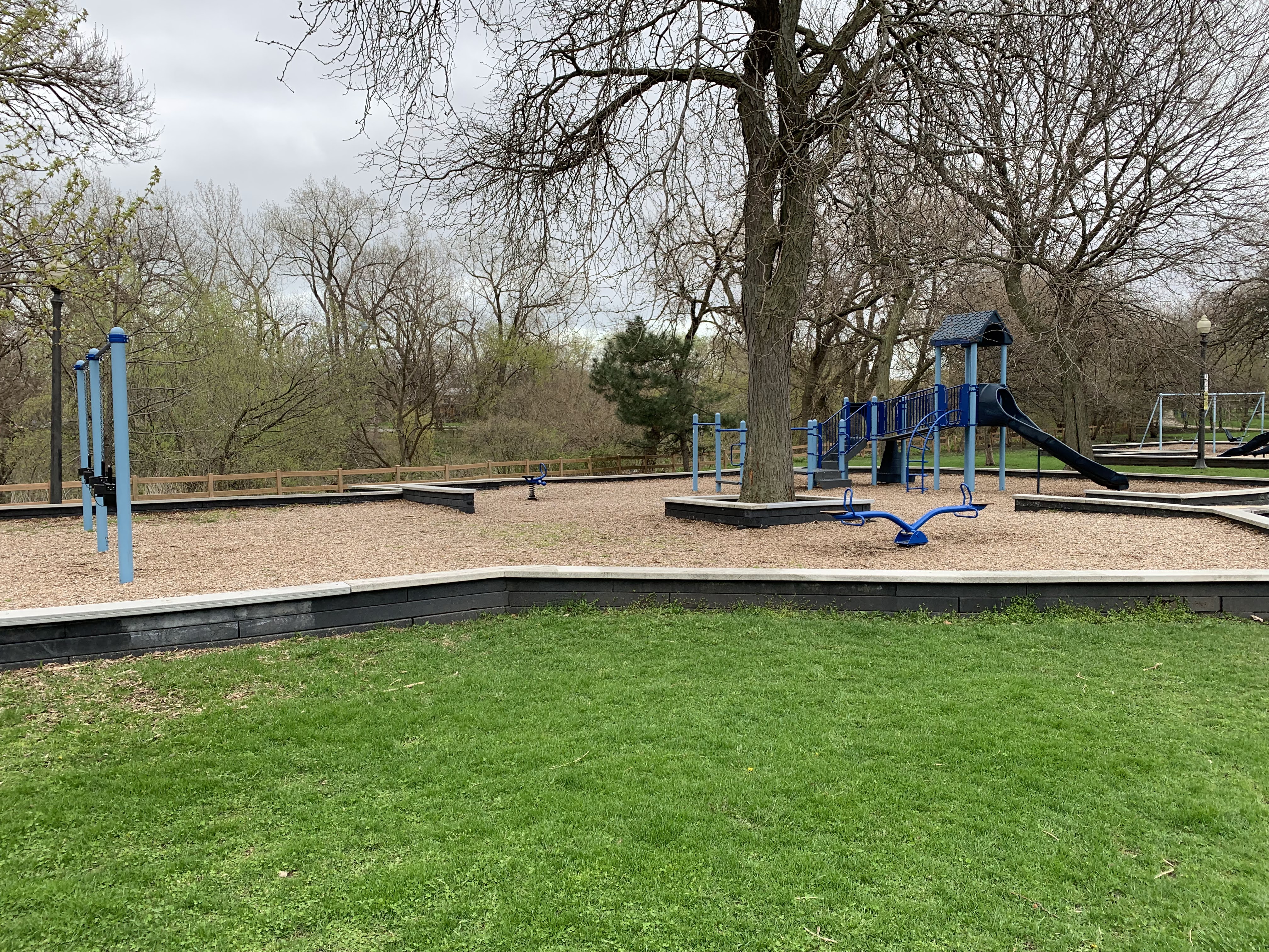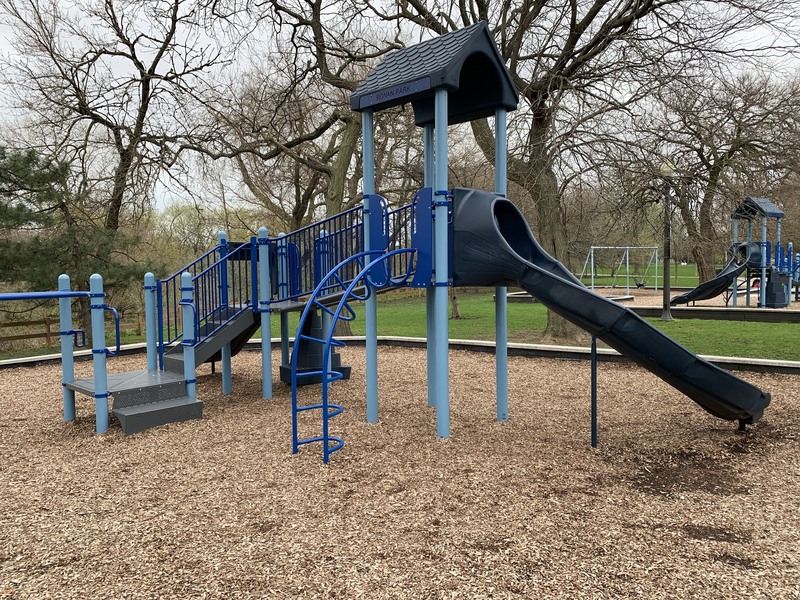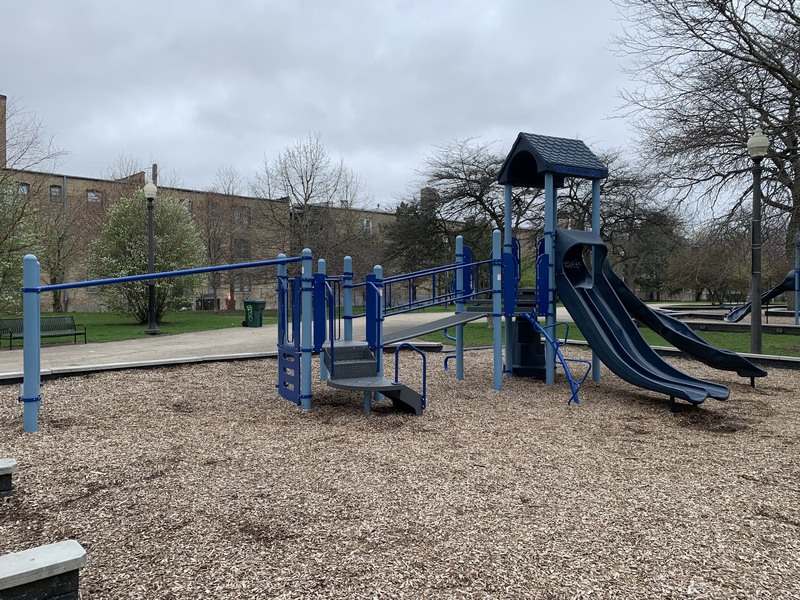 - The playground at Ronan Park is located just south of Argyle St. on the west bank of the North Branch of the Chicago River and features dedicated areas for younger and older children. The area for younger children features toddler swings, a small play structure, and a teeter-tooter and 'seat on a spring.' The area for older children features belt seat and molded plastic seat swings as well as a larger structure with angled monkey bars and steeper slides. Neither play area is enclosed at all but both are set away from nearby streets. Both are also covered in wood chips and there are benches nearby both areas. The nearby park also offers a nature trail near the river and picnic tables and sculptures further south toward Lawrence.
