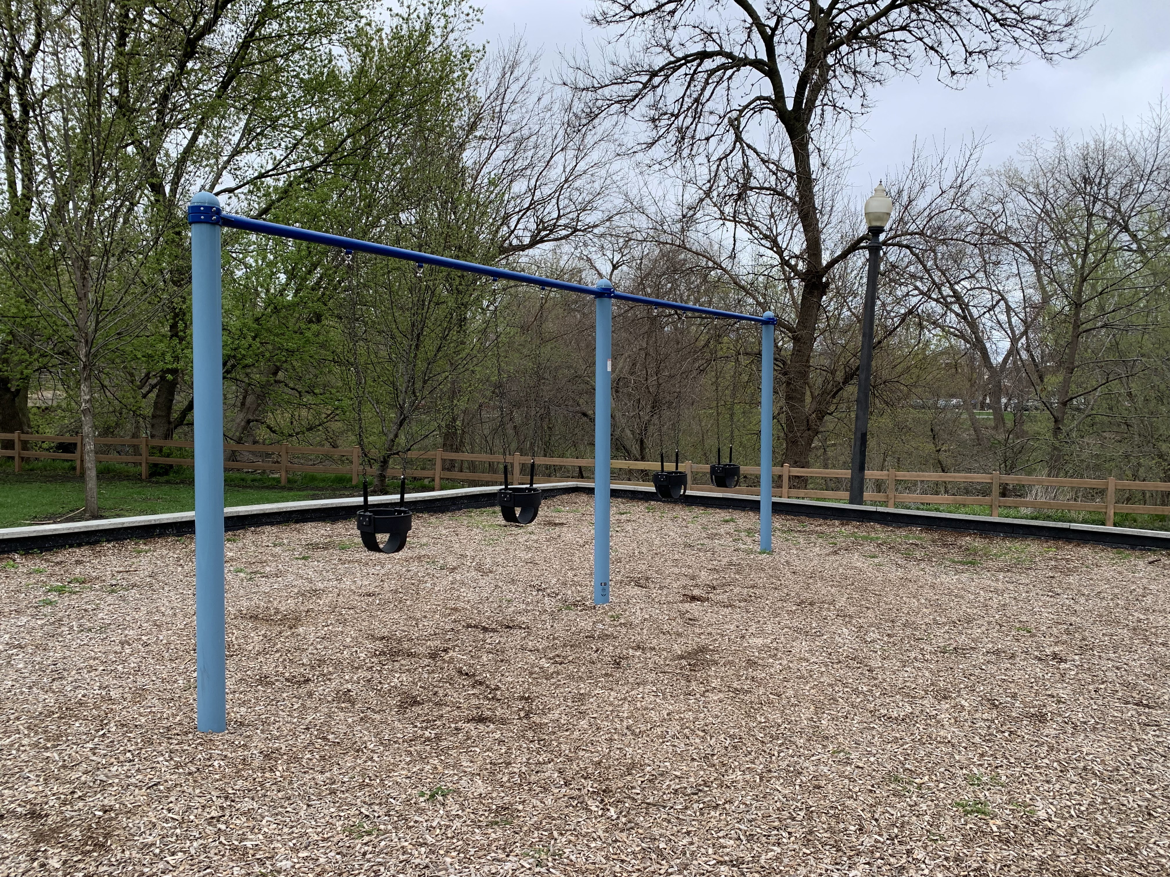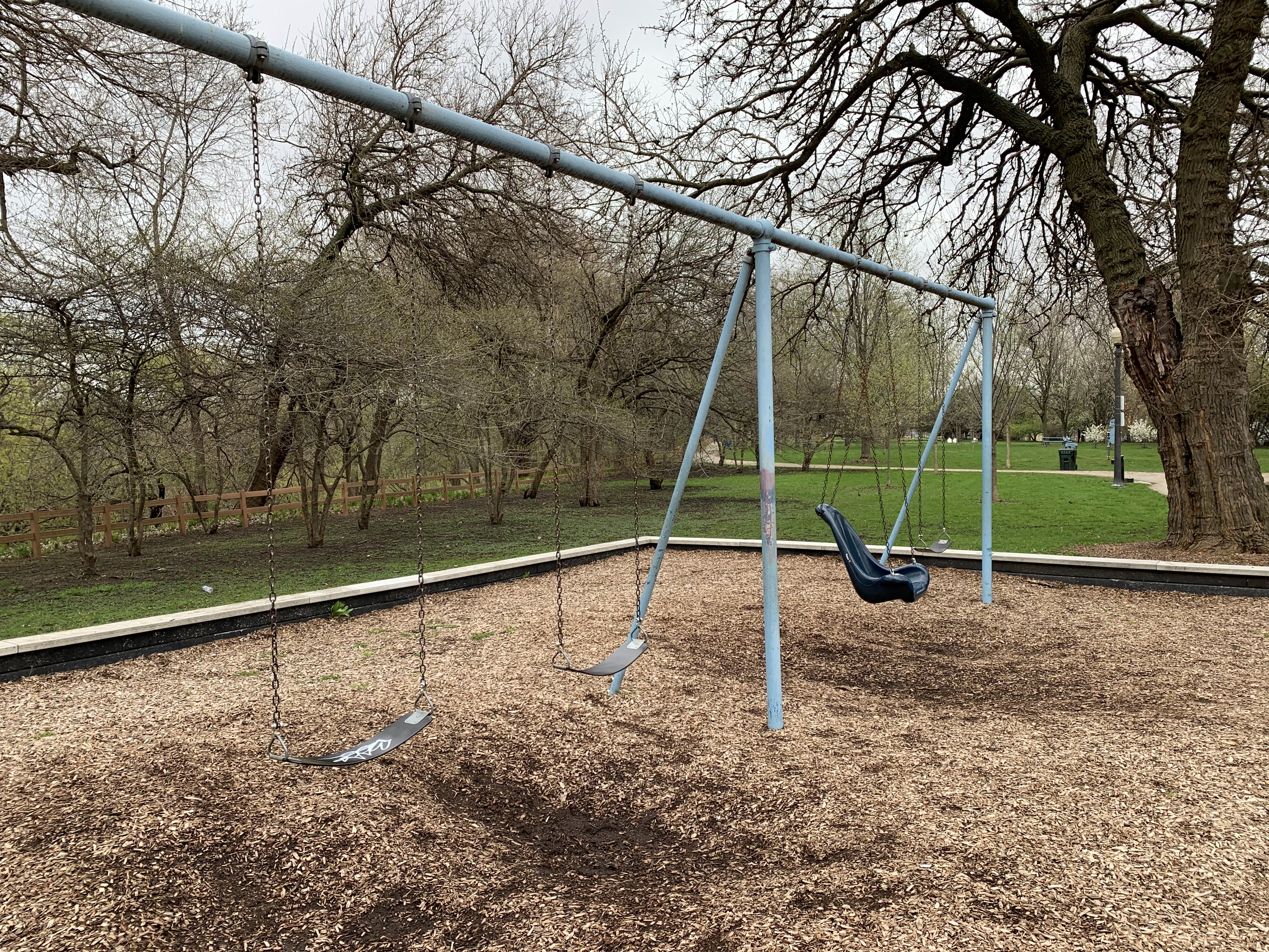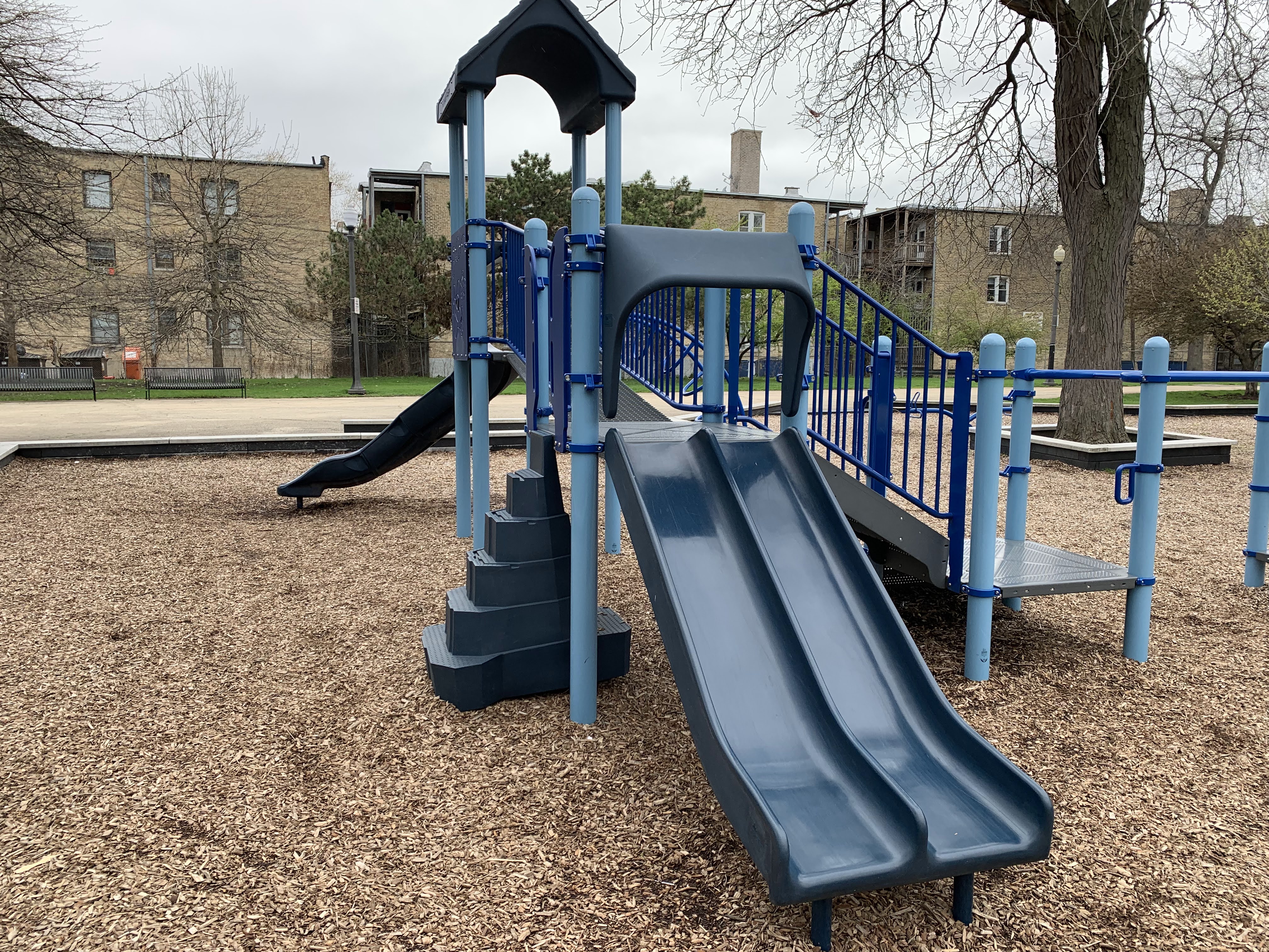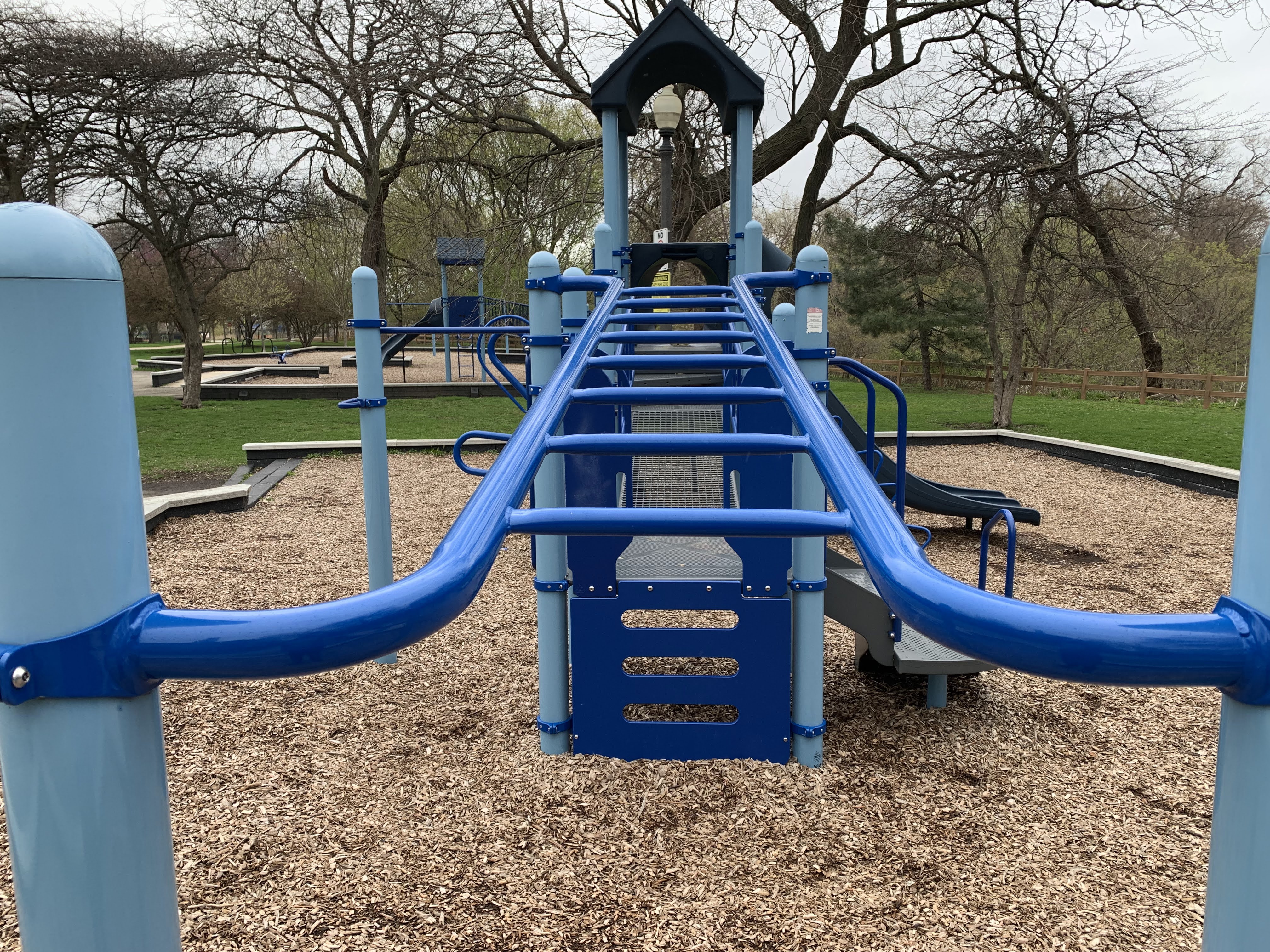- The playground at Ronan Park is located just south of Argyle St. on the west bank of the North Branch of the Chicago River and features dedicated areas for younger and older children. The area for younger children features toddler swings, a small play structure, and a teeter-tooter and 'seat on a spring.' The area for older children features belt seat and molded plastic seat swings as well as a larger structure with angled monkey bars and steeper slides. Neither play area is enclosed at all but both are set away from nearby streets. Both are also covered in wood chips and there are benches nearby both areas. The nearby park also offers a nature trail near the river and picnic tables and sculptures further south toward Lawrence.