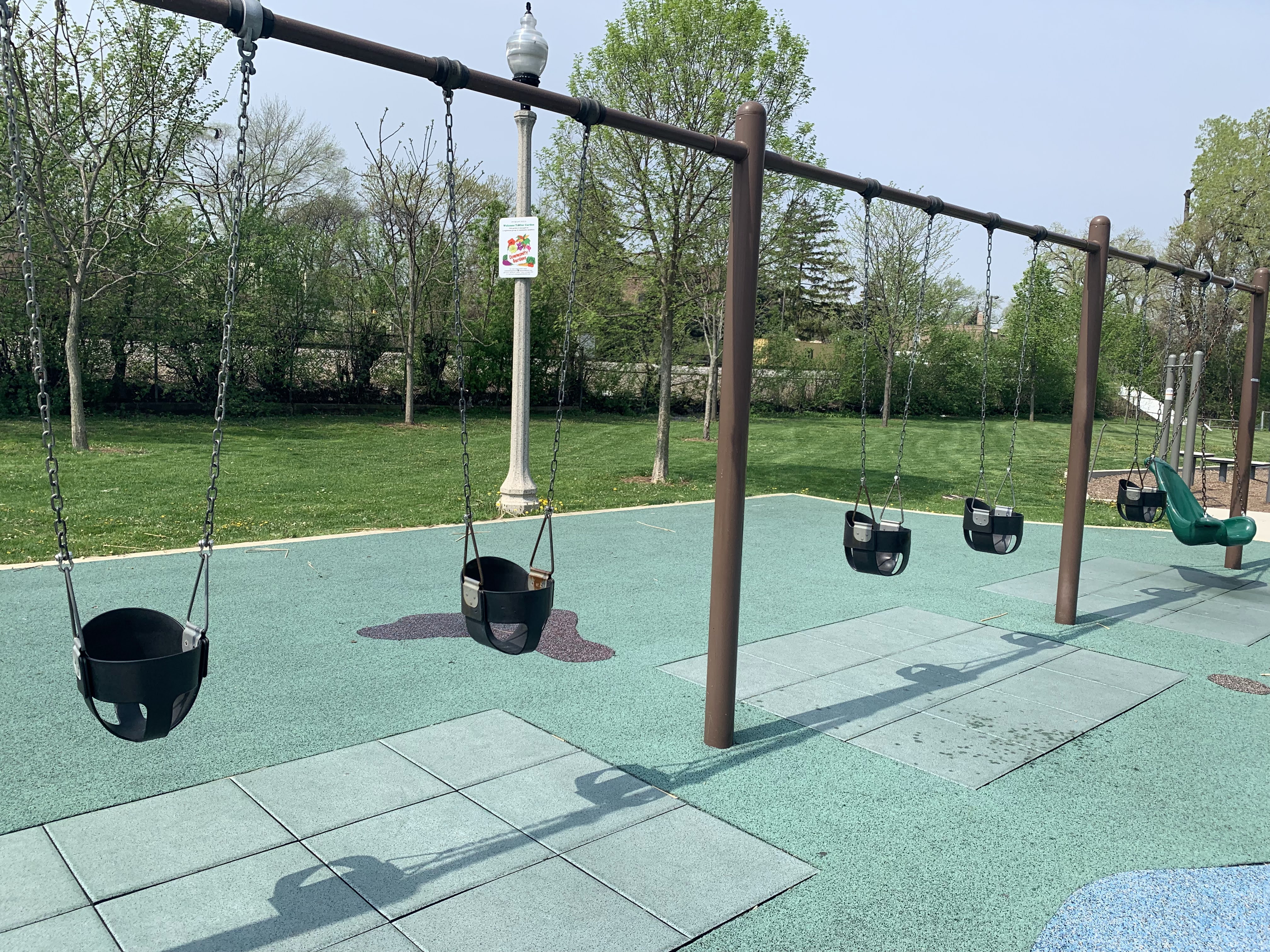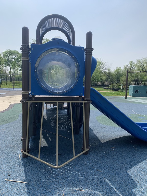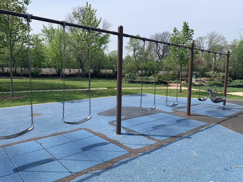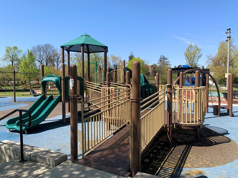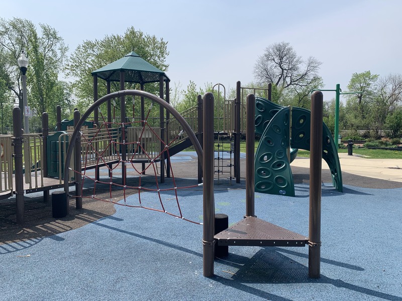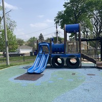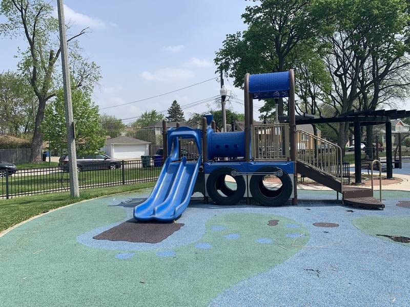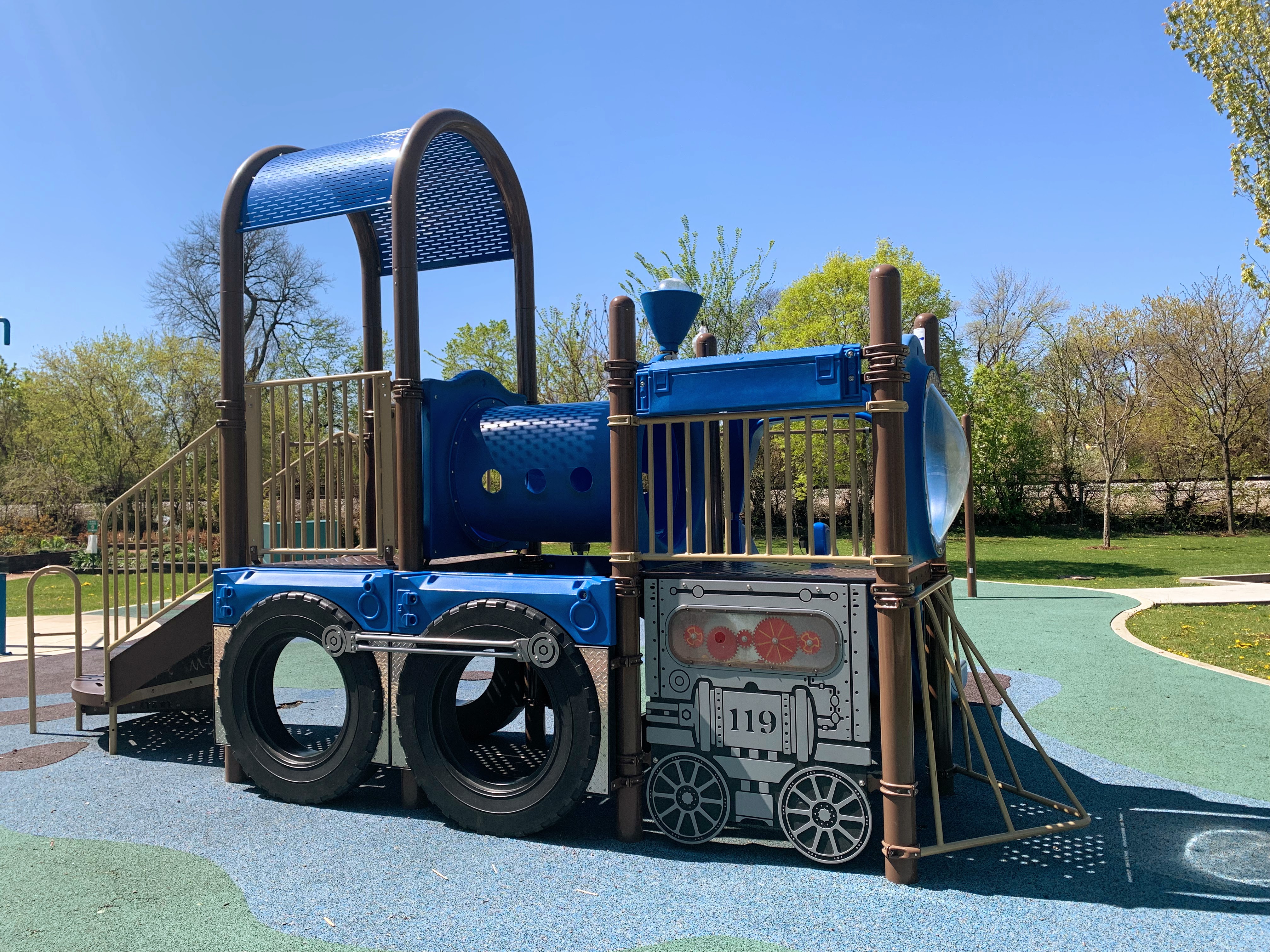 The site is bright and sunny - though there are shady spots under nearby trees and some shade from a pergola near the entrance. The play area is fully enclosed and the surface is soft rubber. There are benches and picnic tables for seating and might even be access to a bathroom when the nearby fieldhouse is open. And - as mentioned earlier - there are train views. This is a great park and playground; highly recommend. - Playground Features