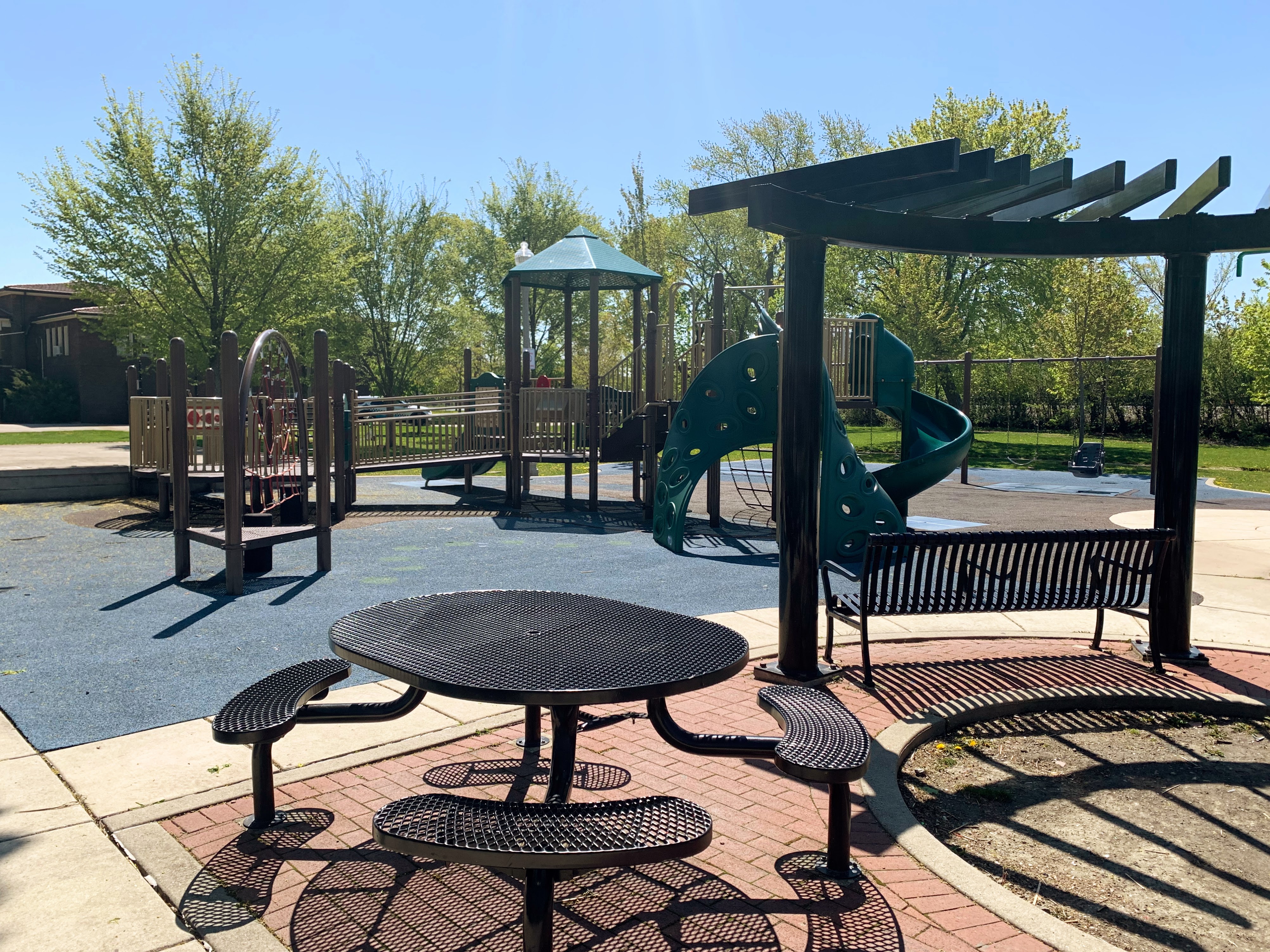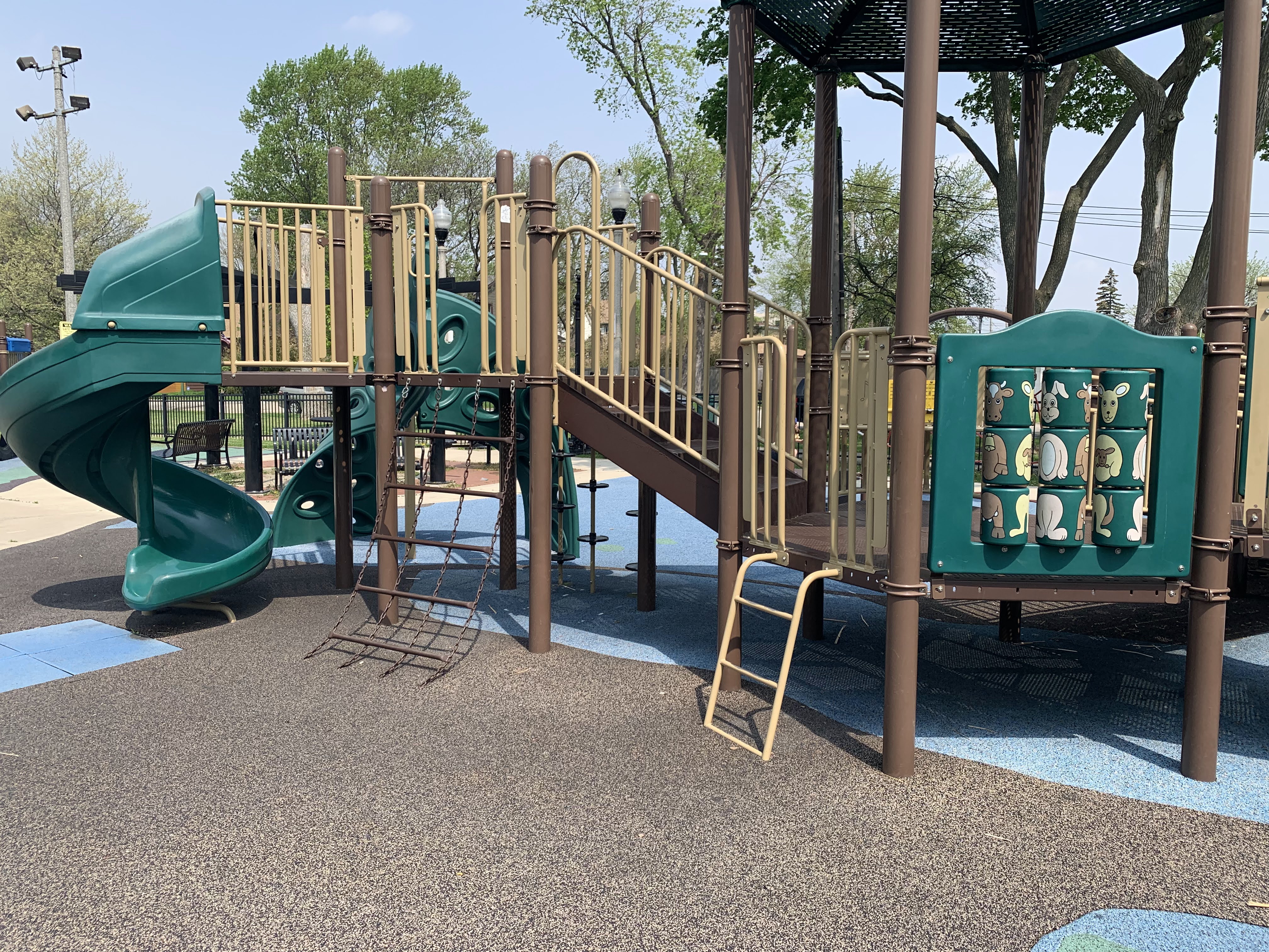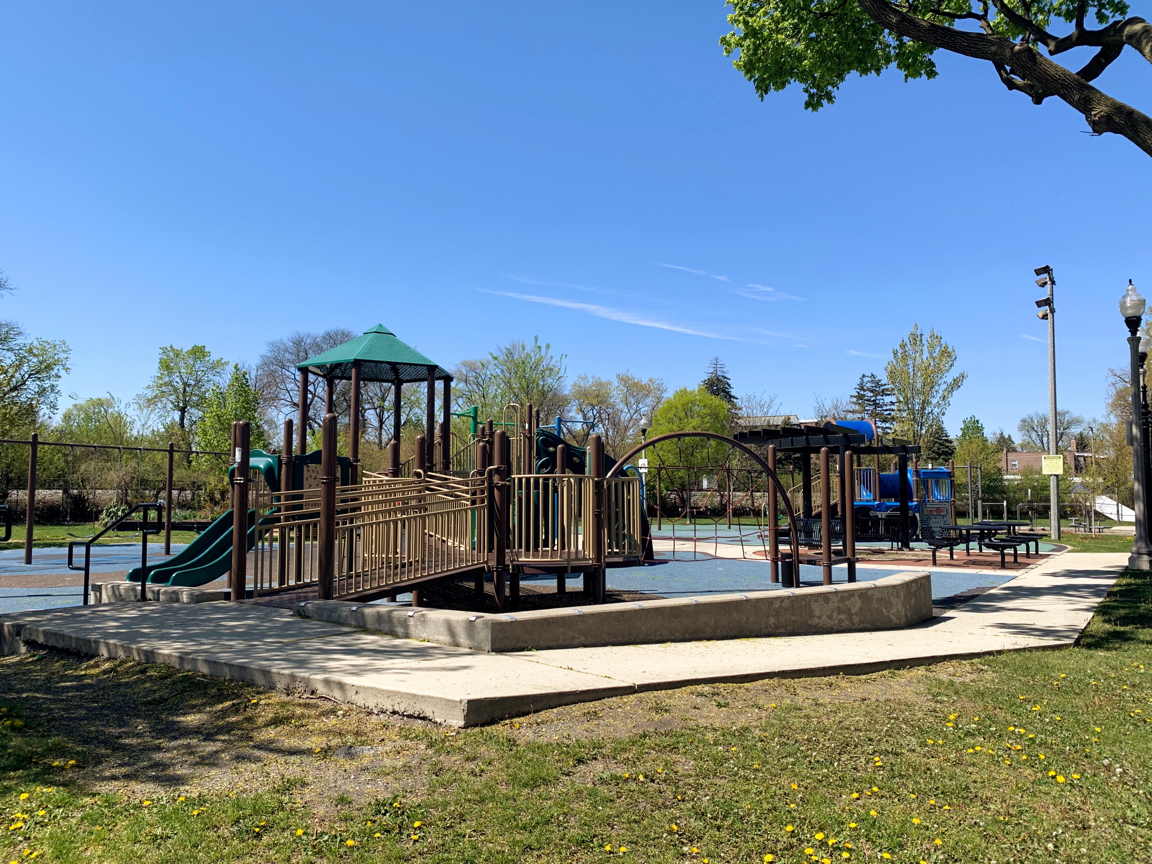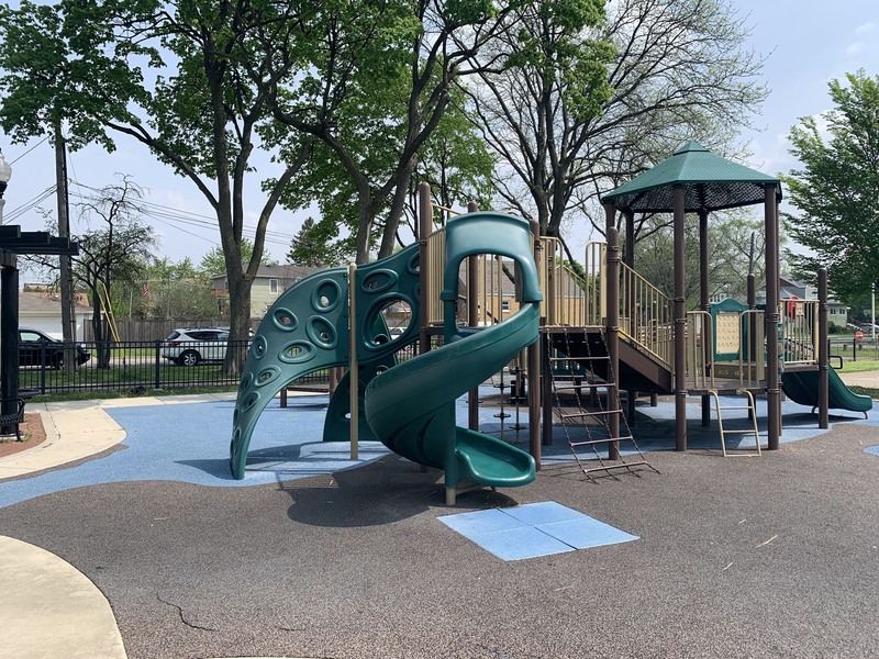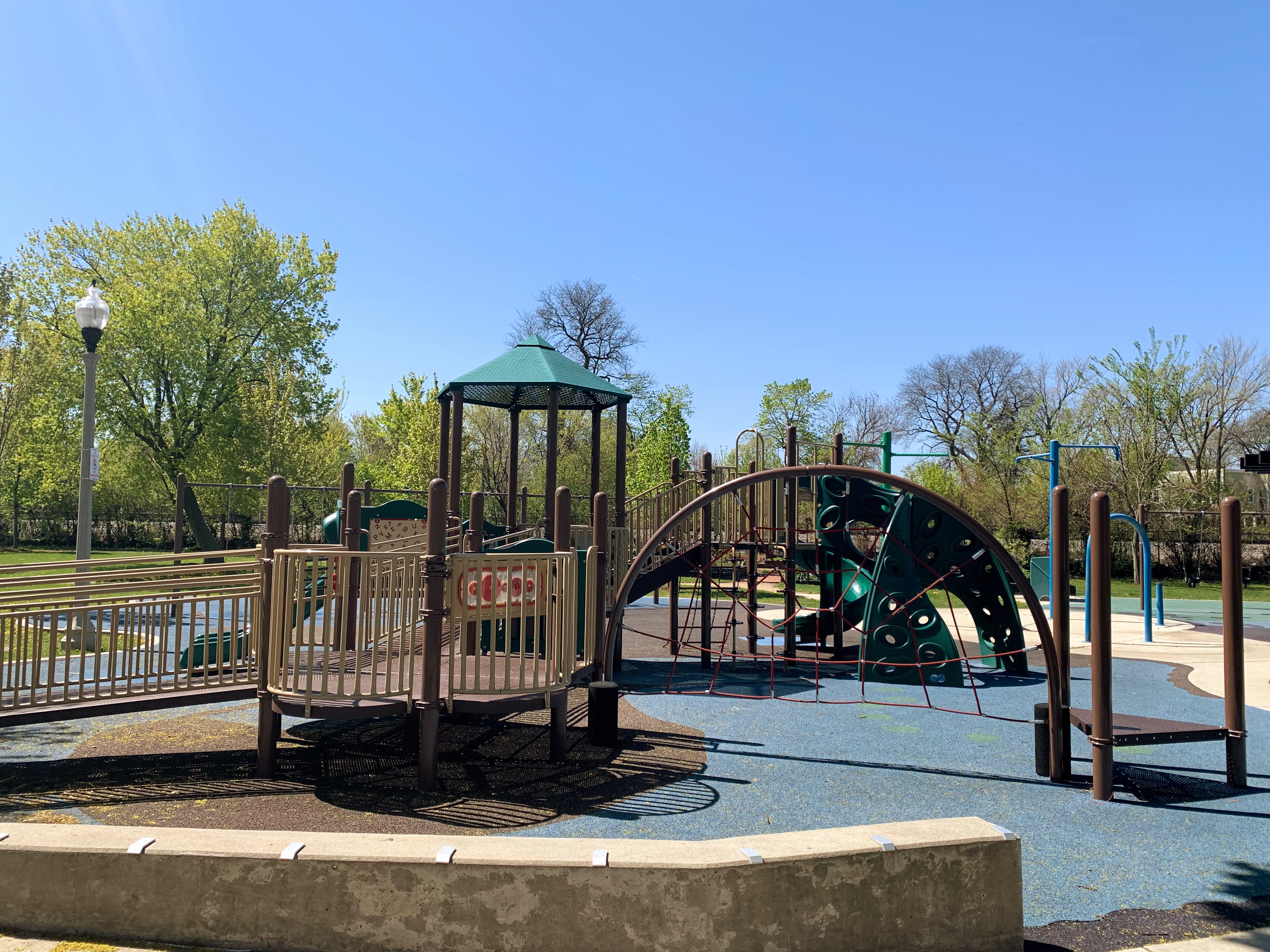 The site is bright and sunny - though there are shady spots under nearby trees and some shade from a pergola near the entrance. The play area is fully enclosed and the surface is soft rubber. There are benches and picnic tables for seating and might even be access to a bathroom when the nearby fieldhouse is open. And - as mentioned earlier - there are train views. This is a great park and playground; highly recommend. - Playground Features