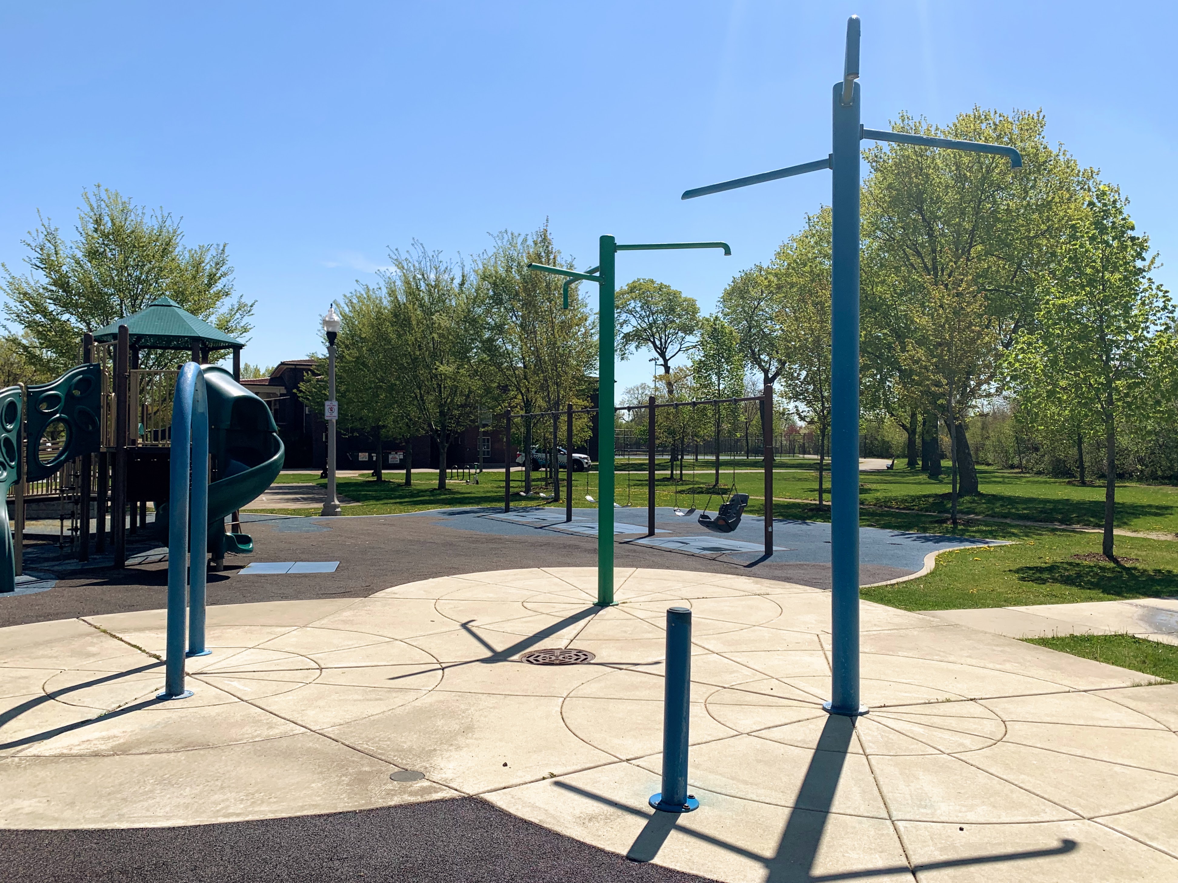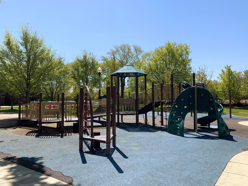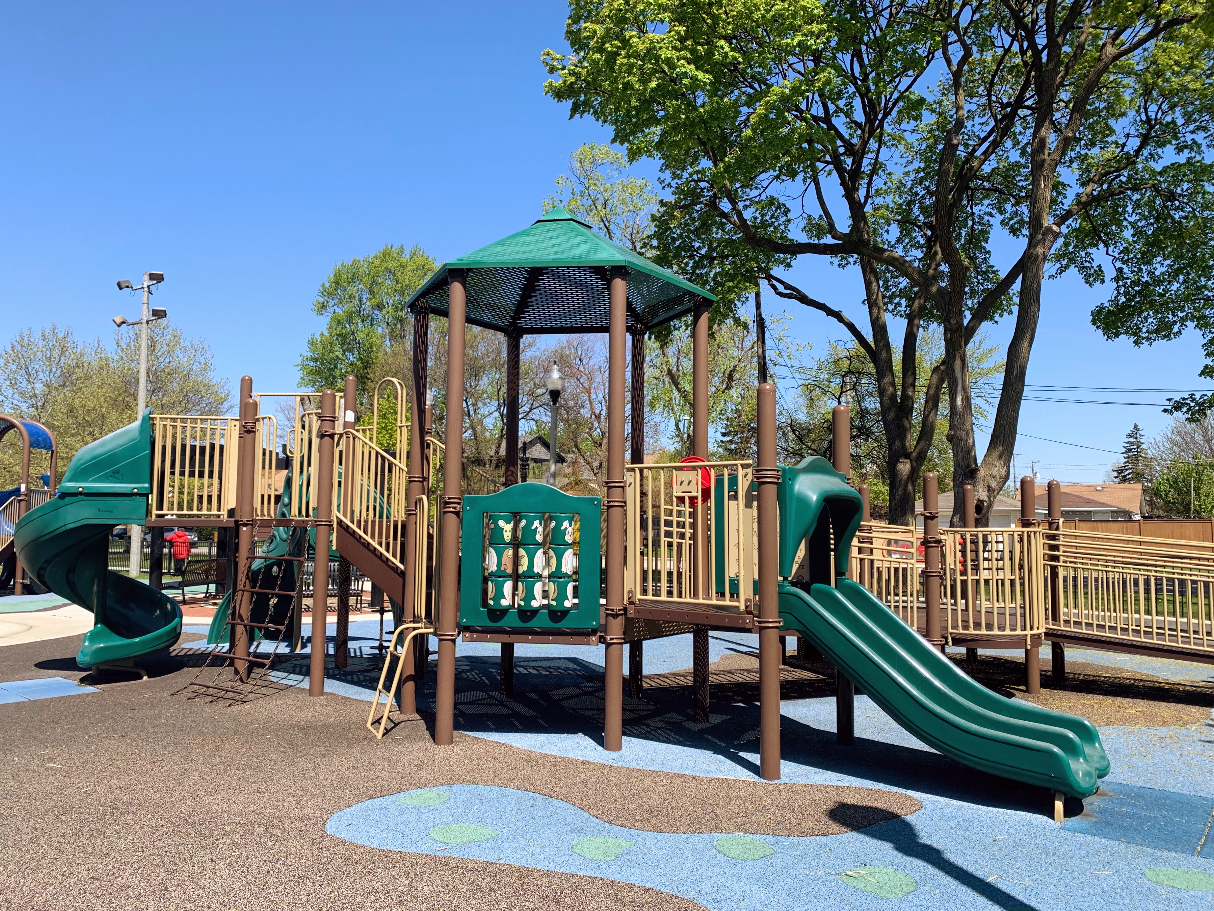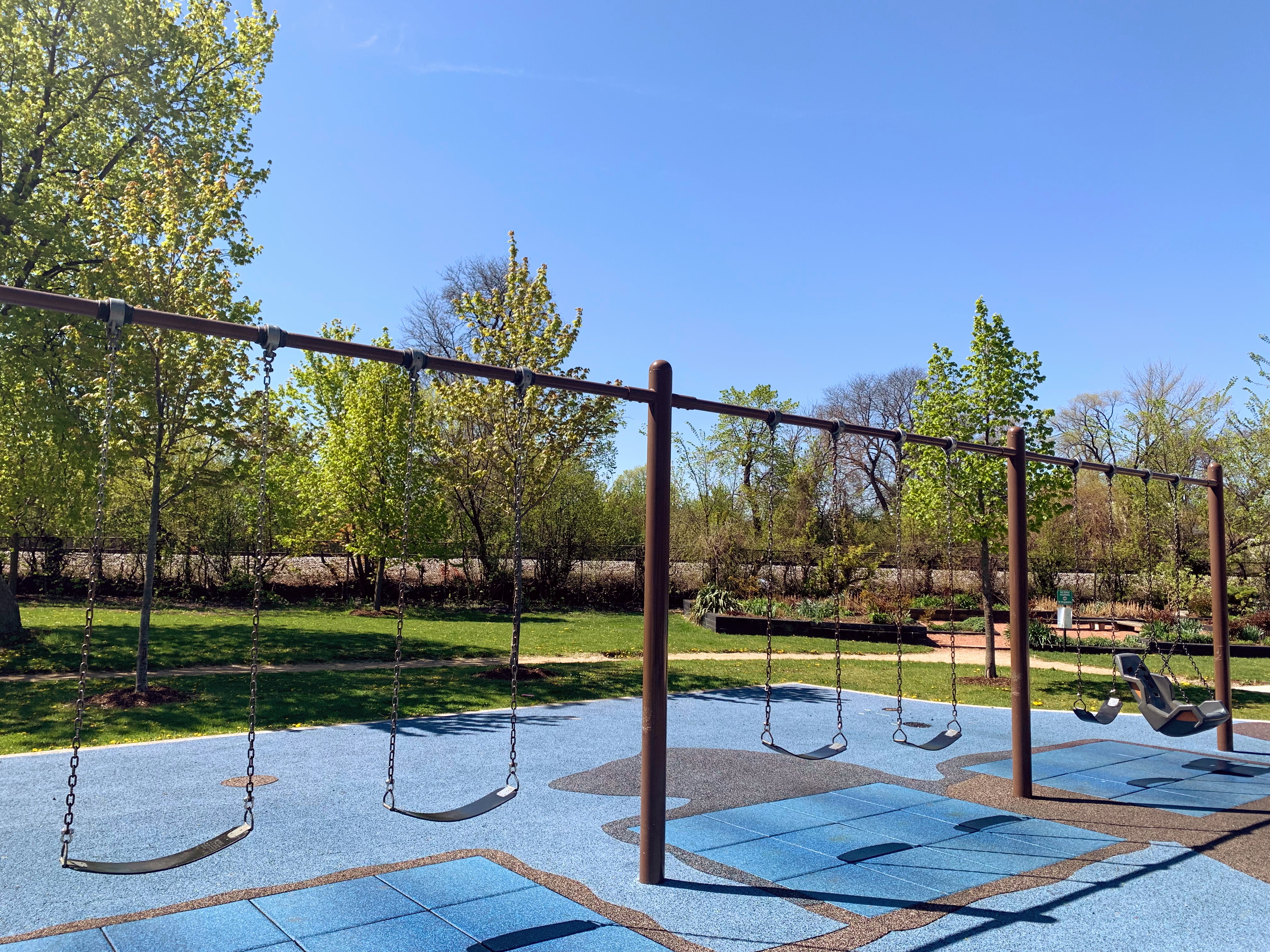 The site is bright and sunny - though there are shady spots under nearby trees and some shade from a pergola near the entrance. The play area is fully enclosed and the surface is soft rubber. There are benches and picnic tables for seating and might even be access to a bathroom when the nearby fieldhouse is open. And - as mentioned earlier - there are train views. This is a great park and playground; highly recommend. - Playground Features