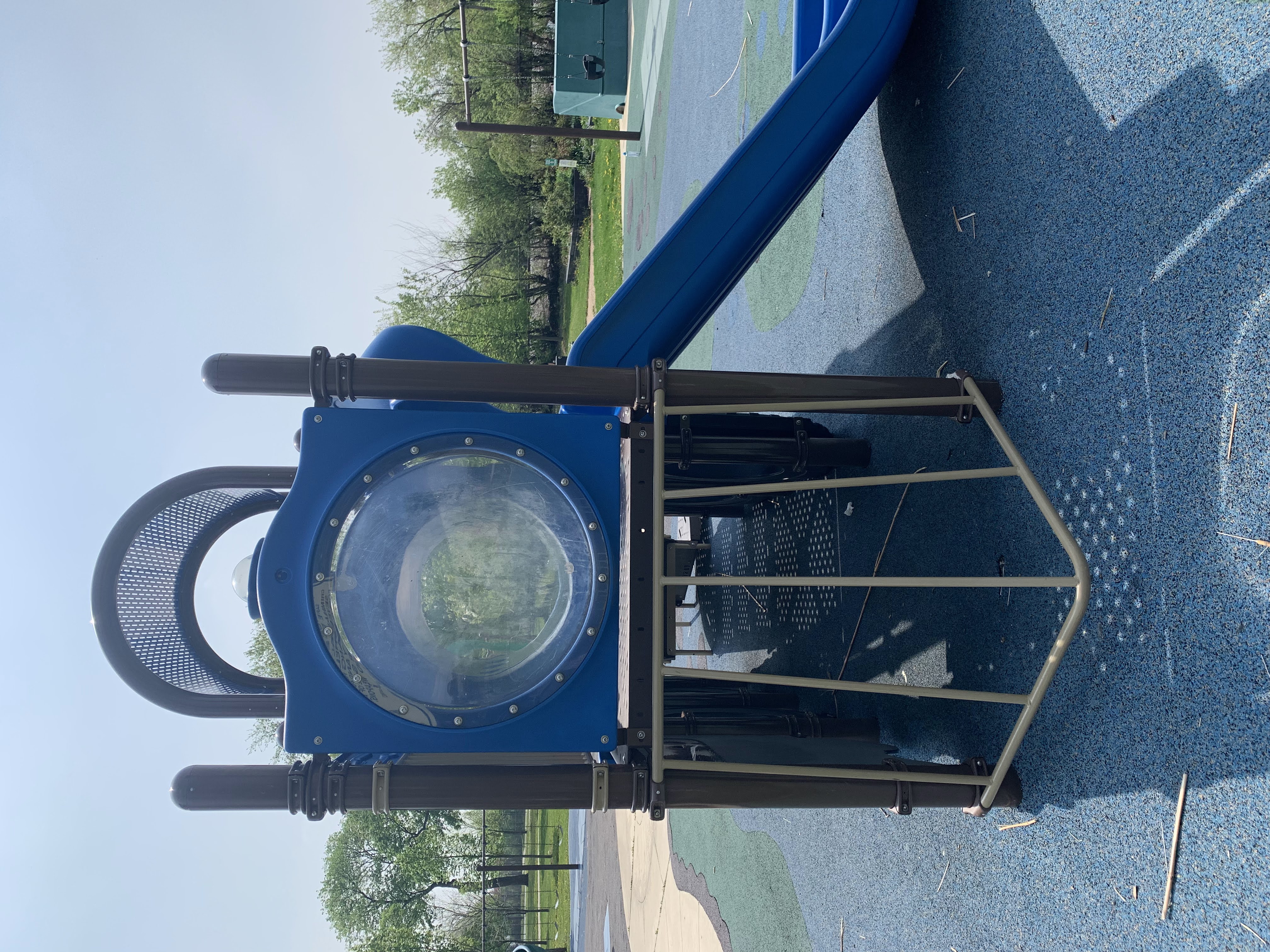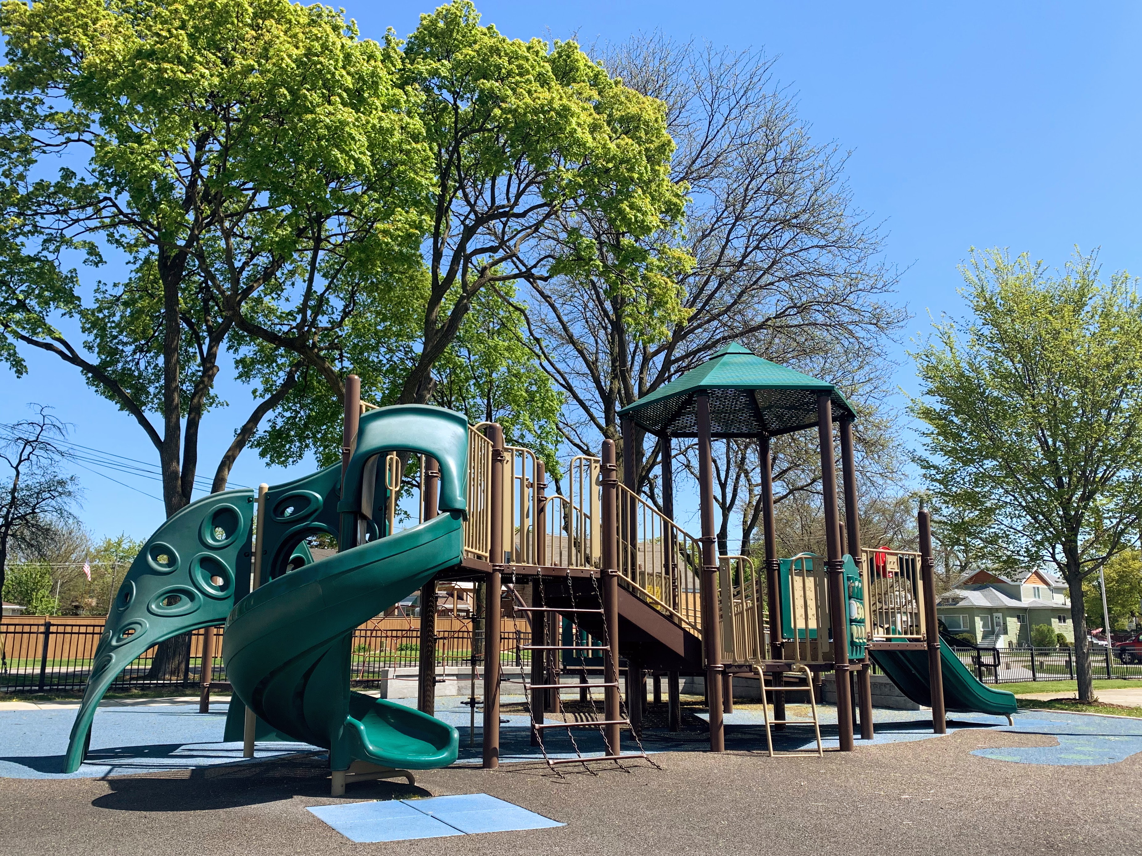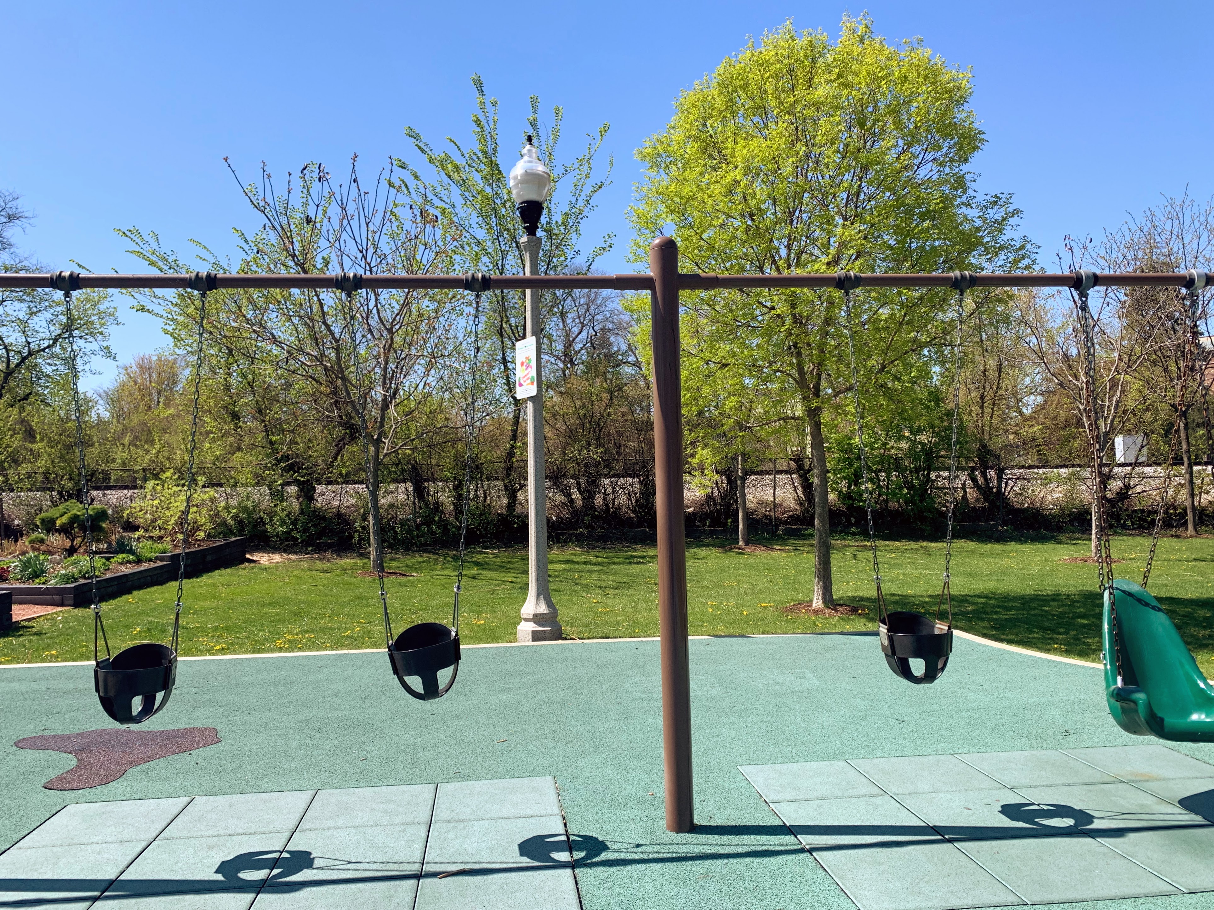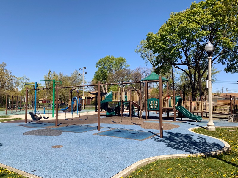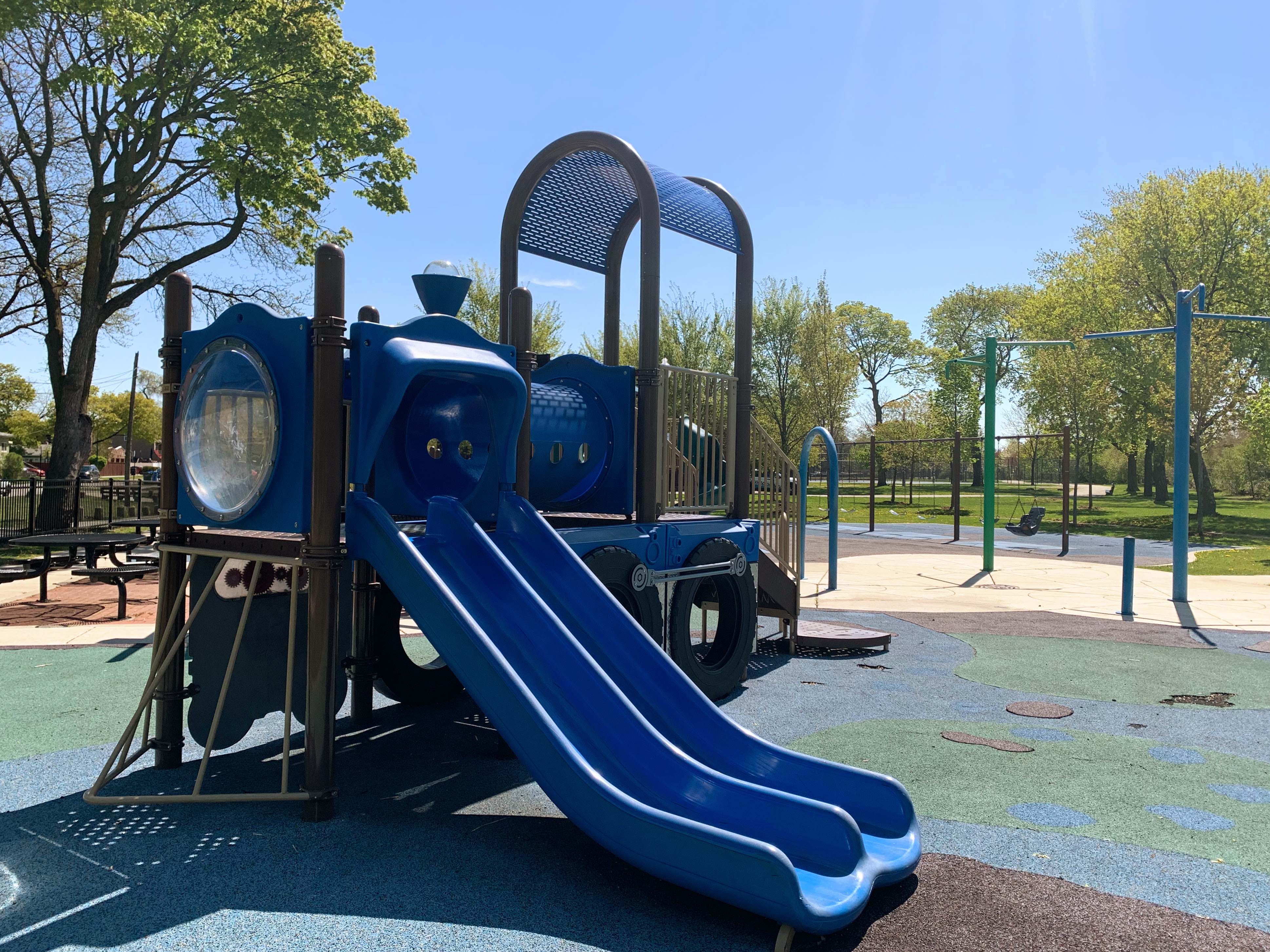 The site is bright and sunny - though there are shady spots under nearby trees and some shade from a pergola near the entrance. The play area is fully enclosed and the surface is soft rubber. There are benches and picnic tables for seating and might even be access to a bathroom when the nearby fieldhouse is open. And - as mentioned earlier - there are train views. This is a great park and playground; highly recommend. - Playground Features