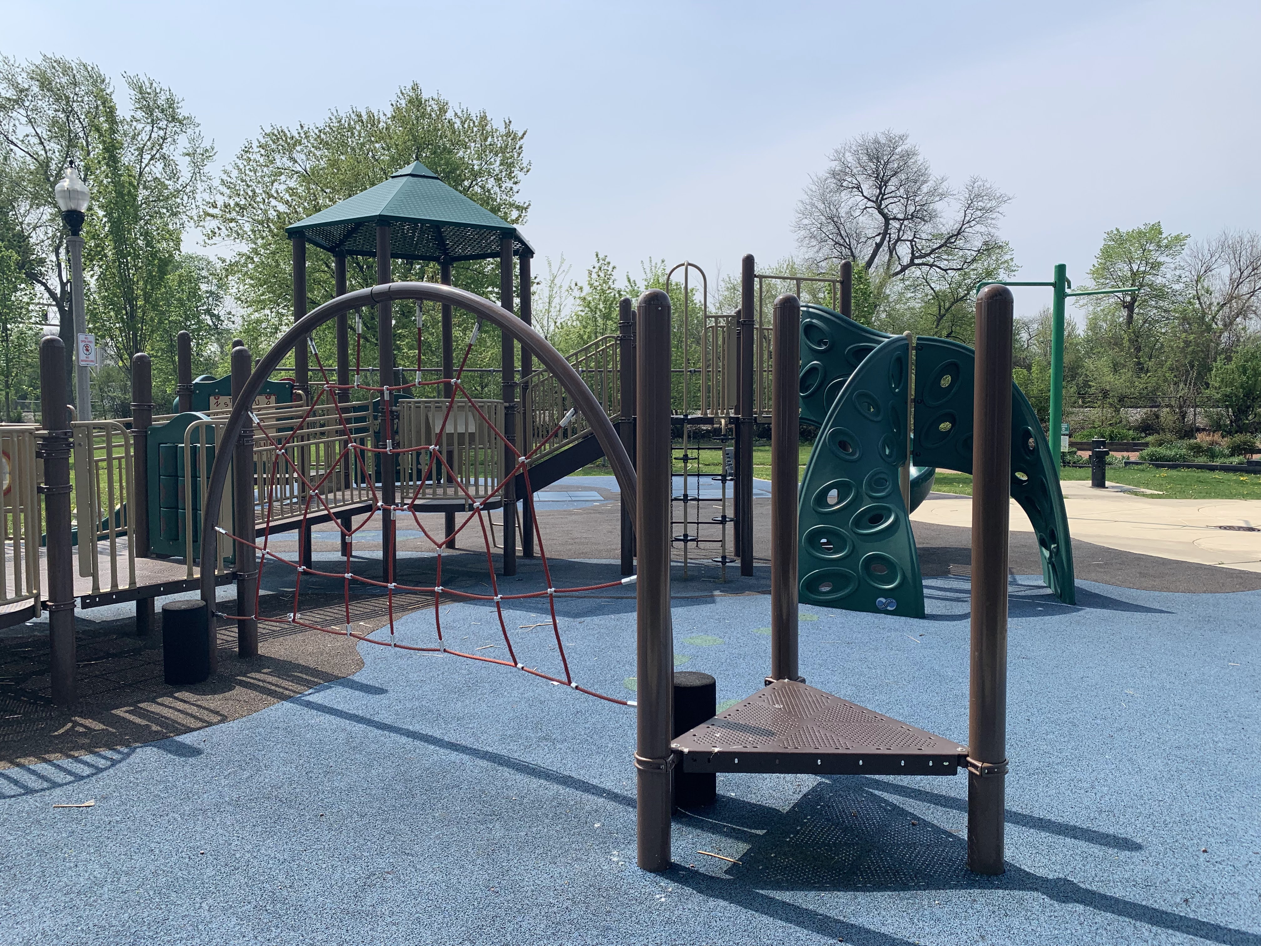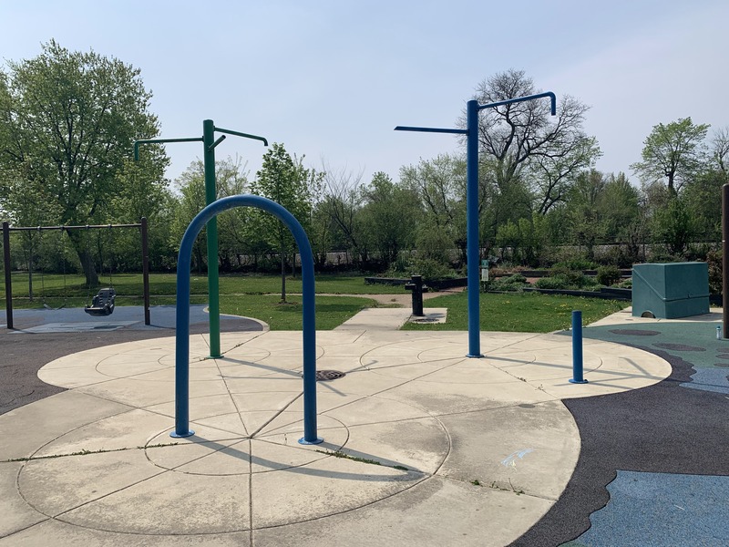 Playground. Water spray feature. Train views. If your child loves one, two, or all of these things - the playground at Rutherford Sayre Park is for you. The playground is solid. The area for smaller children features a strong train theme that reflects it's location next to a train line. The larger structure isn't train-themed but is a solid structure that is accessible via a ramp. The water spray features are above average and include two "triple sprayers" and one "water arch."