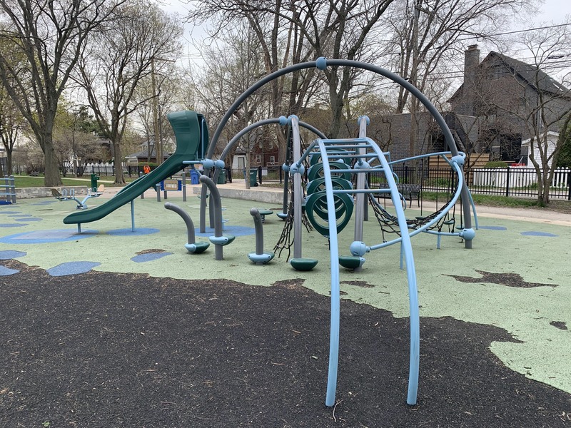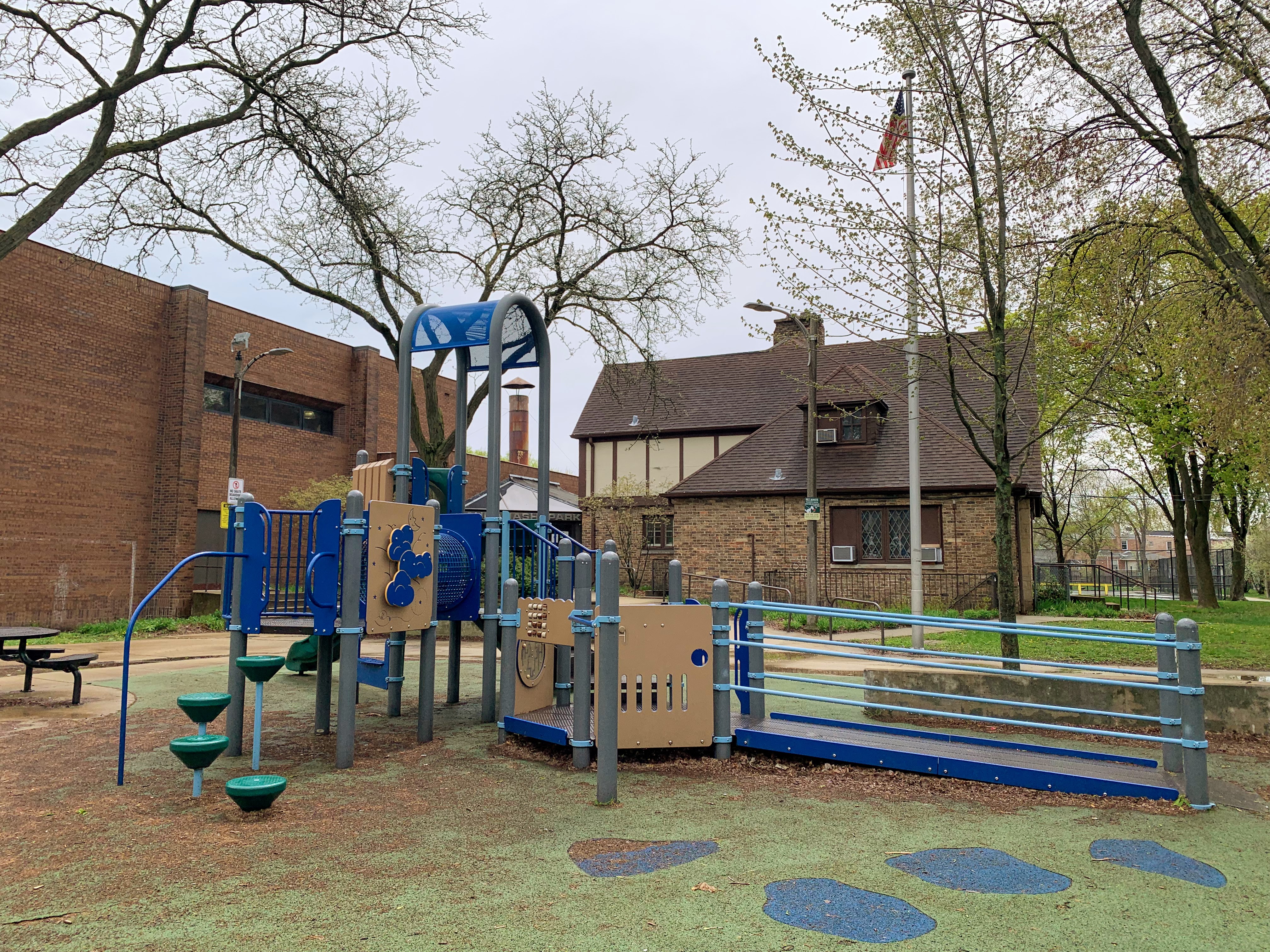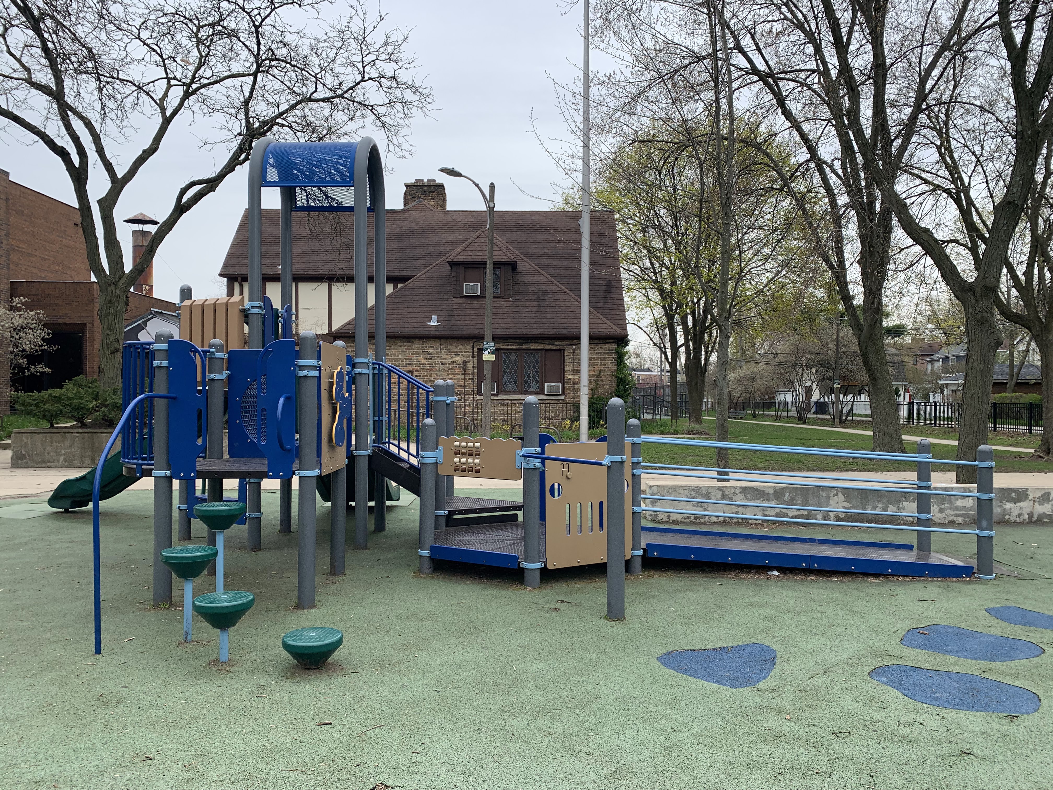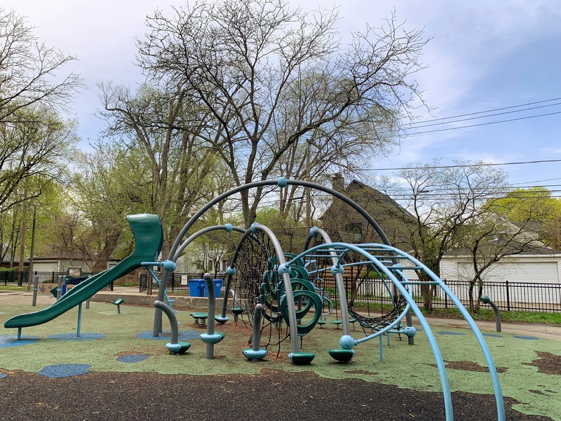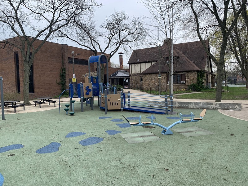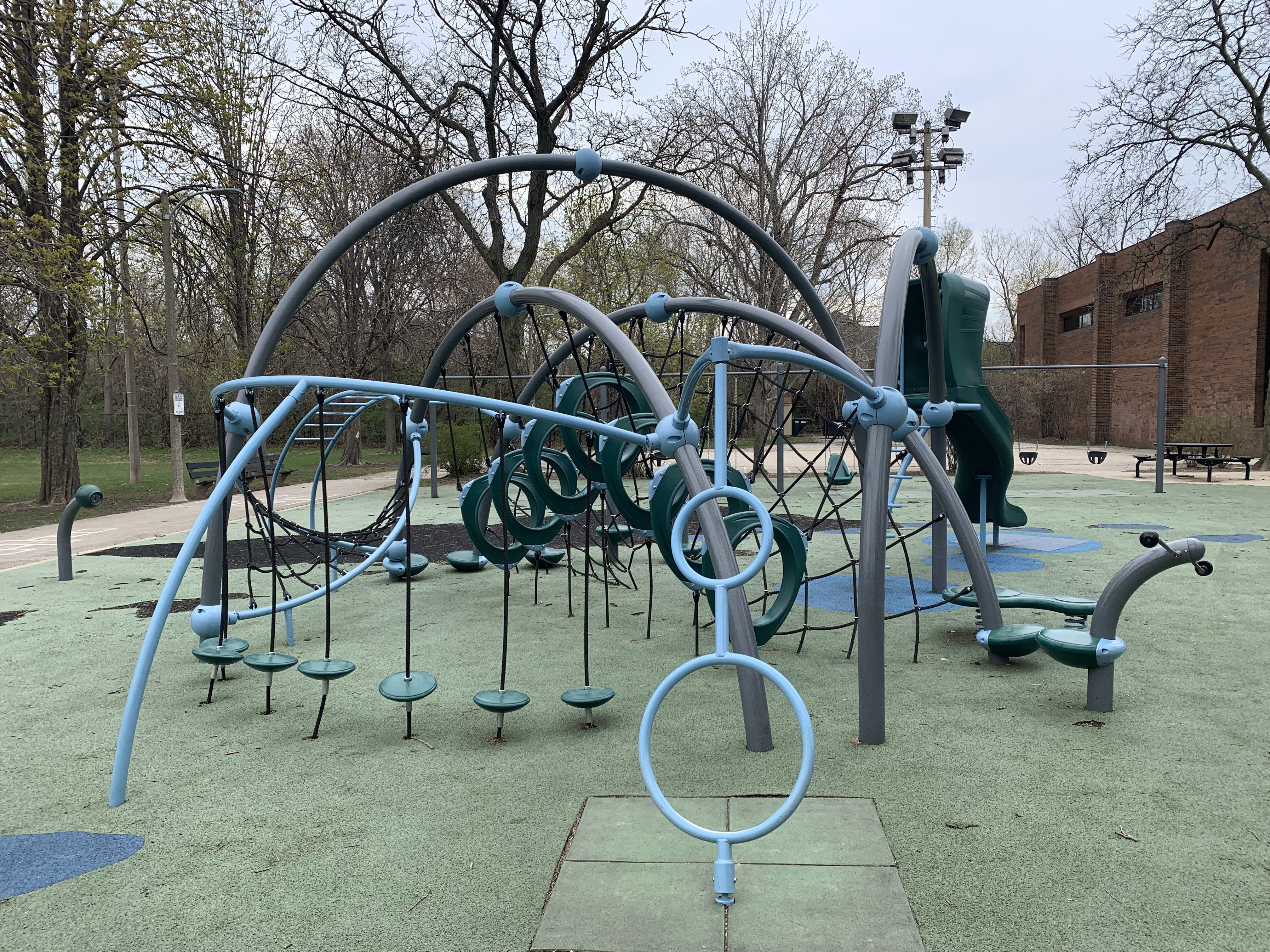 - Set between the a quiet residential alley and a paved trail (called the Sauganash Line Trail, the Valley Line Trail, or the Skokie Valley Trail at various points) Sauganash Park features a solid playground. There is a smaller play structure for younger children and another area featuring a large semi-circular climbing net and suspended ring climbing structure. There is the standard set of swings and a little 'music area' with some musical panels. The play area is not fully enclosed but it is fenced from the alley. There are plenty of benches and picnic tables near the play area and large trees provide shade throughout the day. And the nearby field house provides access to bathrooms in this otherwise quiet location.