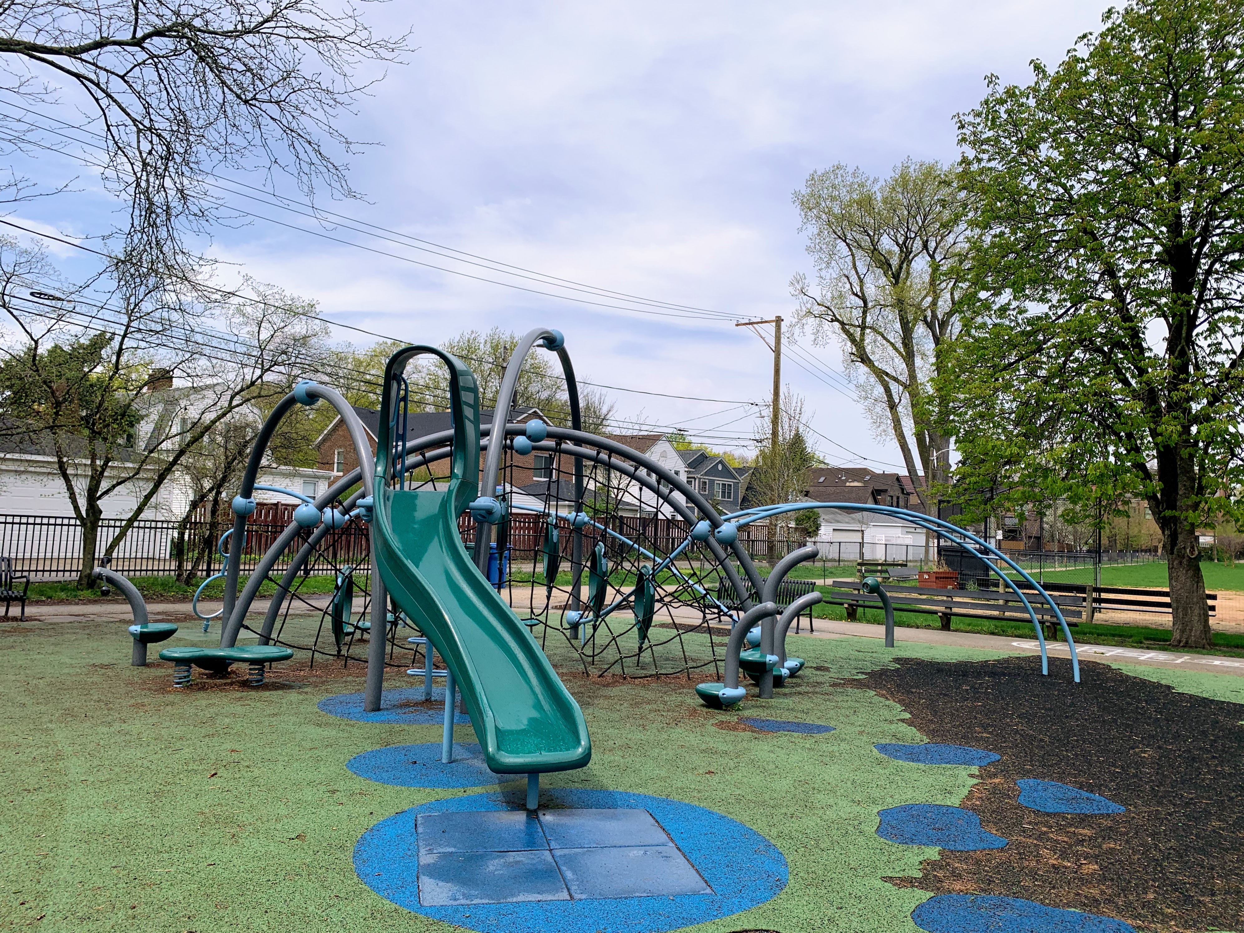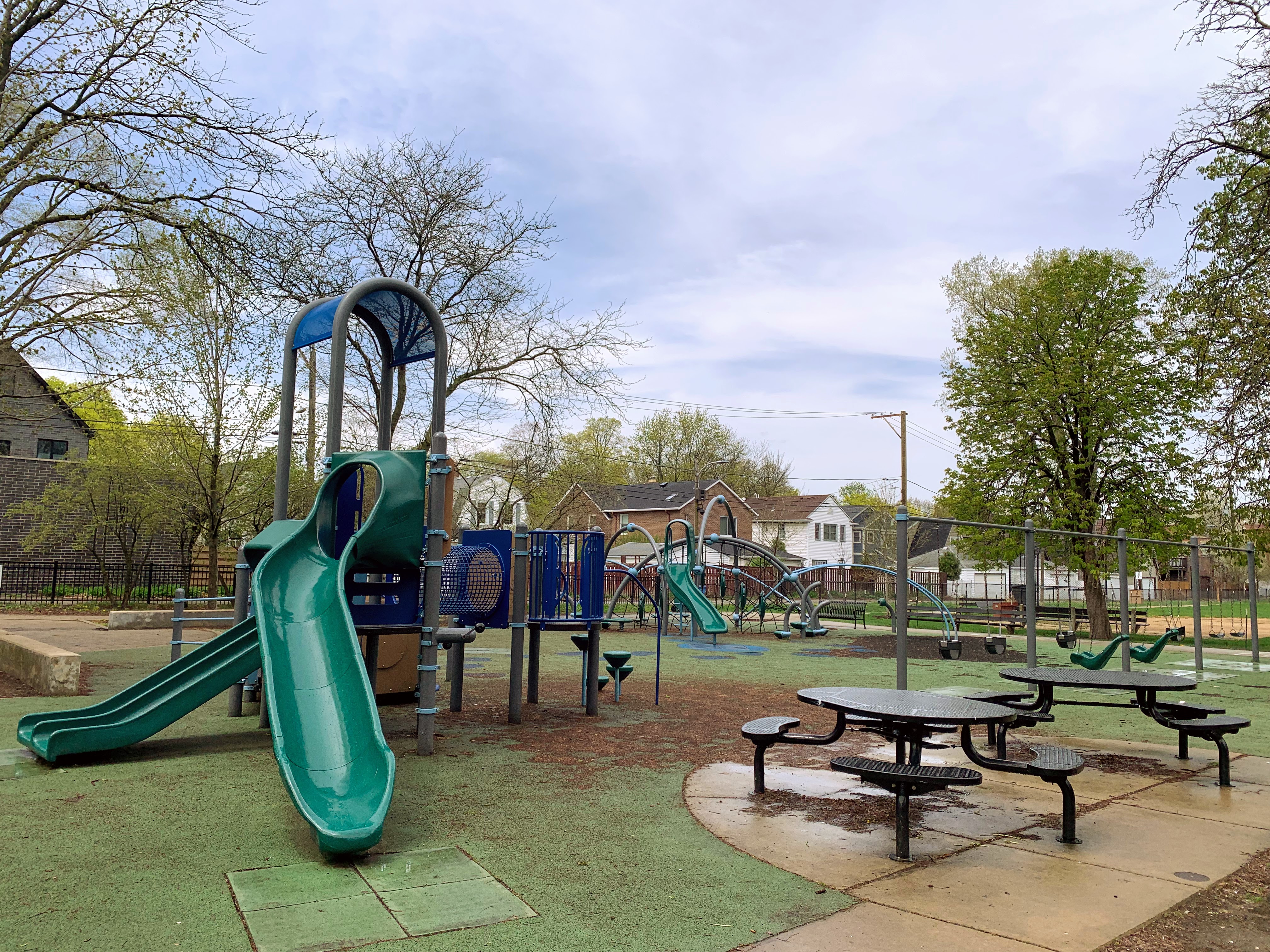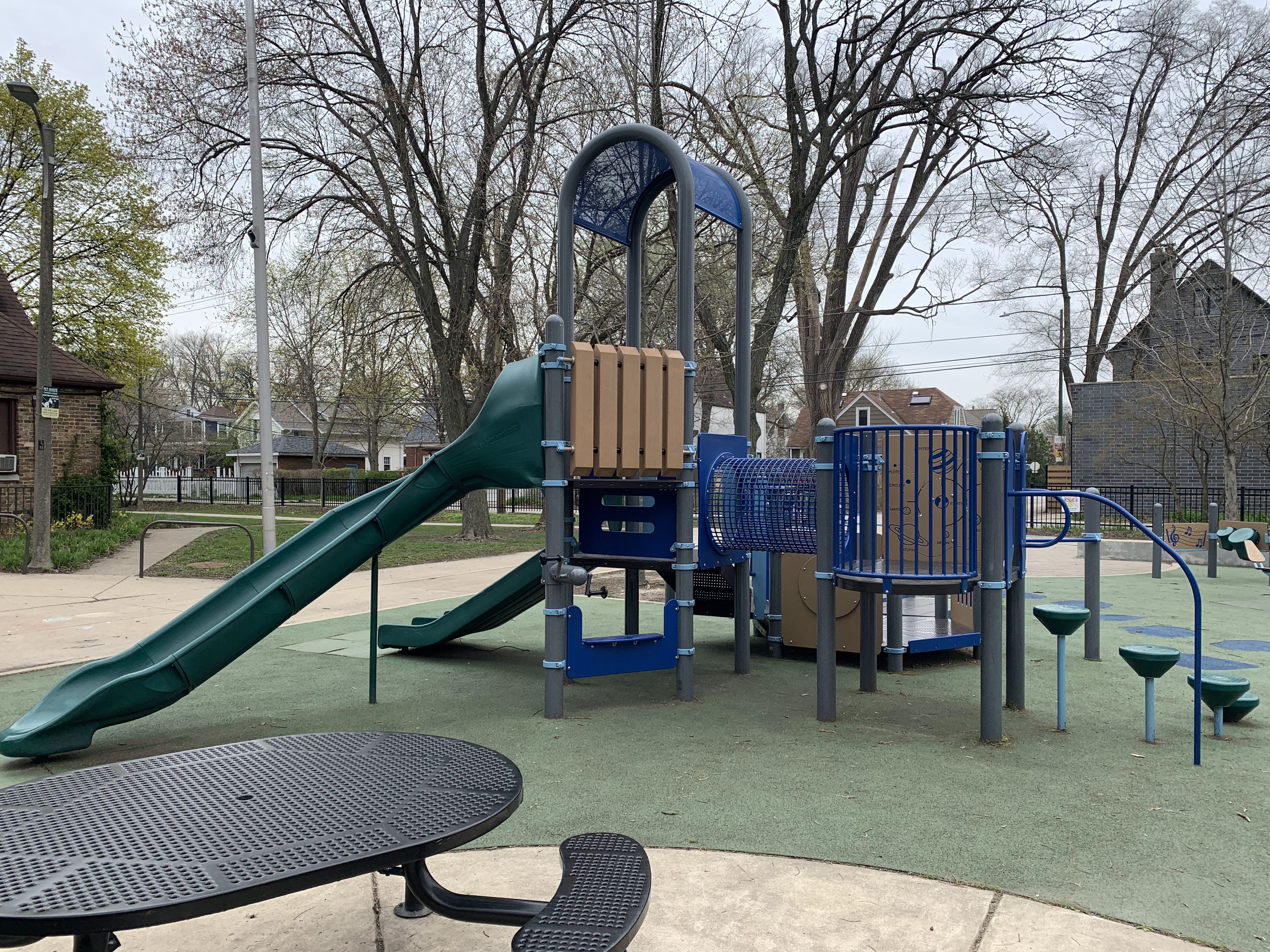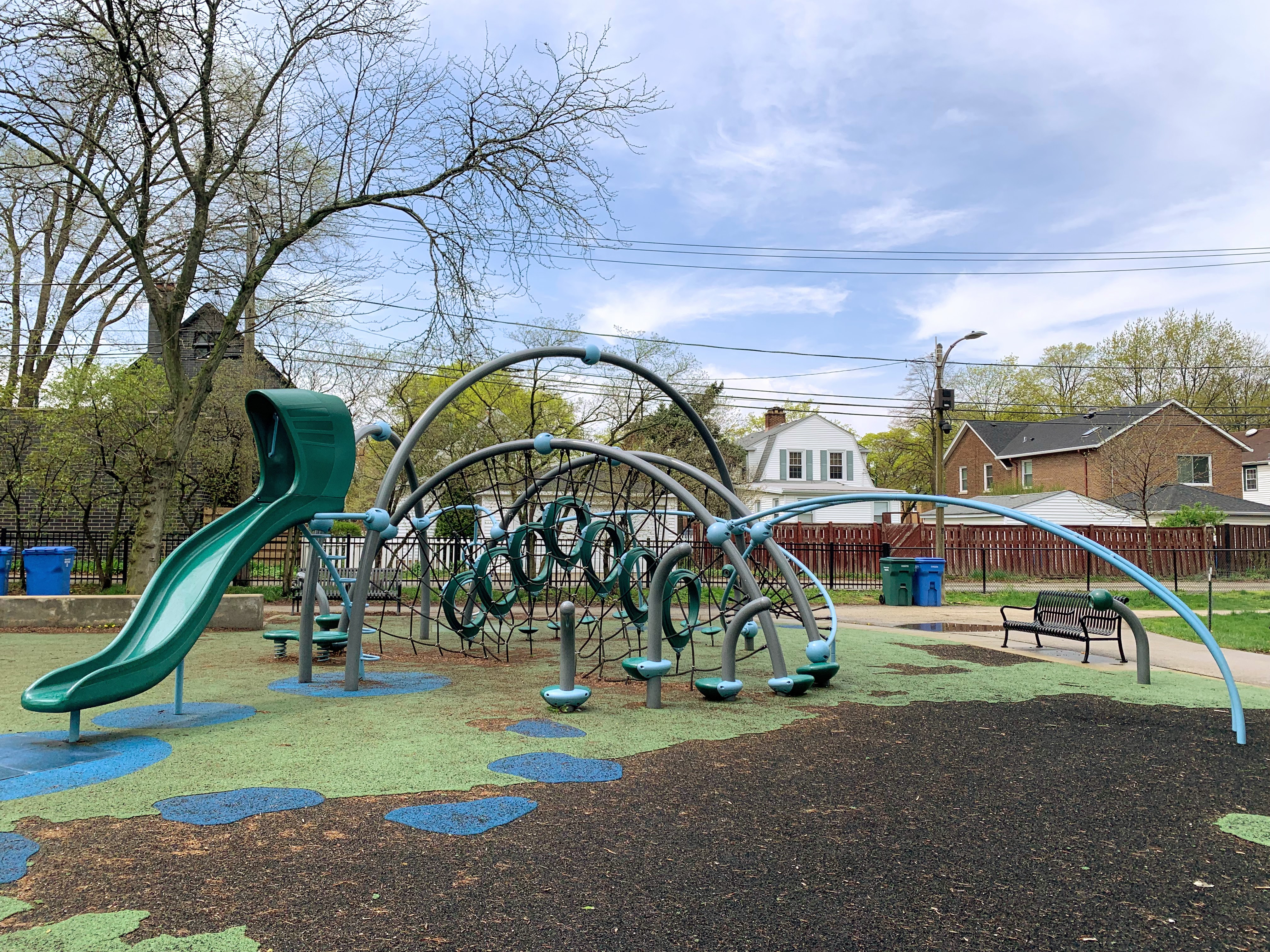 - Set between the a quiet residential alley and a paved trail (called the Sauganash Line Trail, the Valley Line Trail, or the Skokie Valley Trail at various points) Sauganash Park features a solid playground. There is a smaller play structure for younger children and another area featuring a large semi-circular climbing net and suspended ring climbing structure. There is the standard set of swings and a little 'music area' with some musical panels. The play area is not fully enclosed but it is fenced from the alley. There are plenty of benches and picnic tables near the play area and large trees provide shade throughout the day. And the nearby field house provides access to bathrooms in this otherwise quiet location.