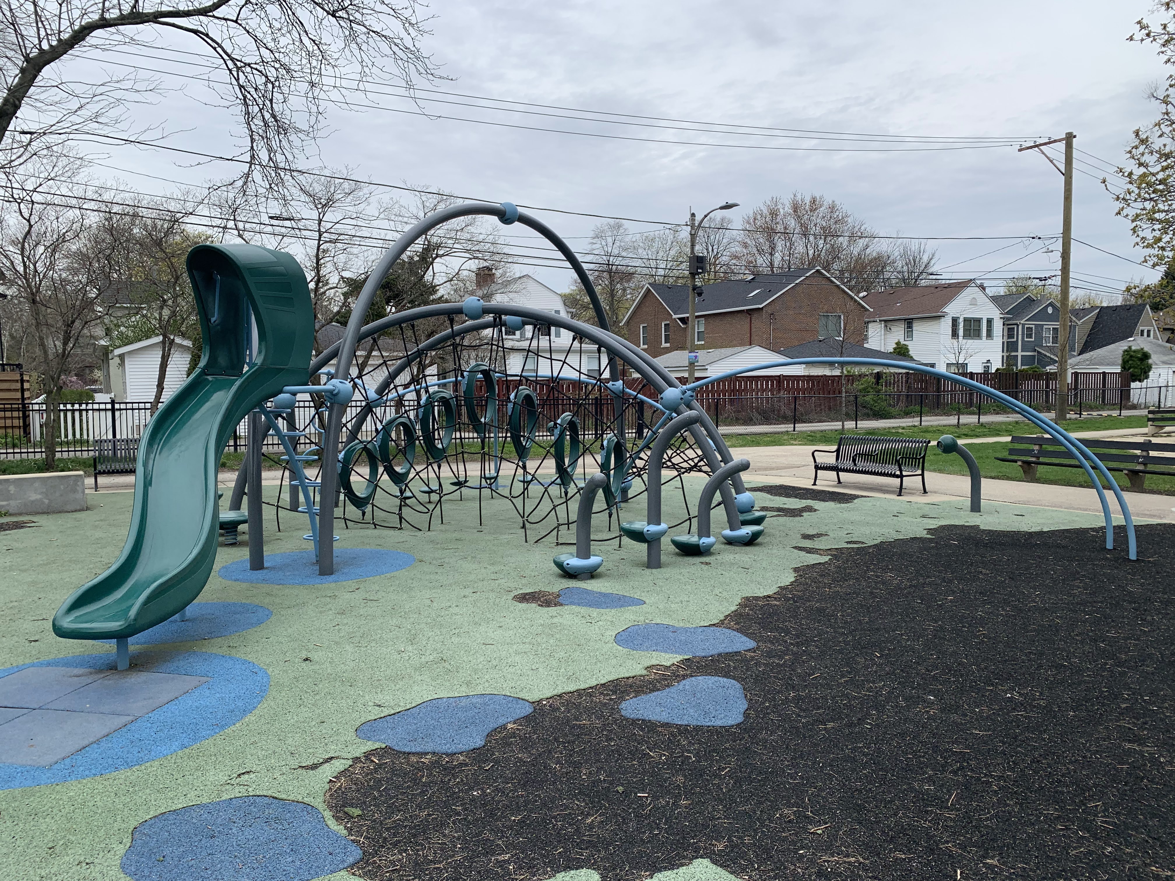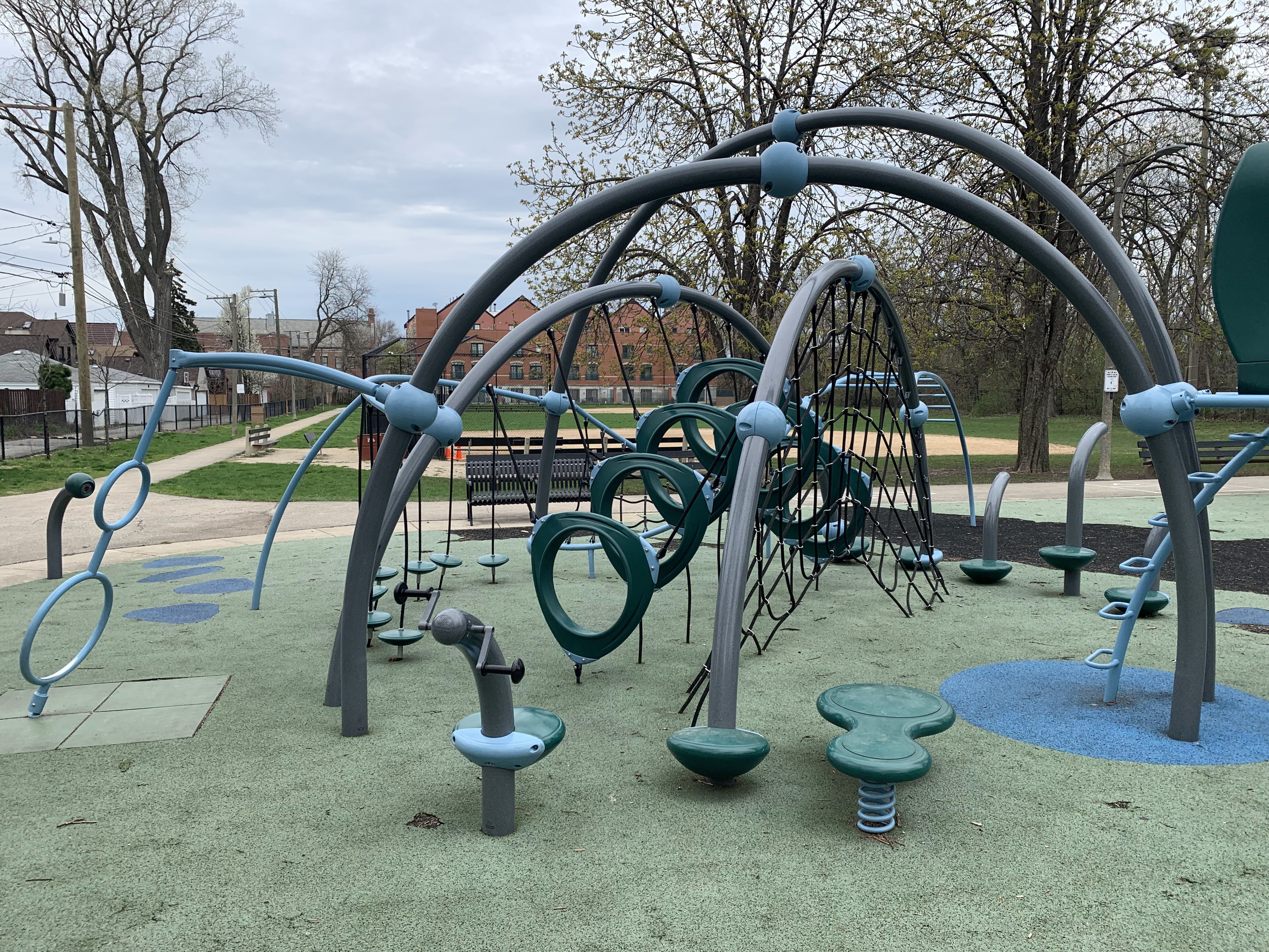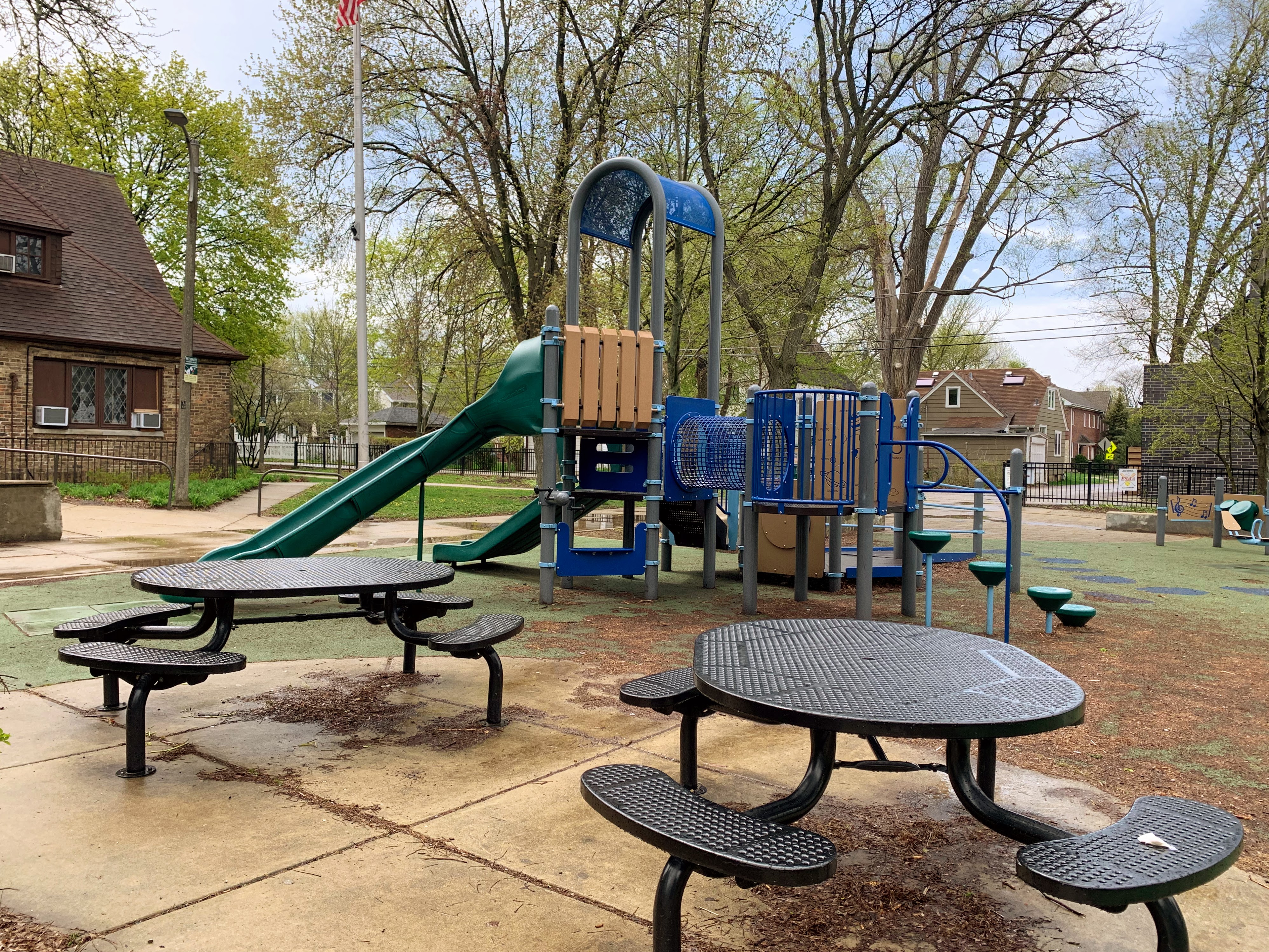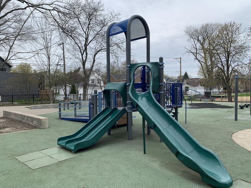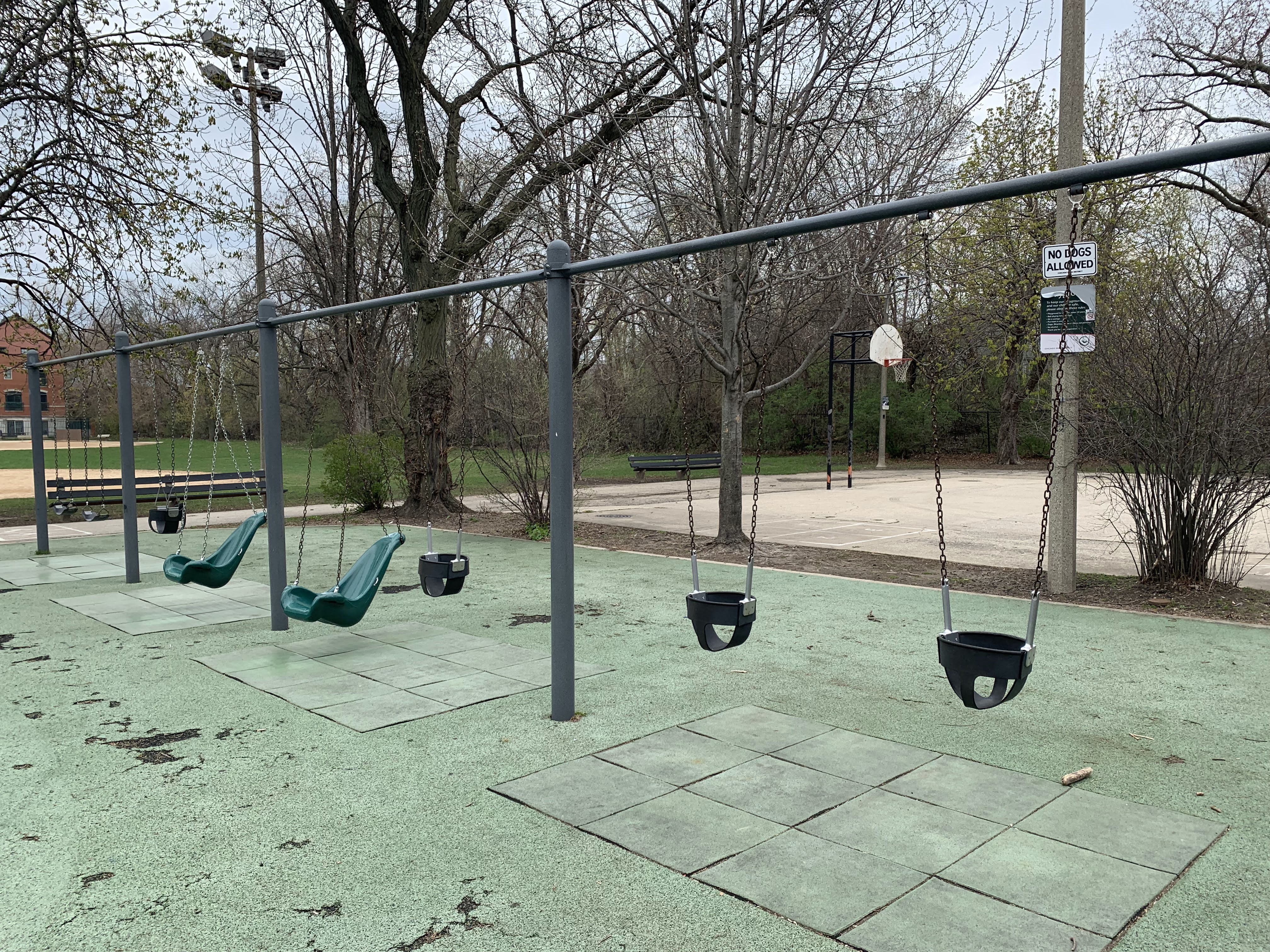 - Set between the a quiet residential alley and a paved trail (called the Sauganash Line Trail, the Valley Line Trail, or the Skokie Valley Trail at various points) Sauganash Park features a solid playground. There is a smaller play structure for younger children and another area featuring a large semi-circular climbing net and suspended ring climbing structure. There is the standard set of swings and a little 'music area' with some musical panels. The play area is not fully enclosed but it is fenced from the alley. There are plenty of benches and picnic tables near the play area and large trees provide shade throughout the day. And the nearby field house provides access to bathrooms in this otherwise quiet location.