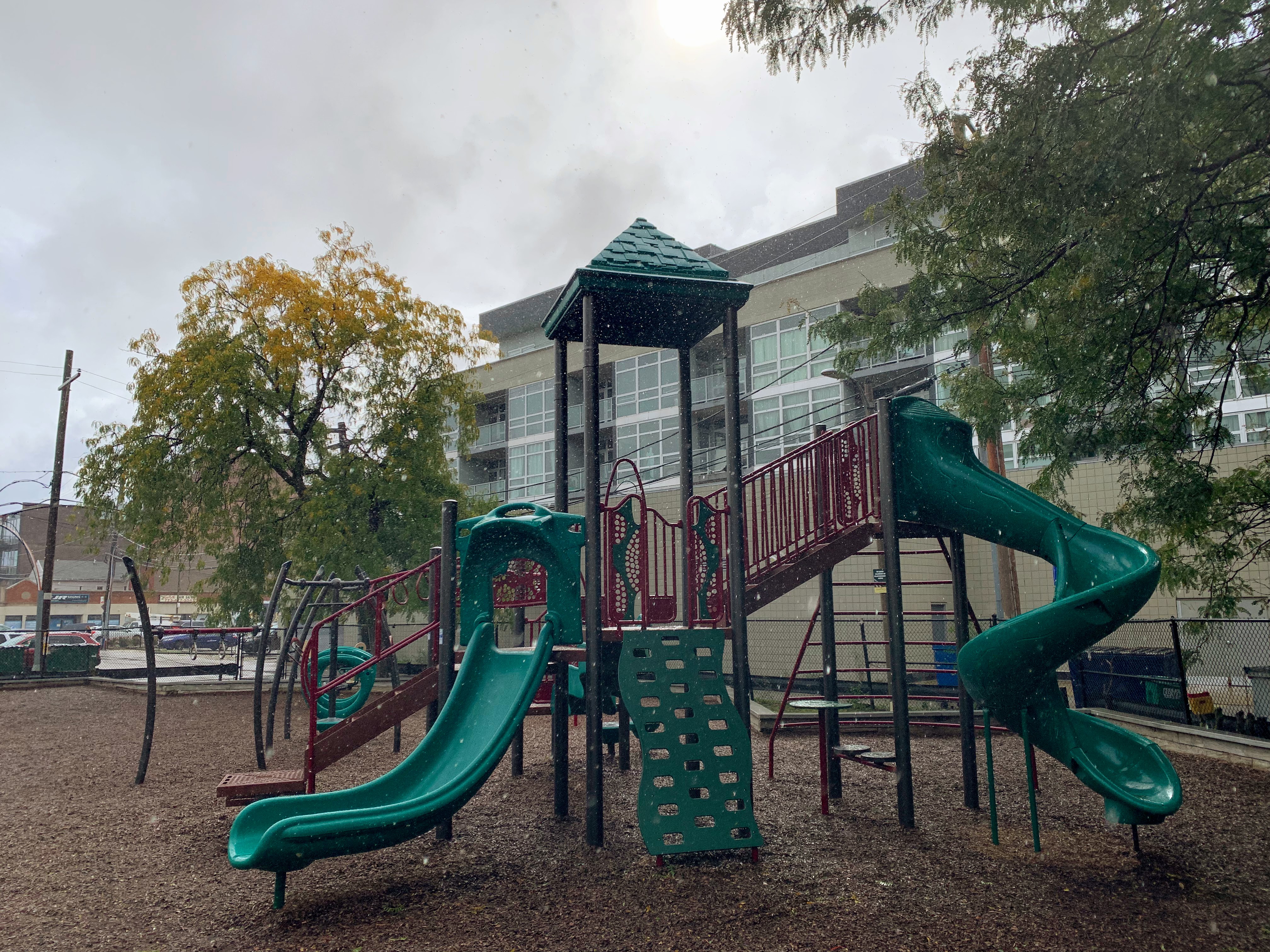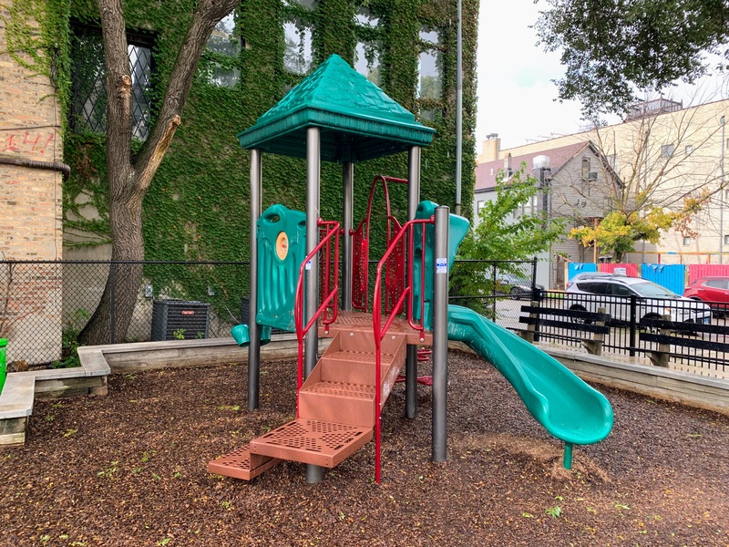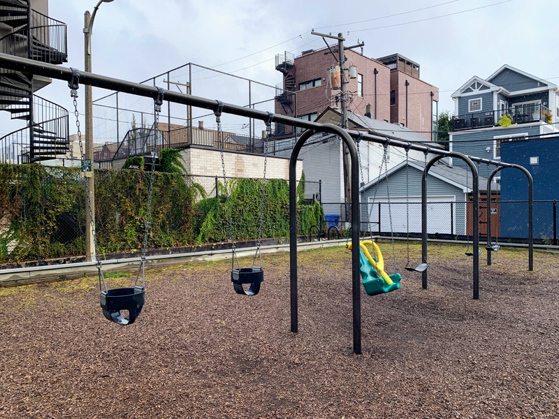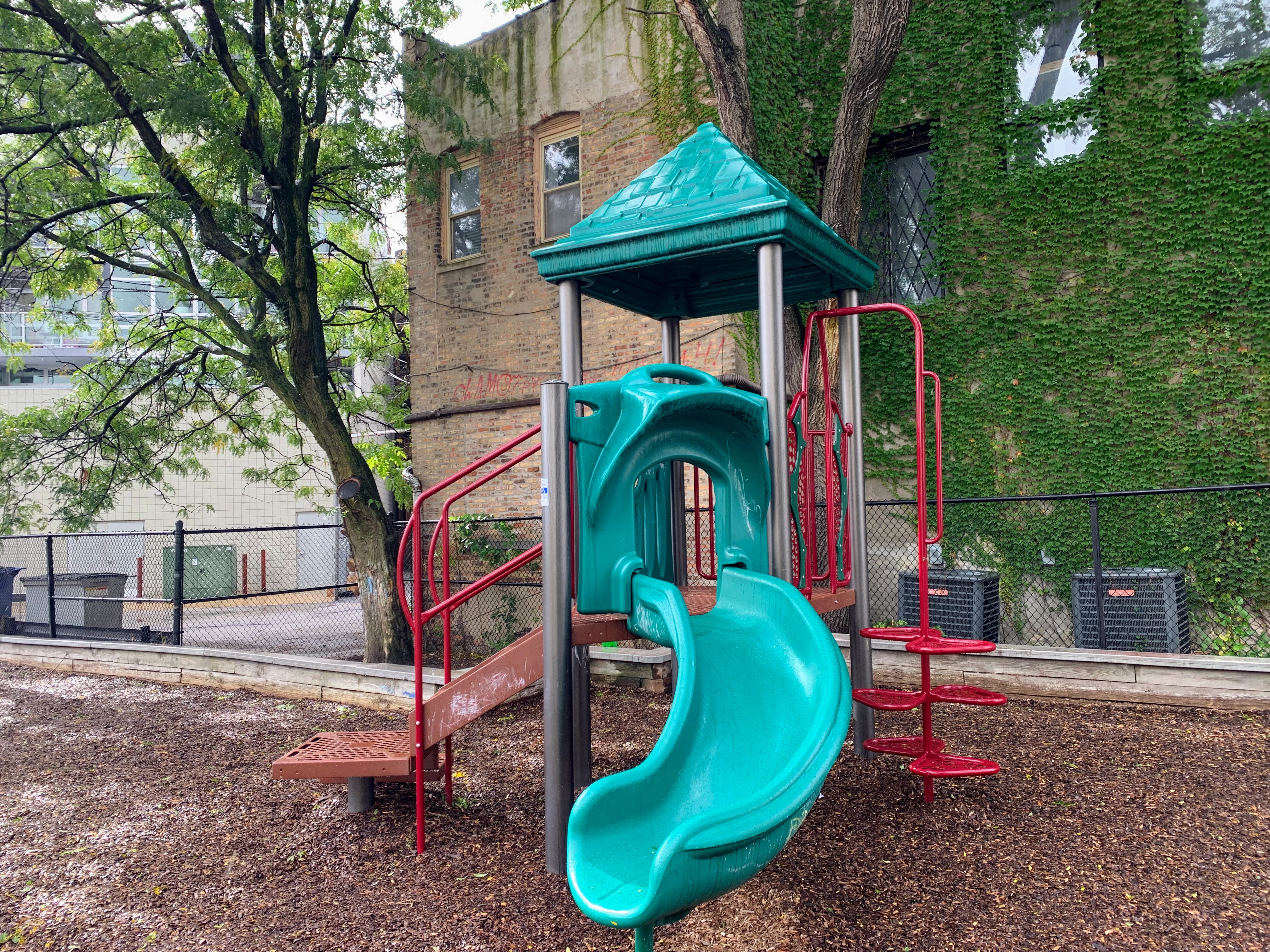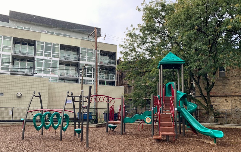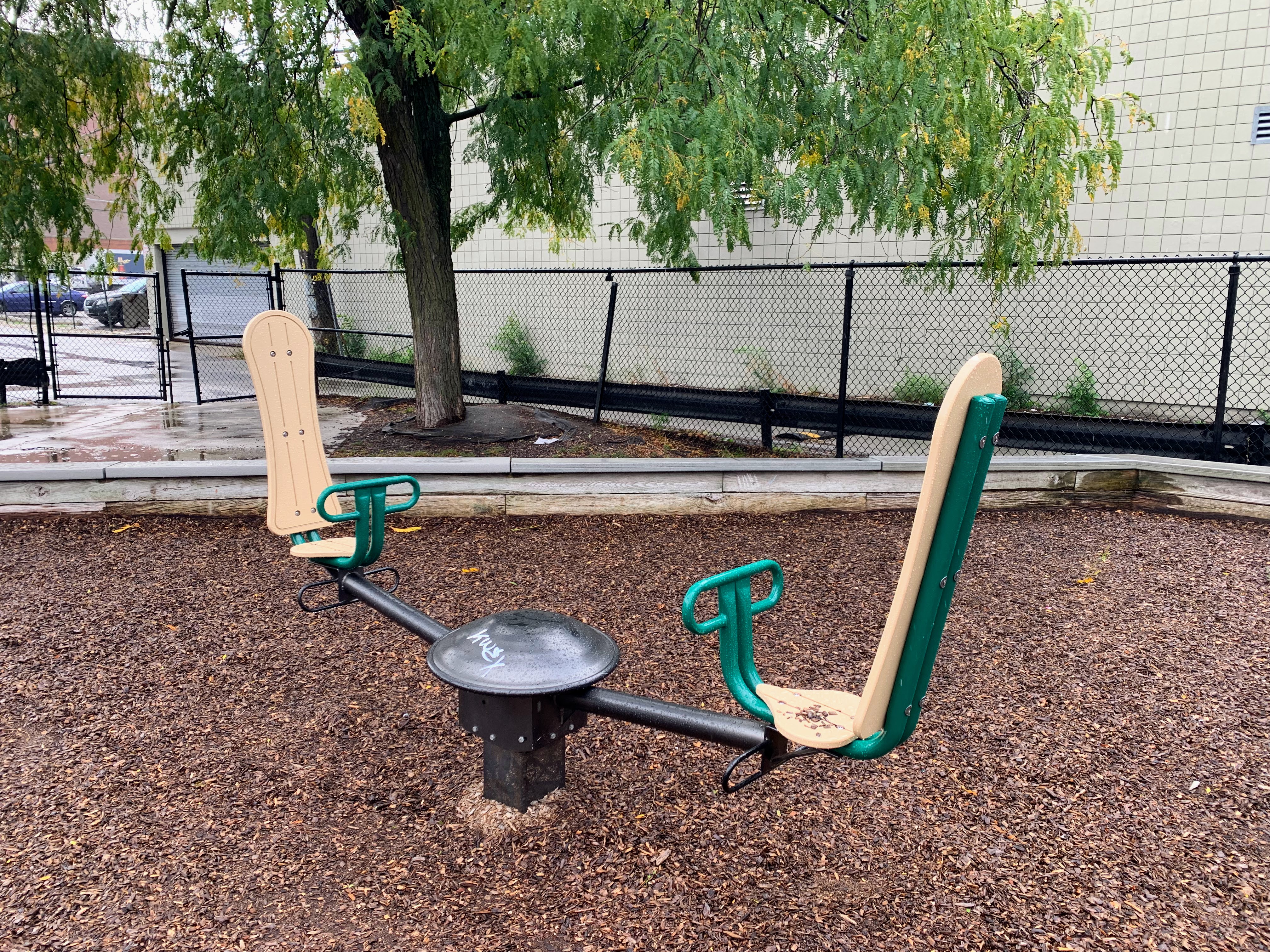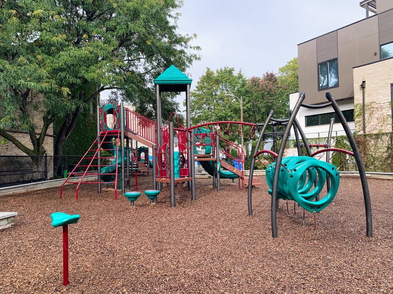 This small pocket park is tucked off the street and creates a somewhat cozy feeling. The play area is nearly completely enclosed and the main play surface is wood chips. There are a few benches and trees for seating and shade and there is a drinking fountain near the entrance. All in all, this is a solid neighborhood park. - Playground Features