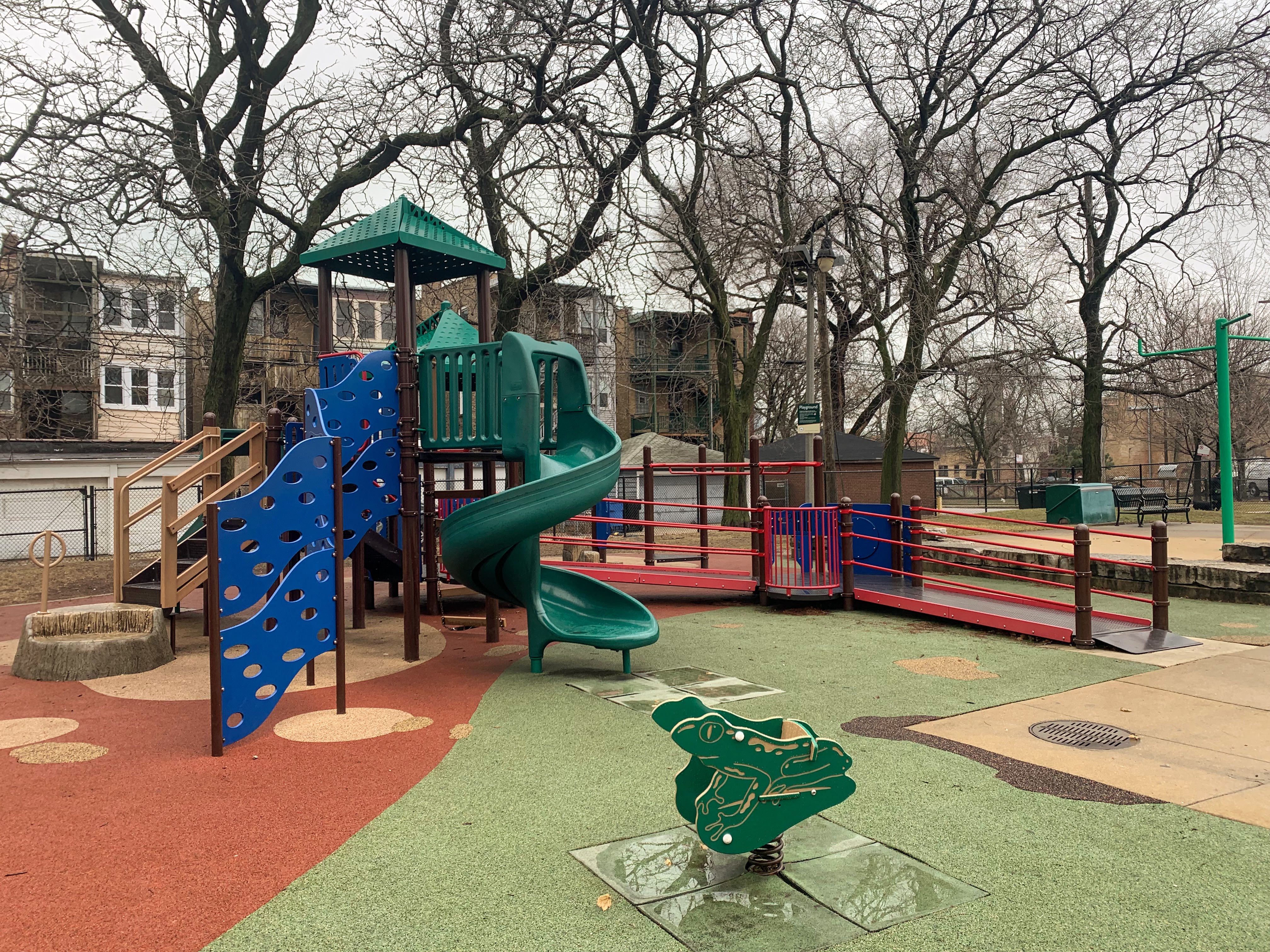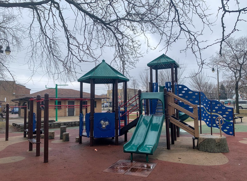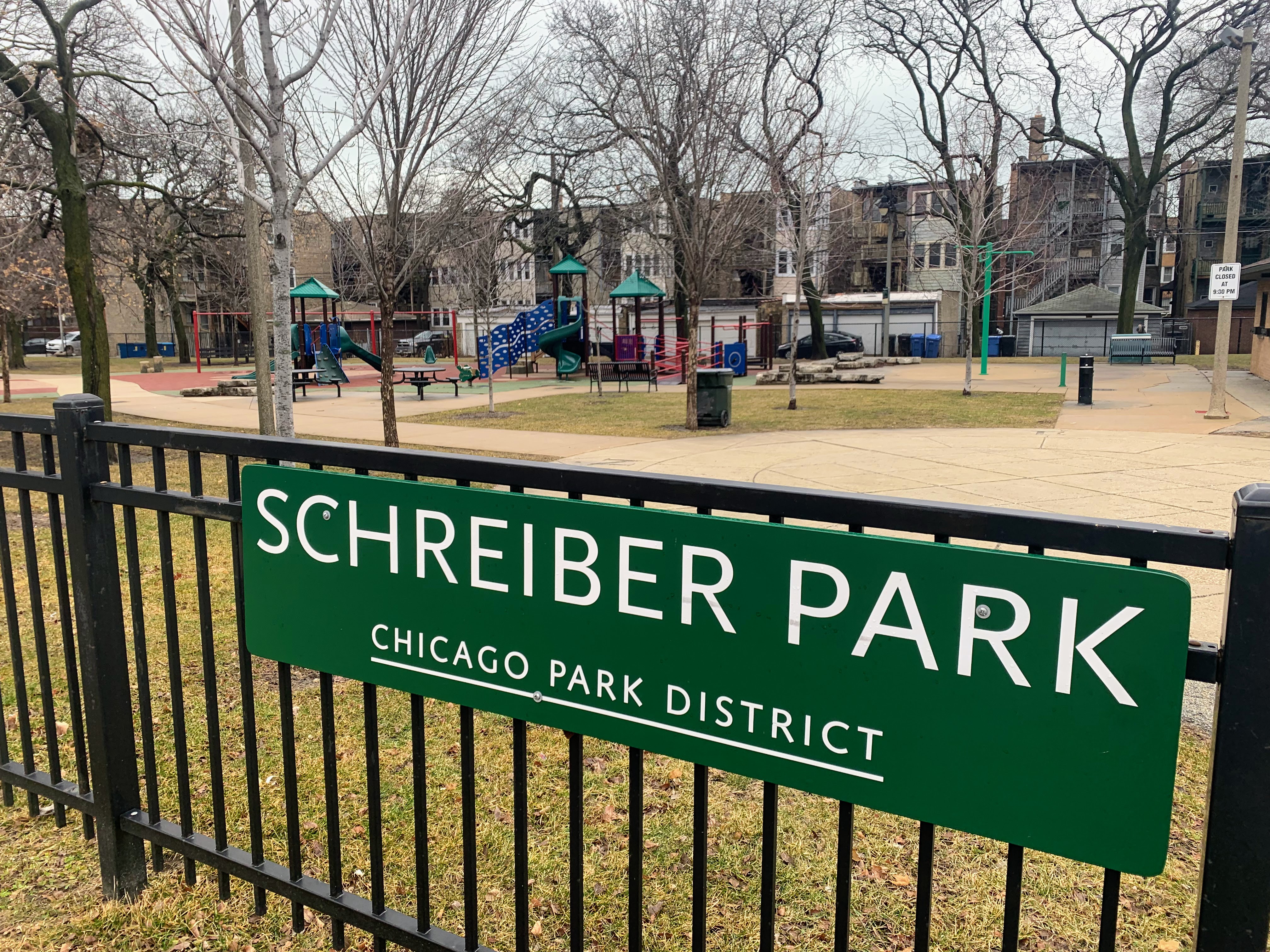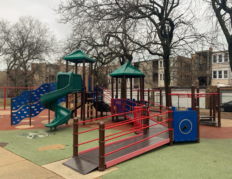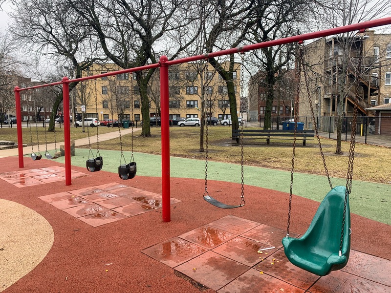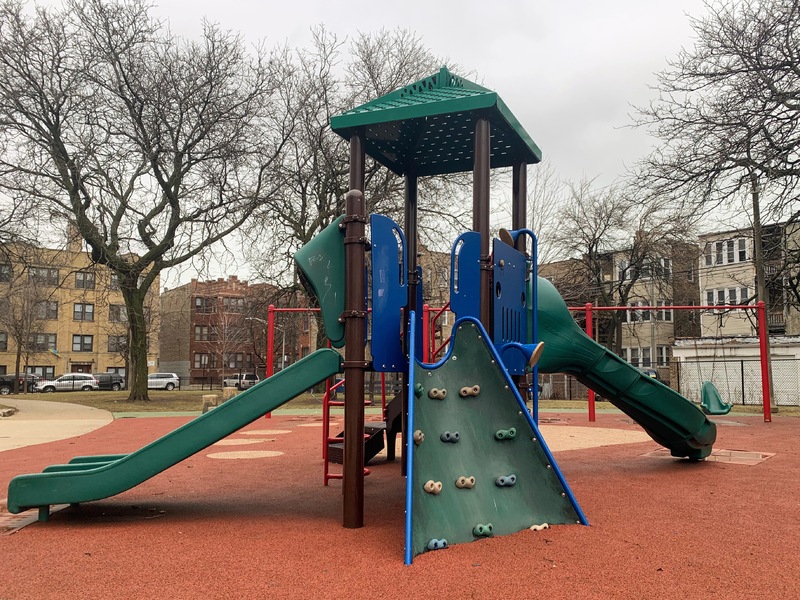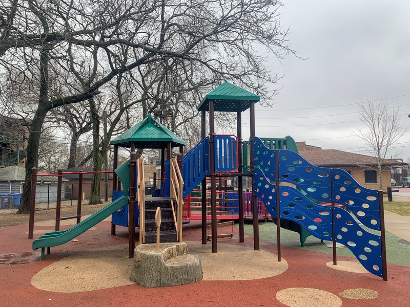 Schreiber Park is a small neighborhood park with a fieldhouse, water spray feature, and playground. The playground features a large and accessible structure for older children and a smaller structure for younger children. There are a few standalone elements and the standard Chicago Park selection of swings (toddler, adaptive, and belt seat). The water spray feature is a triple shower sprayer.