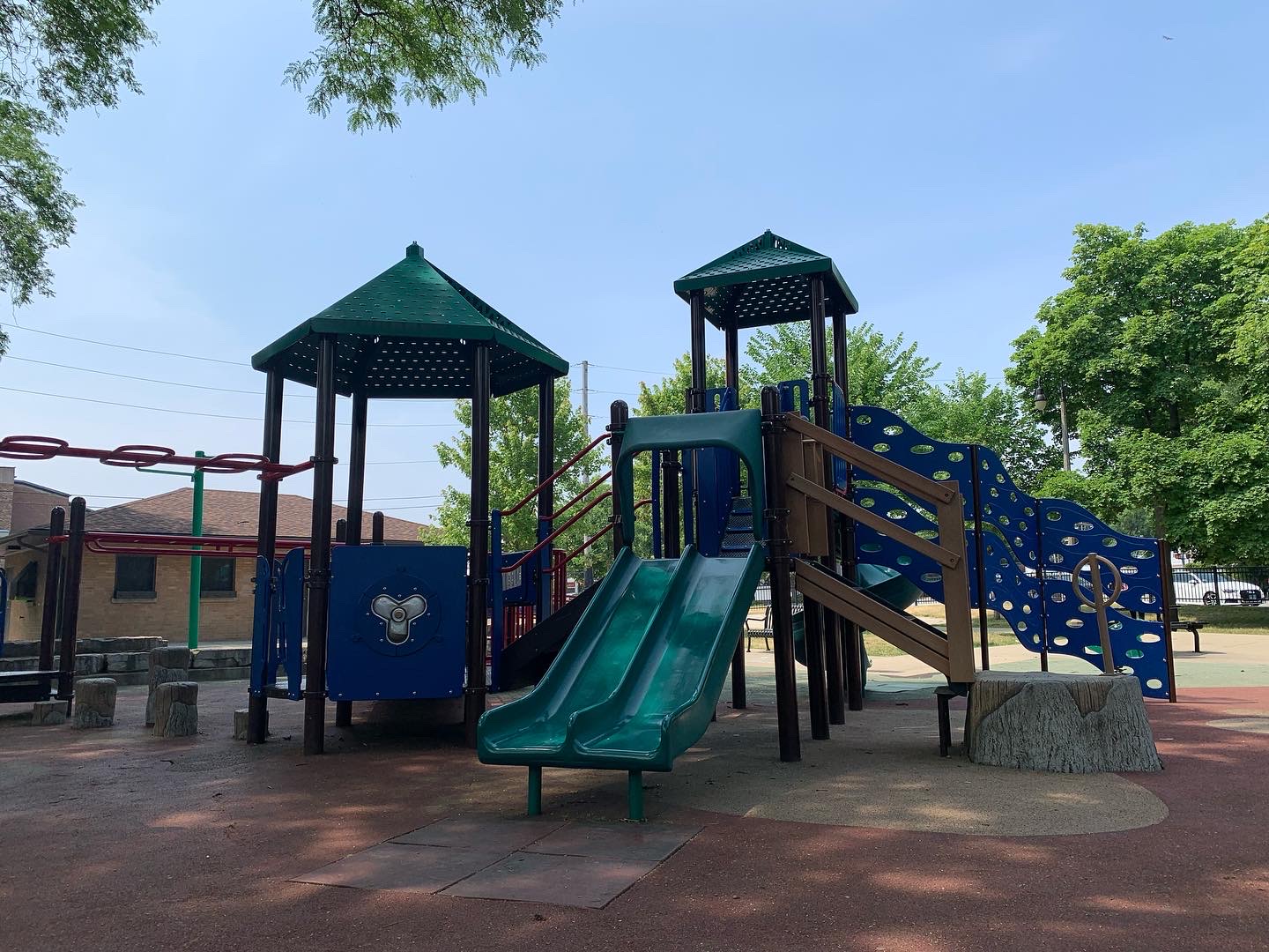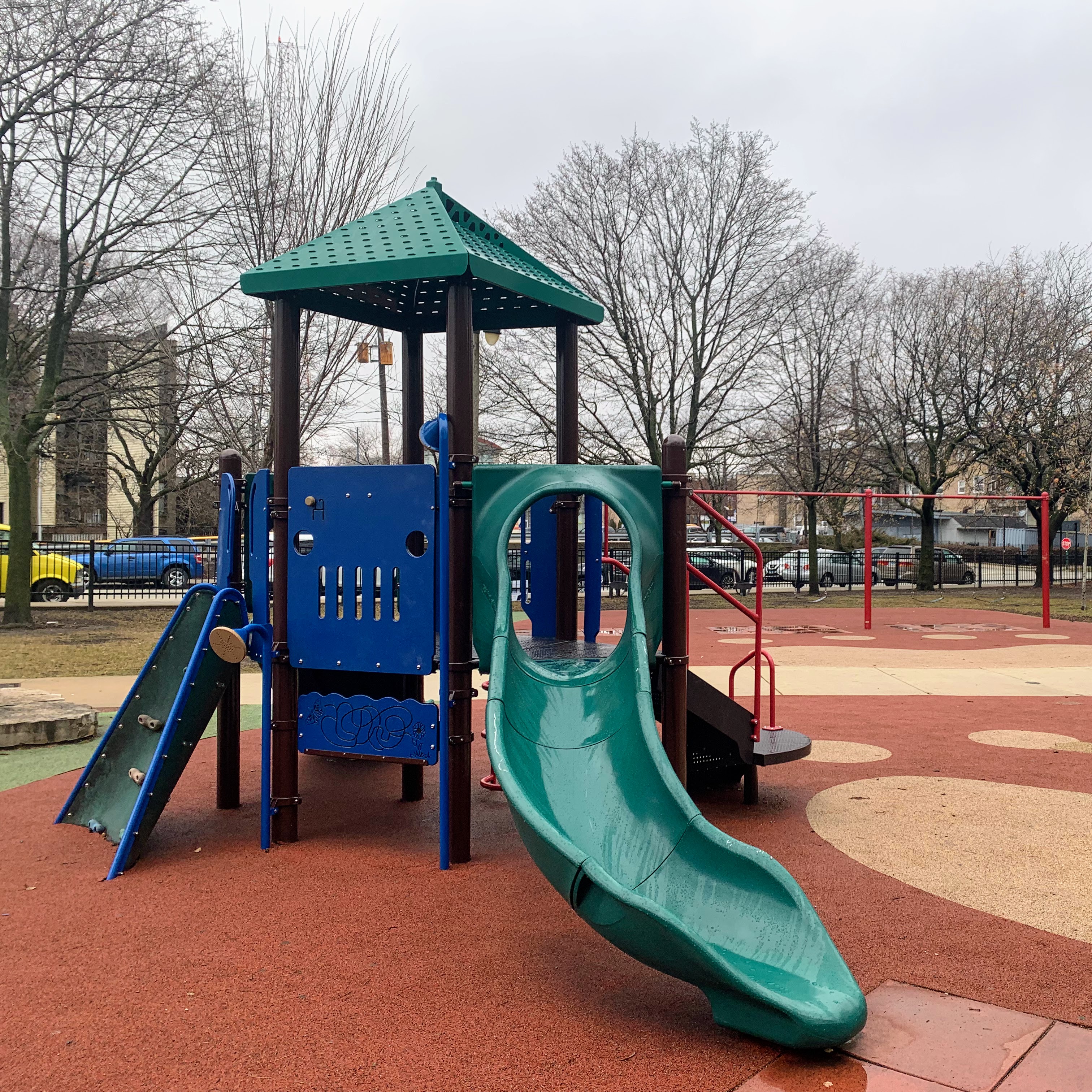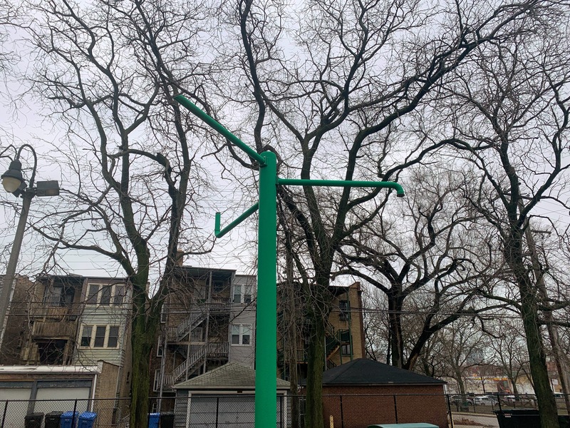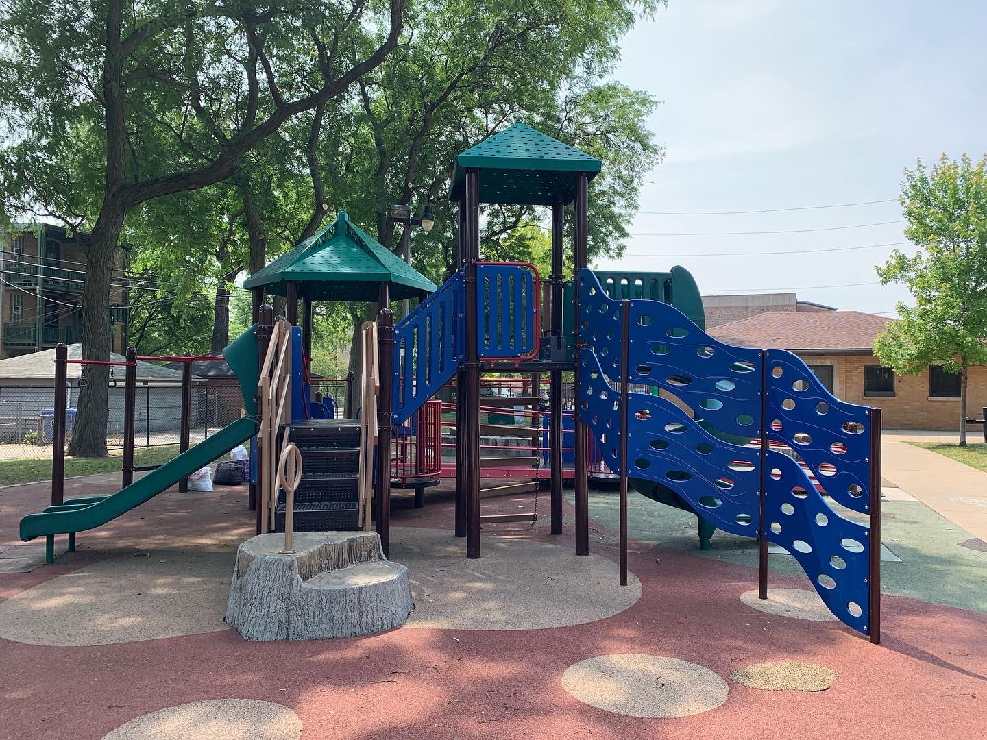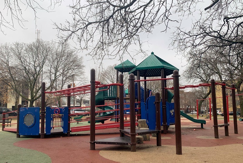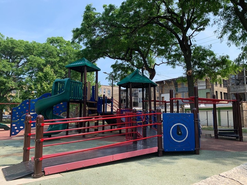 Schreiber Park is a small neighborhood park with a fieldhouse, water spray feature, and playground. The playground features a large and accessible structure for older children and a smaller structure for younger children. There are a few standalone elements and the standard Chicago Park selection of swings (toddler, adaptive, and belt seat). The water spray feature is a triple shower sprayer.
