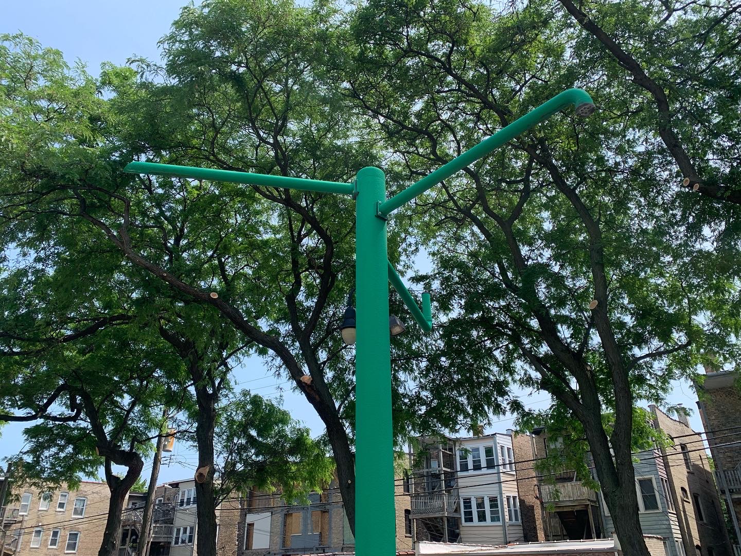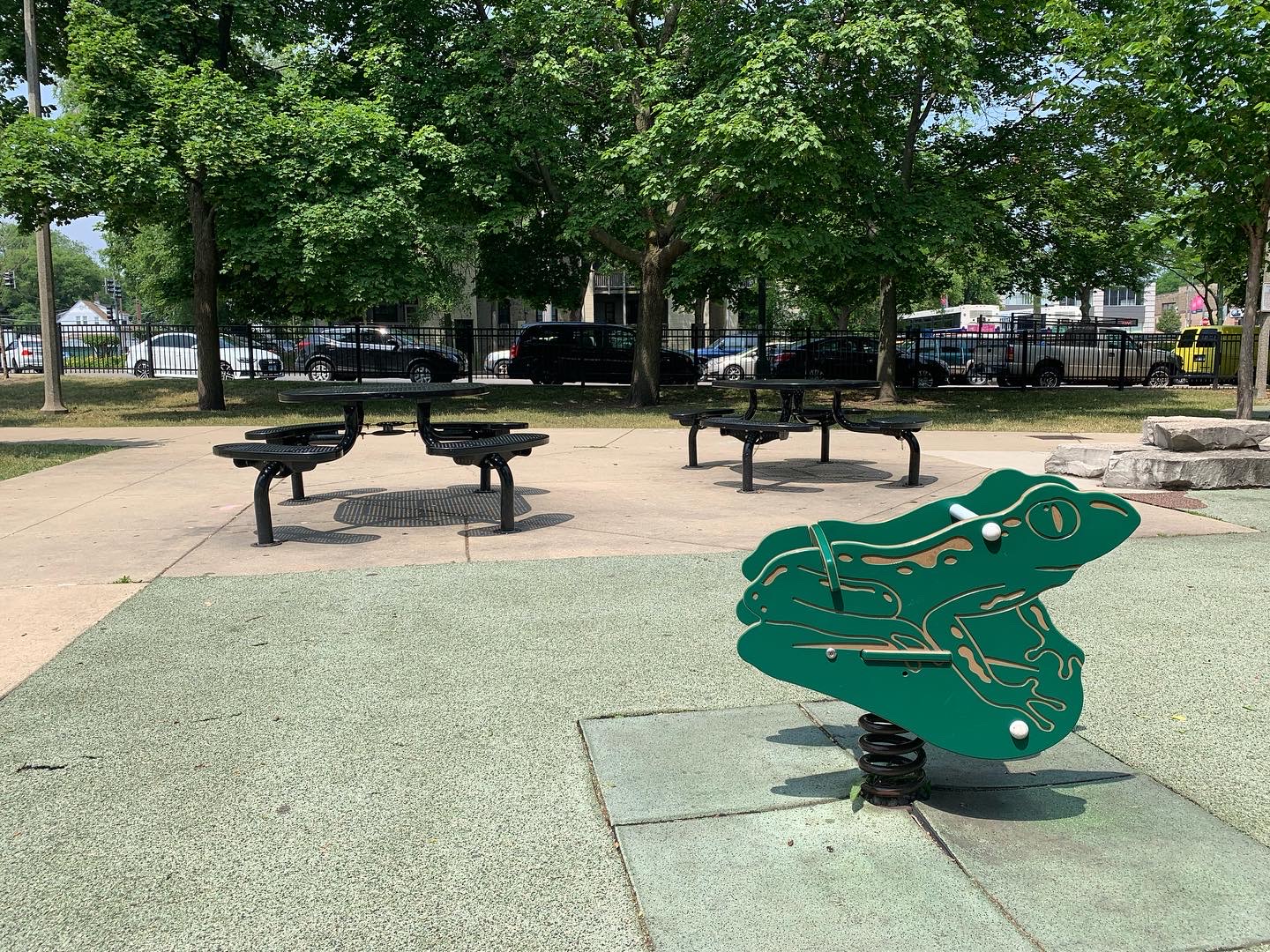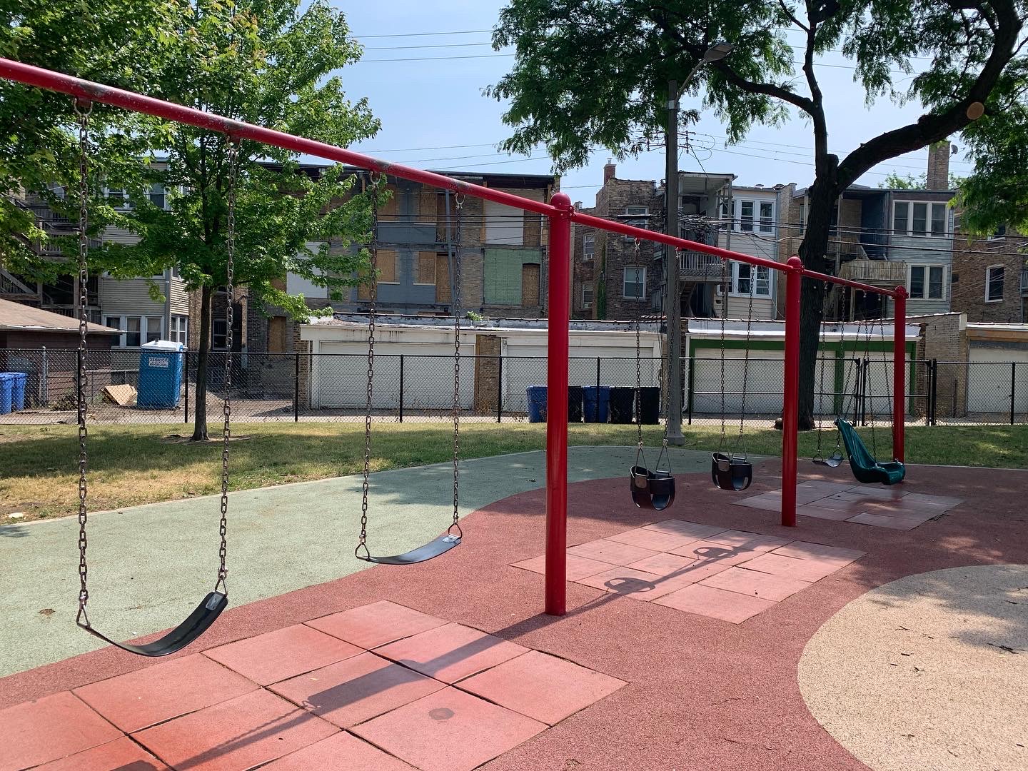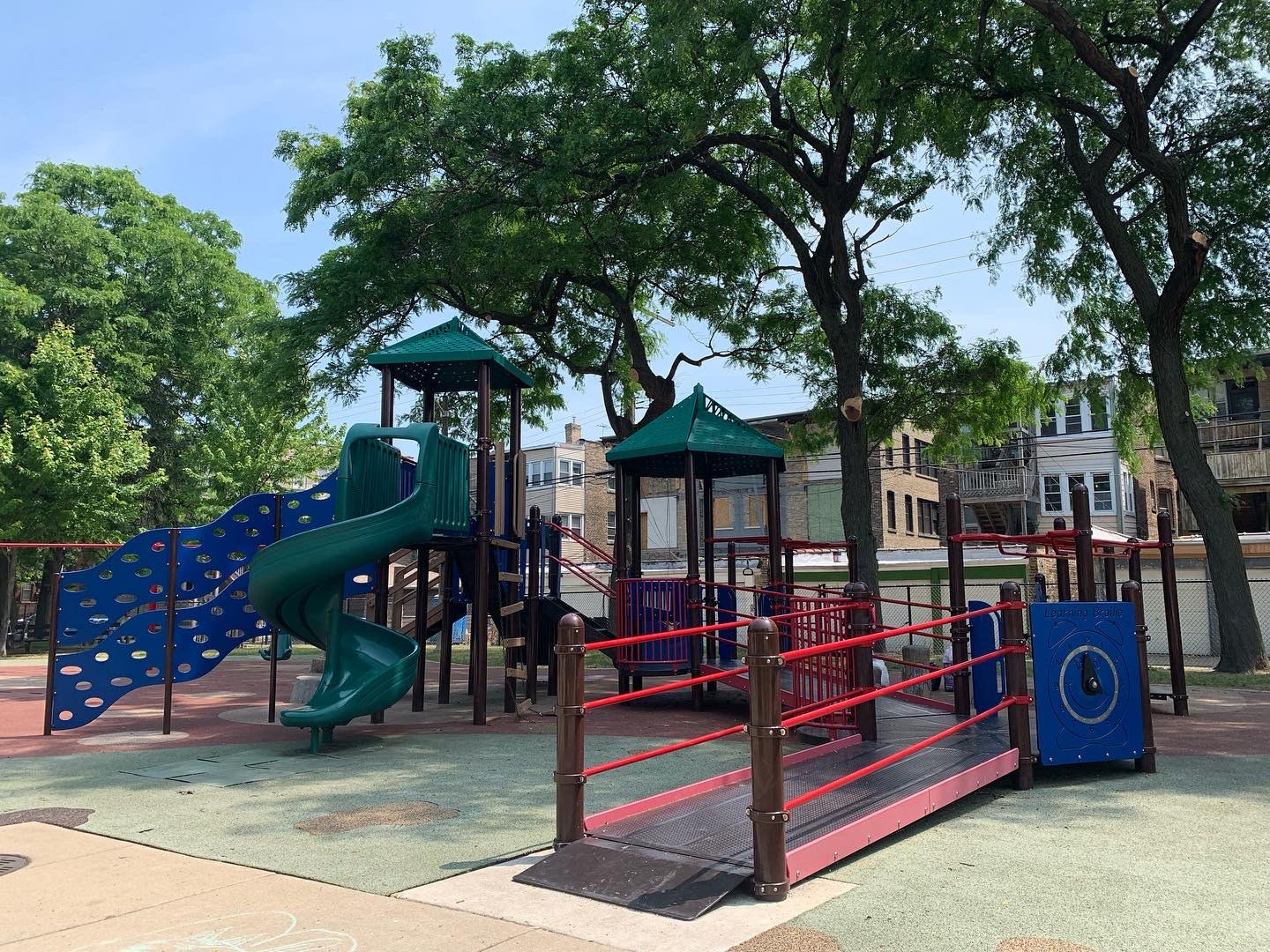 Schreiber Park is a small neighborhood park with a fieldhouse, water spray feature, and playground. The playground features a large and accessible structure for older children and a smaller structure for younger children. There are a few standalone elements and the standard Chicago Park selection of swings (toddler, adaptive, and belt seat). The water spray feature is a triple shower sprayer.