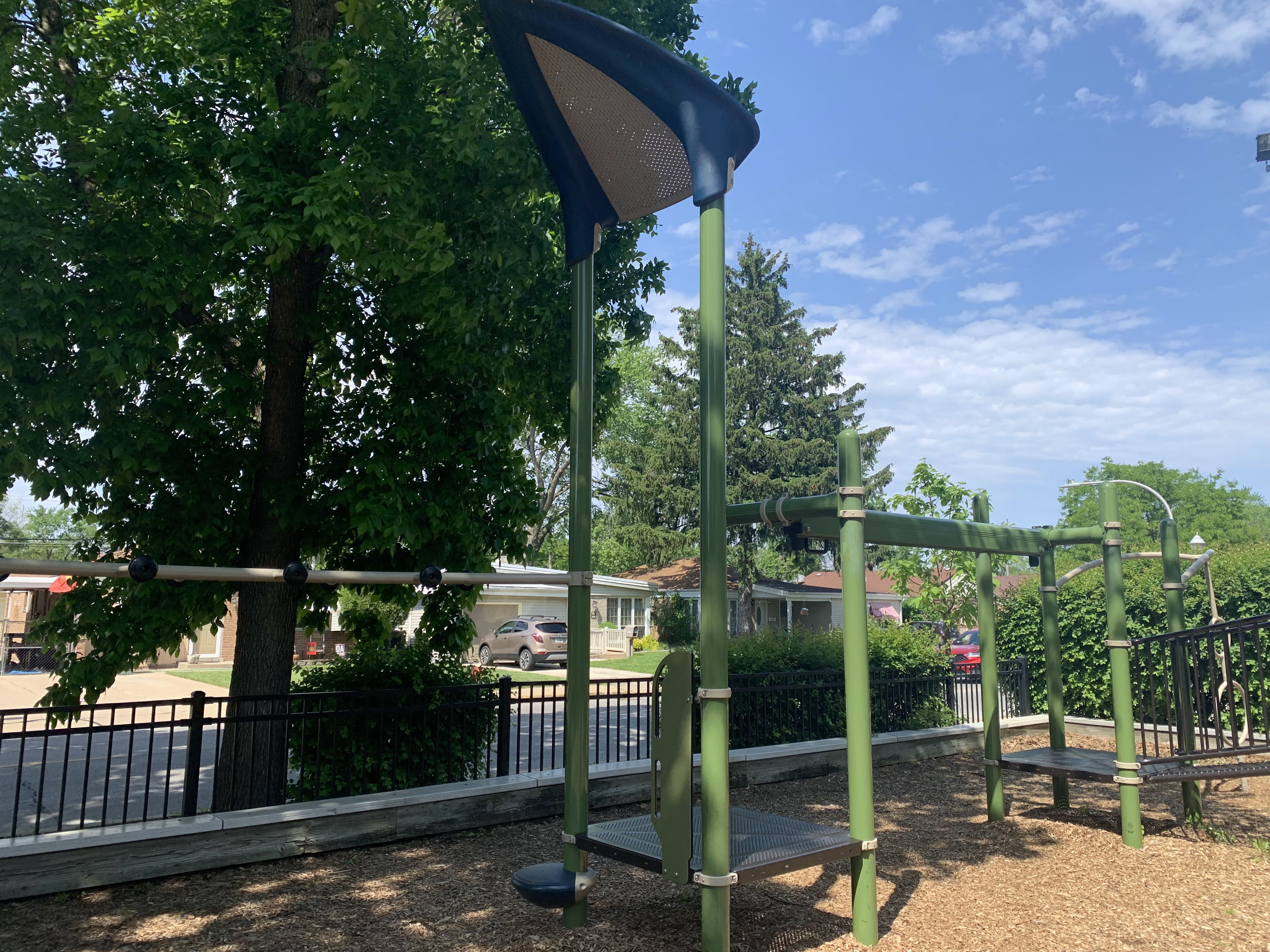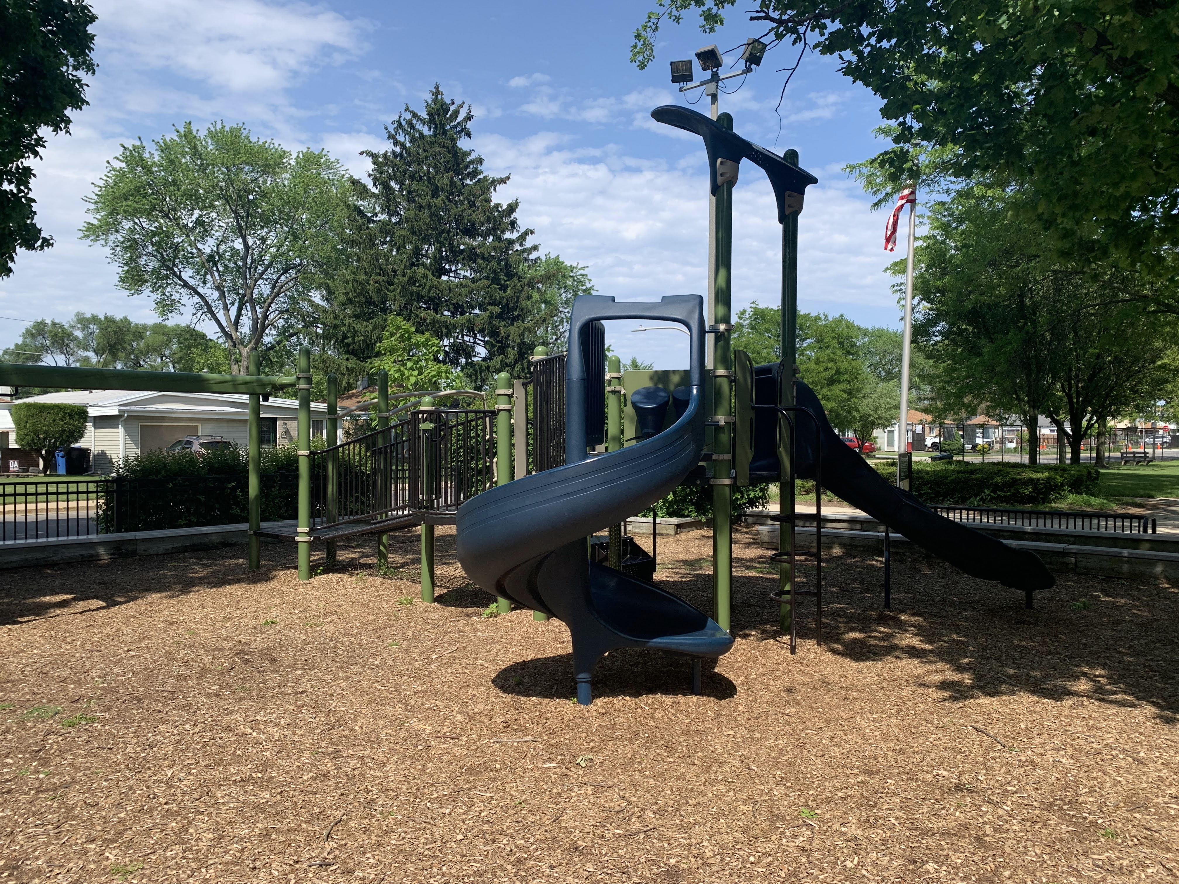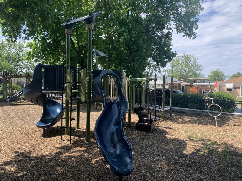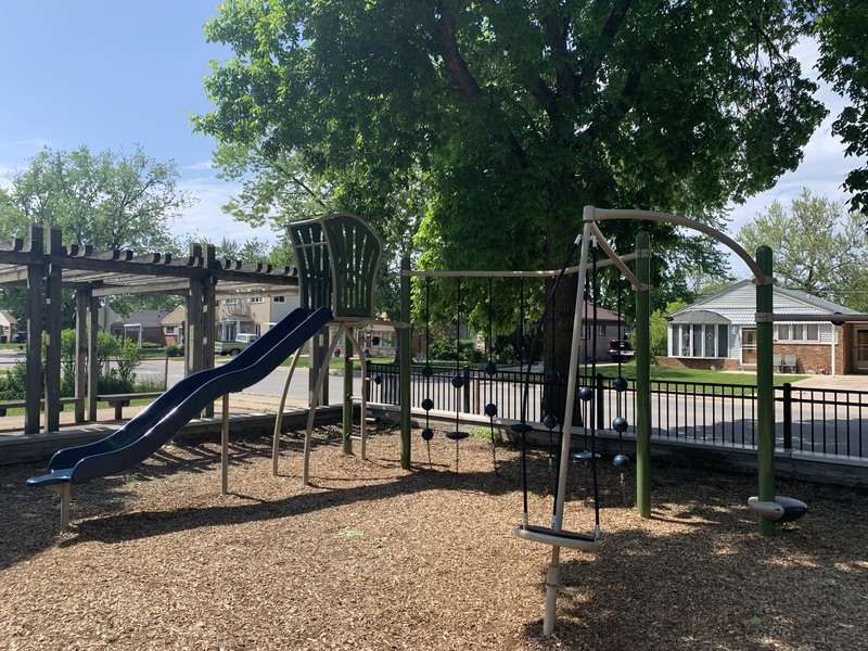 - The playground in Scottsdale Park is tucked into the shady northwest corner of the park. This playground features a medium-sized play structure, a string of connected climbing/traversing elements, and the standard Chicago Park District swings. The play area is fenced from the street but is not fully enclosed. The play area is heavily shaded by trees and the play surface is wood chips. There are a few benches under a shade pavilion as well a drinking fountain. The nearby fieldhouse should provide bathroom access (when open).