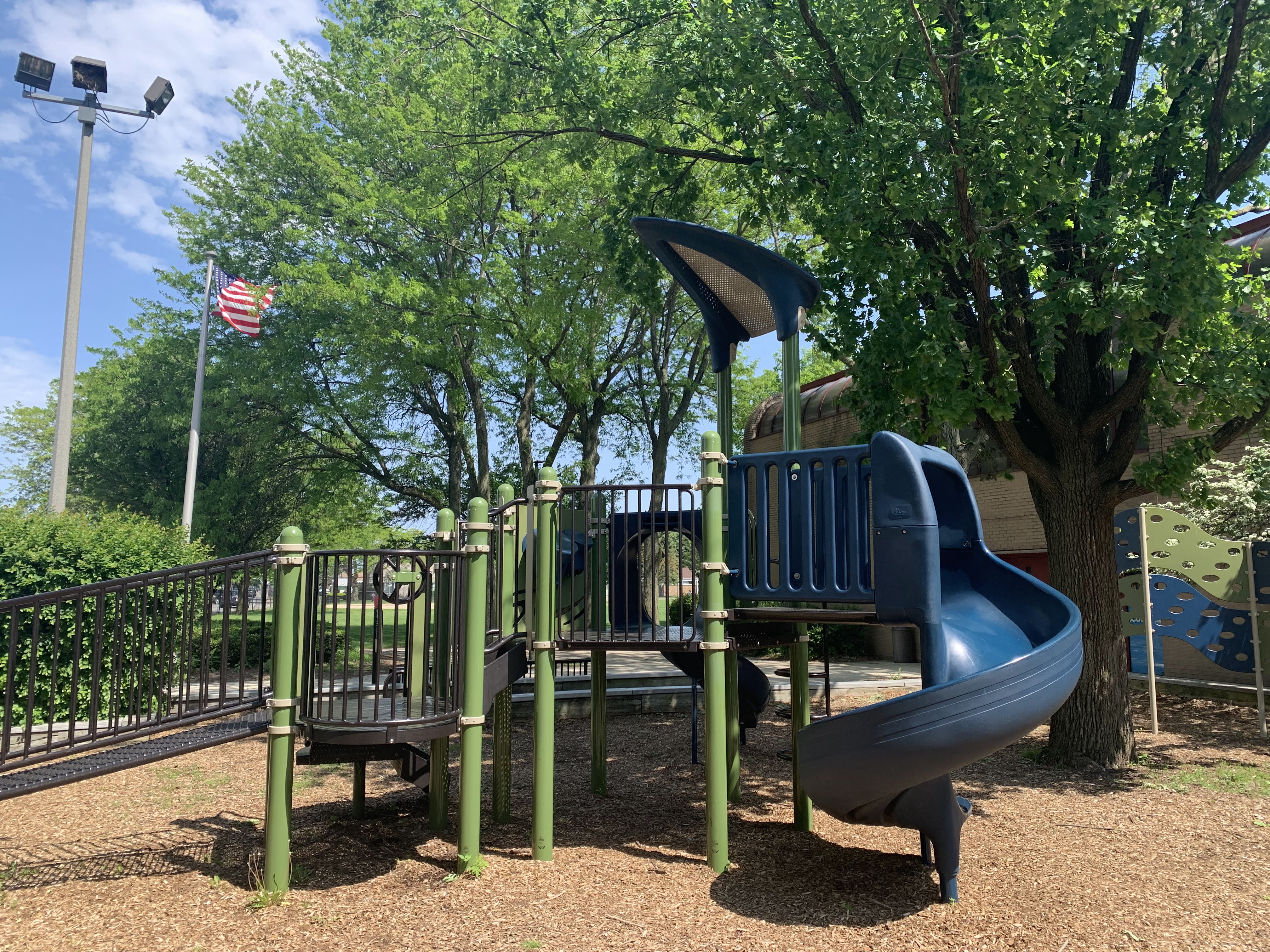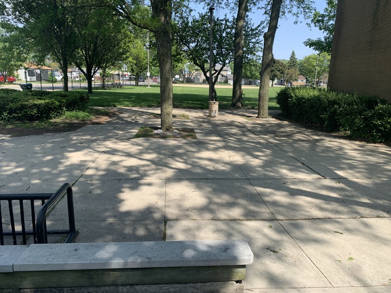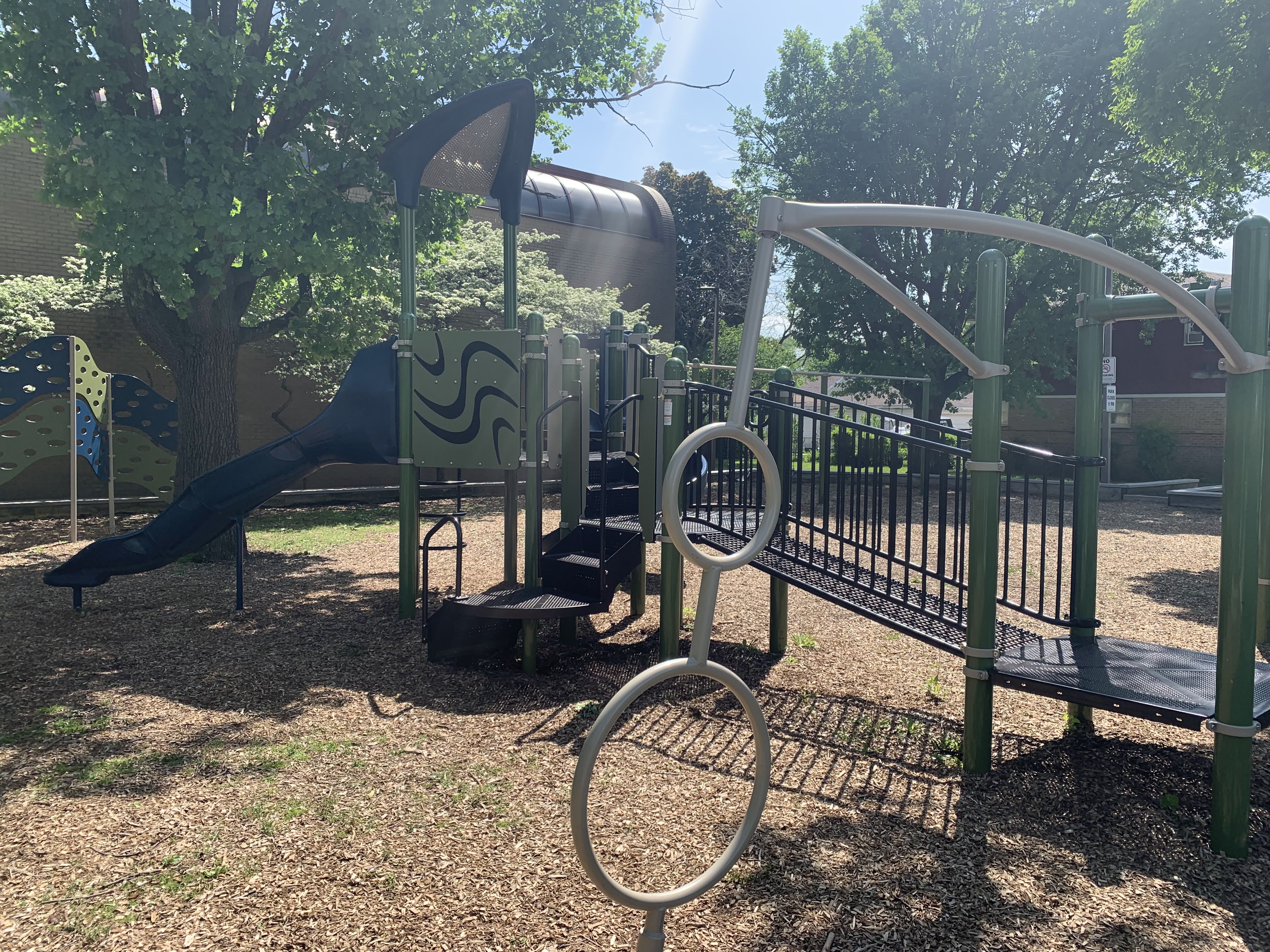 - The playground in Scottsdale Park is tucked into the shady northwest corner of the park. This playground features a medium-sized play structure, a string of connected climbing/traversing elements, and the standard Chicago Park District swings. The play area is fenced from the street but is not fully enclosed. The play area is heavily shaded by trees and the play surface is wood chips. There are a few benches under a shade pavilion as well a drinking fountain. The nearby fieldhouse should provide bathroom access (when open).