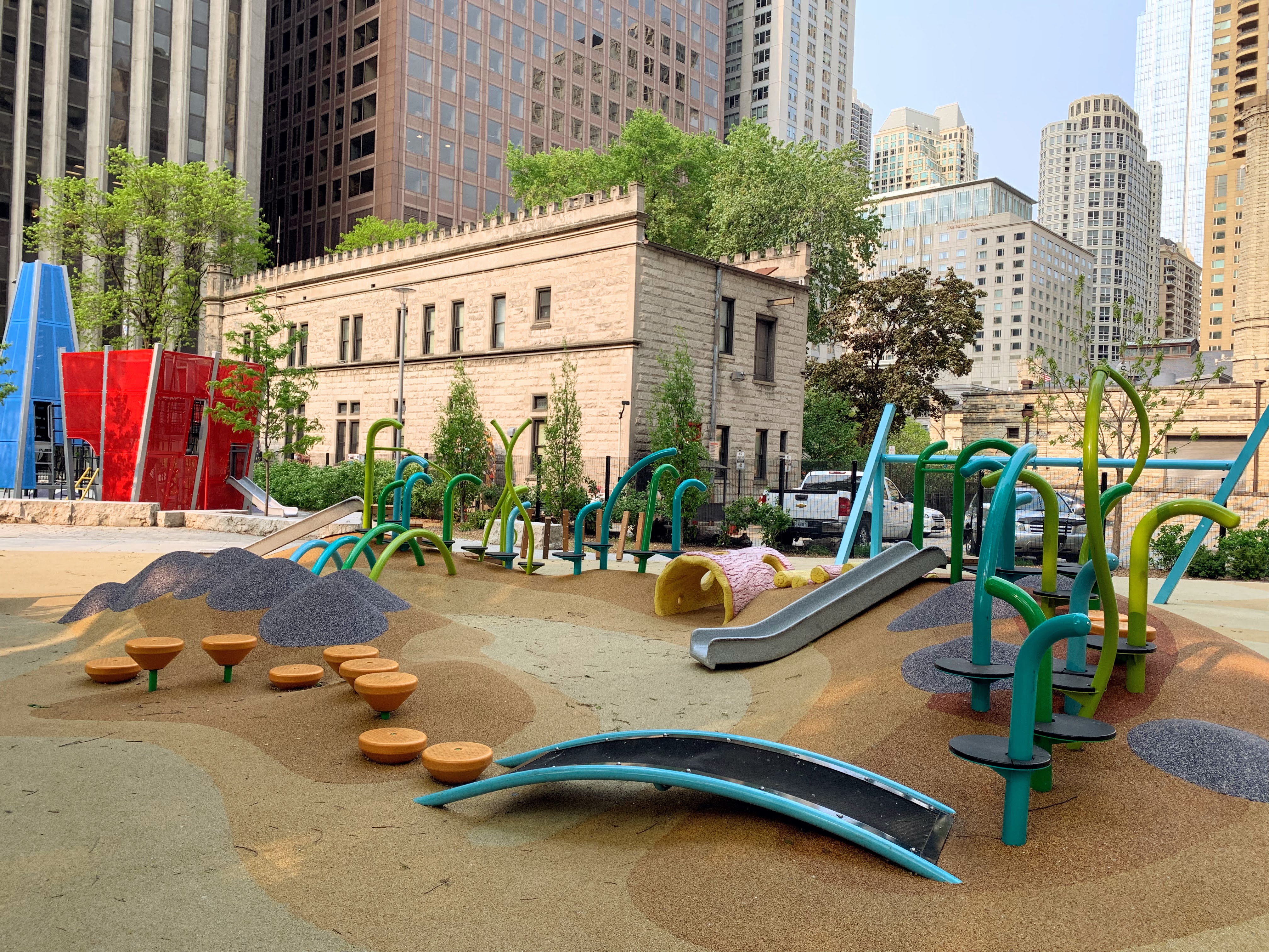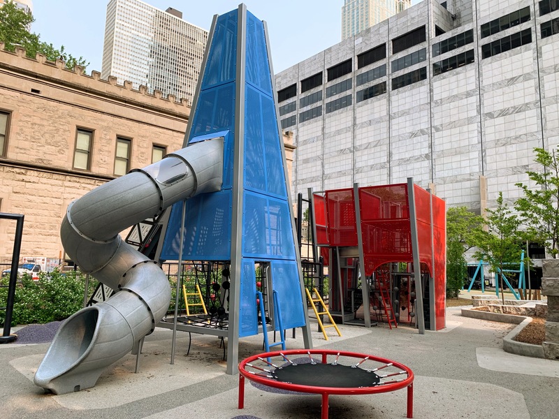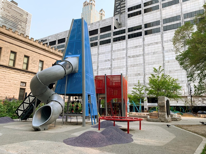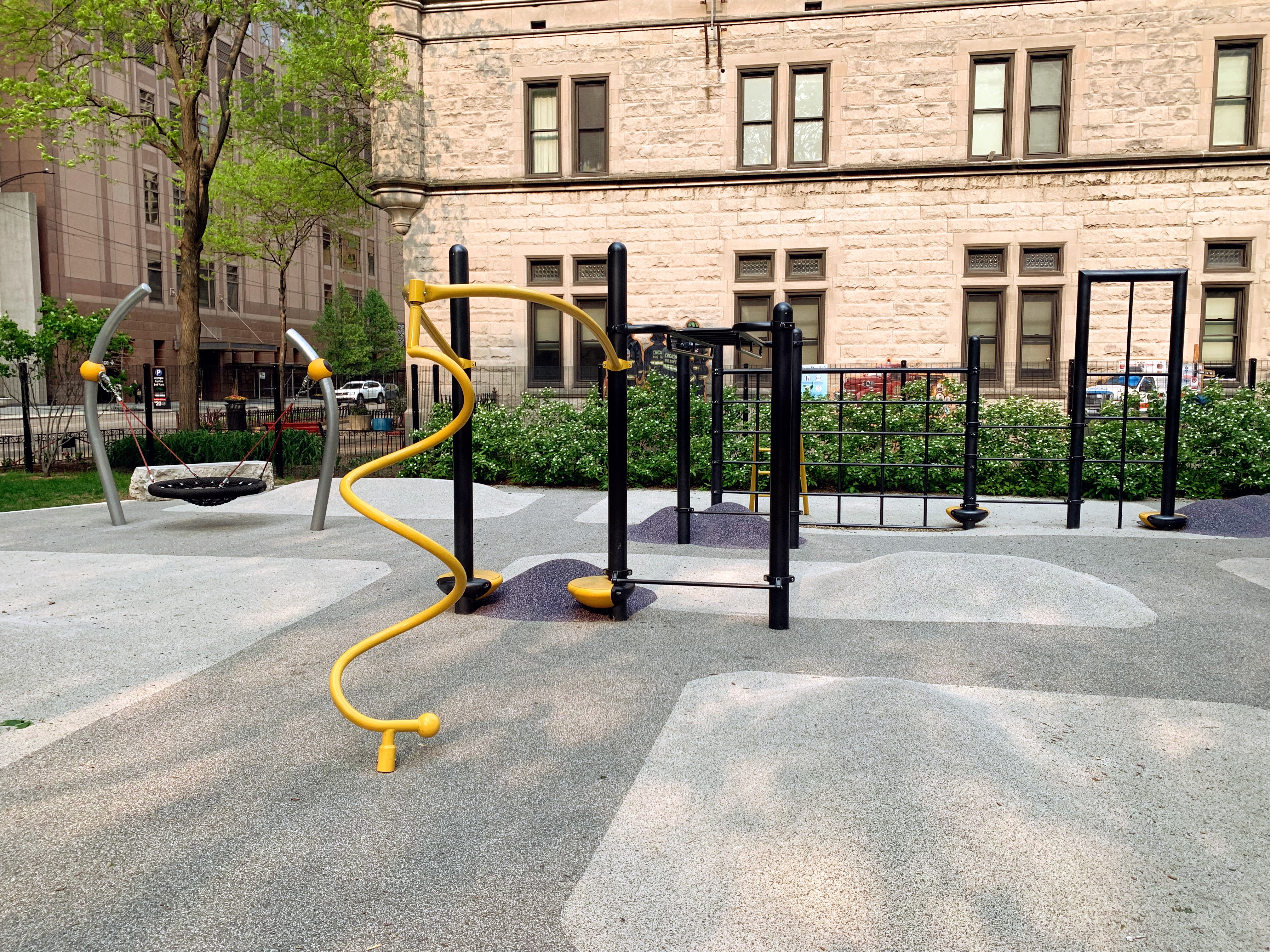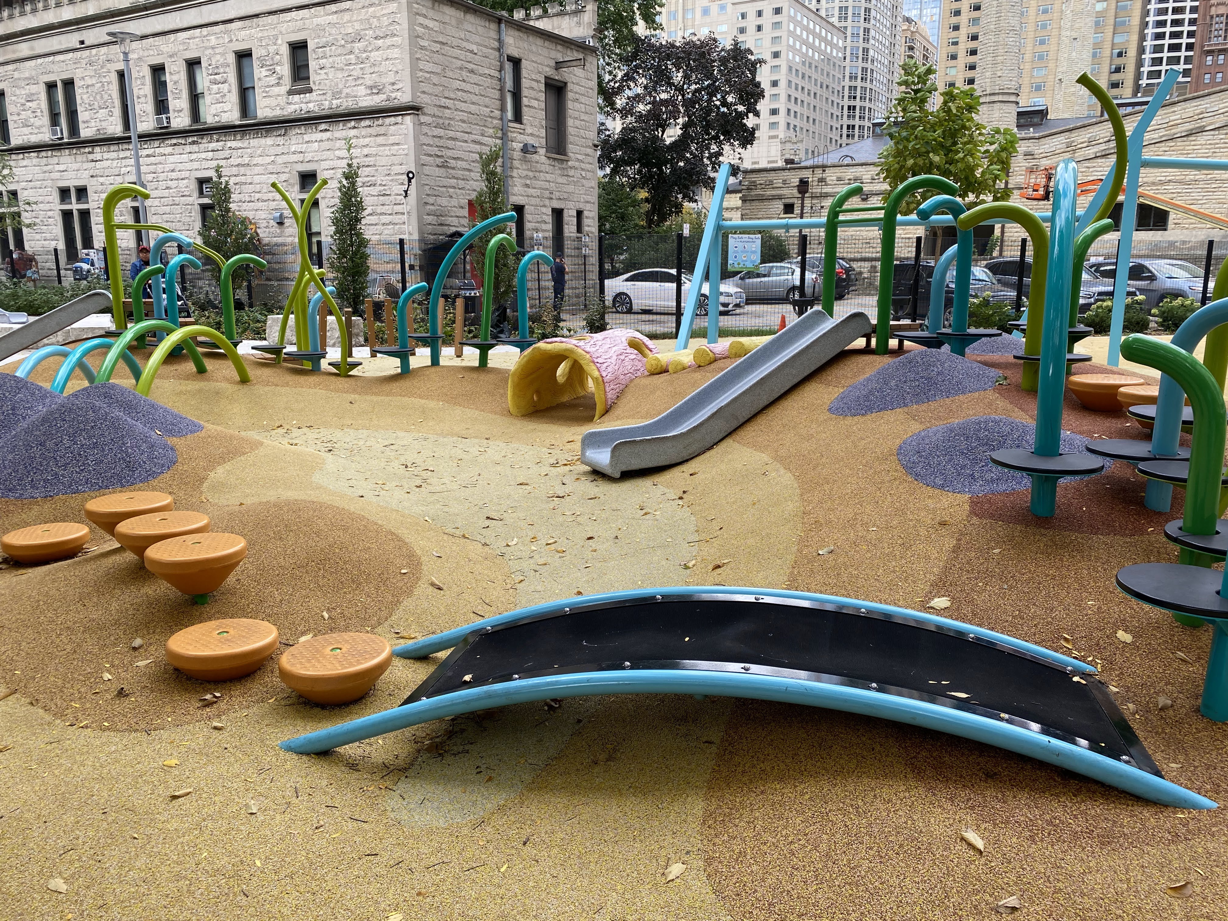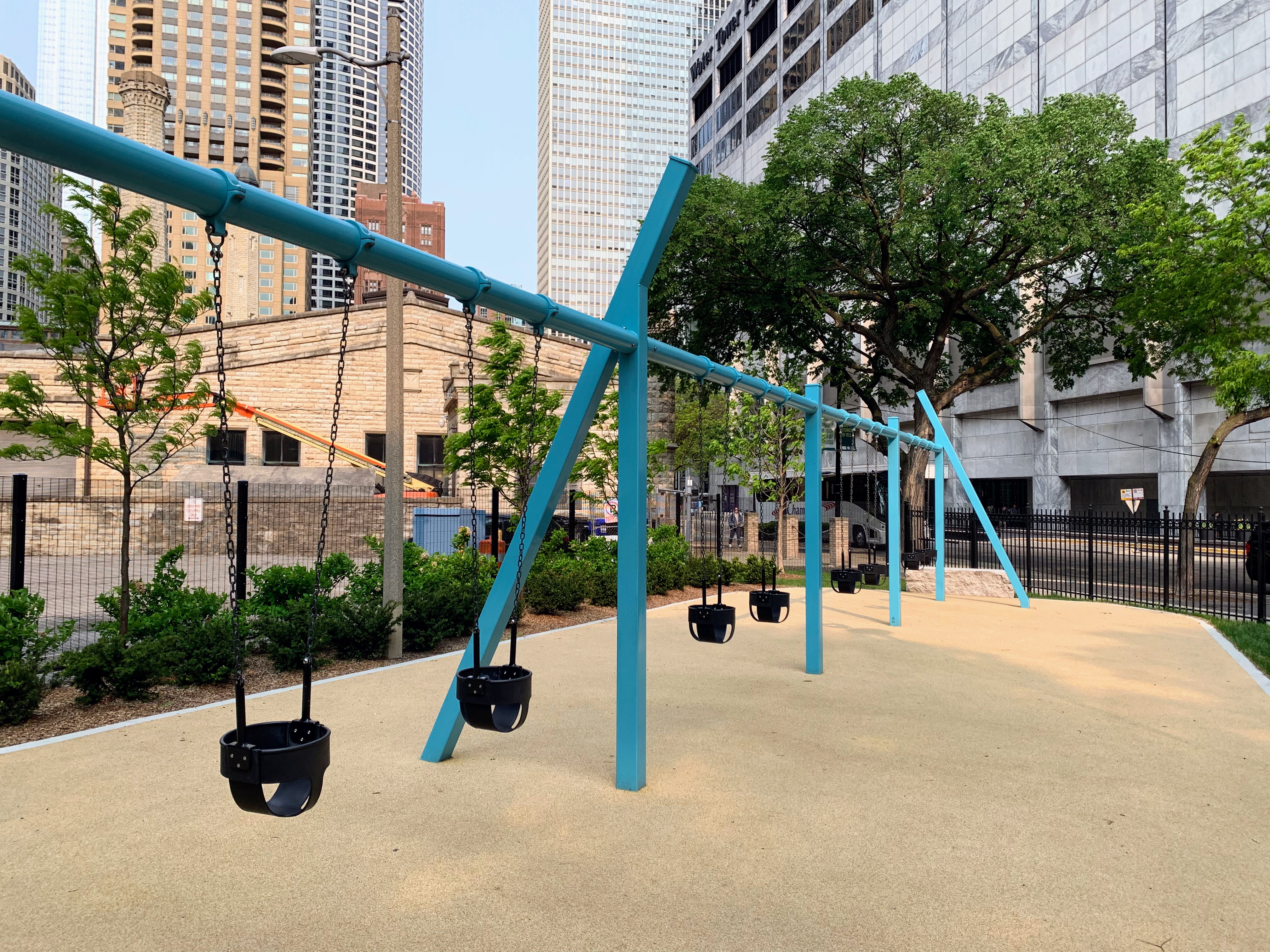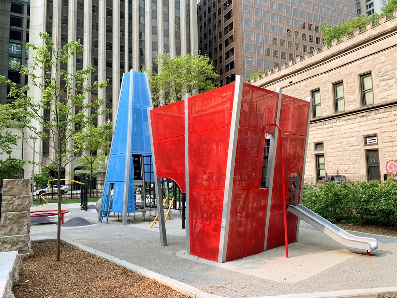 The playground at Seneca Park, named Schulman Playground, is an amazing and unique playspace in Chicago. The current play structures were installed in May of 2021 and they reflect a modern and contemporary feel - coincidental with the location near the Museum of Contemporary Art.
