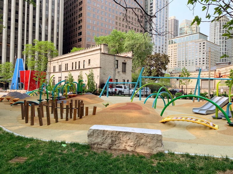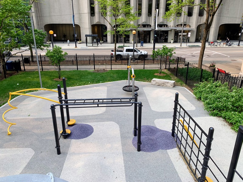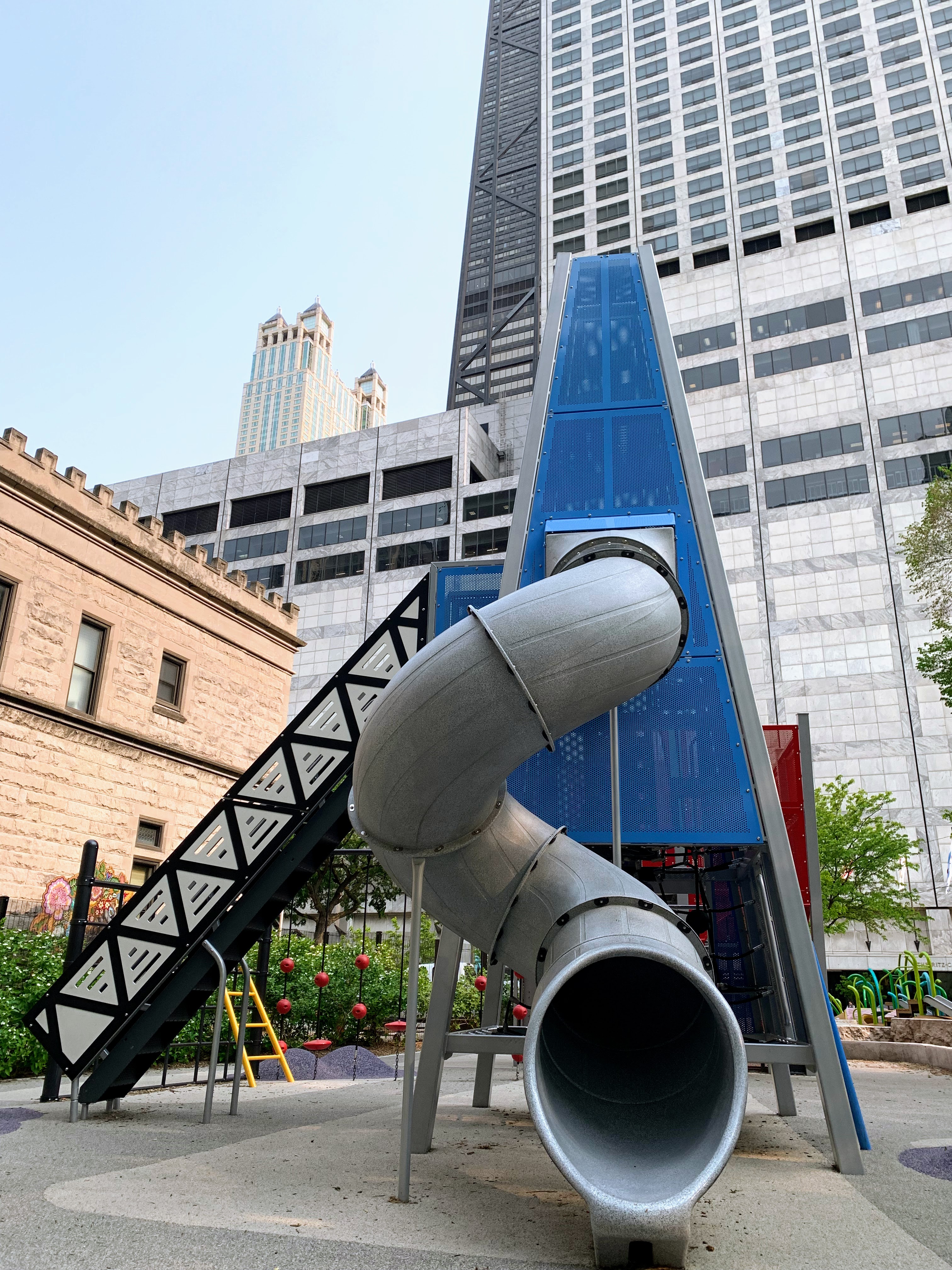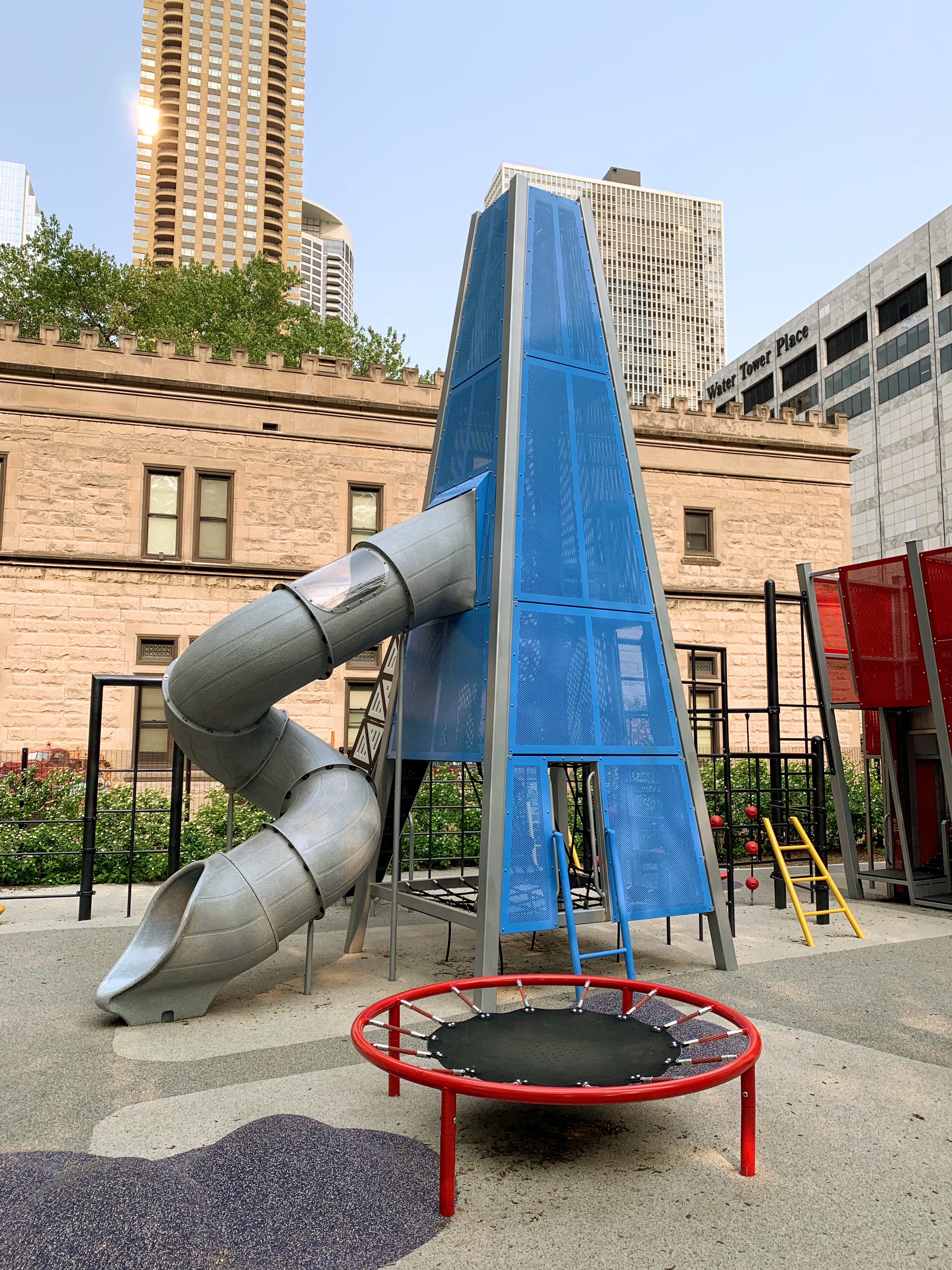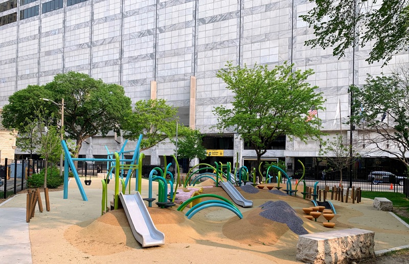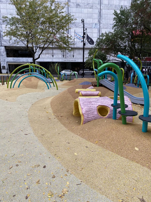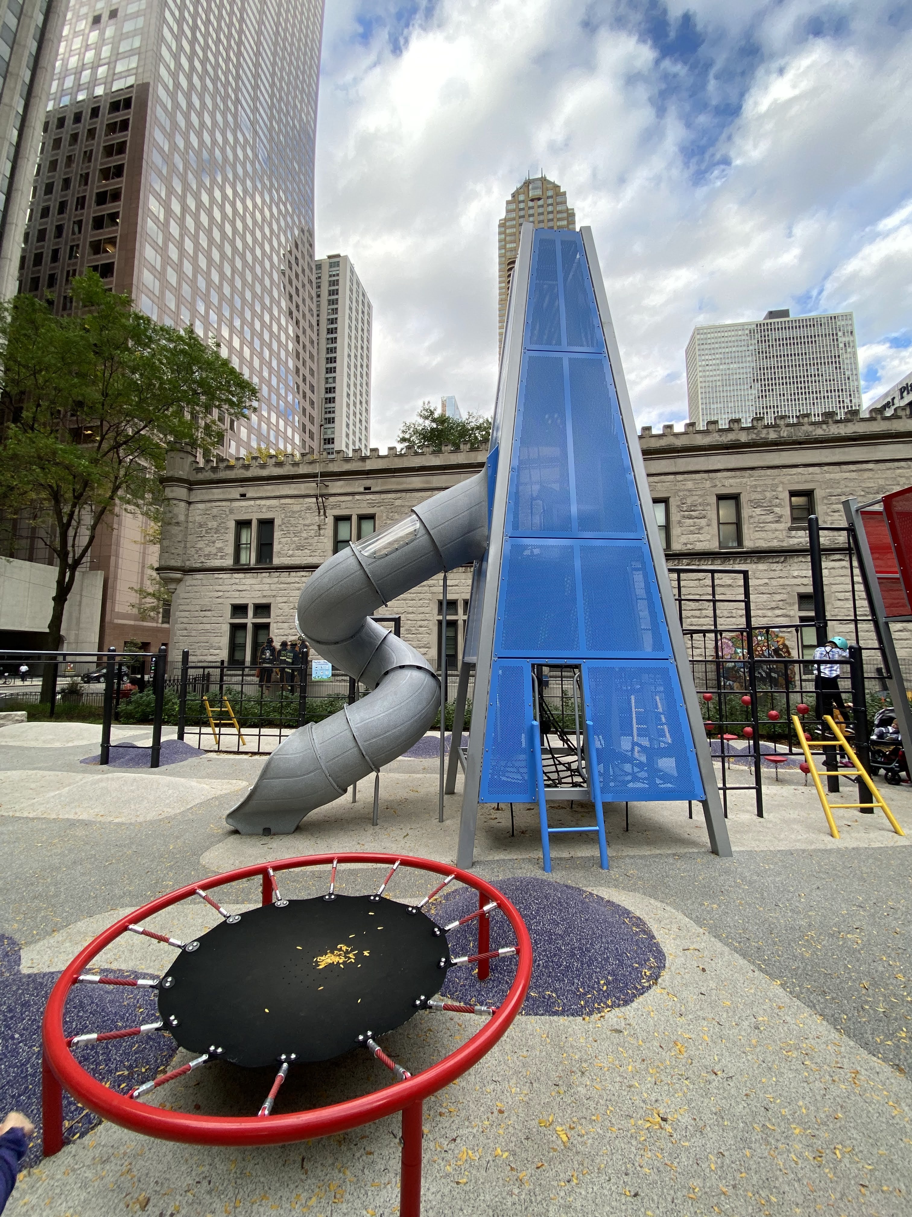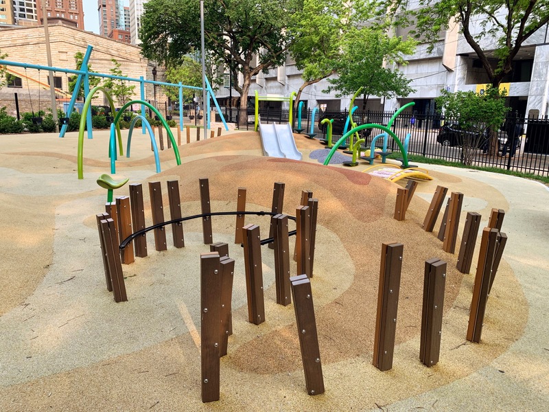 The playground at Seneca Park, named Schulman Playground, is an amazing and unique playspace in Chicago. The current play structures were installed in May of 2021 and they reflect a modern and contemporary feel - coincidental with the location near the Museum of Contemporary Art.
