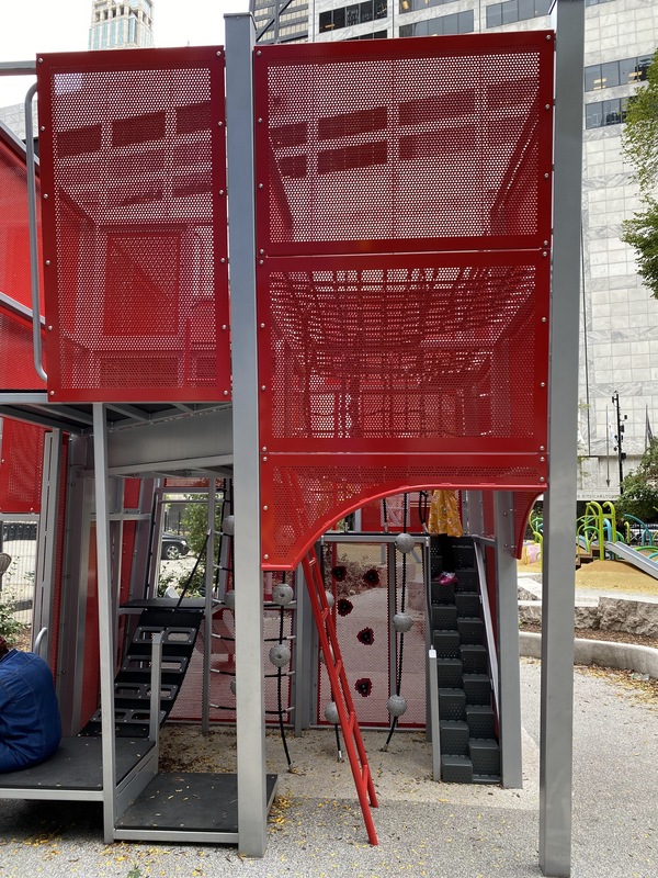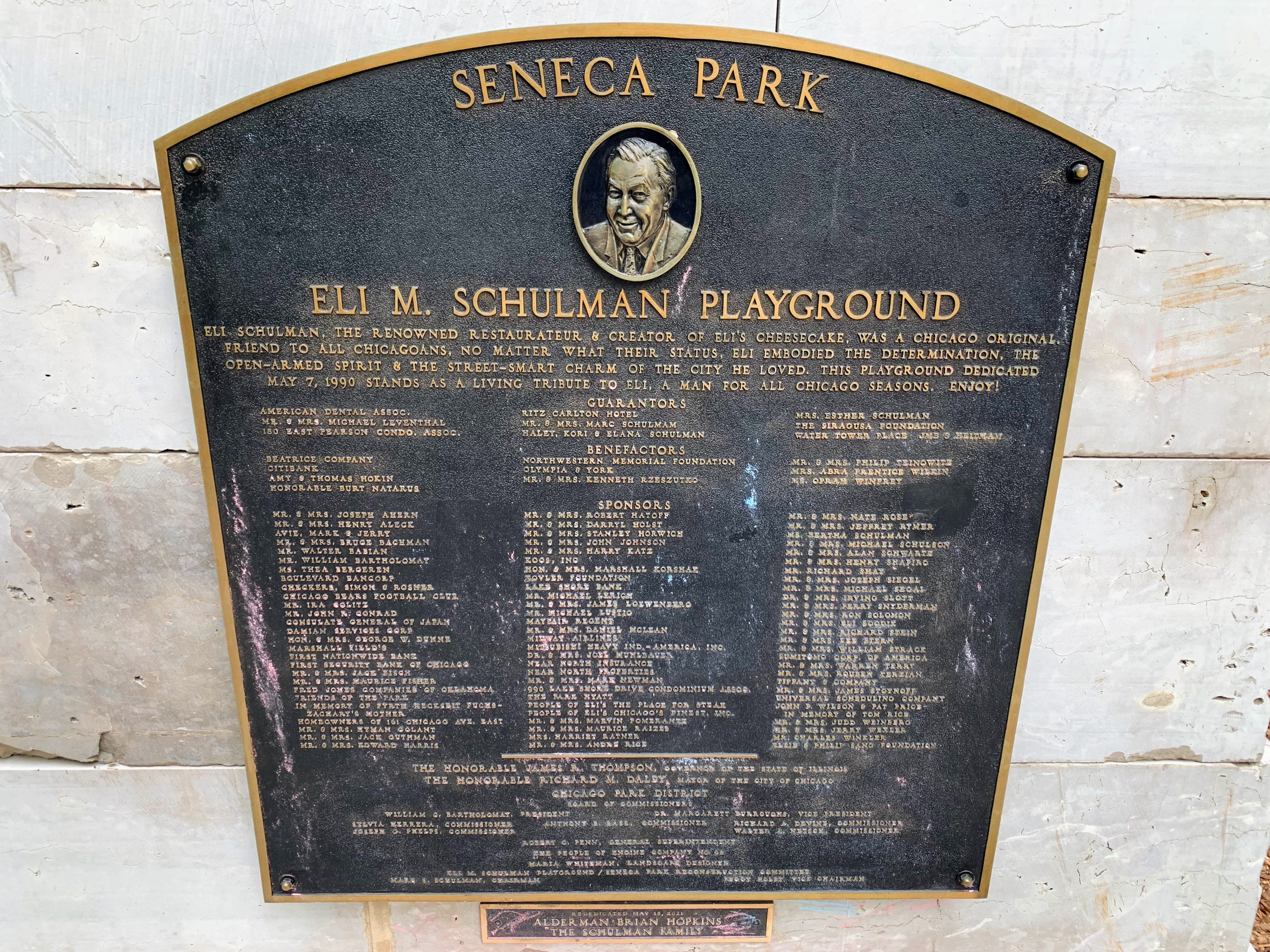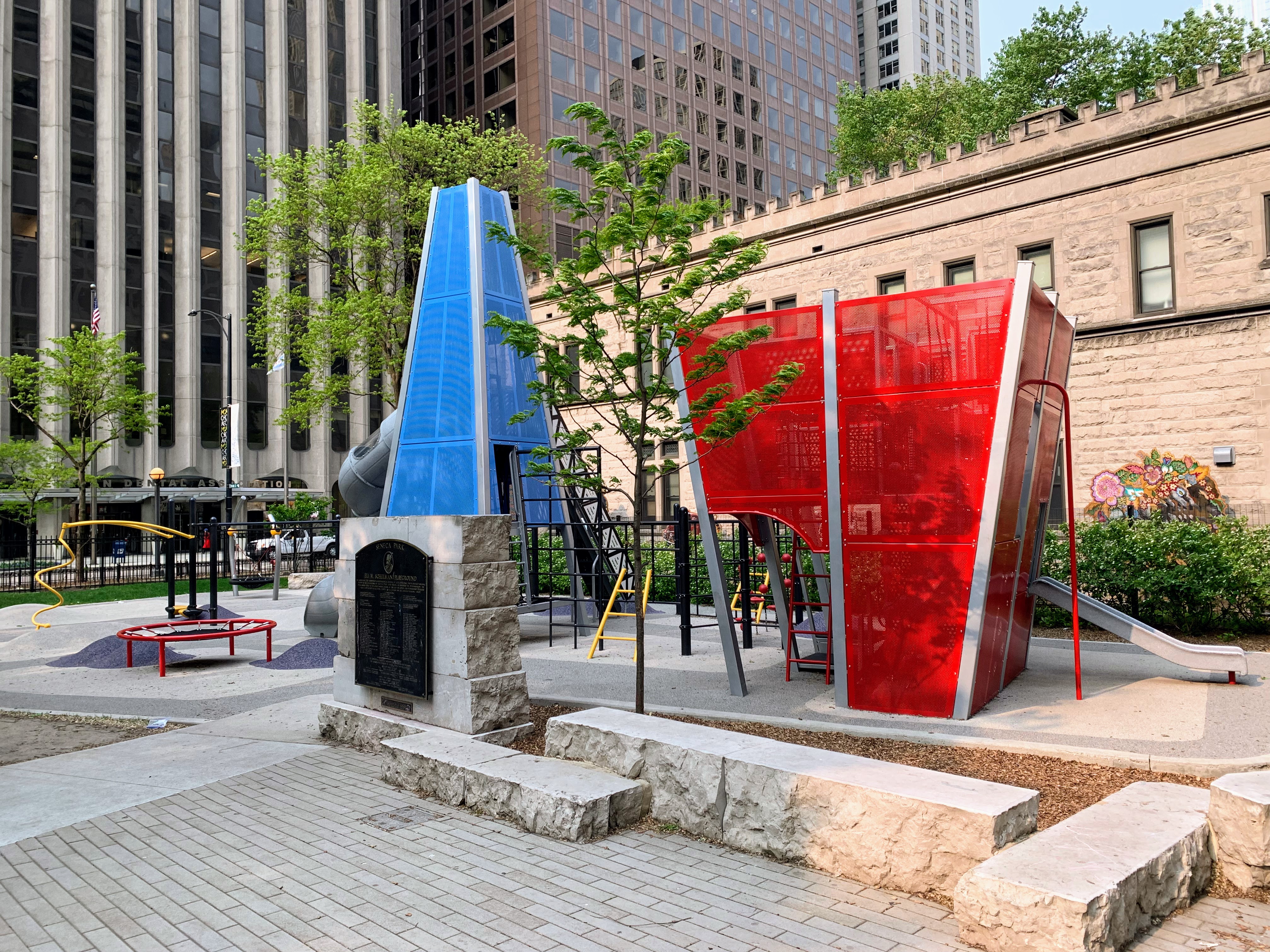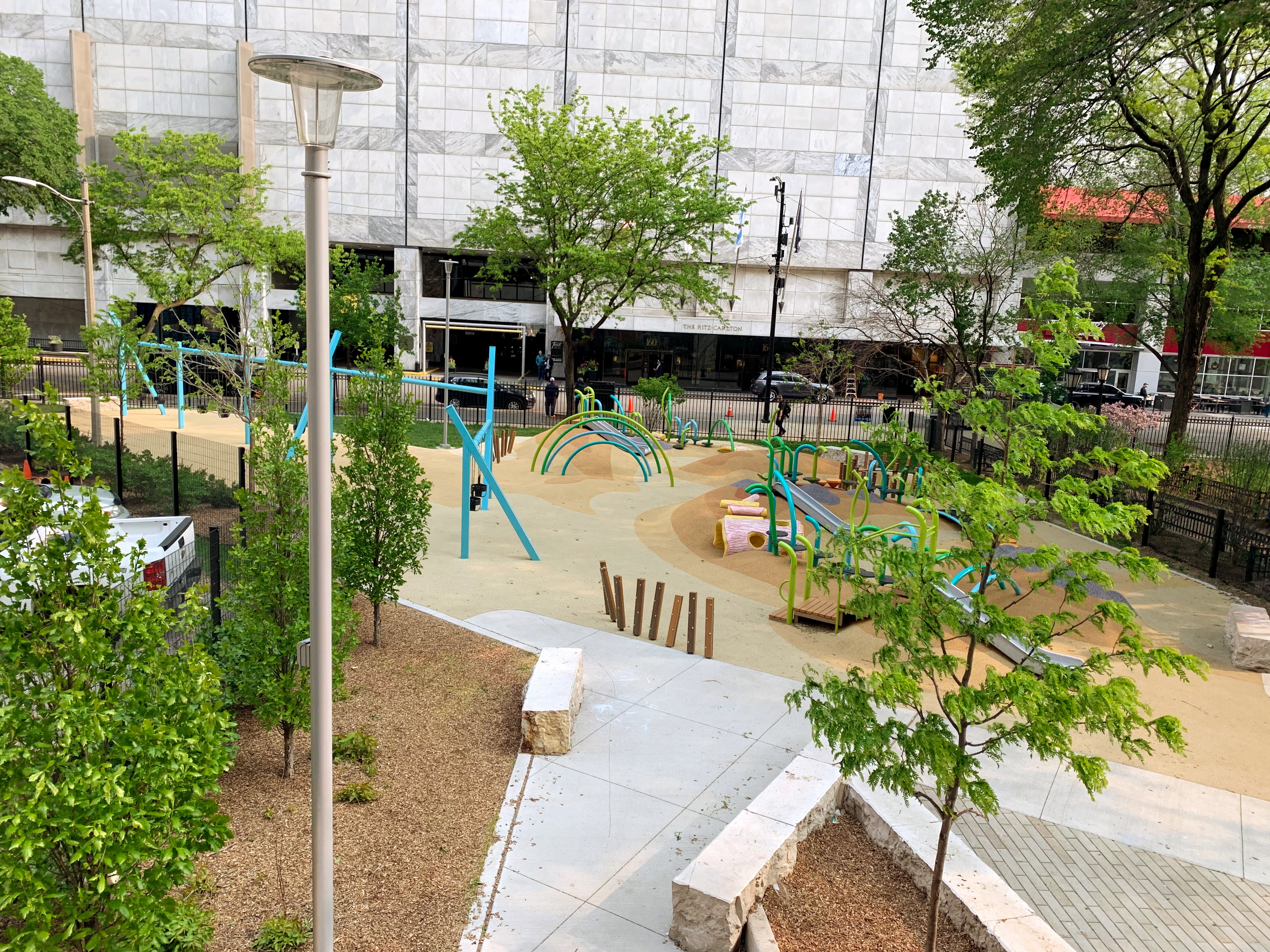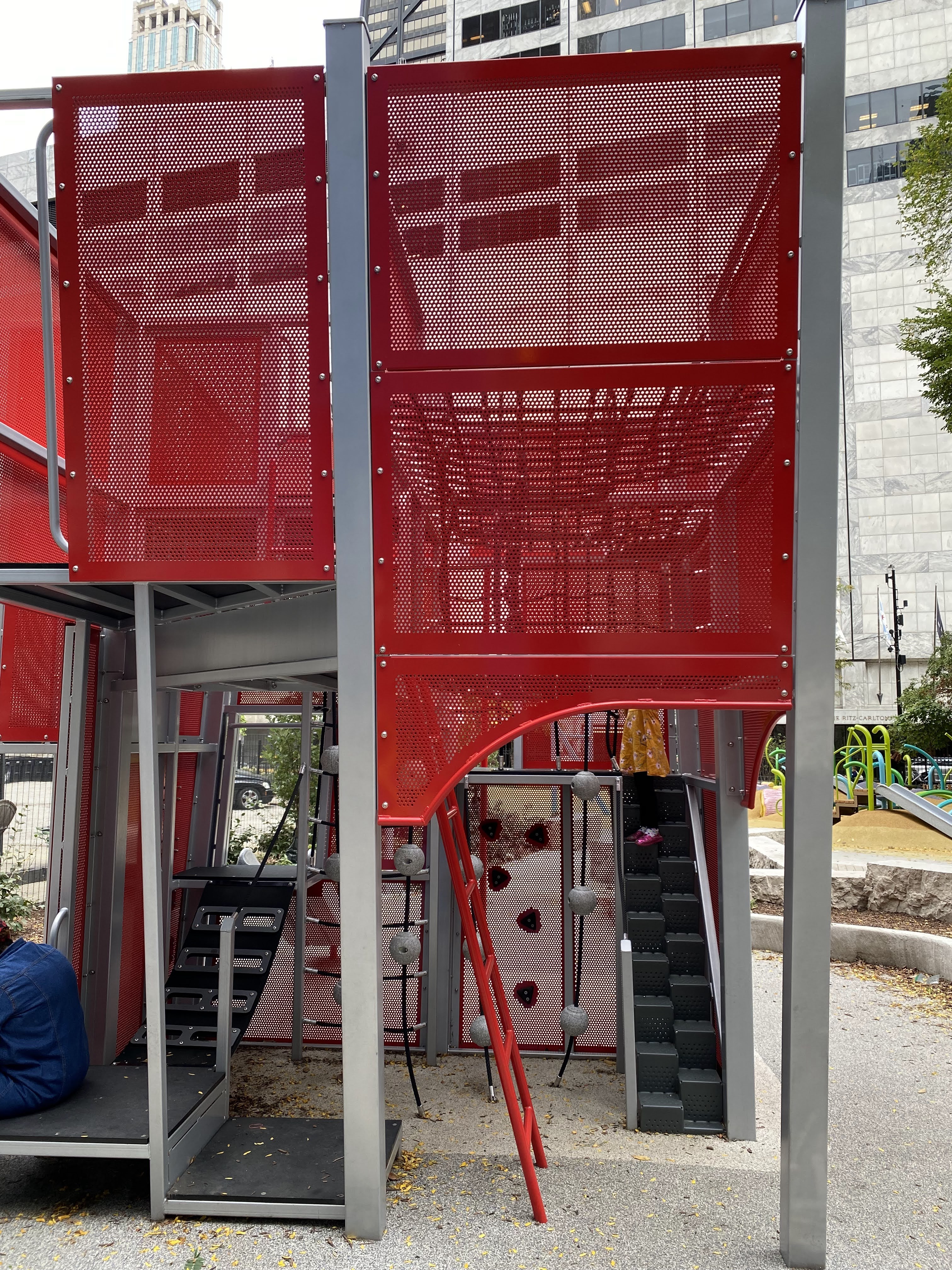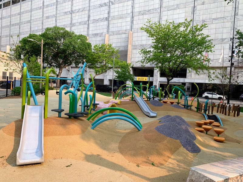 The playground at Seneca Park, named Schulman Playground, is an amazing and unique playspace in Chicago. The current play structures were installed in May of 2021 and they reflect a modern and contemporary feel - coincidental with the location near the Museum of Contemporary Art.