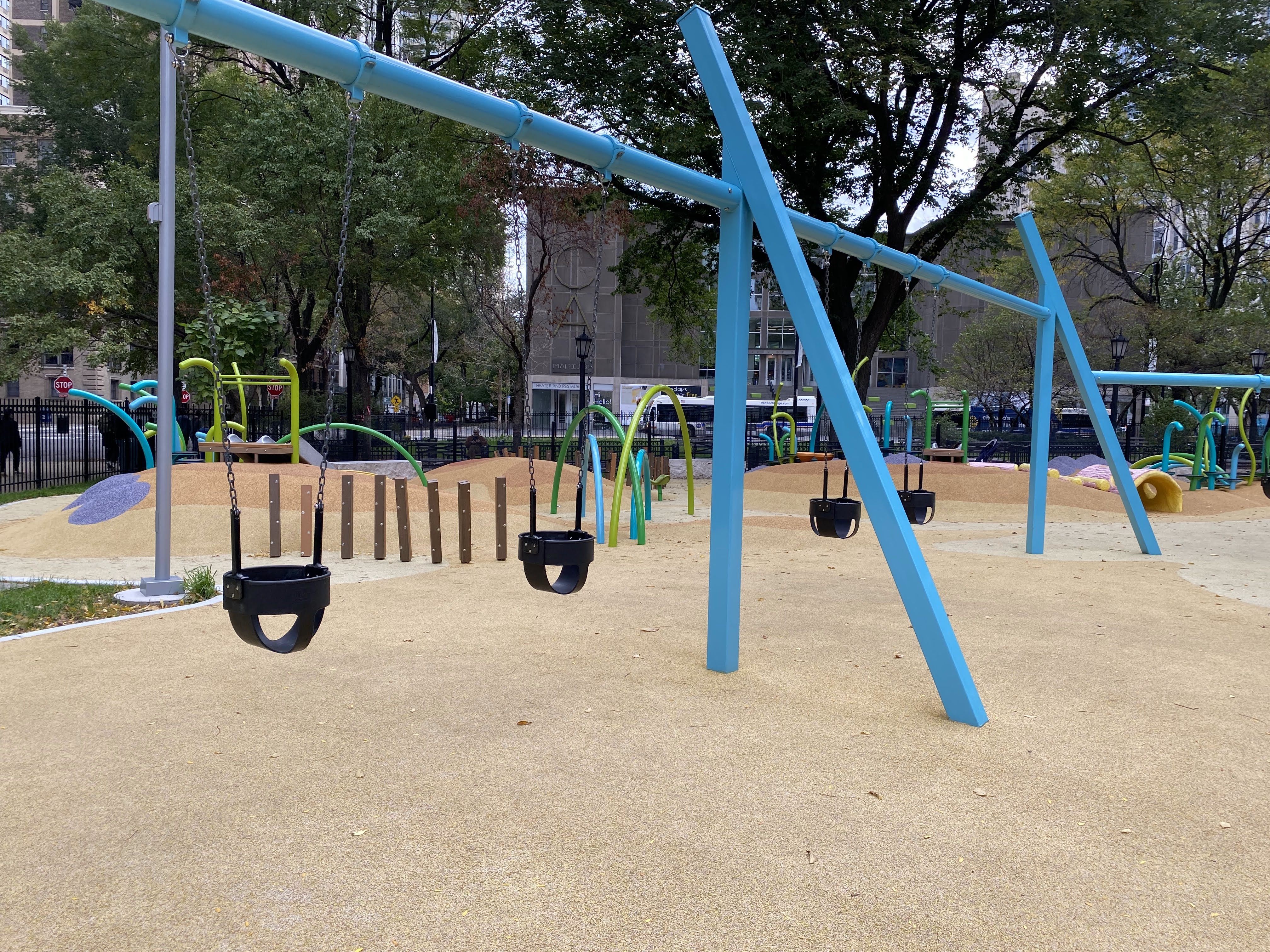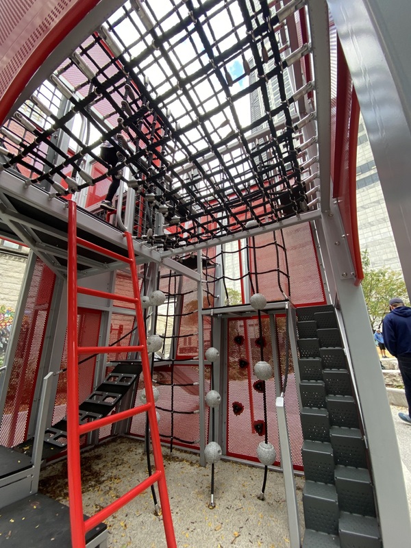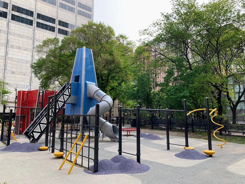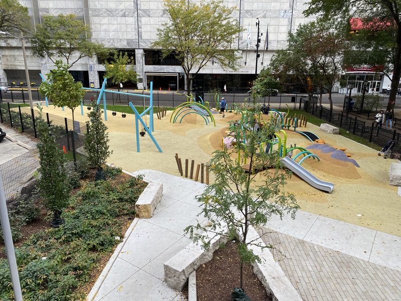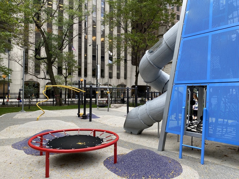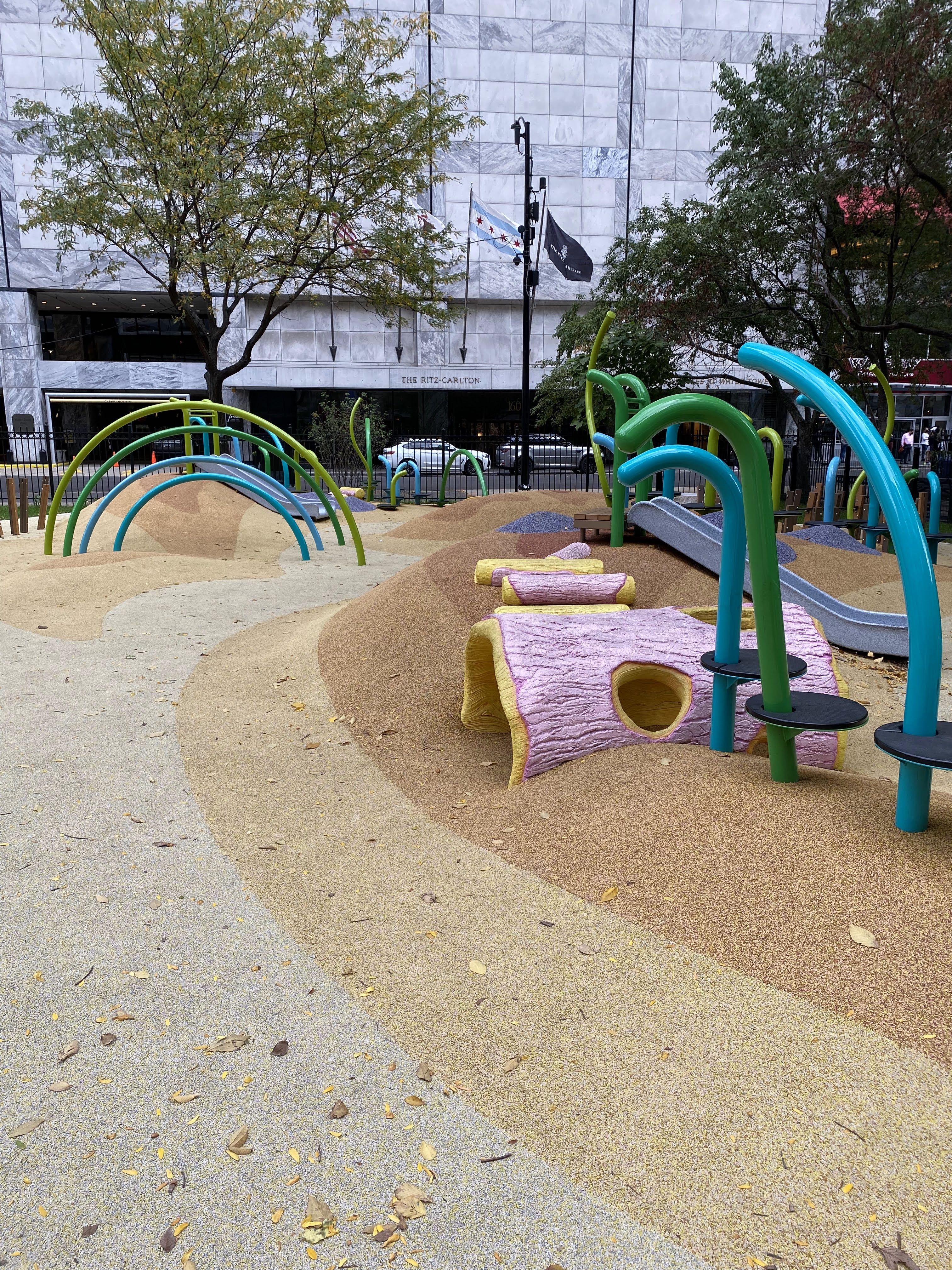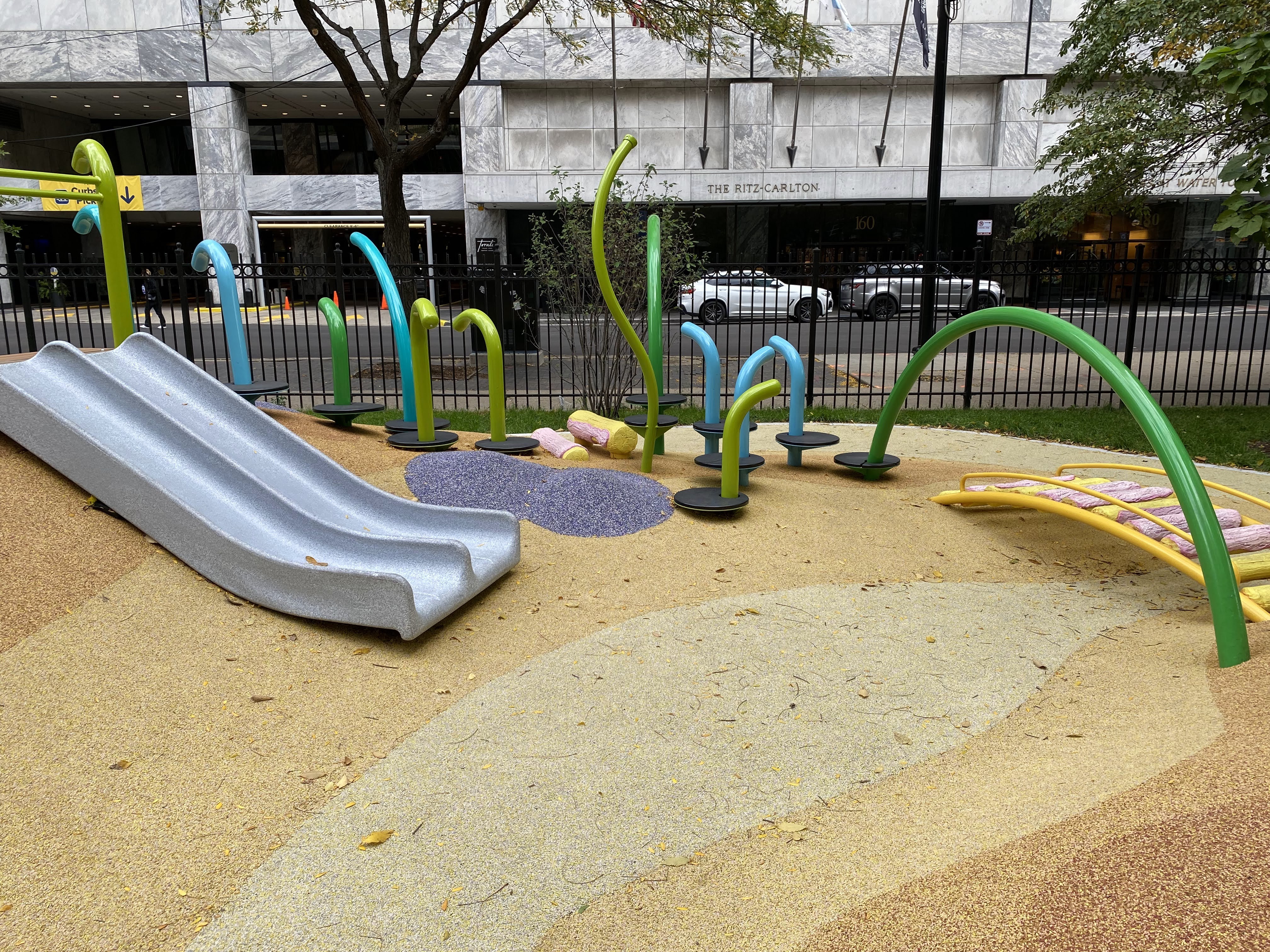 The play area is fully enclosed and the main play surface is soft rubber. There are a few large stones designed to be used as benches throughout the space. Although shaded by neighboring skyscrapers, the play area itself isn't shaded by trees and can be bright and sunny. This is a great playground and definitely a destination. - Playground Features