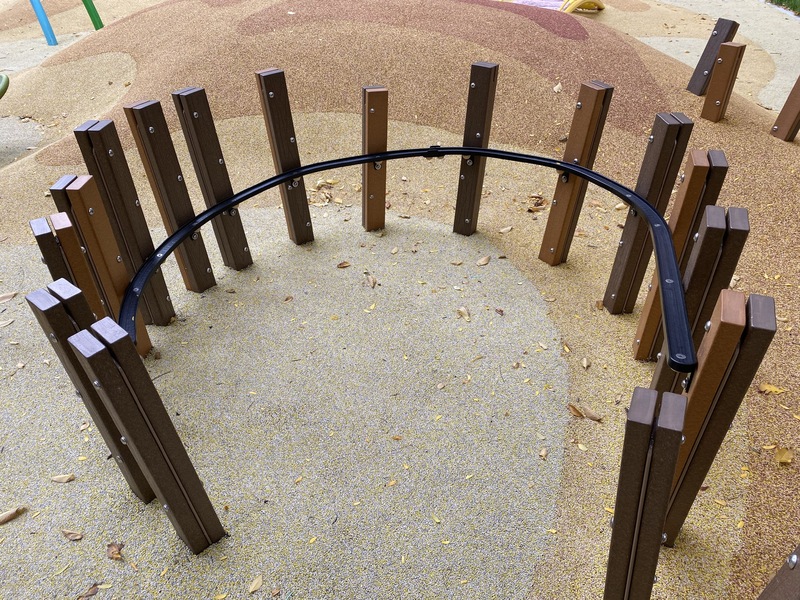 The fully enclosed play area features soft rubber surface that is molded and sculpted to be an actual play element in places and uses colors to divide the space into two halves. The northern half is designed for younger children but does not feature any single play structure but instead embeds elements directly into the surface. Slides, bridges, and a variety of steps are set low to the ground making them accessible to most and open-ended. There is also a set of the traditional toddler swings in this area.