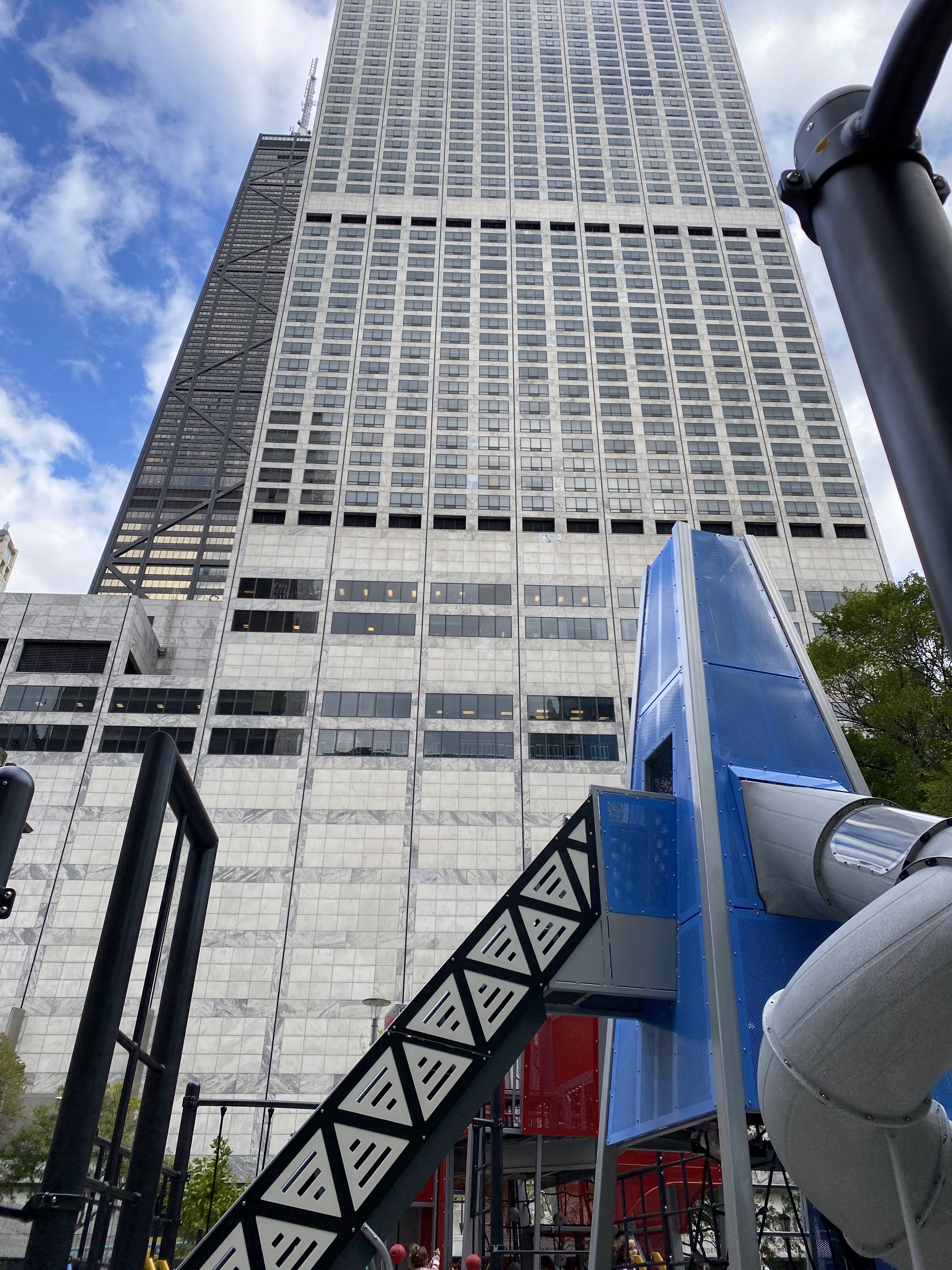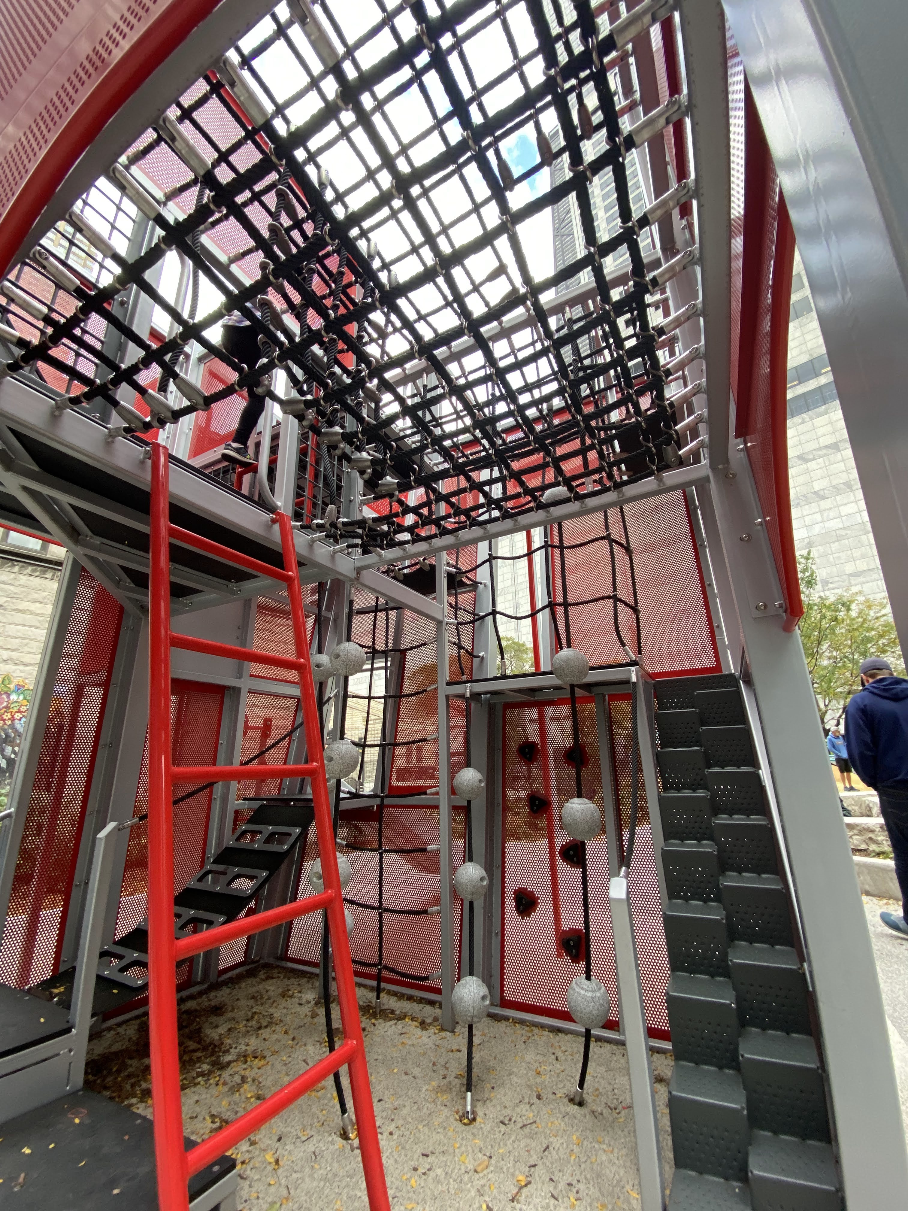 The other half of the play area features unique and custom play structures designed for older children. The structures appear to reflect nearby structures - a fire station and the John Hancock building - and are somewhat enclosed spaces with a variety of climbing elements and a large tube slide. The enclosed nature sometimes makes tracking your children difficult - especially in a busy playground - but makes for a wonderful experience of discovery and surprise. There are also some other climbing and traversing elements connected these structures. Finally, there is a standalone hammock style saucer swing and a trampoline element on this side of the play area.