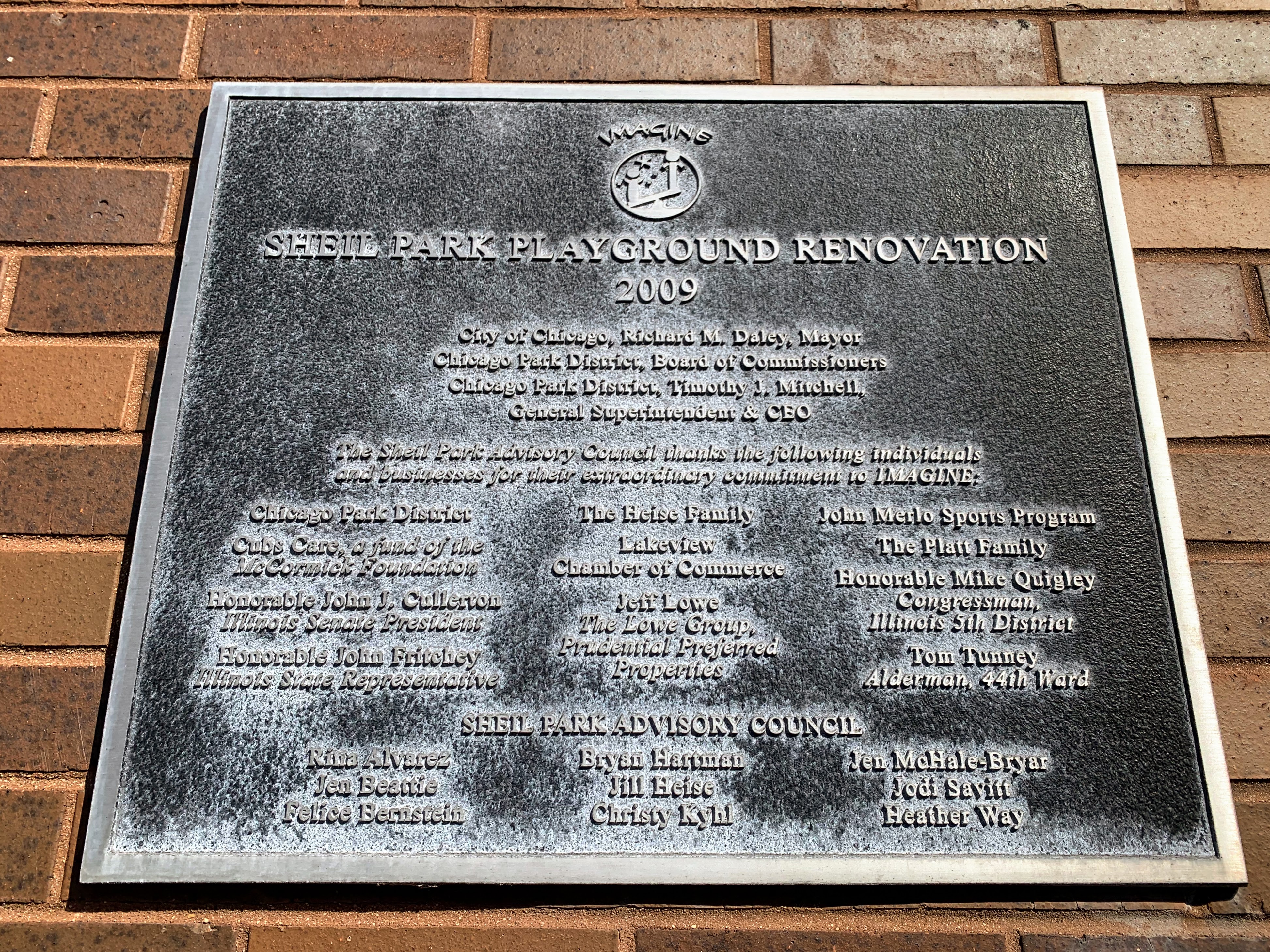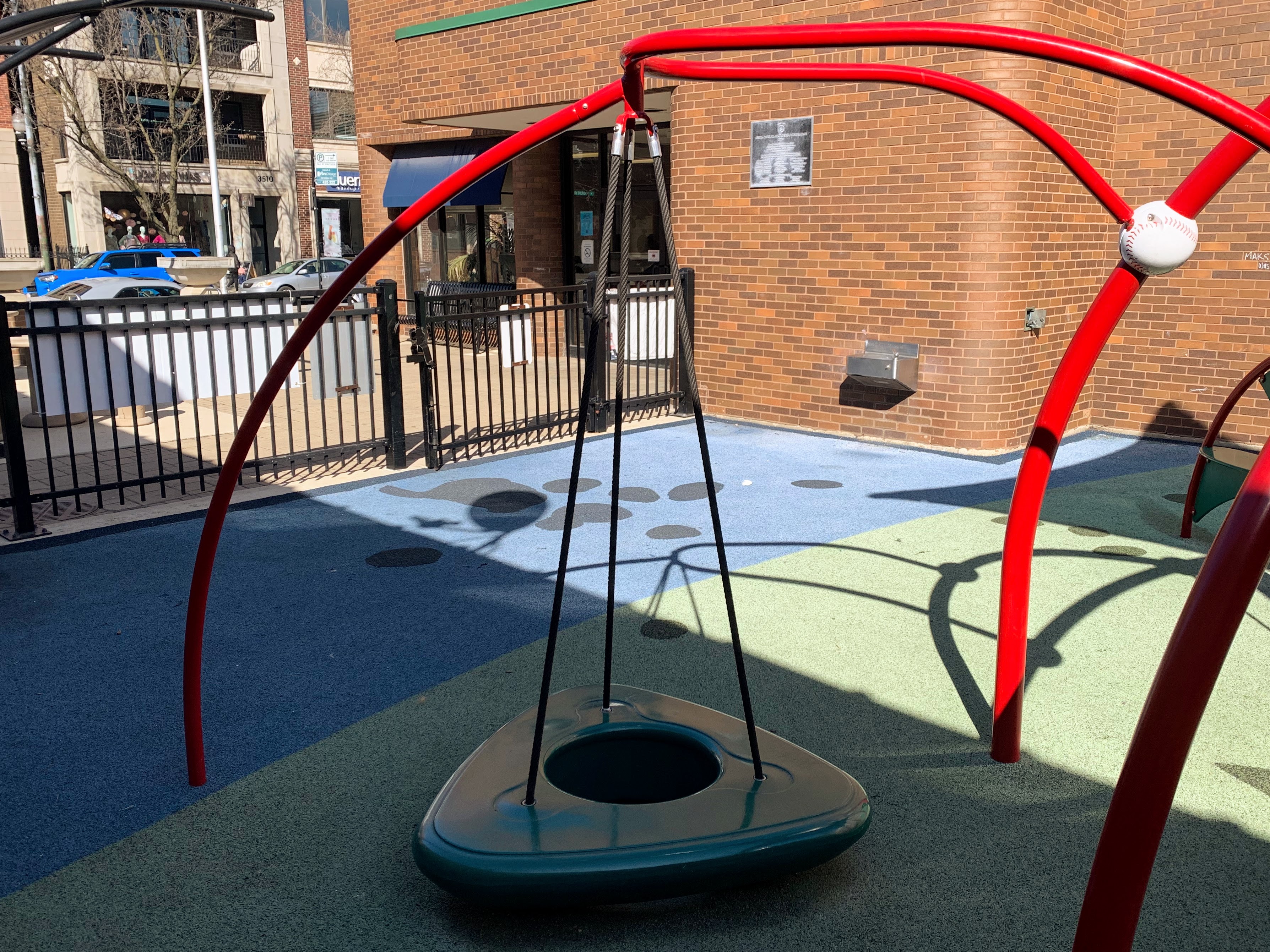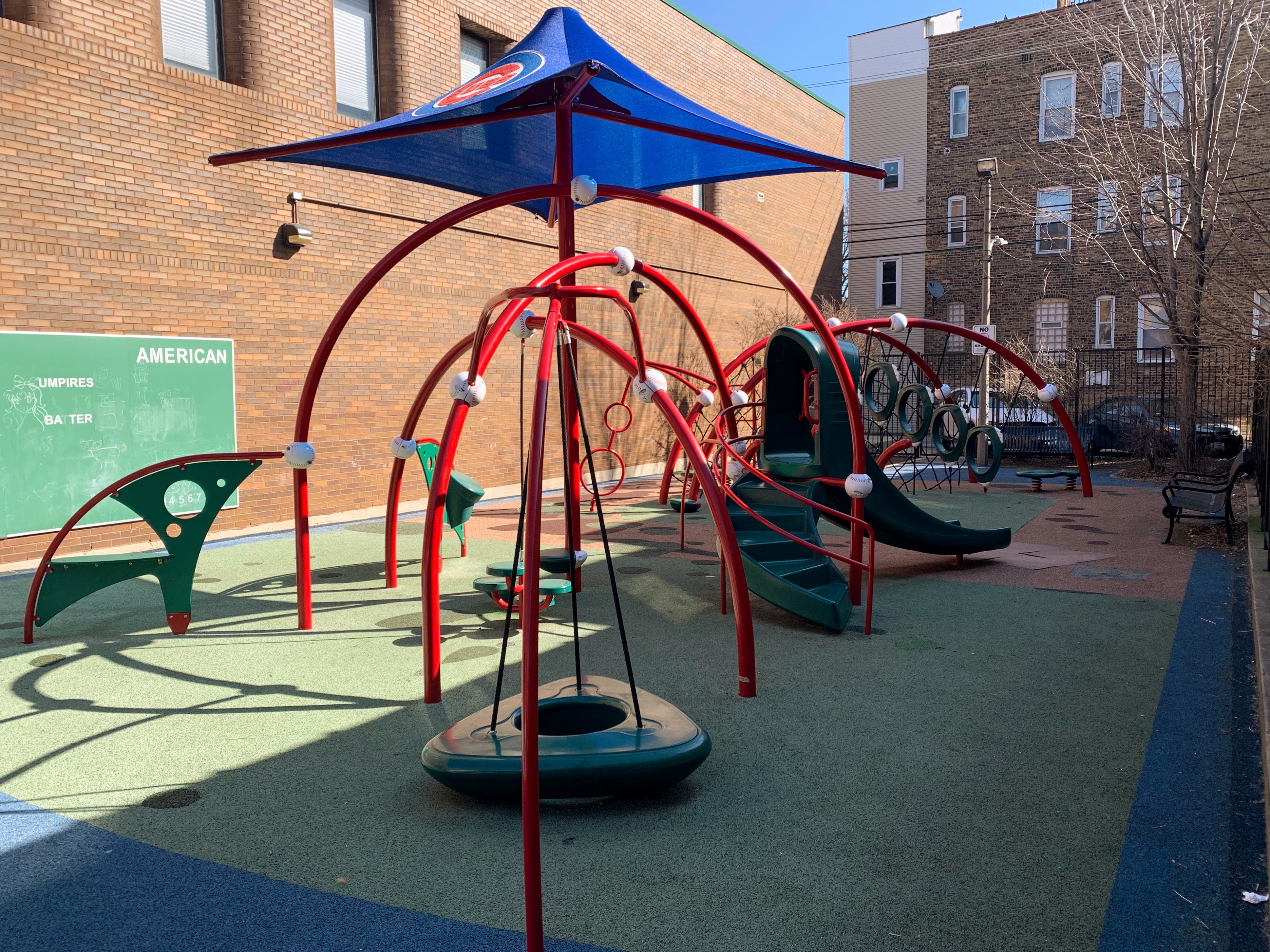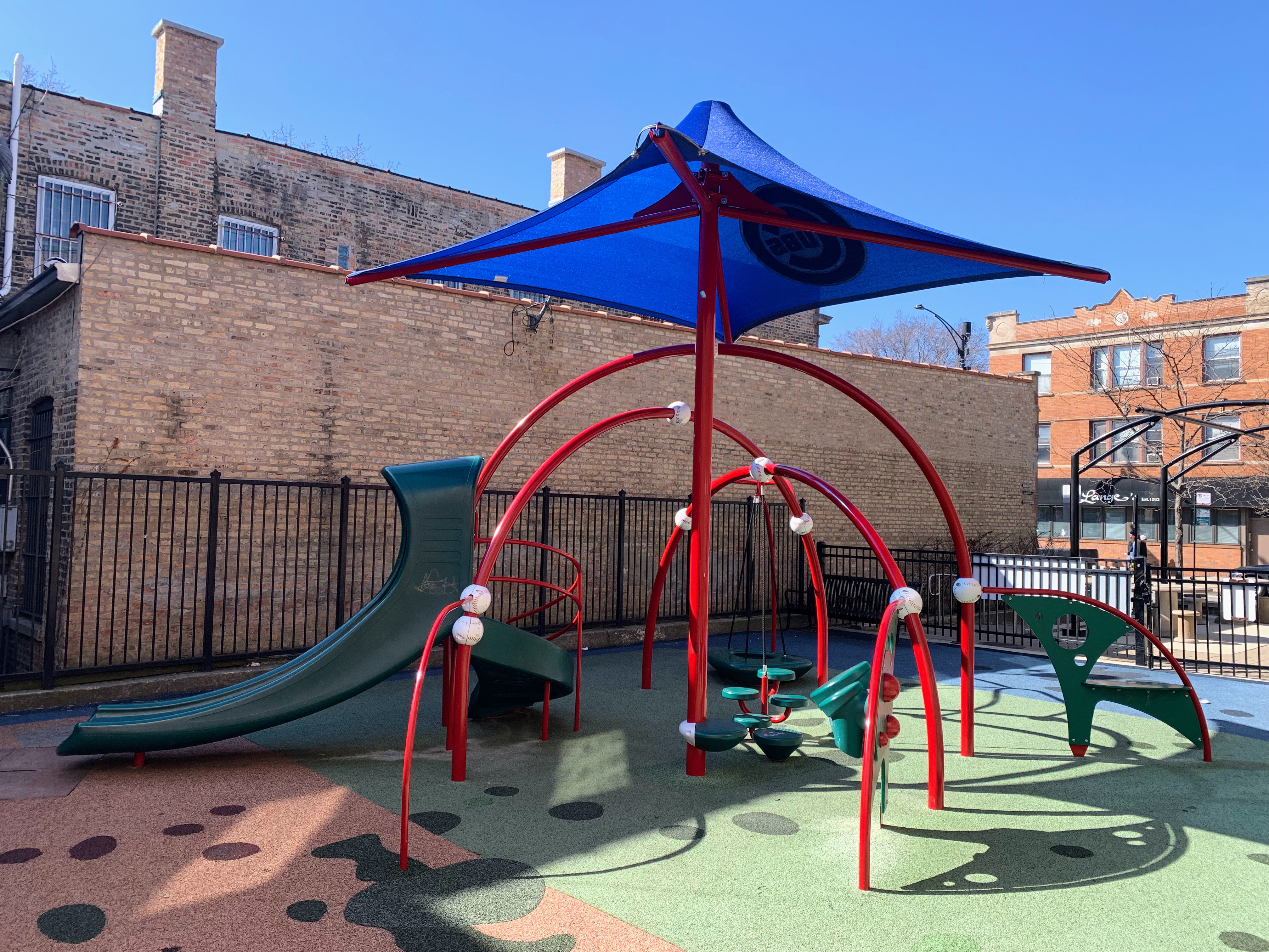 - Sheil Playground is a tiny playground on the busy Southport corridor with a strong baseball theme that features the Cubs logo and a chalkboard replica of the iconic green scoreboard. A new playground - consisting primarily of large, red metal arches - provides climbing structures as well as a smaller area for younger children. The play area is completely enclosed and features several benches and picnic tables.
