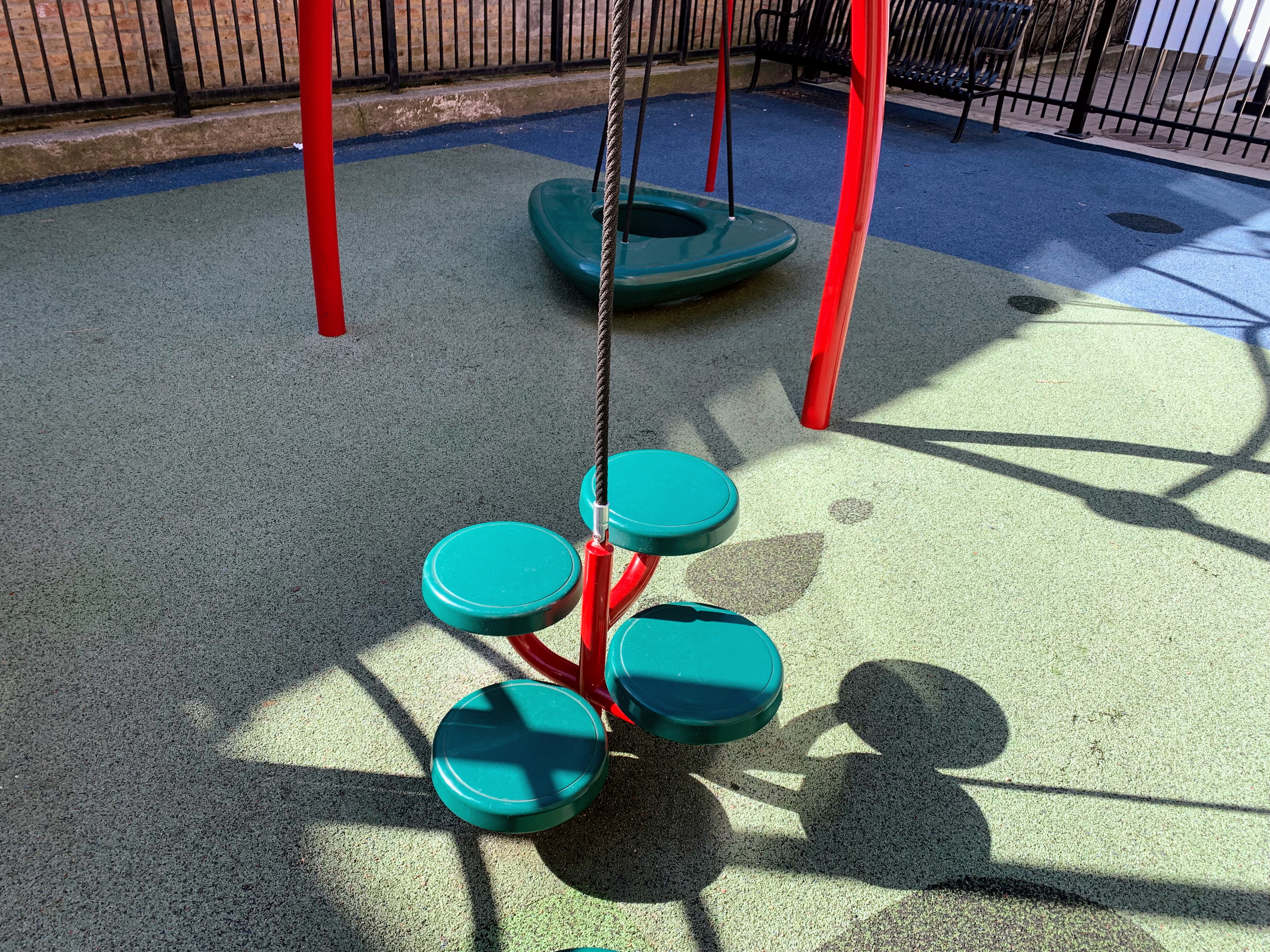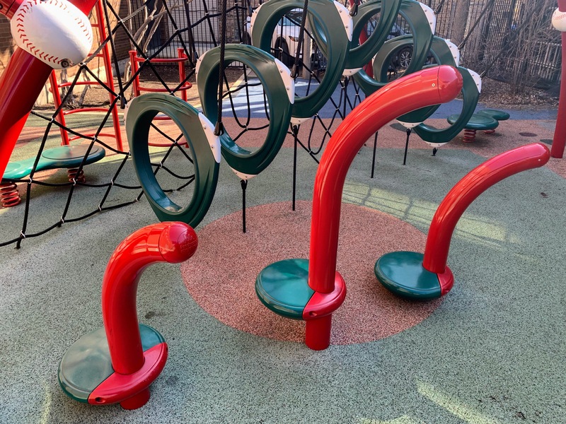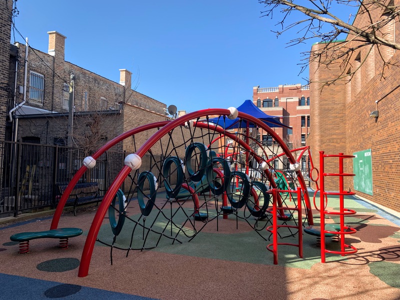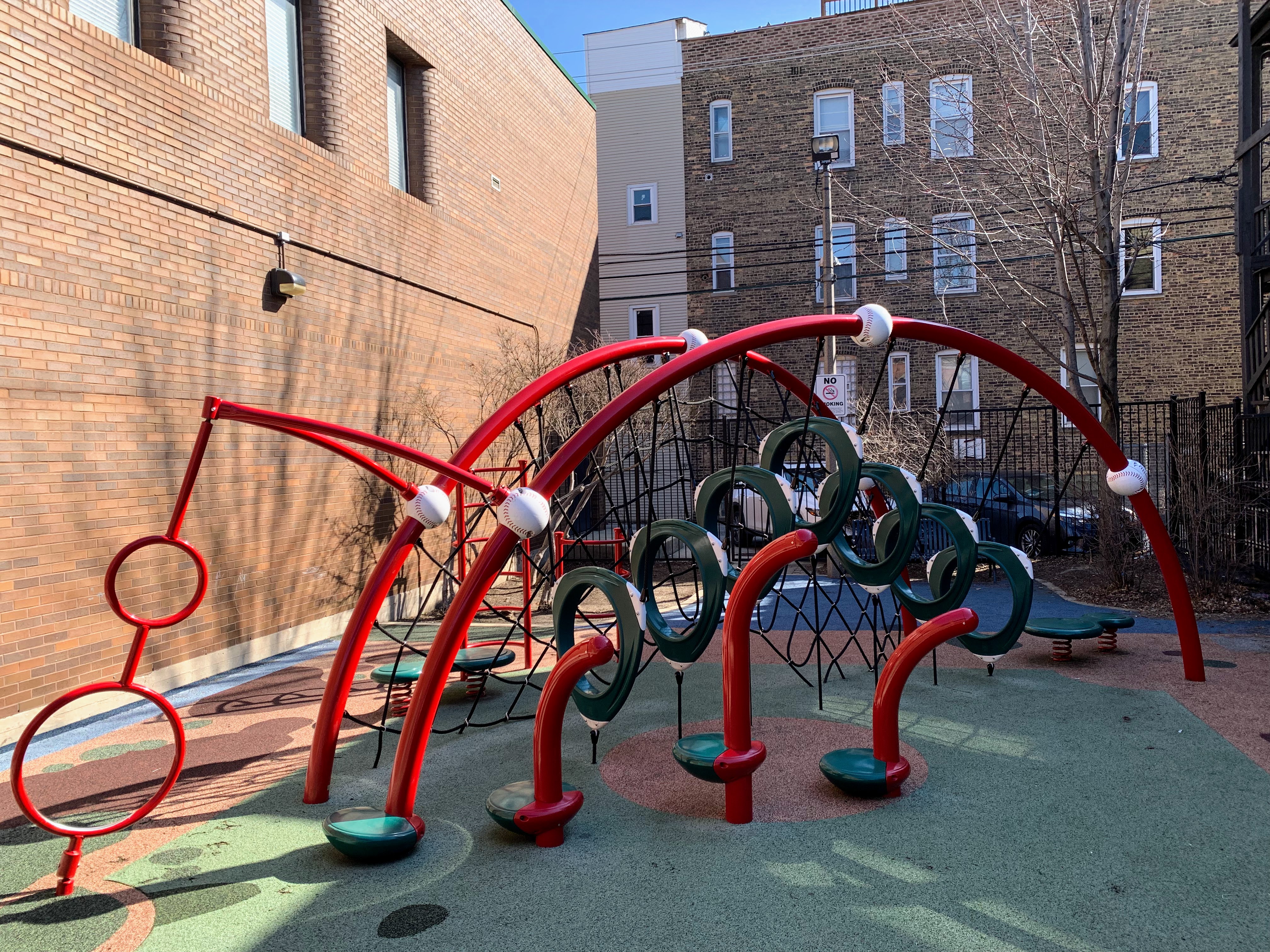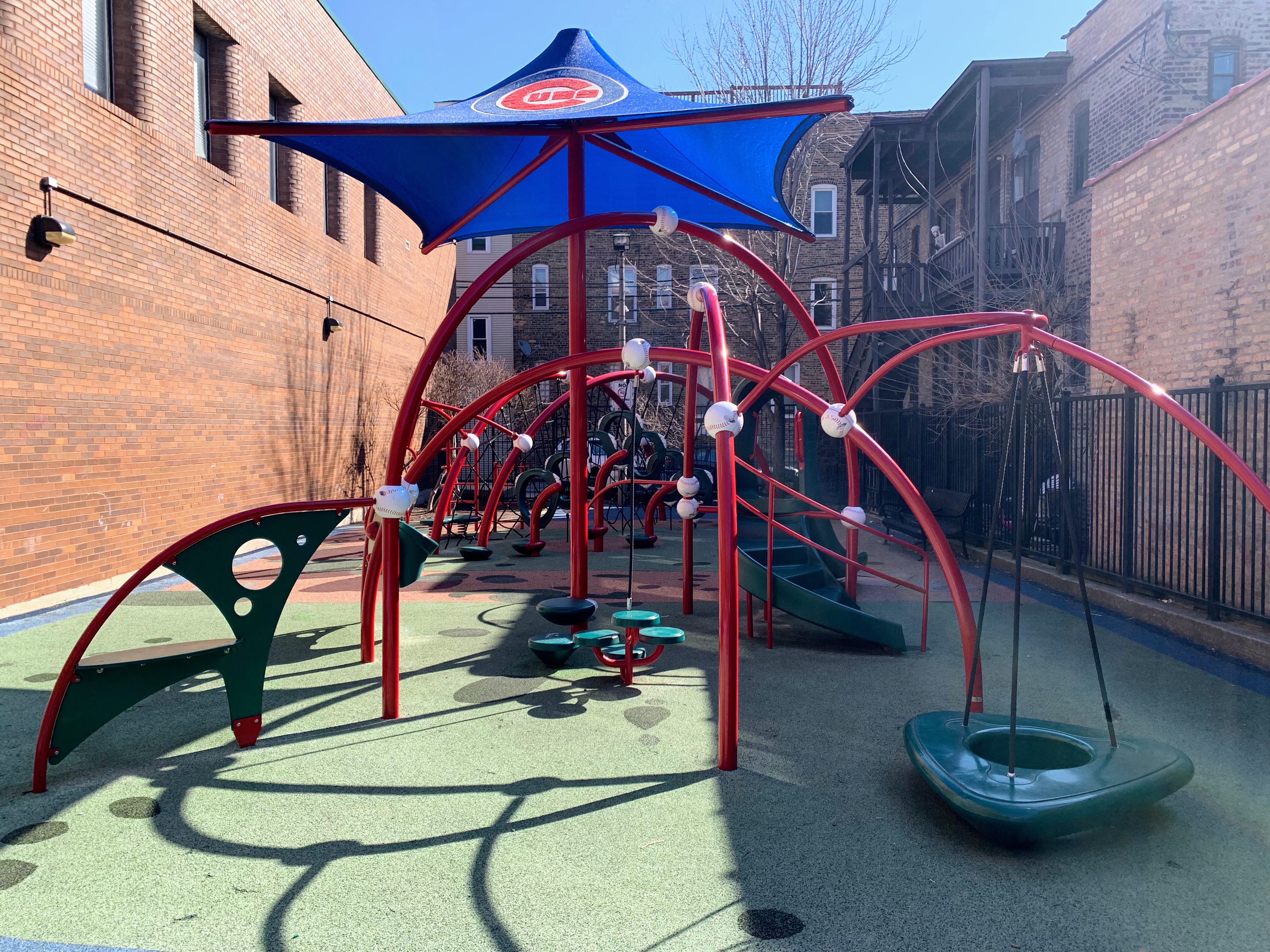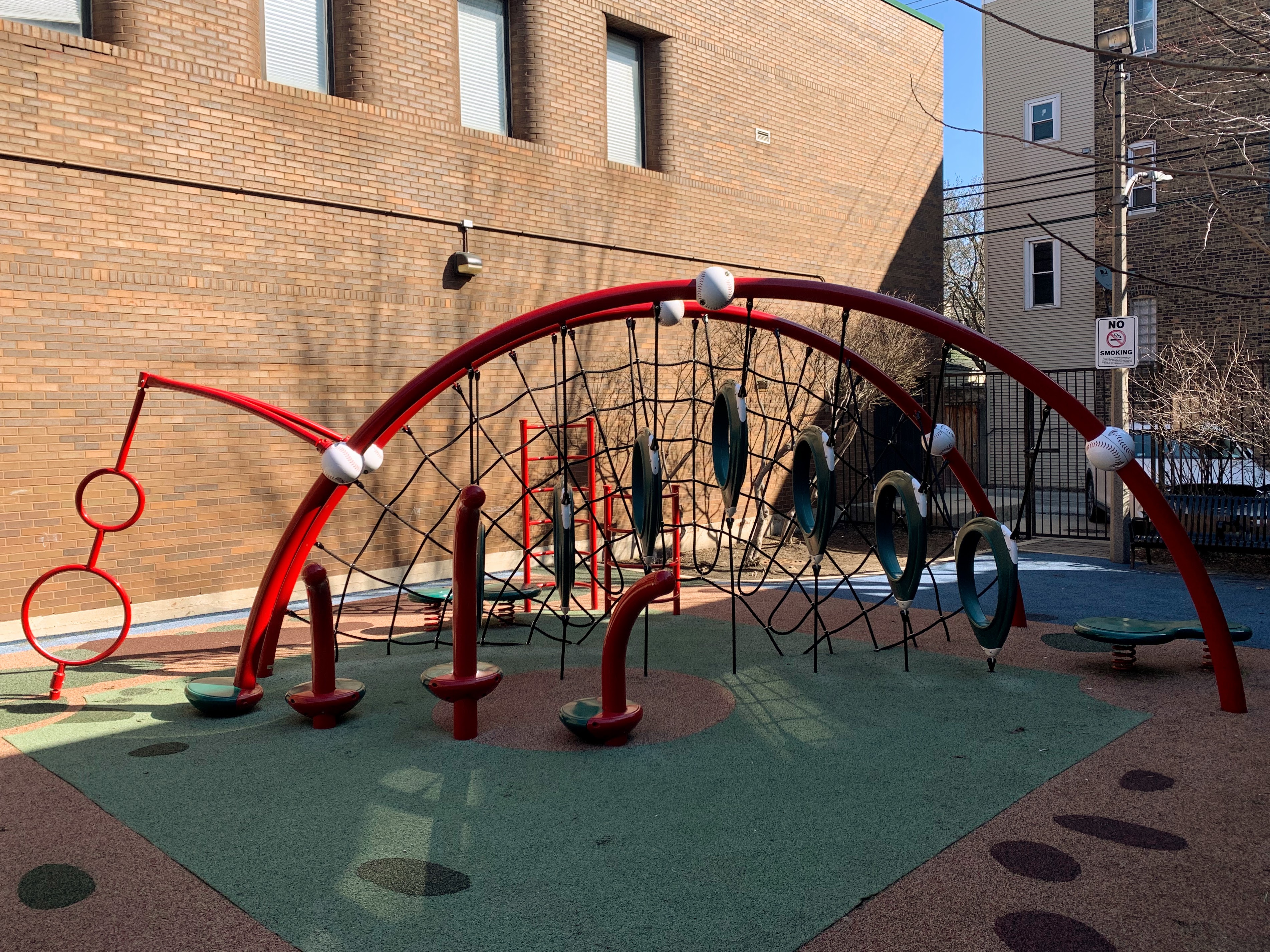 - Sheil Playground is a tiny playground on the busy Southport corridor with a strong baseball theme that features the Cubs logo and a chalkboard replica of the iconic green scoreboard. A new playground - consisting primarily of large, red metal arches - provides climbing structures as well as a smaller area for younger children. The play area is completely enclosed and features several benches and picnic tables.