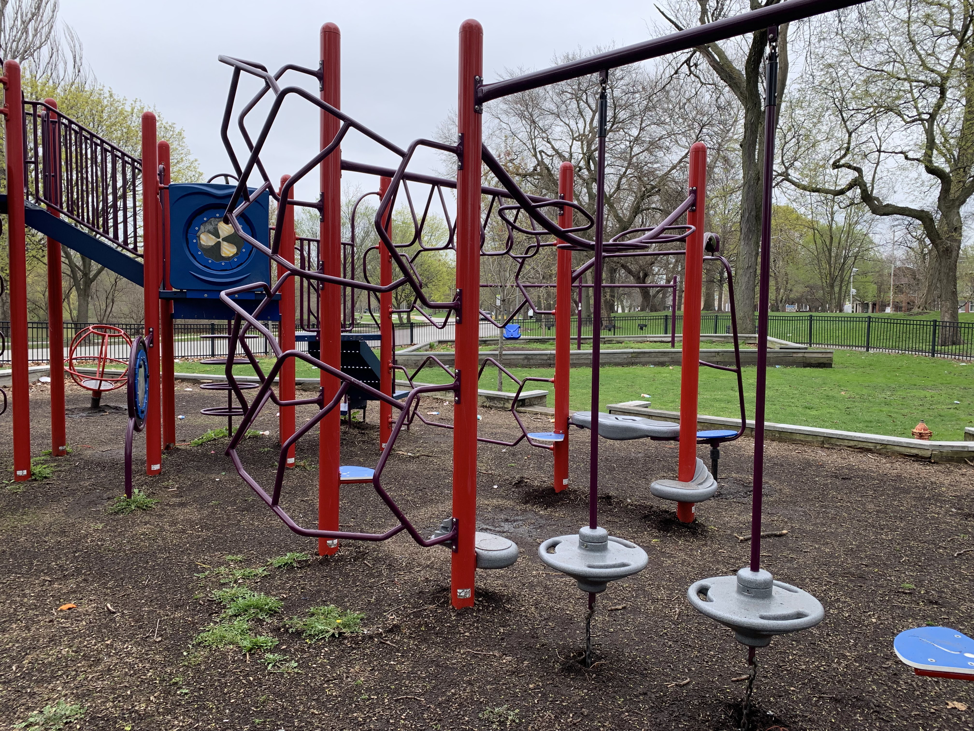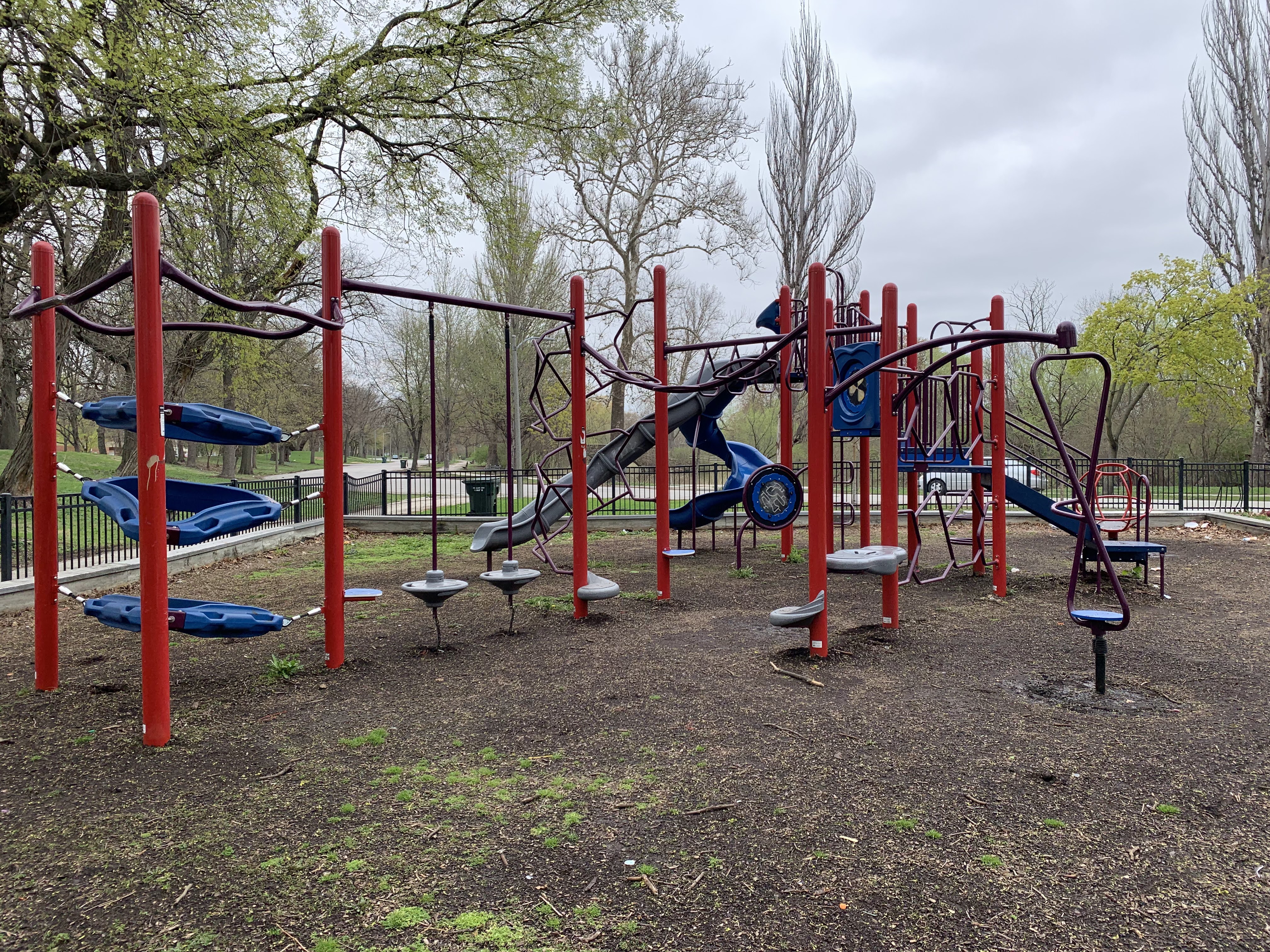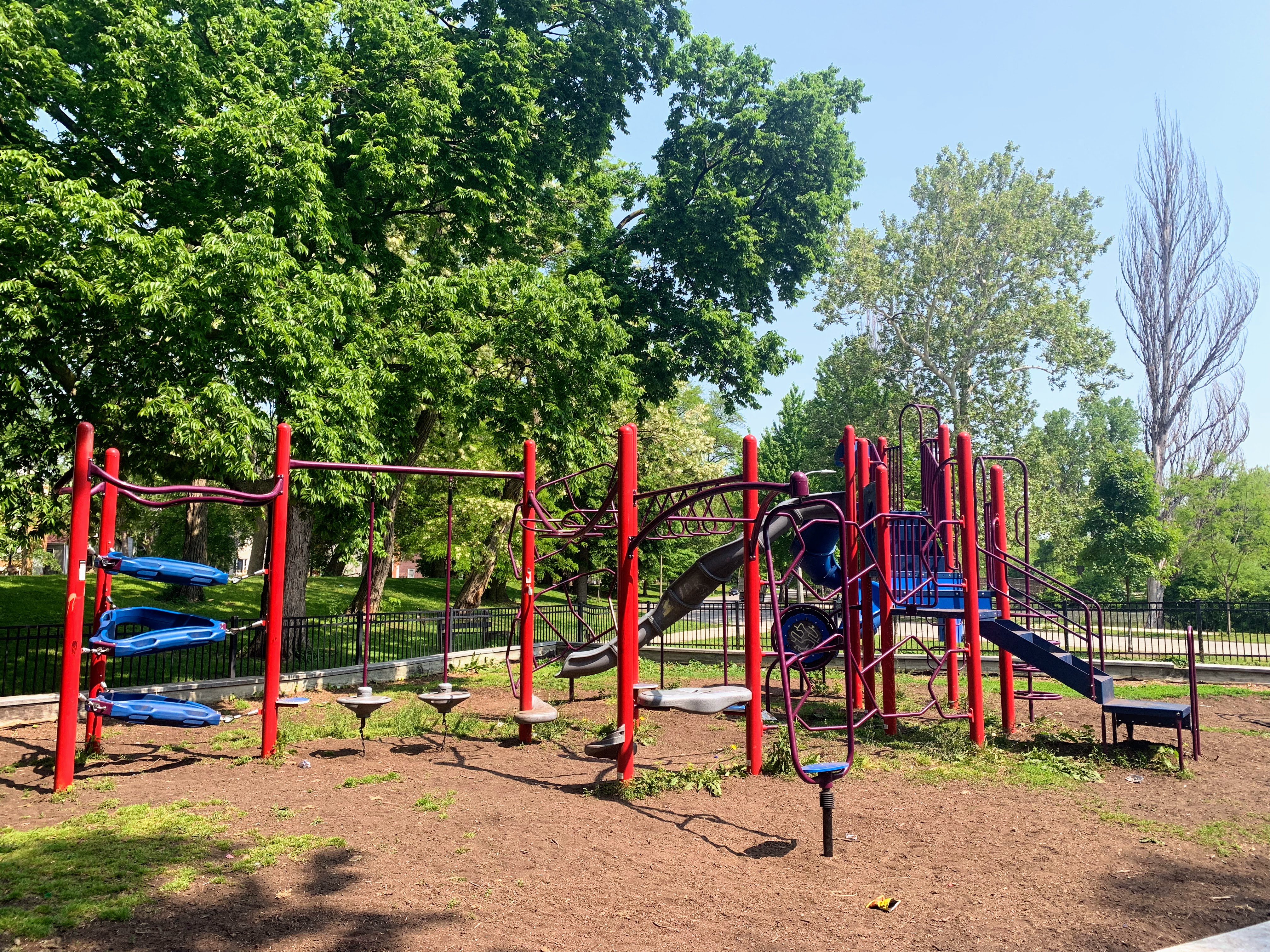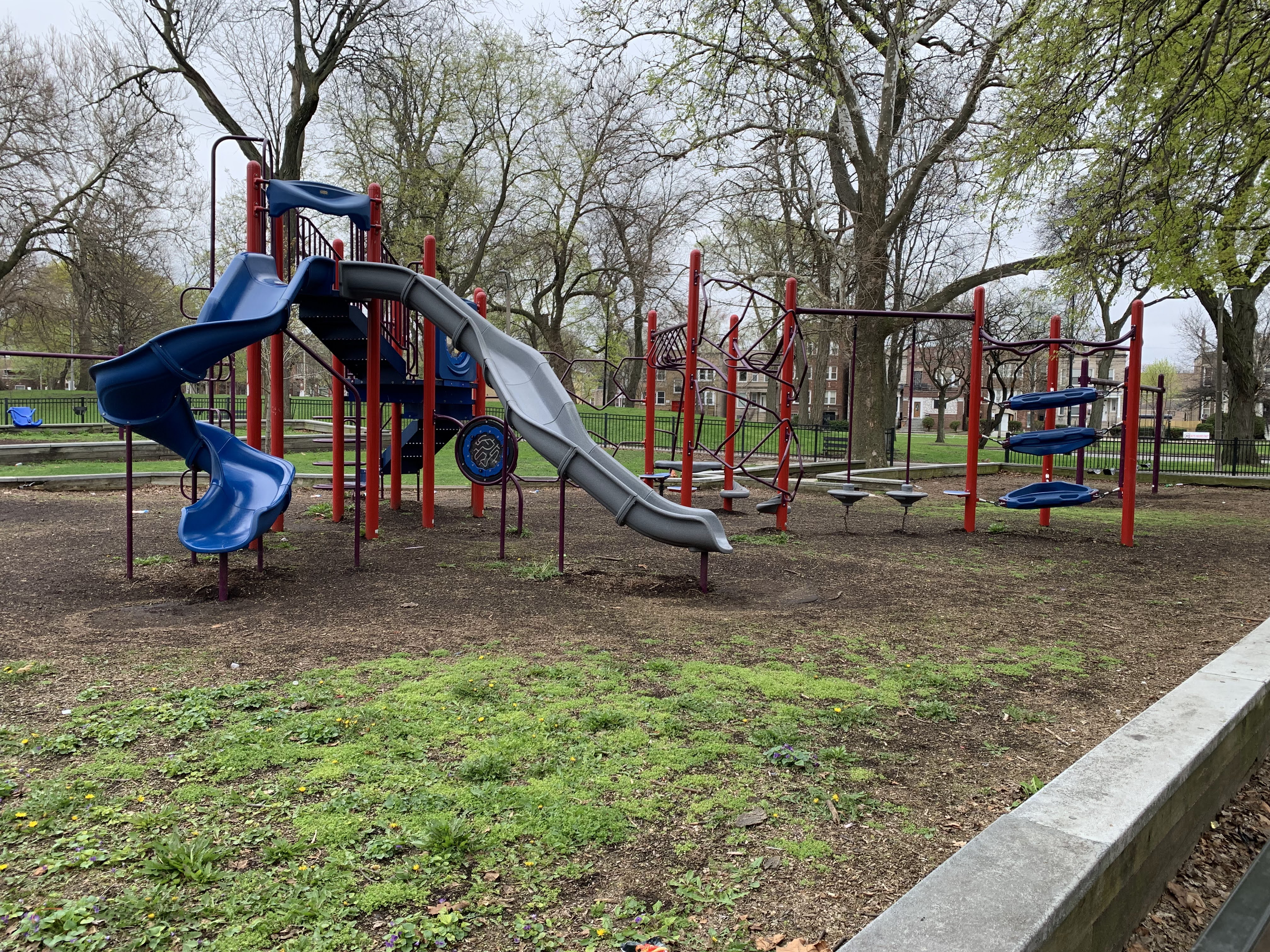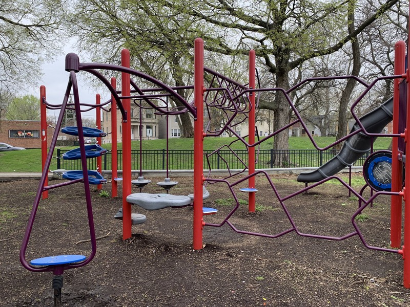 - This playground - one of three in Sherman Park - includes the standard set of swings and a large play structure. The play structure includes a variety of elements including large curving slides and a few variations on monkey bars. The play area is fenced from the streets but not fully enclosed and the surface is wood chips. There aren't any benches but the low perimeter walls allow for some seating and nearby trees provide for some shade.