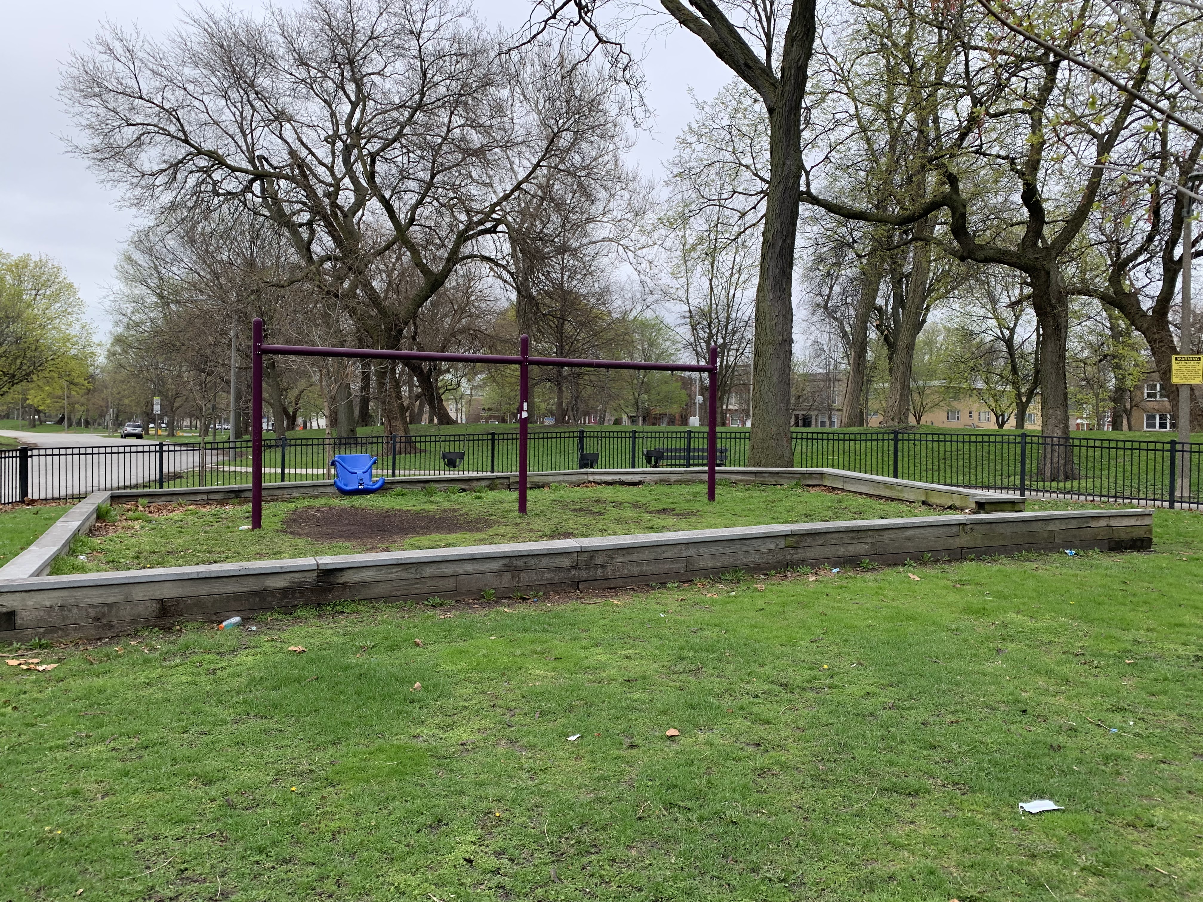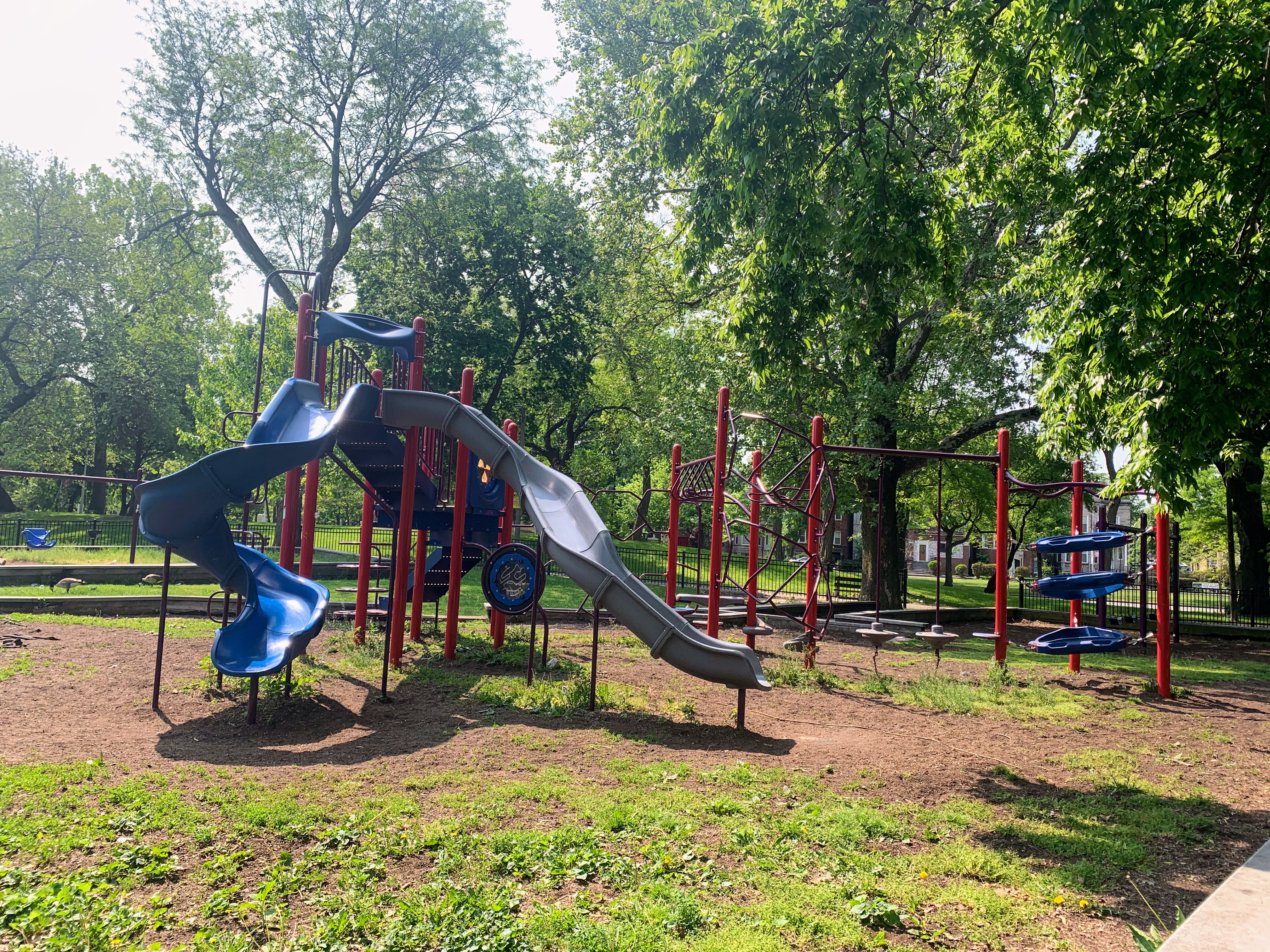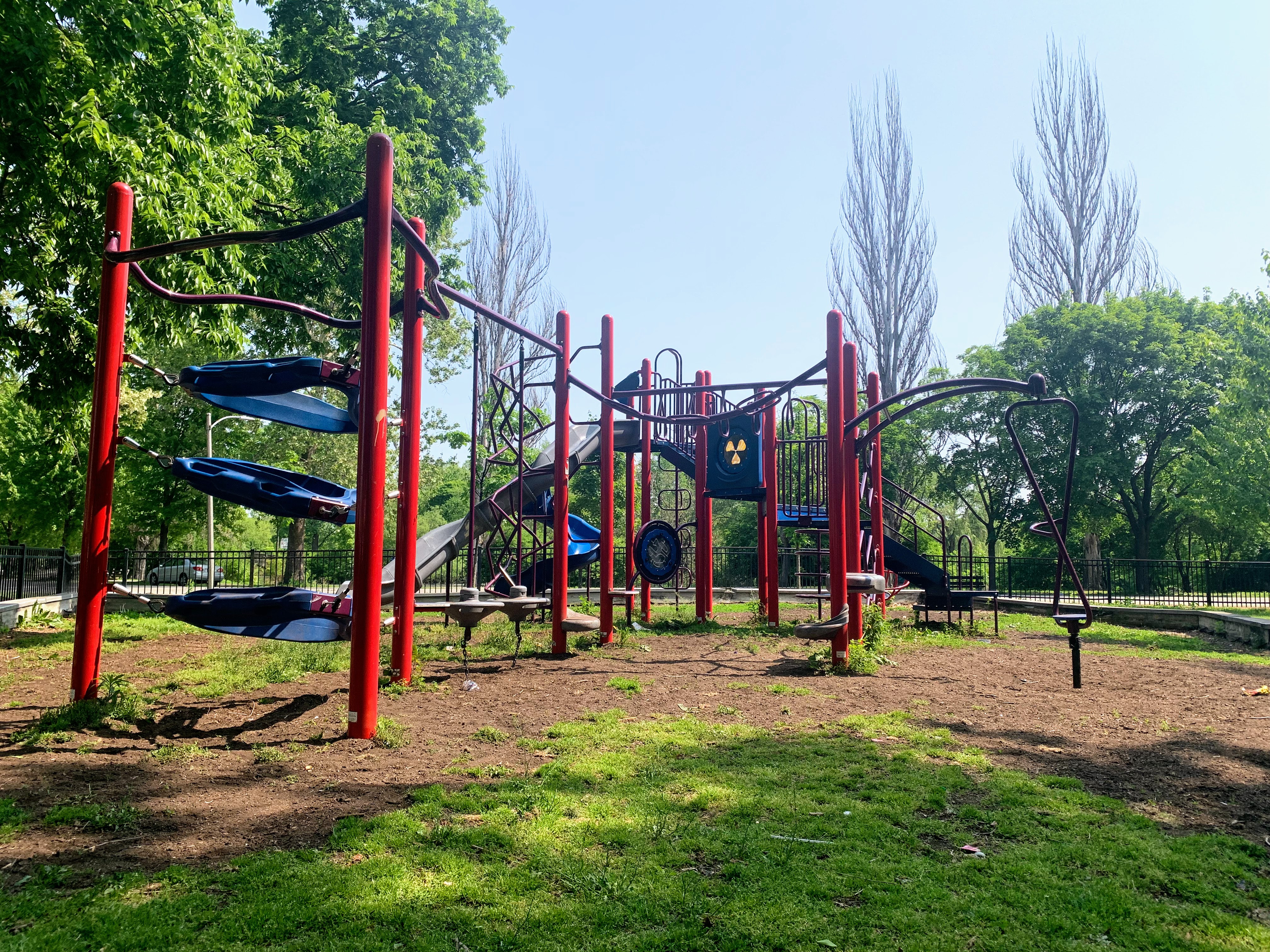 - This playground - one of three in Sherman Park - includes the standard set of swings and a large play structure. The play structure includes a variety of elements including large curving slides and a few variations on monkey bars. The play area is fenced from the streets but not fully enclosed and the surface is wood chips. There aren't any benches but the low perimeter walls allow for some seating and nearby trees provide for some shade.
