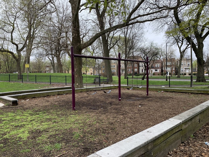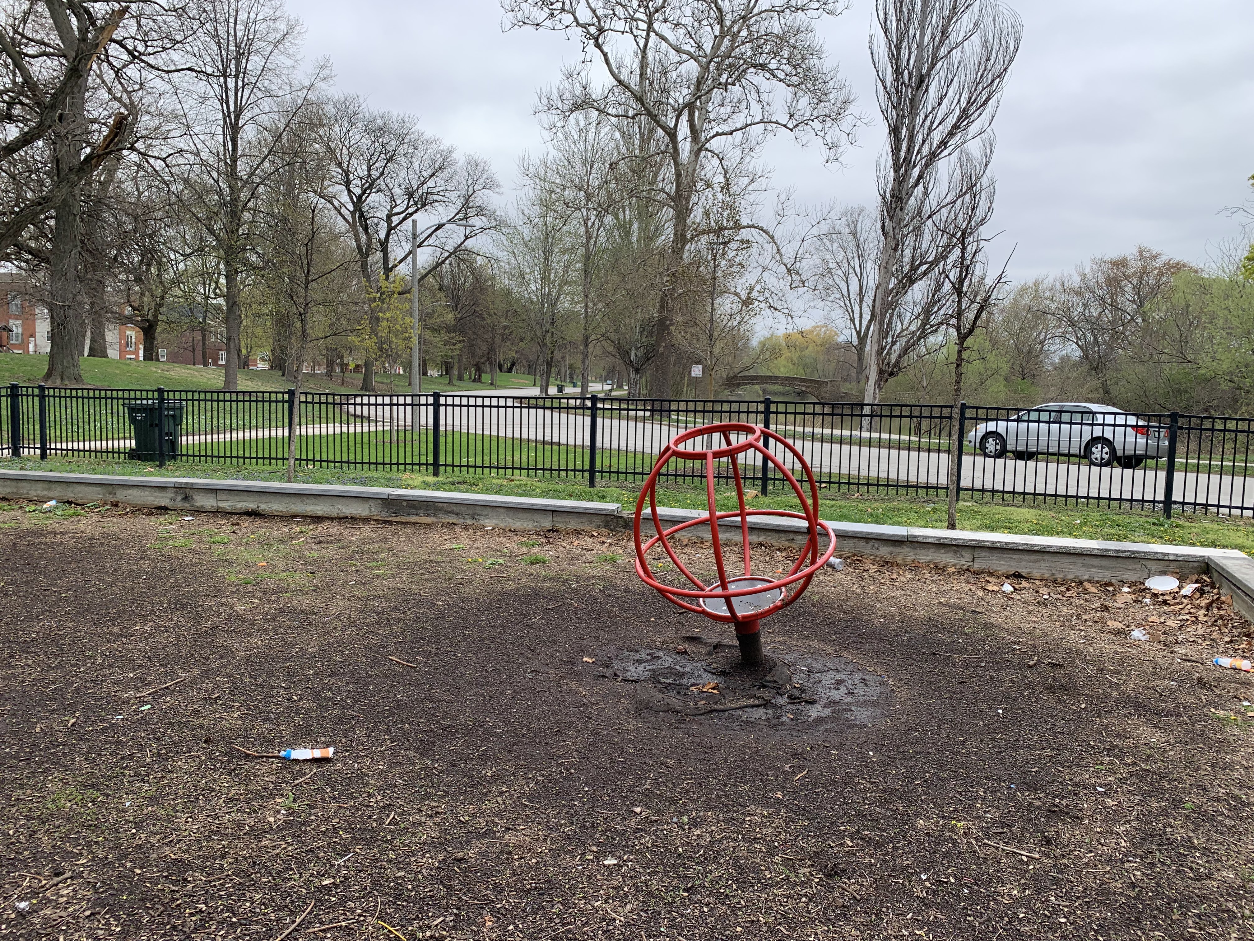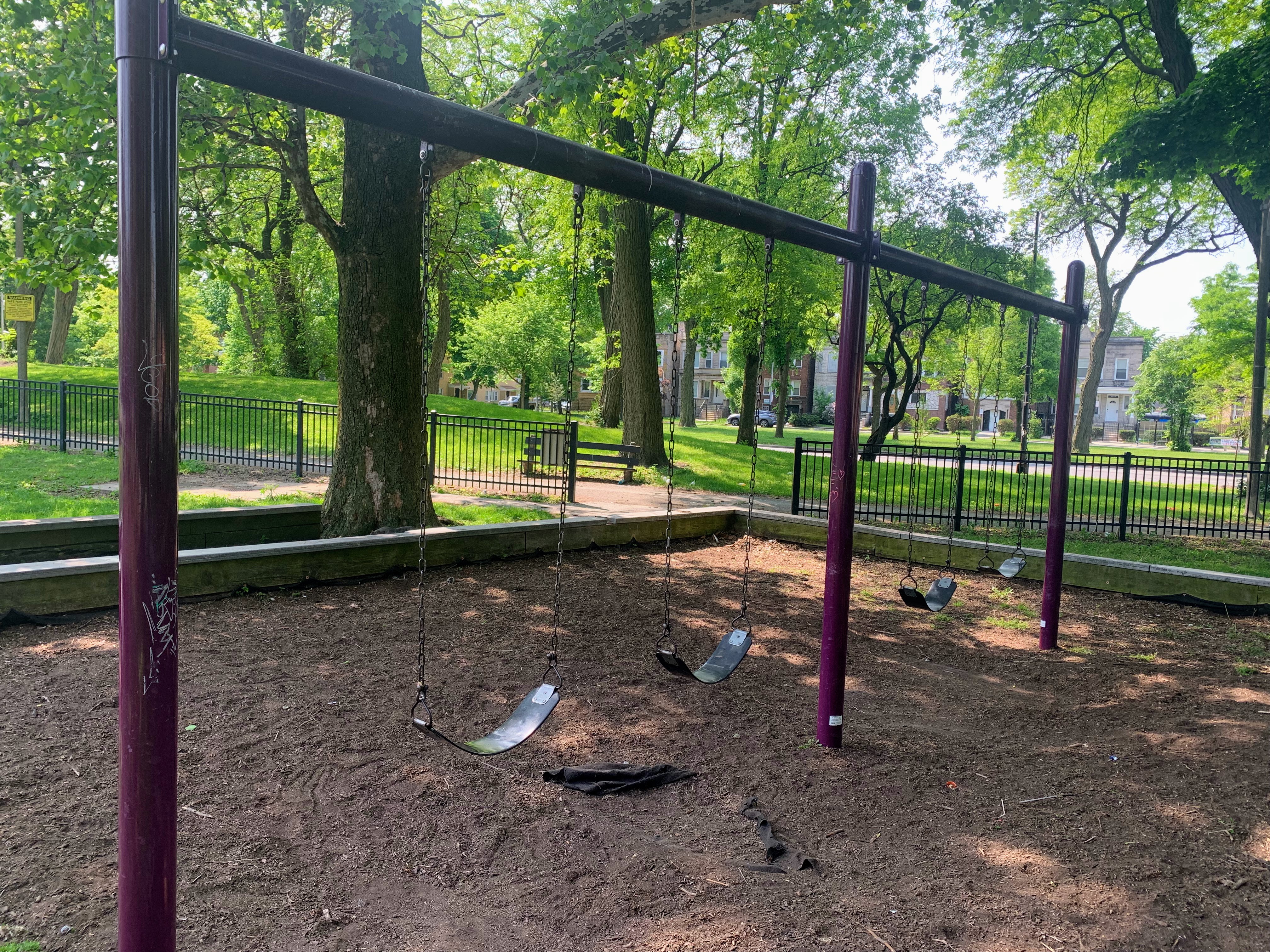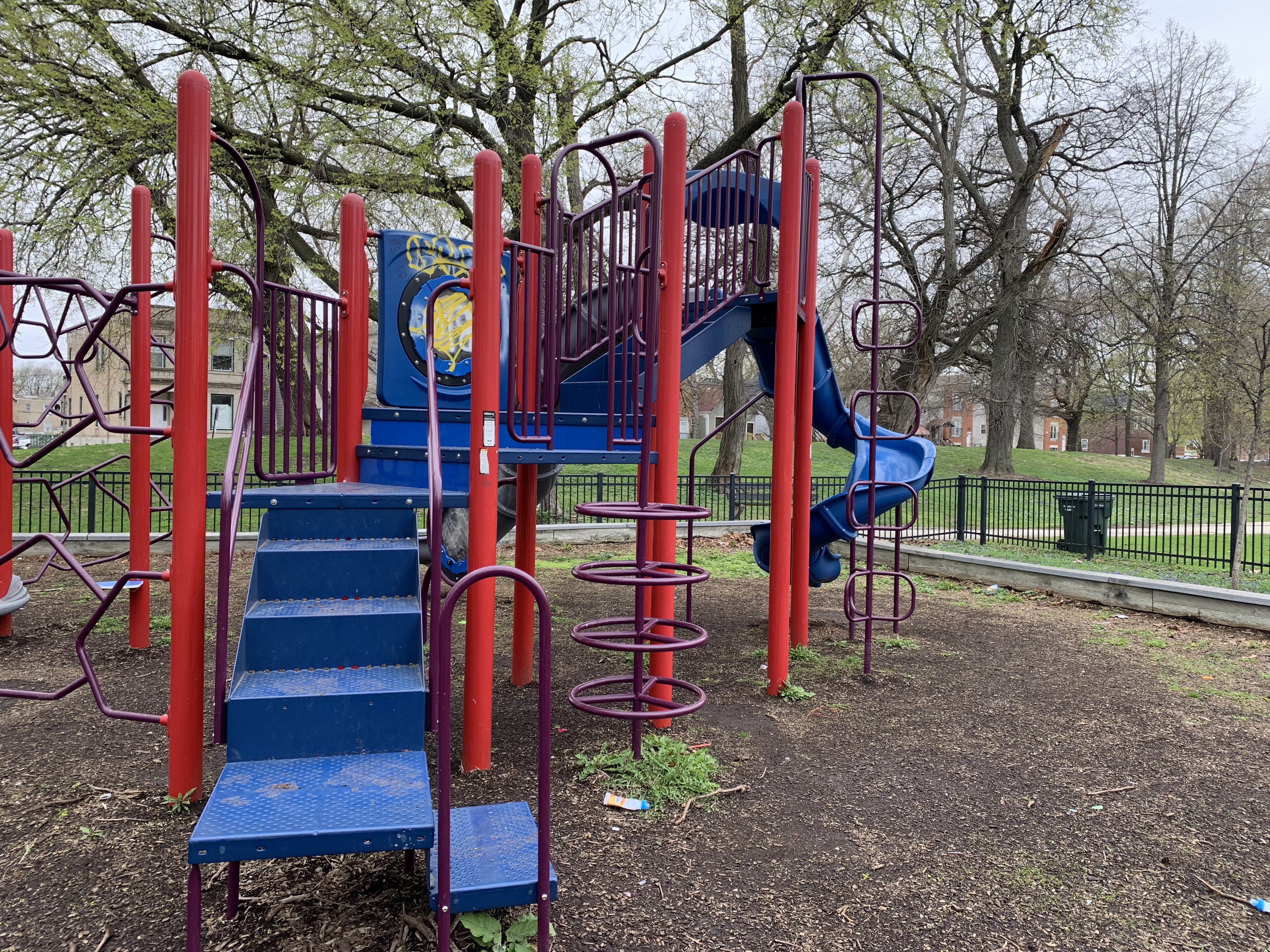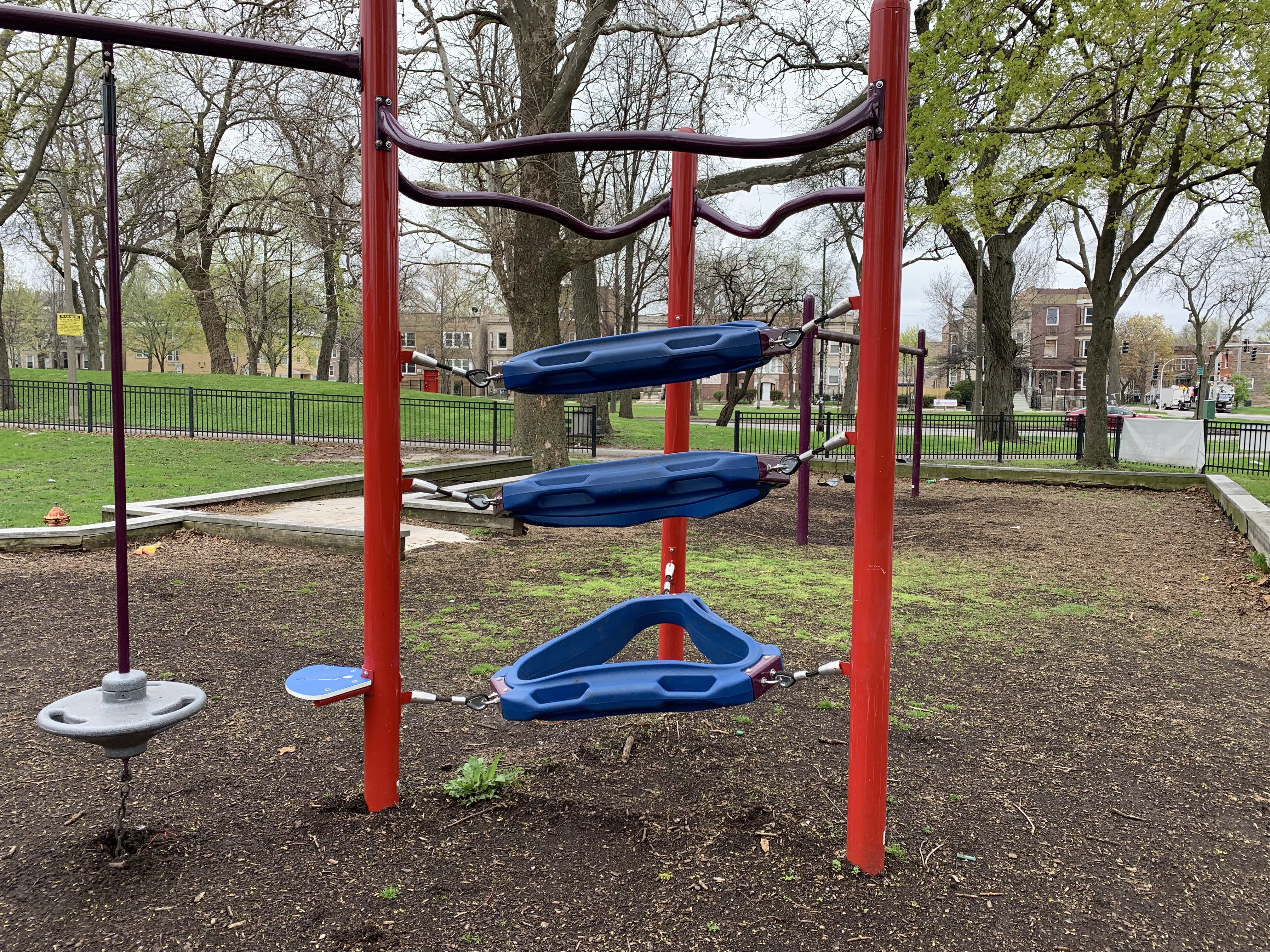 - This playground - one of three in Sherman Park - includes the standard set of swings and a large play structure. The play structure includes a variety of elements including large curving slides and a few variations on monkey bars. The play area is fenced from the streets but not fully enclosed and the surface is wood chips. There aren't any benches but the low perimeter walls allow for some seating and nearby trees provide for some shade.