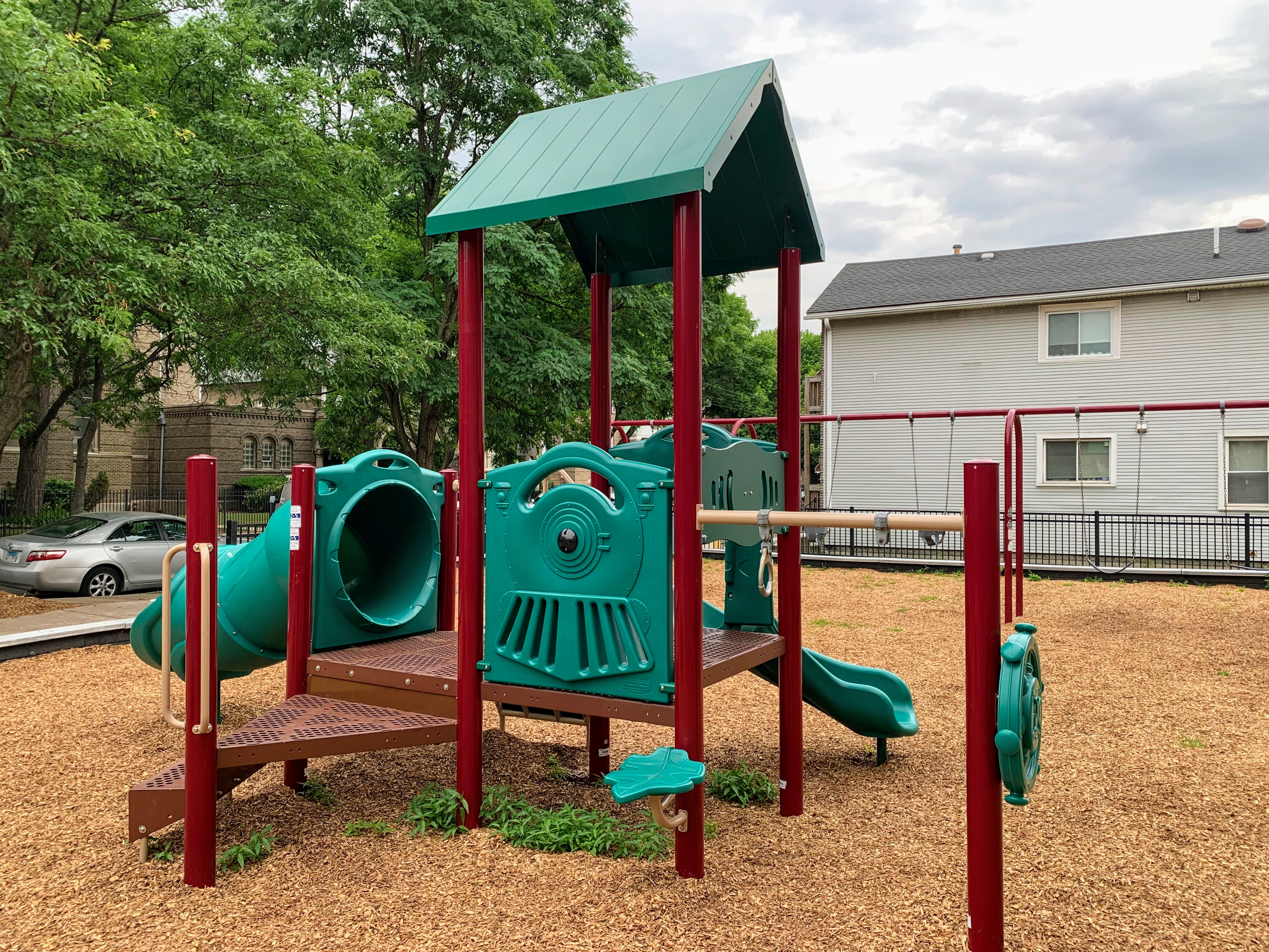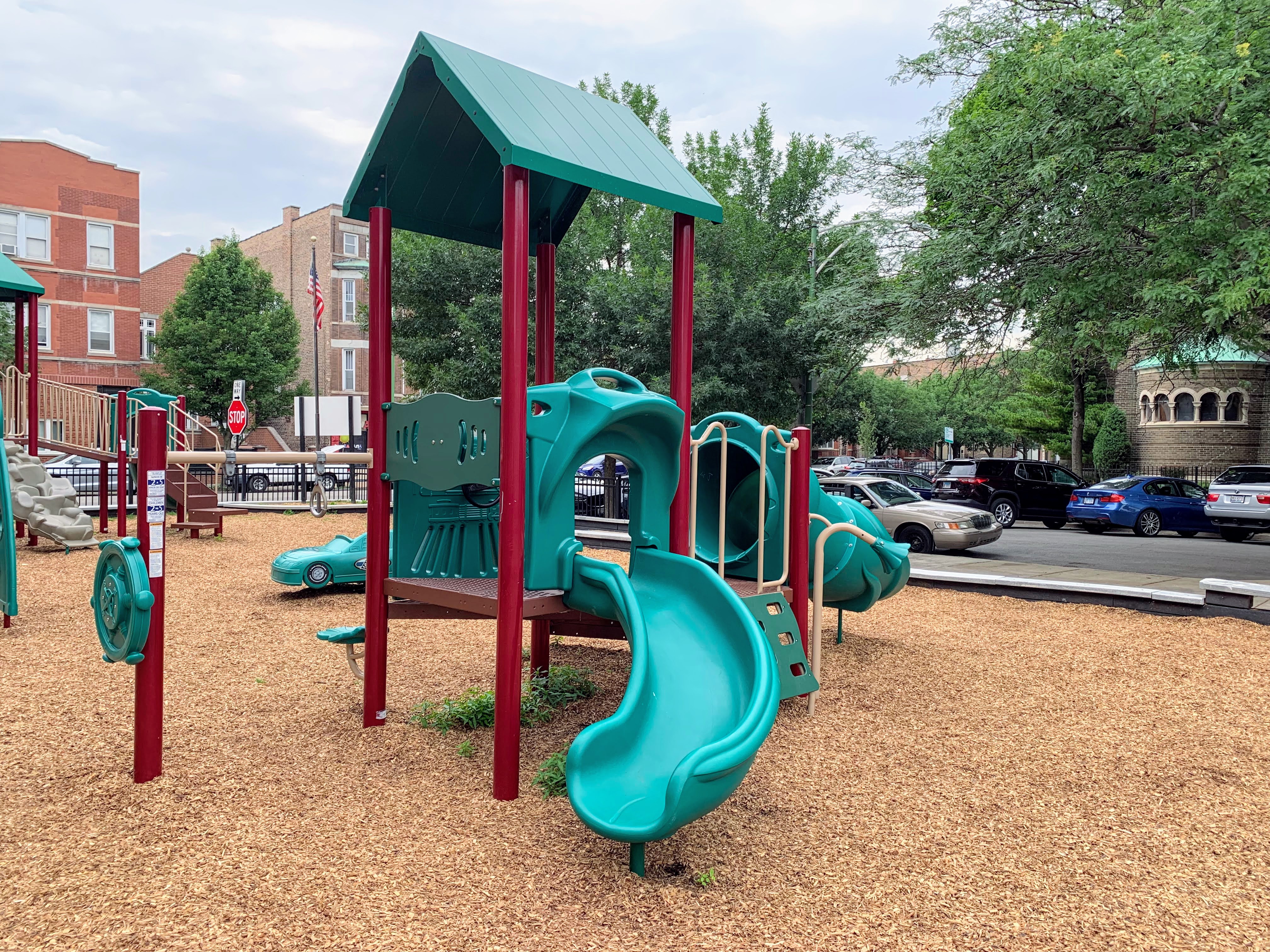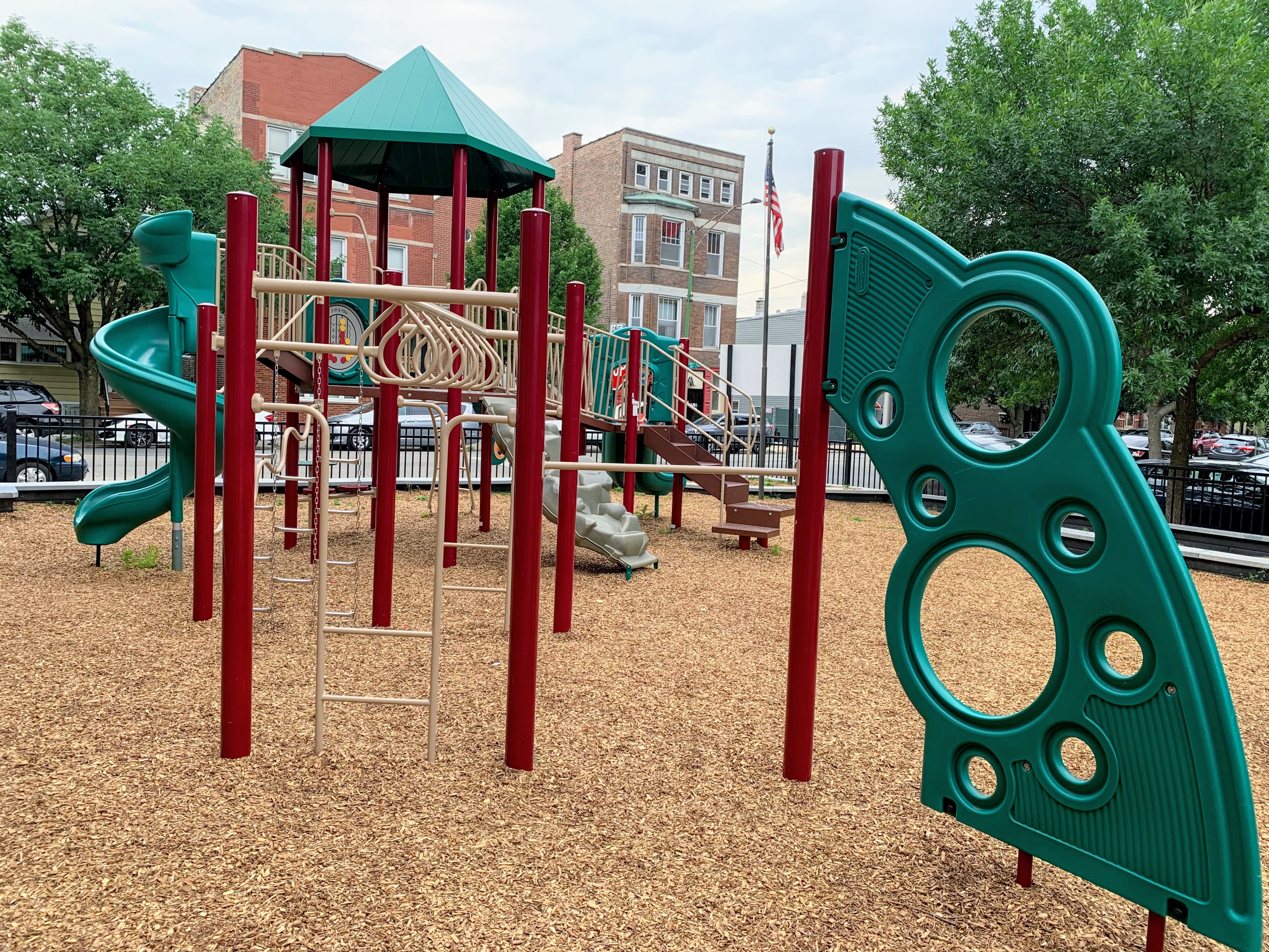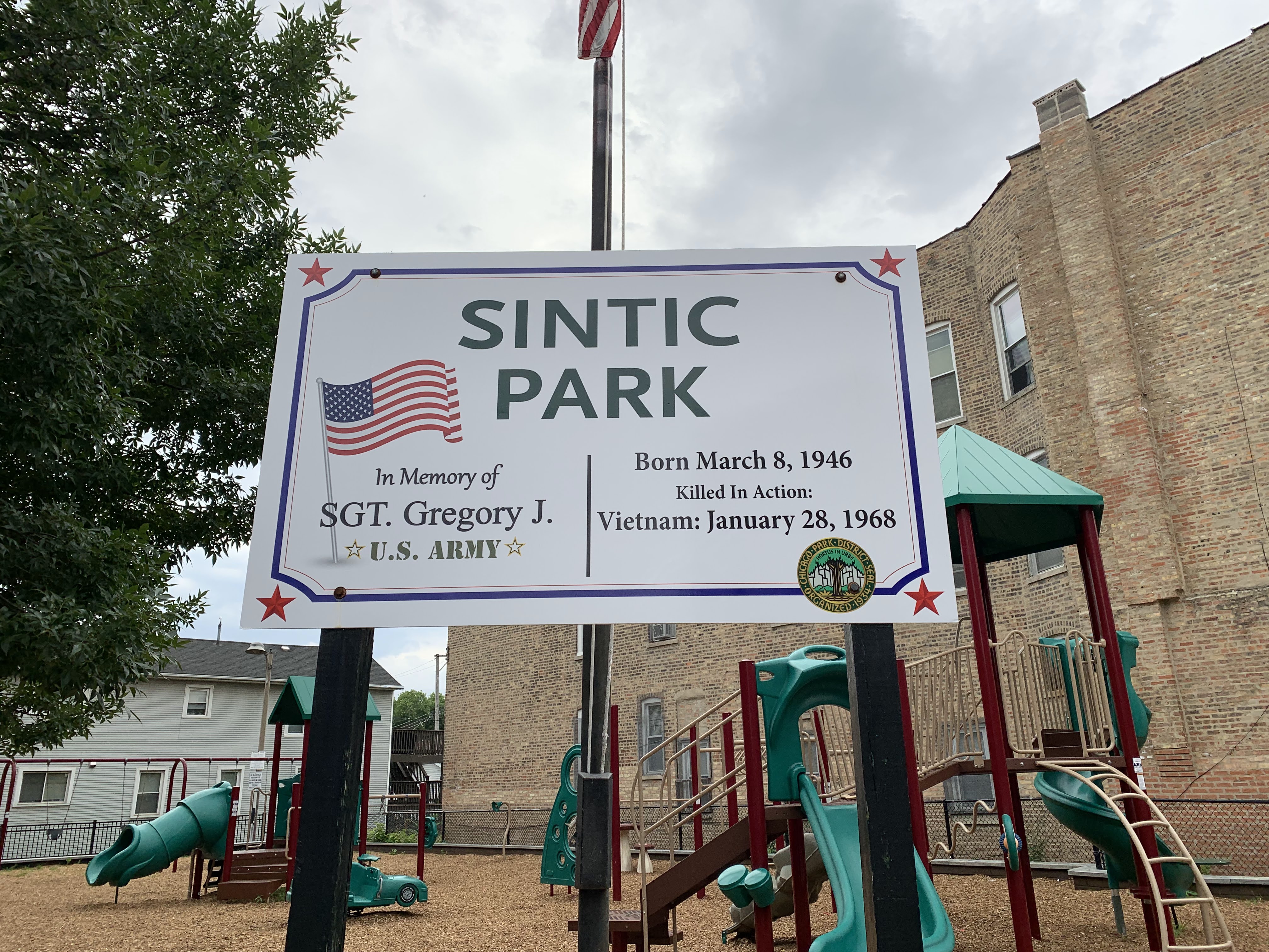- Sintic Park is a small neighborhood park consisting entirely of a large playground. There is a large play structure with a few slides. Connected to that structure, there are overhead and traversing elements for older children. There is also a smaller structure for younger children as well as a few standalone elements. Lastly, there is a standard set of swings (toddler, adaptive, and belt seat). The playground is also pretty standard in terms of amenities: the play surface is wood chips and there isn't much shade. Low perimeter walls provide some seating but there aren't benches or picnic tables for actual seating - though there is a drinking fountain. All in all, this is a pretty standard Chicago playground - not that that's a bad thing.