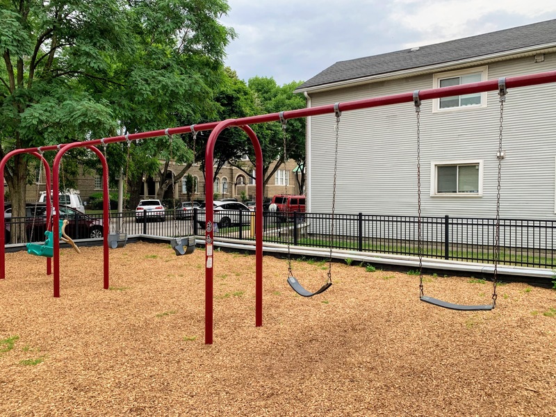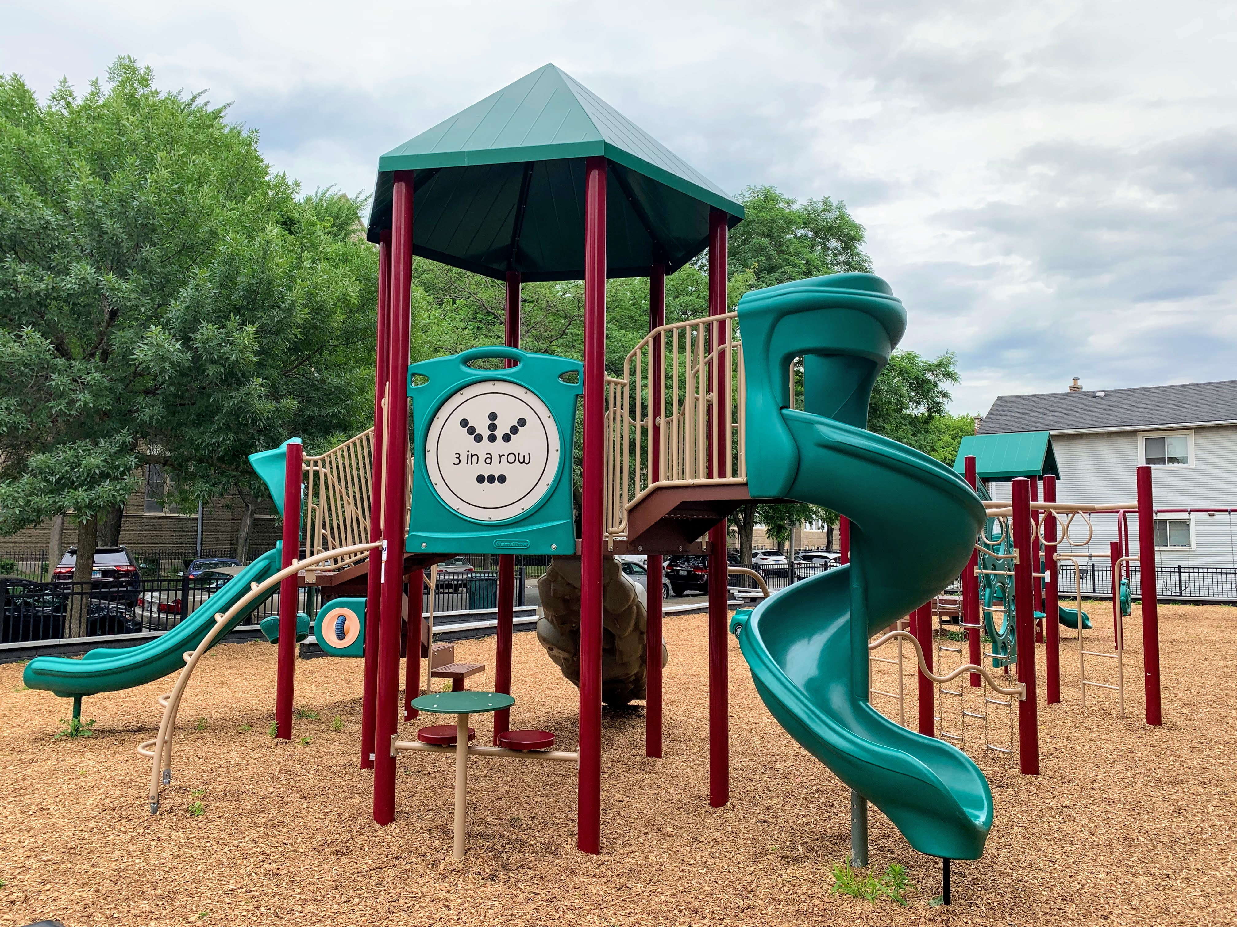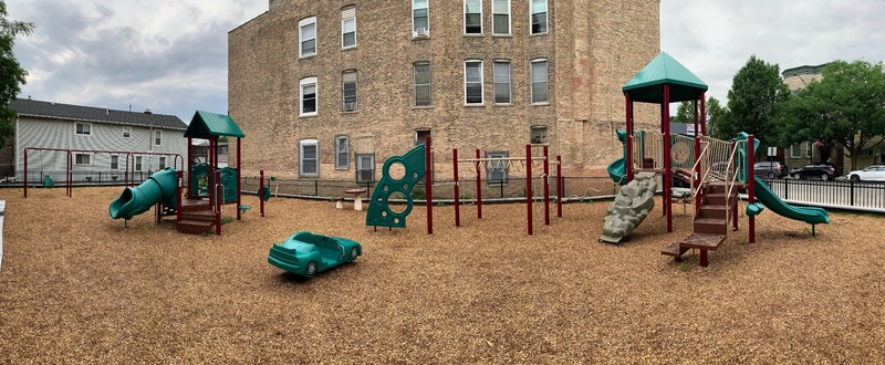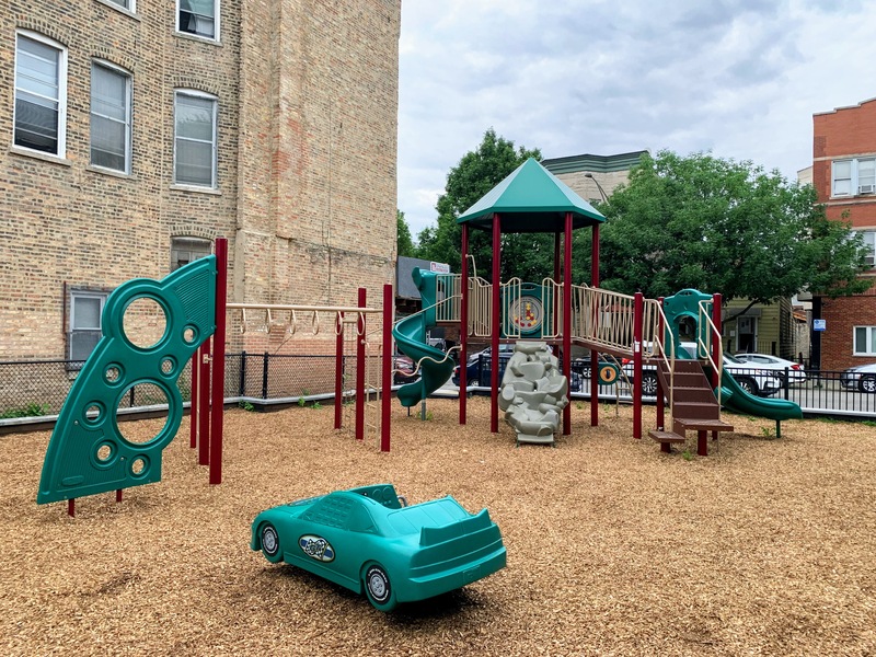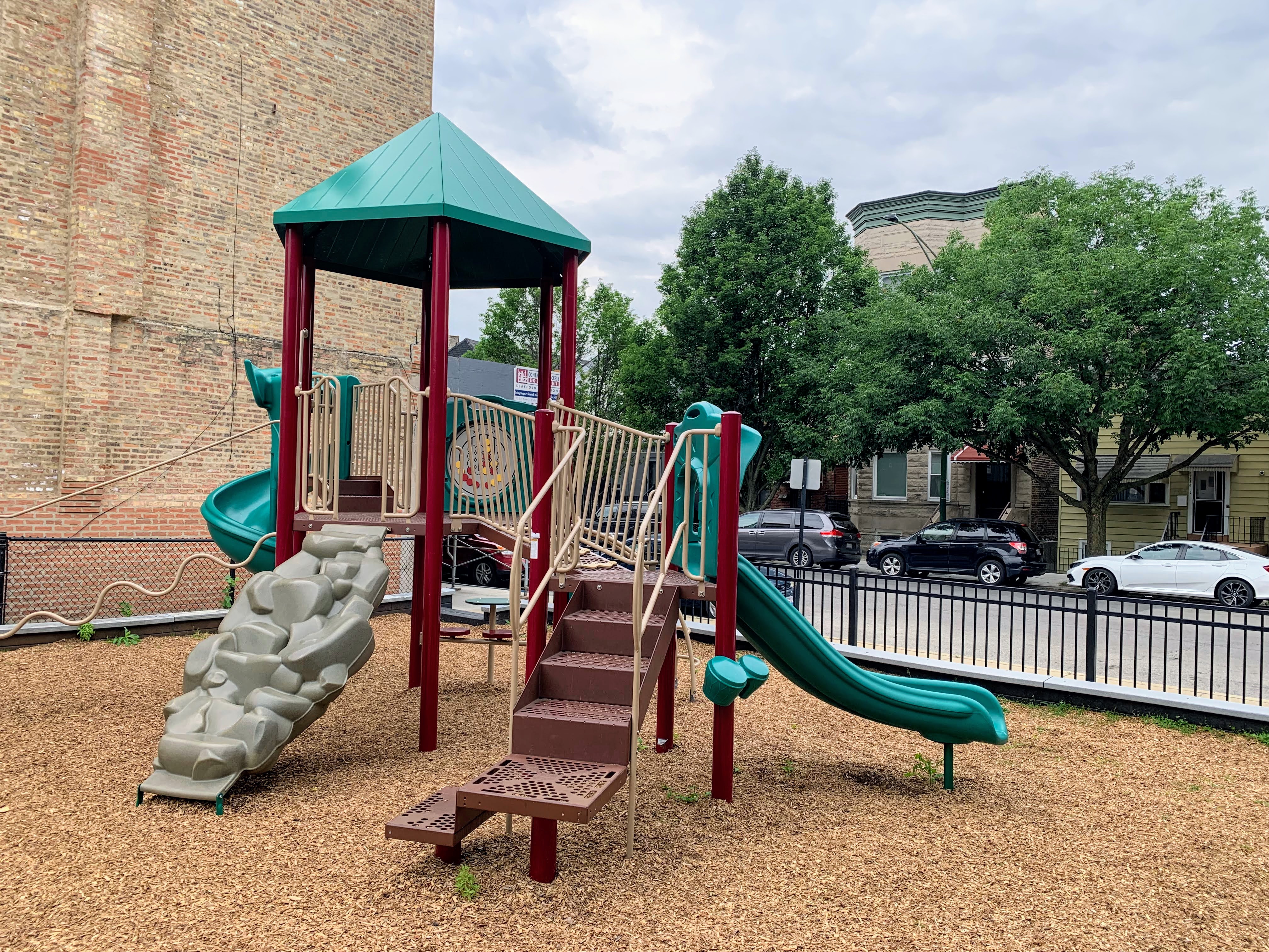 - Sintic Park is a small neighborhood park consisting entirely of a large playground. There is a large play structure with a few slides. Connected to that structure, there are overhead and traversing elements for older children. There is also a smaller structure for younger children as well as a few standalone elements. Lastly, there is a standard set of swings (toddler, adaptive, and belt seat). The playground is also pretty standard in terms of amenities: the play surface is wood chips and there isn't much shade. Low perimeter walls provide some seating but there aren't benches or picnic tables for actual seating - though there is a drinking fountain. All in all, this is a pretty standard Chicago playground - not that that's a bad thing.