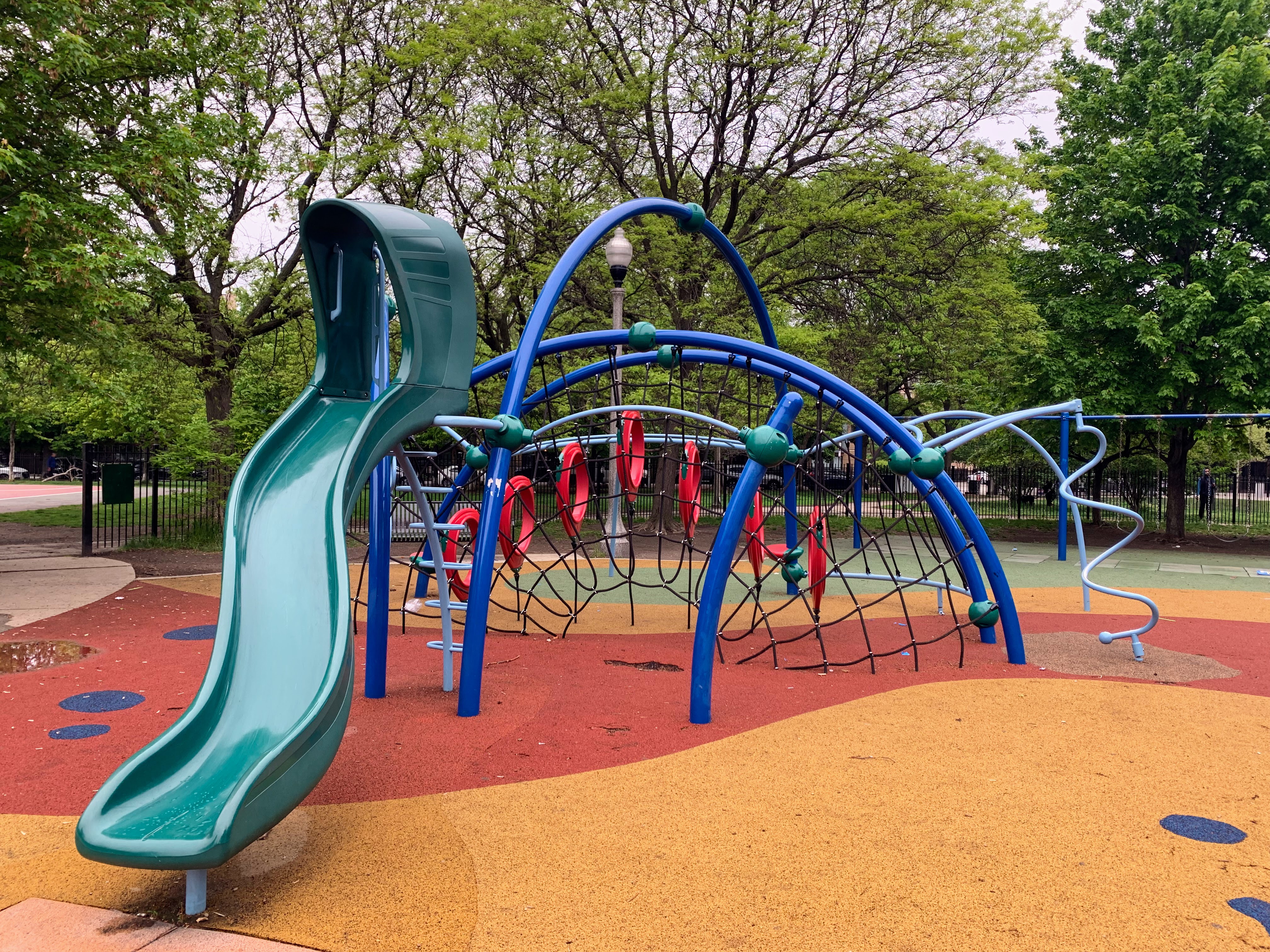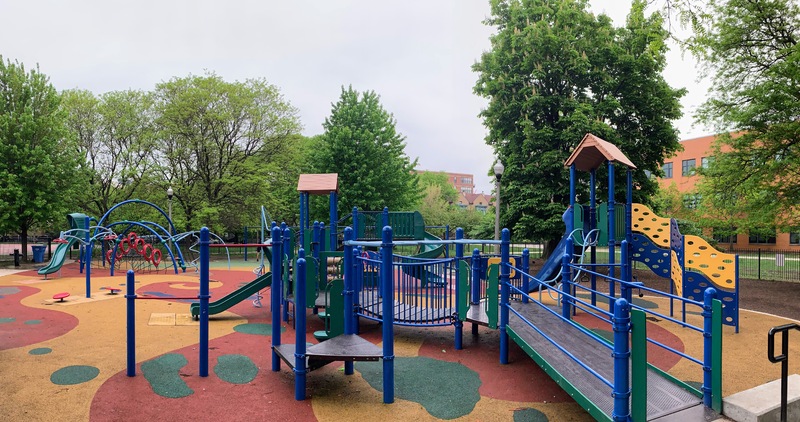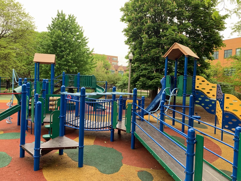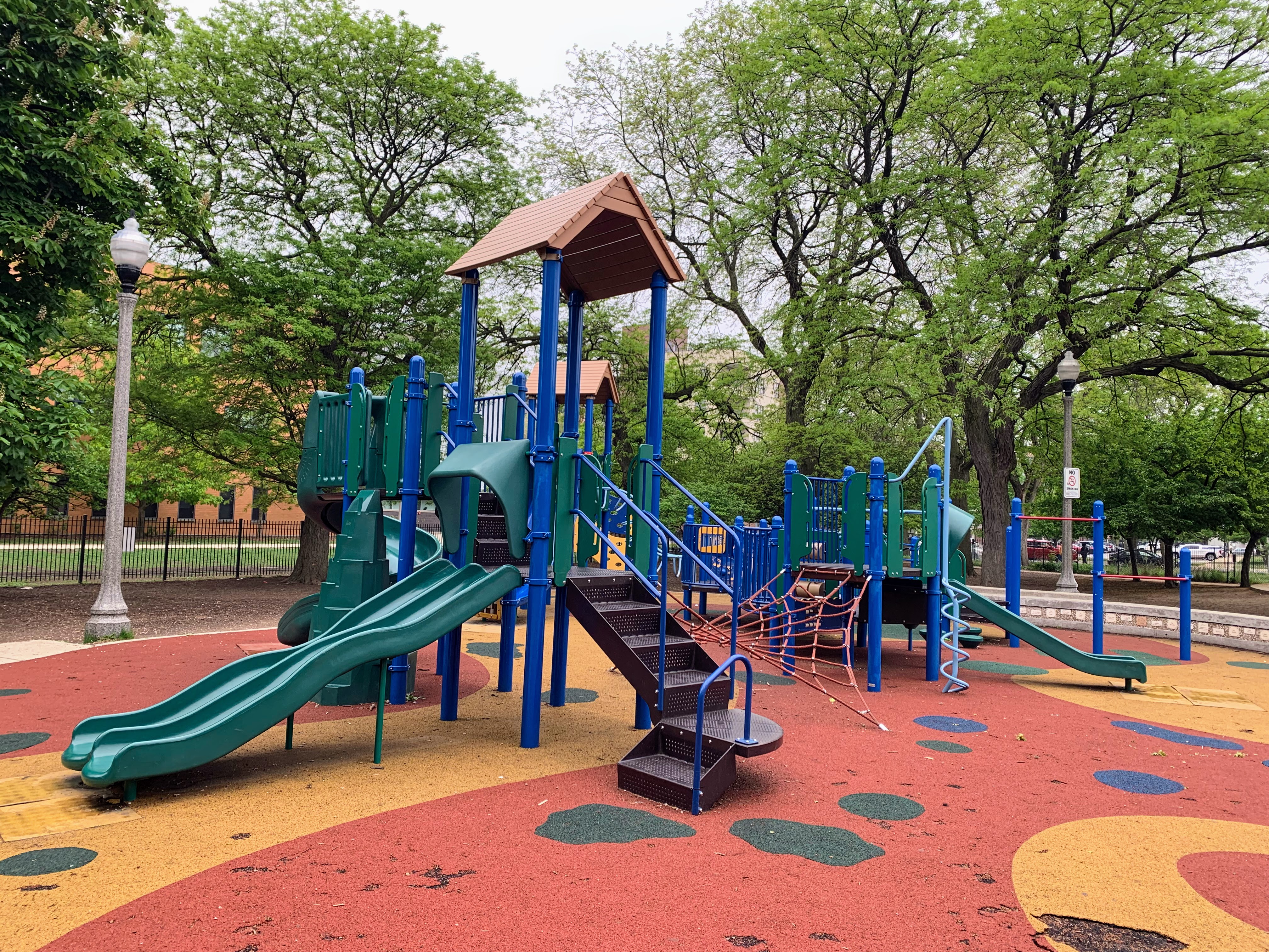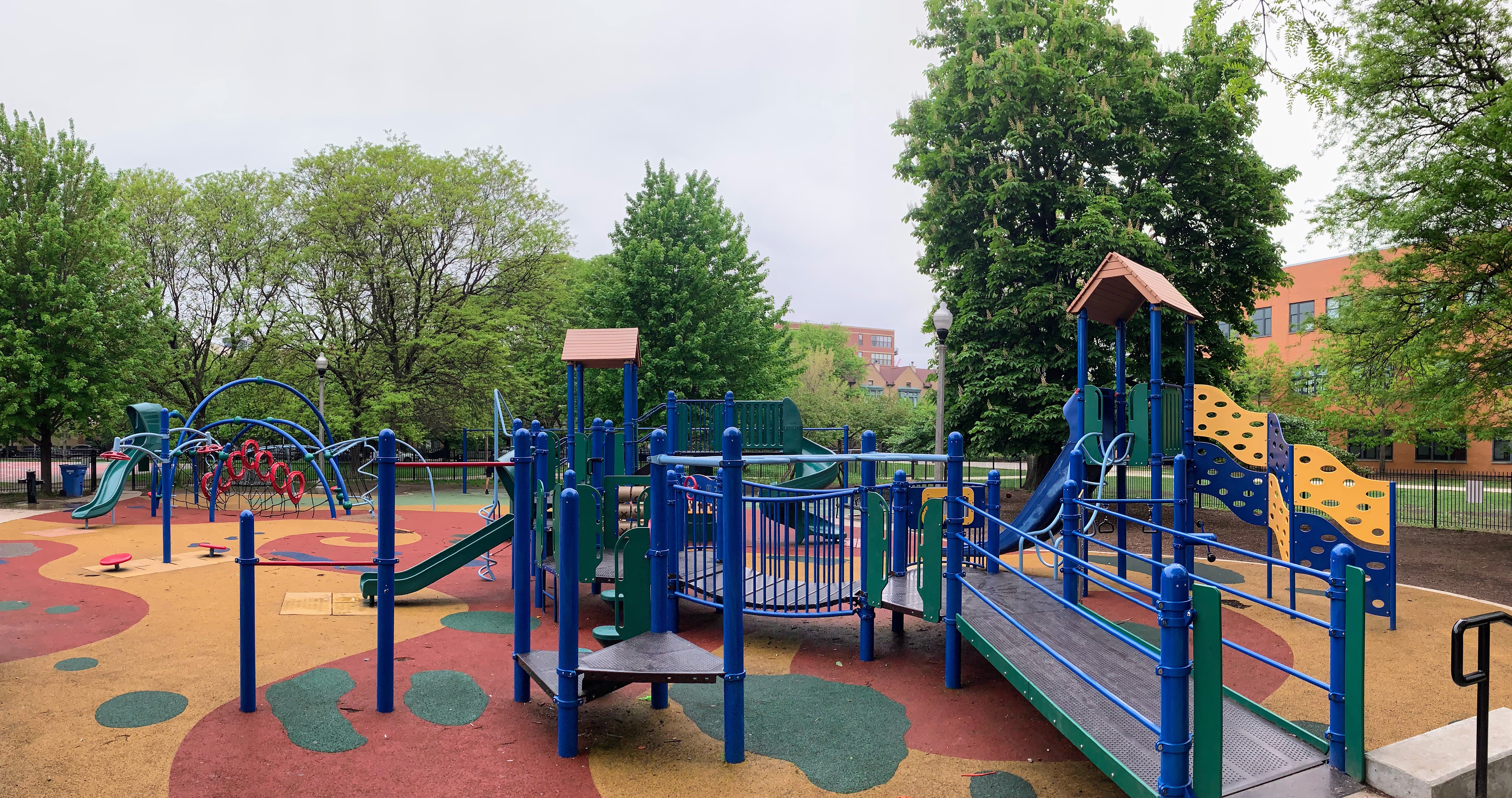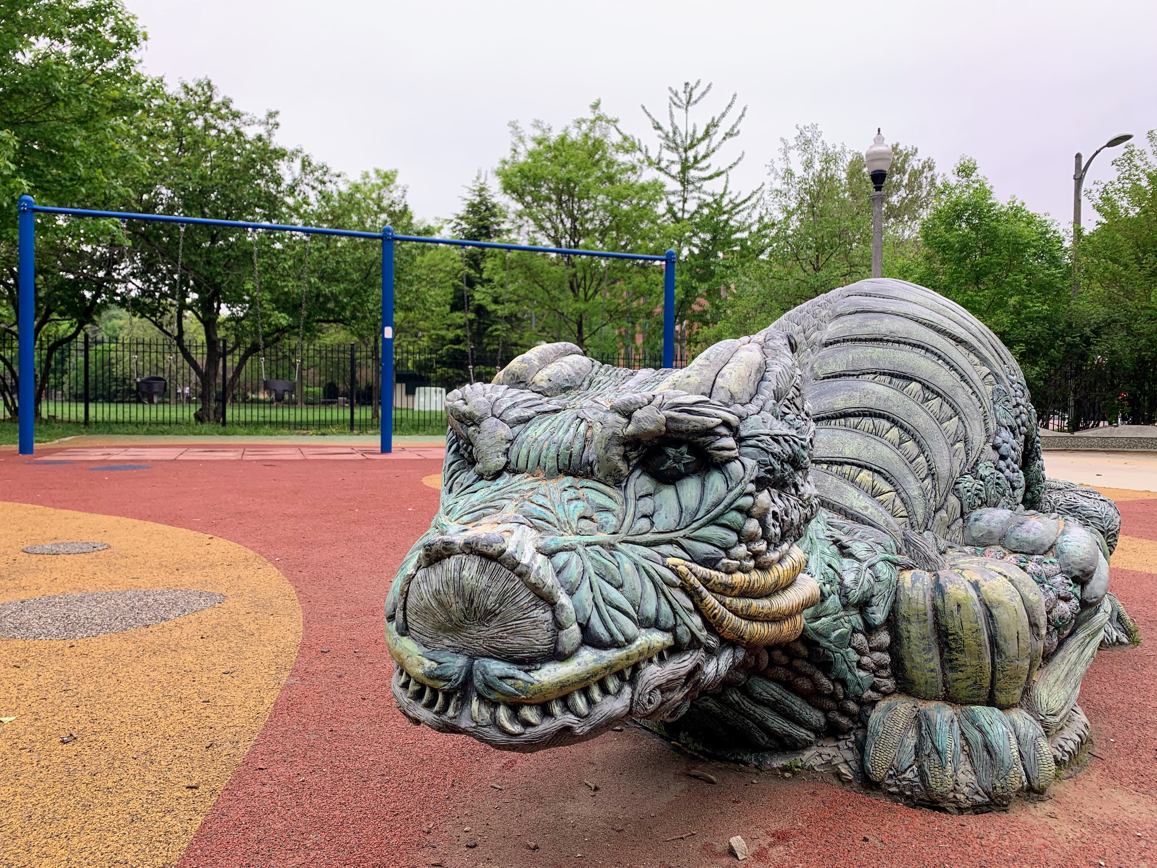 - This large playground is located on the east side of Skinner Park and and features a water spray feature, an area for younger children, a huge area for older children, and the normal variety of swings. The area designed for older children is particularly large and there are several mosaics and a large climbing animal (a dragon!) that make this playground stand out from others. There are benches and a few picnic tables in the fully enclosed play area and the play surface is soft rubber.