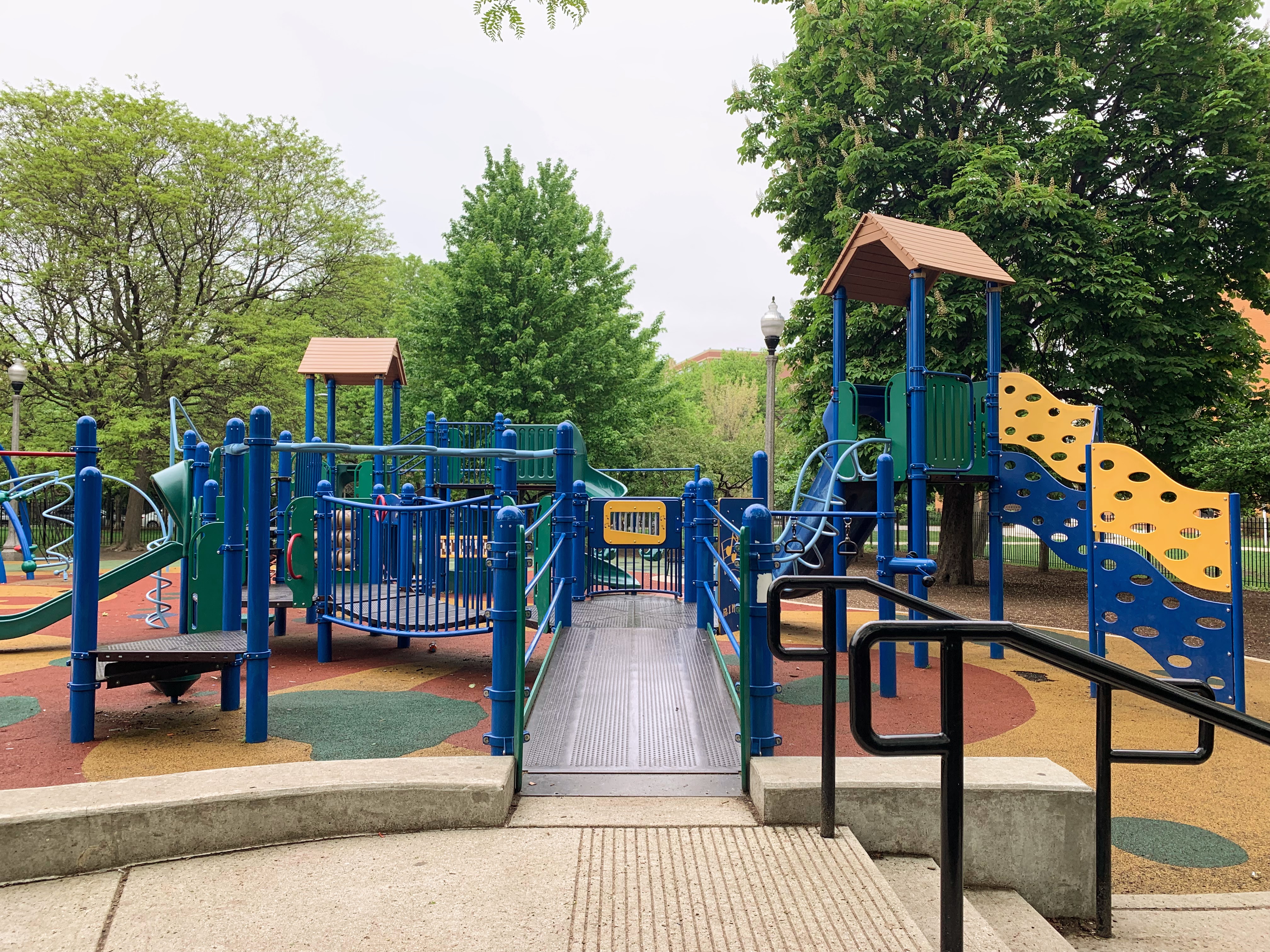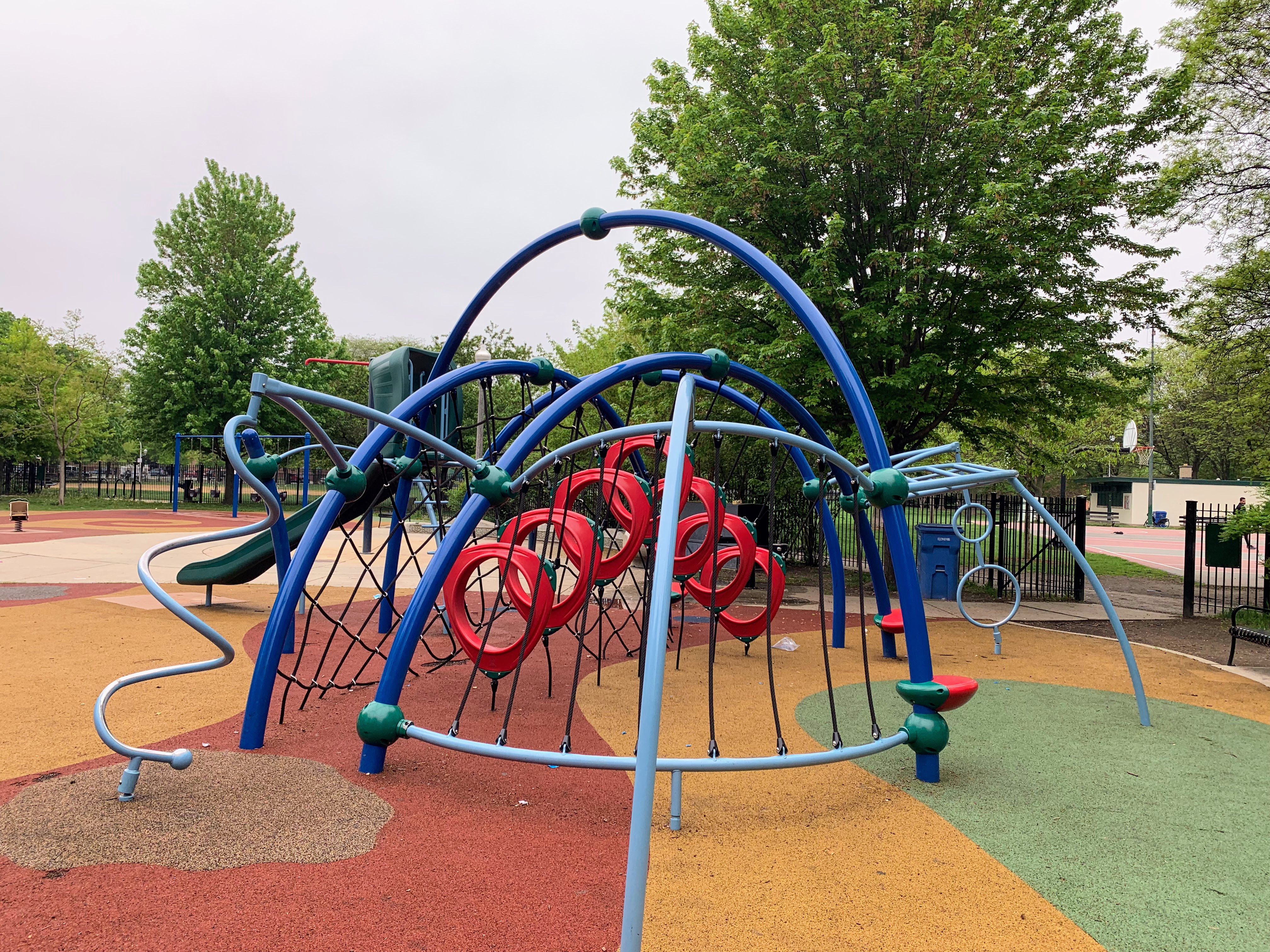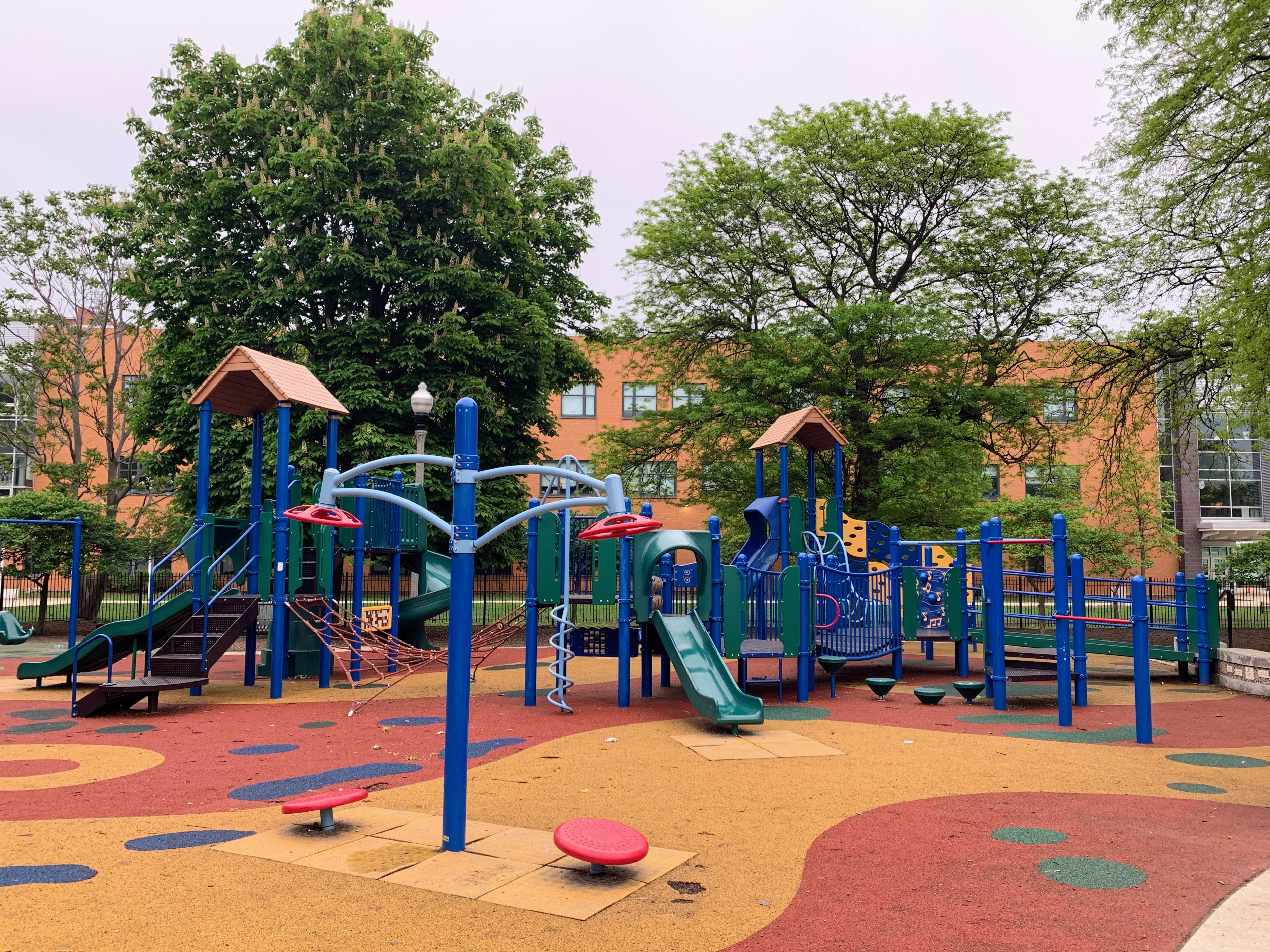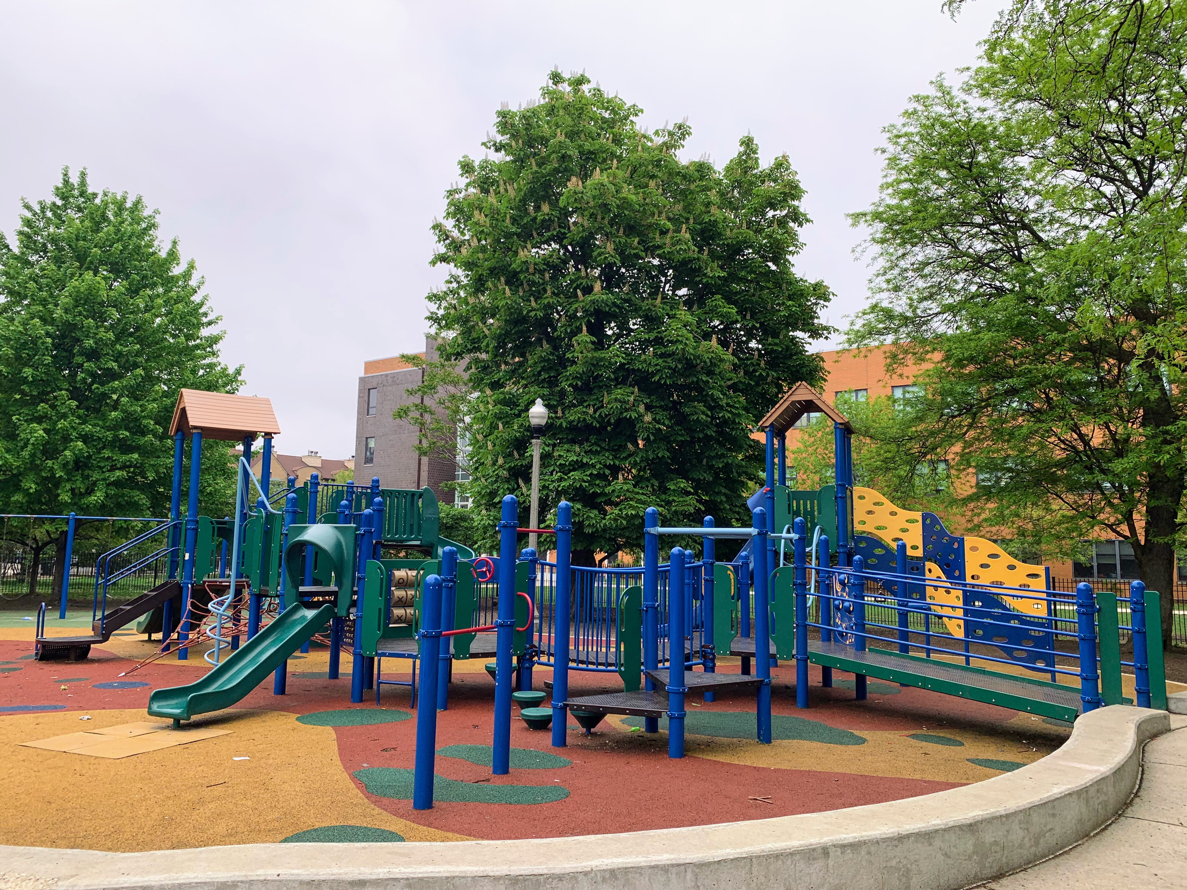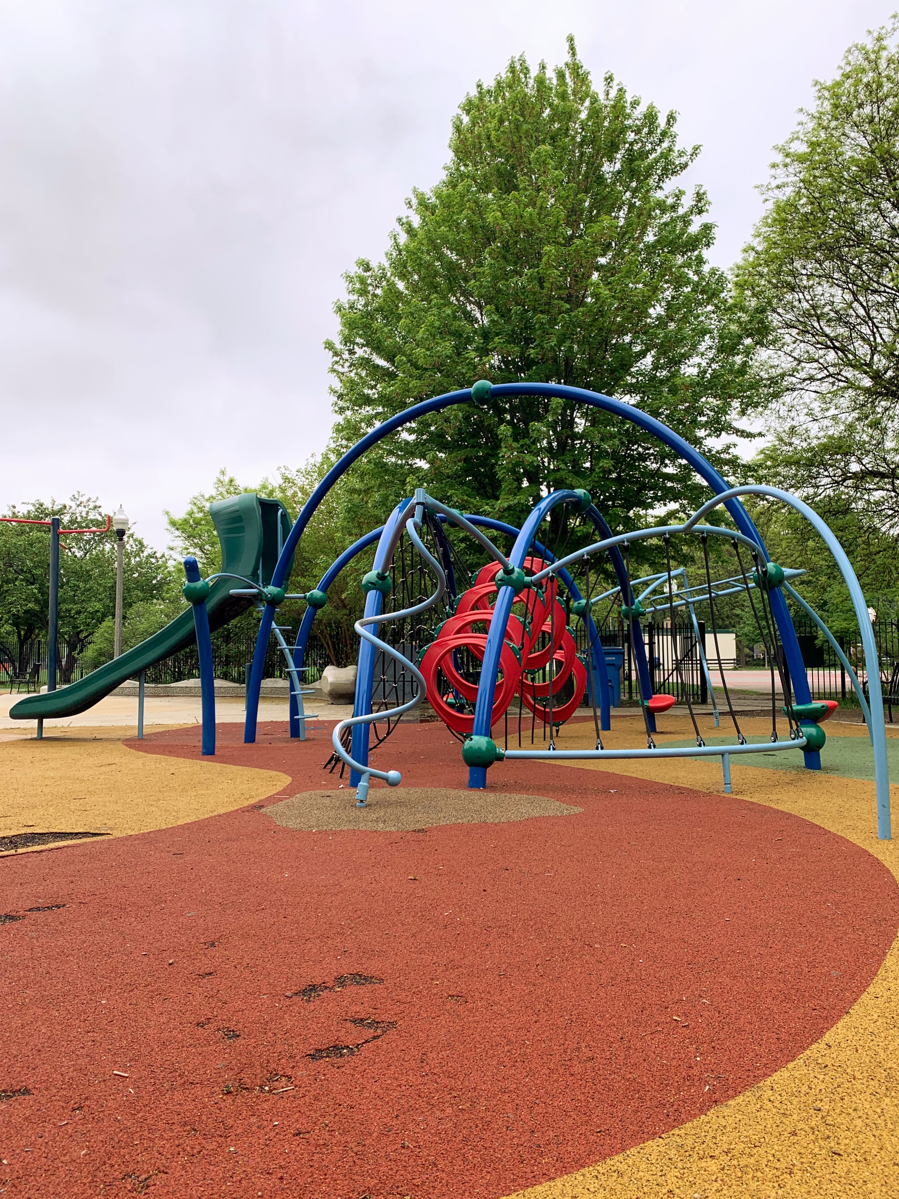 - This large playground is located on the east side of Skinner Park and and features a water spray feature, an area for younger children, a huge area for older children, and the normal variety of swings. The area designed for older children is particularly large and there are several mosaics and a large climbing animal (a dragon!) that make this playground stand out from others. There are benches and a few picnic tables in the fully enclosed play area and the play surface is soft rubber.