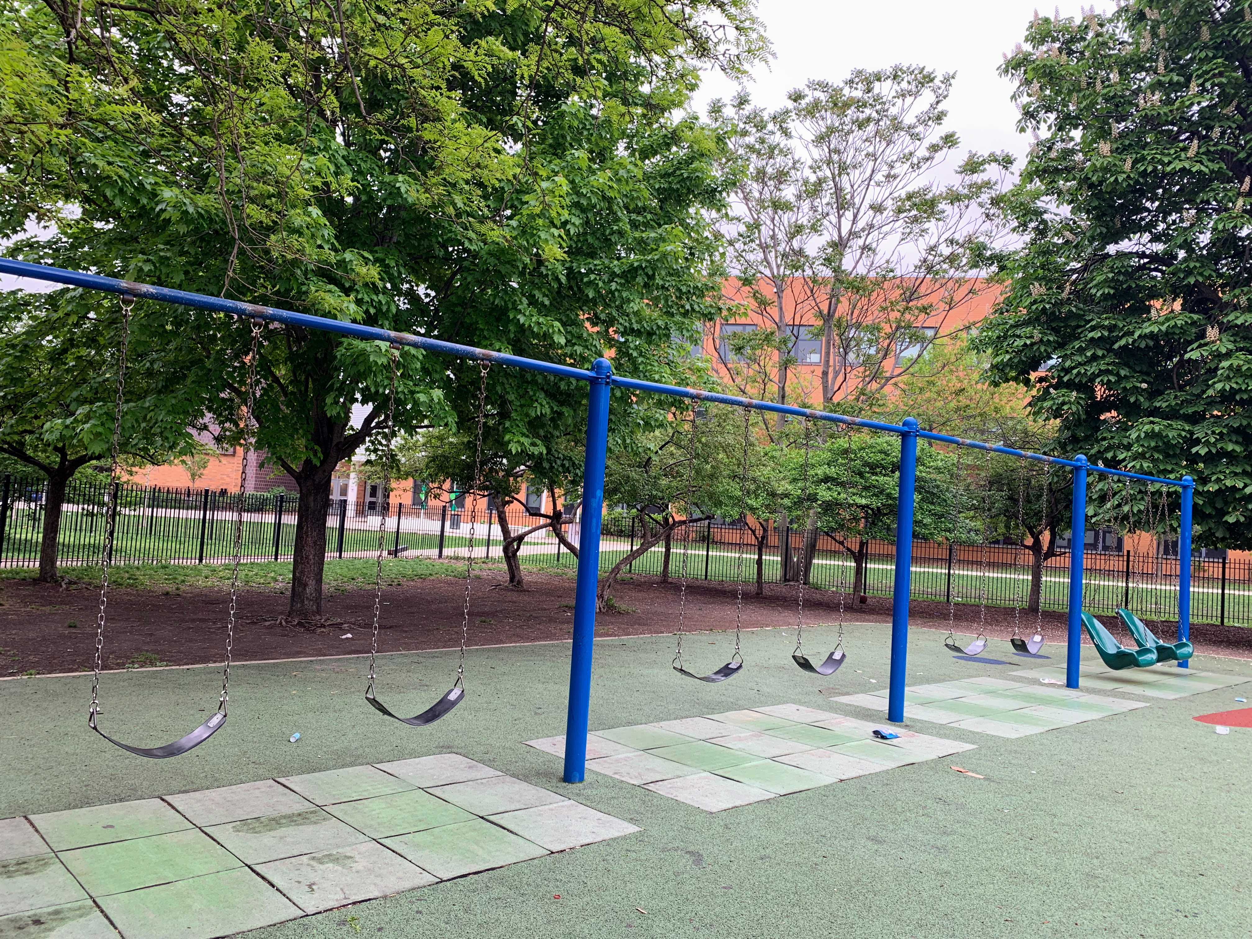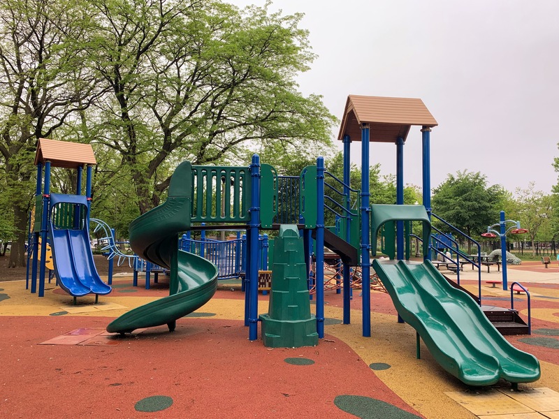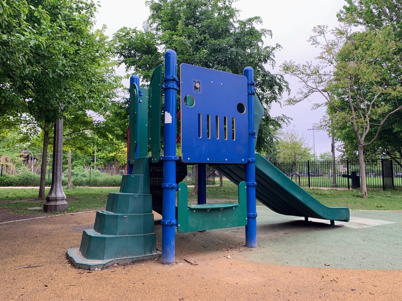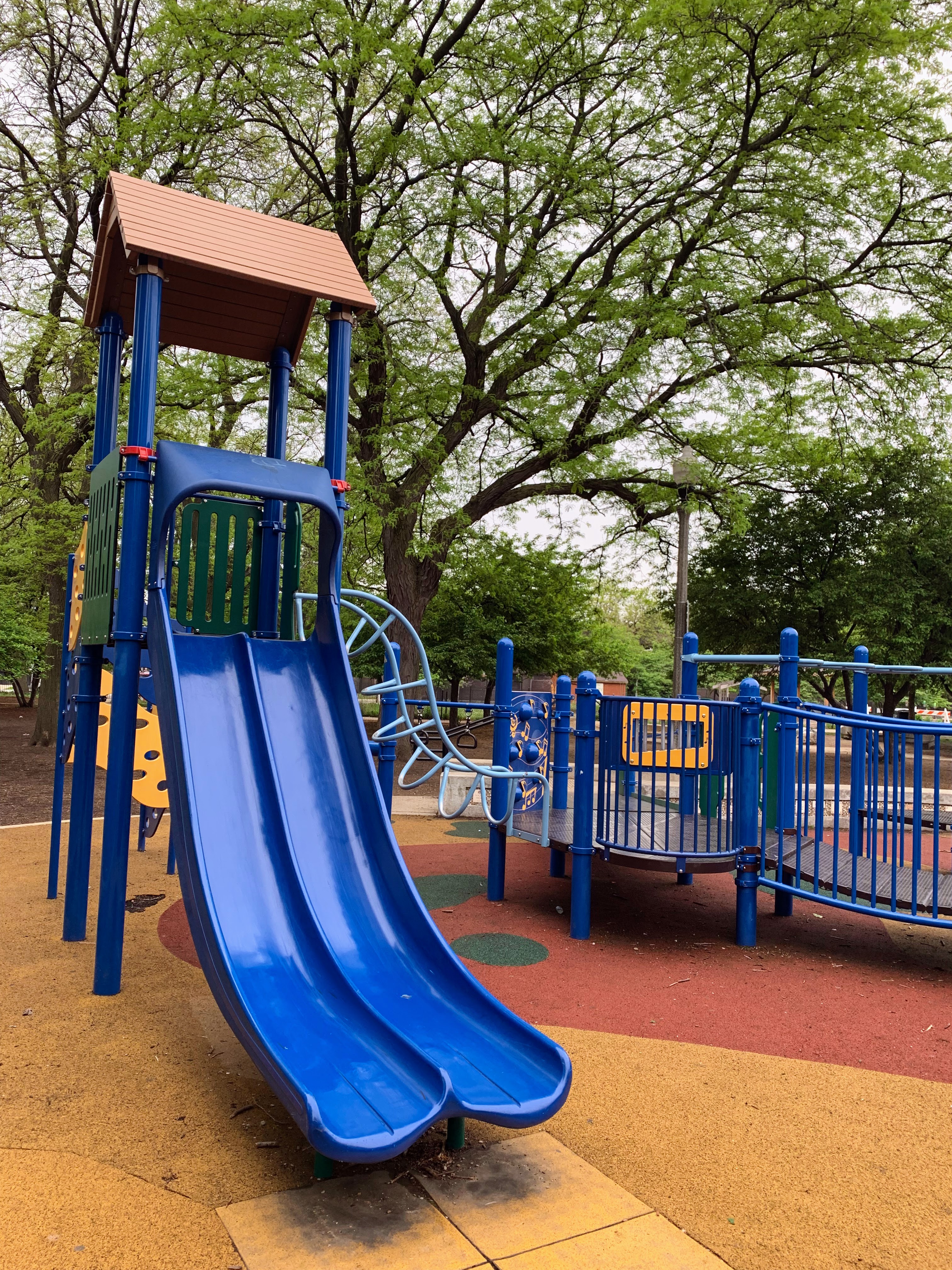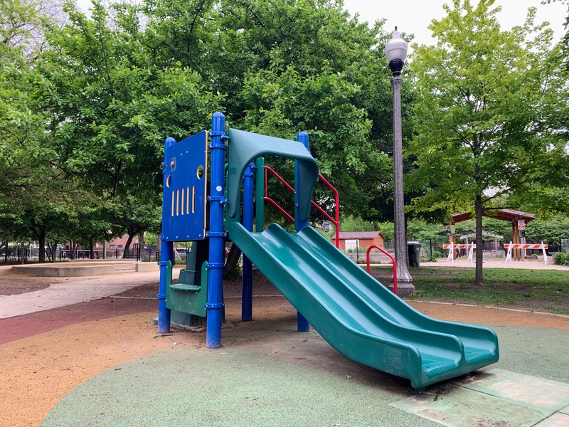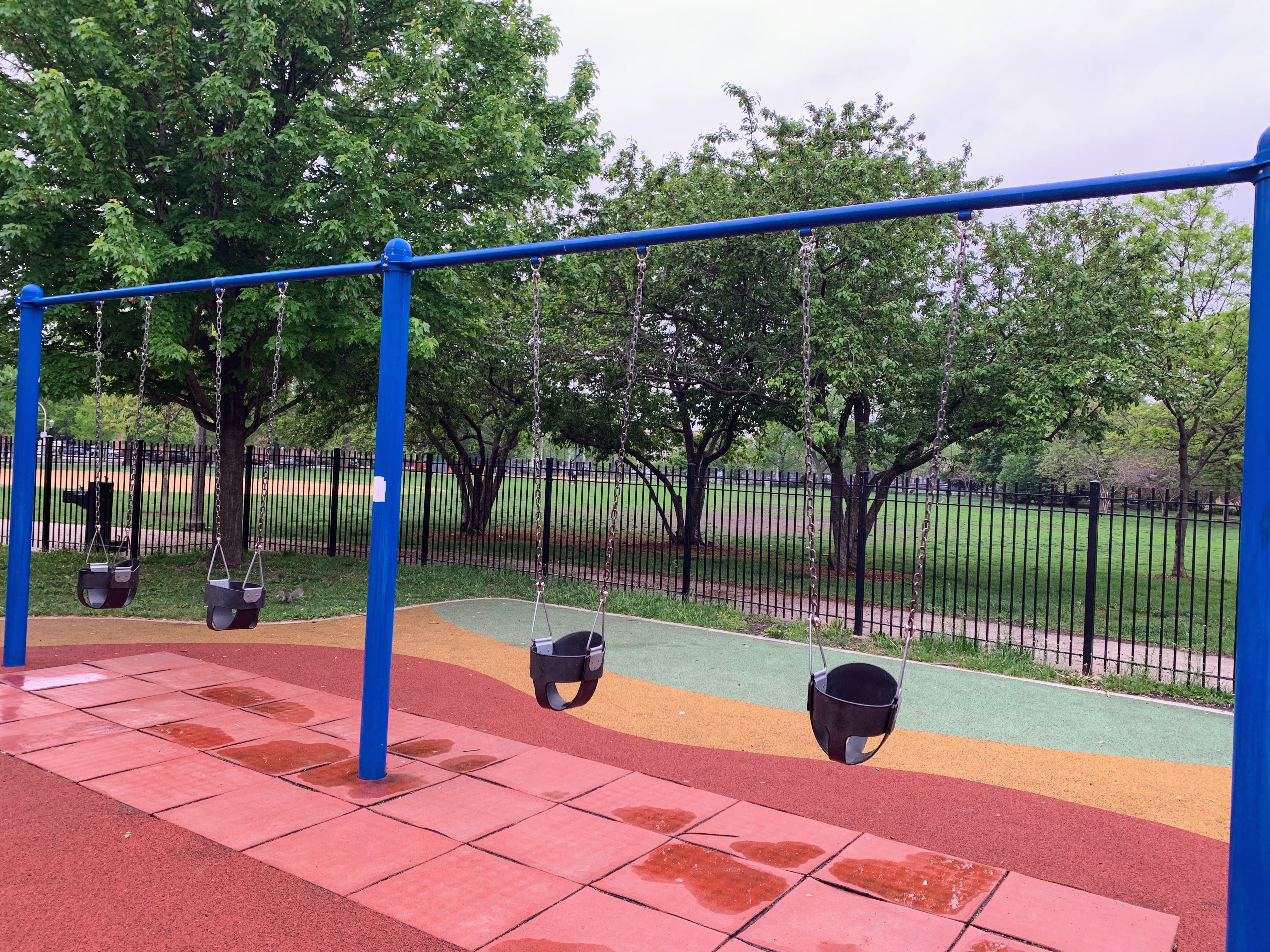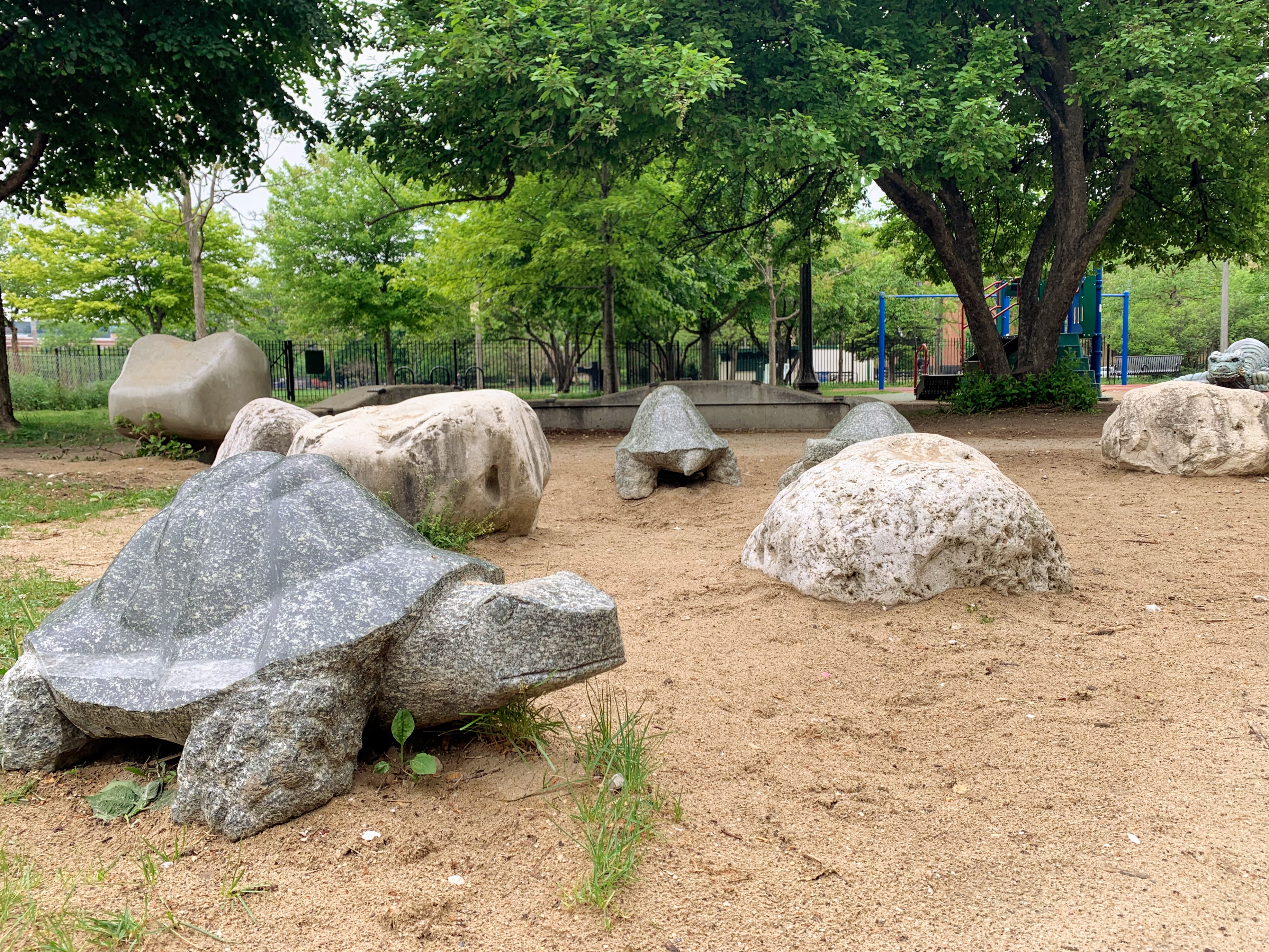 - This large playground is located on the east side of Skinner Park and and features a water spray feature, an area for younger children, a huge area for older children, and the normal variety of swings. The area designed for older children is particularly large and there are several mosaics and a large climbing animal (a dragon!) that make this playground stand out from others. There are benches and a few picnic tables in the fully enclosed play area and the play surface is soft rubber.