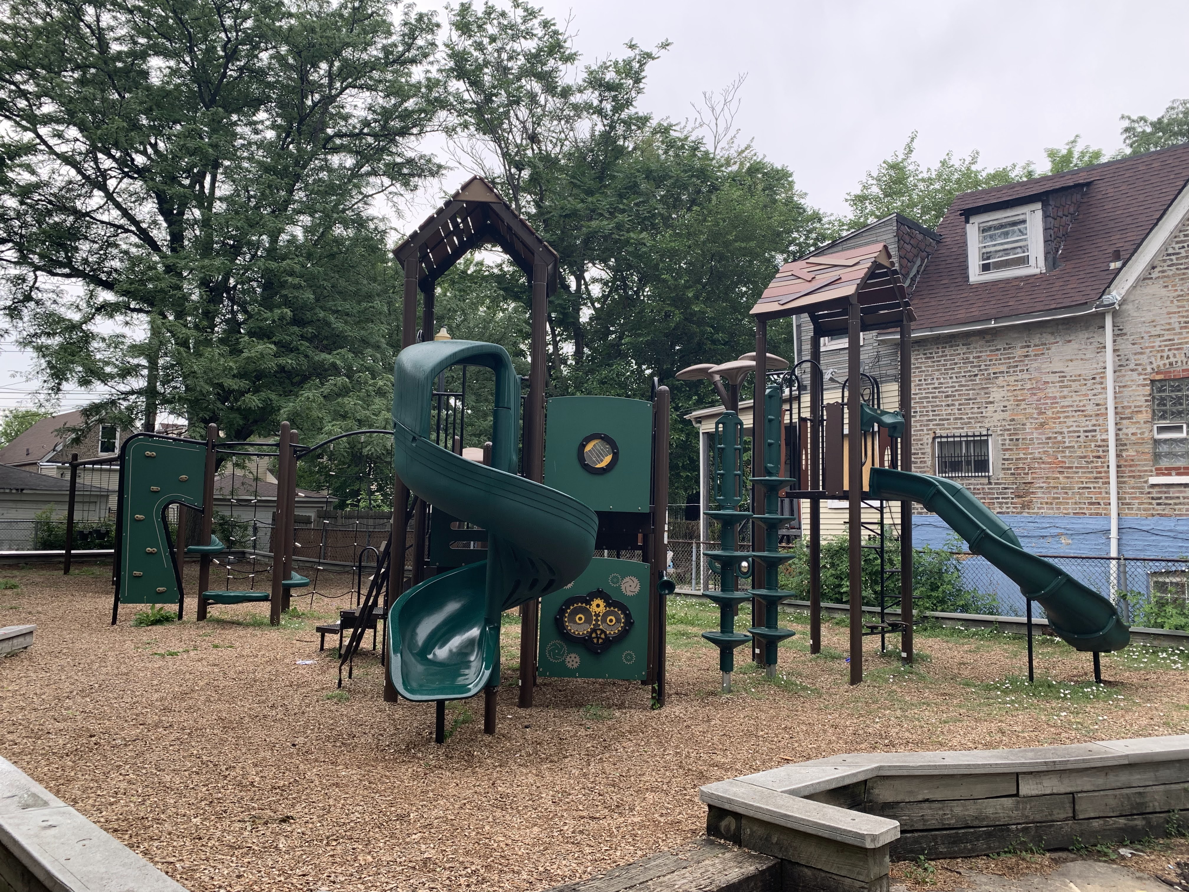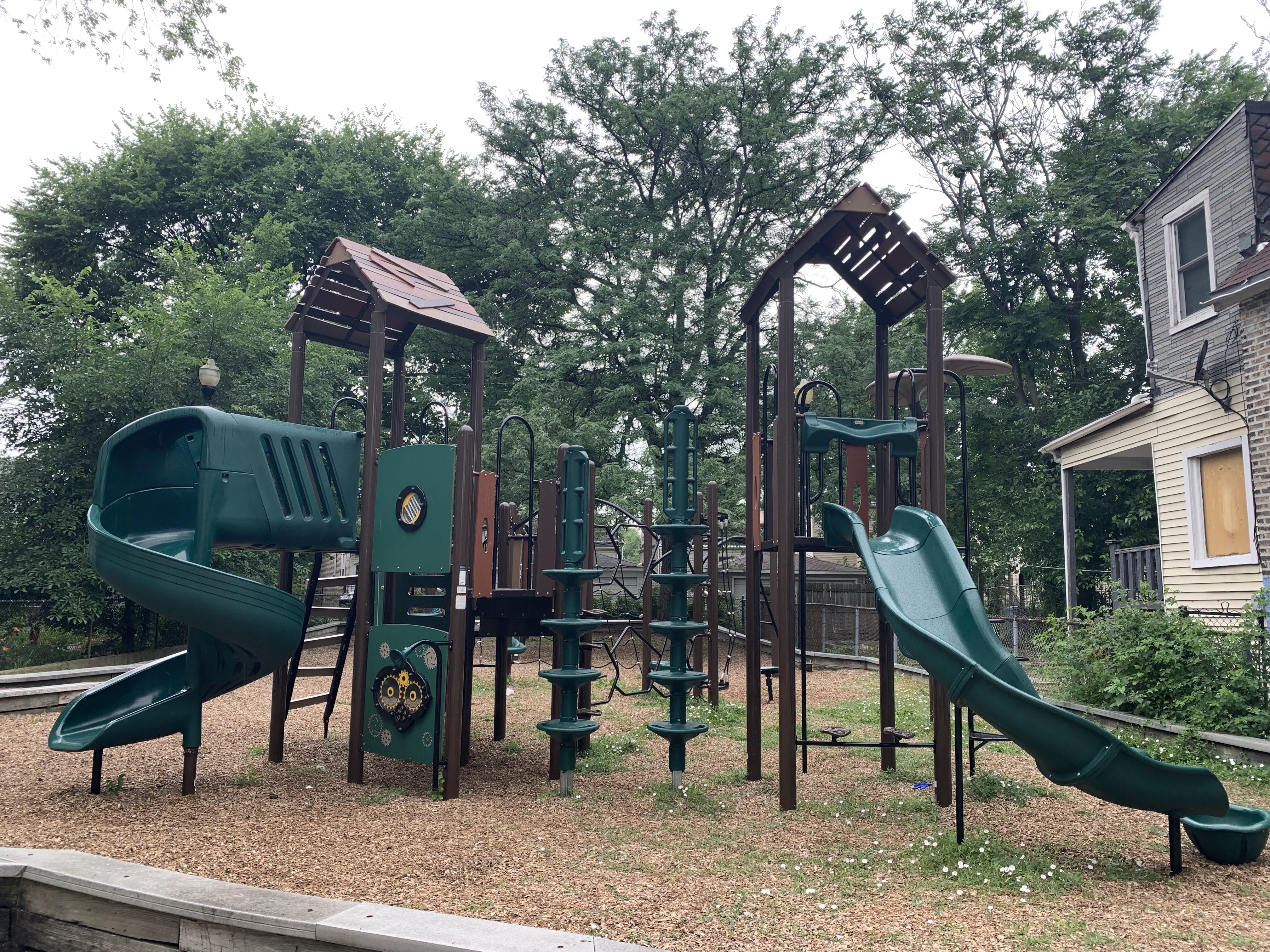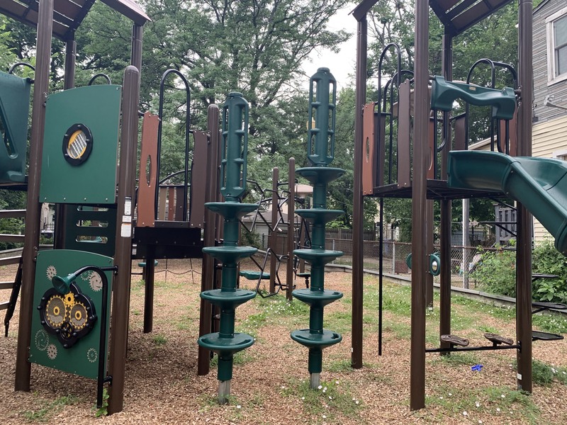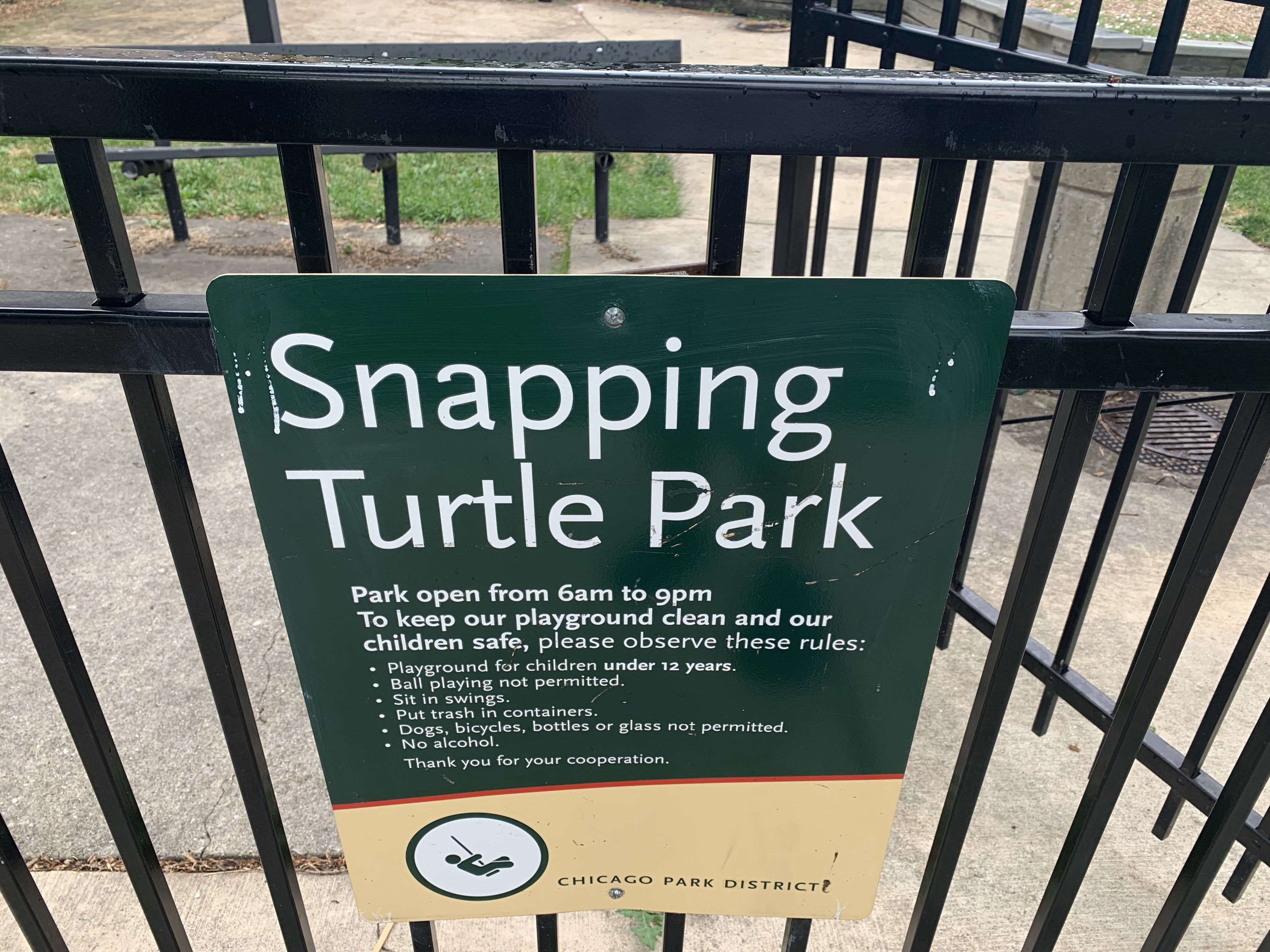 - The playground takes up the entirety of Snapping Turtle Park and offers a large play structure with two slides and some unique climbing elements. There is also a small set of swings at the back of the site. The playground is fully enclosed and the main play surface is wood chips. There are a few benches and a drinking fountain as well as some large trees that provide some shade.
